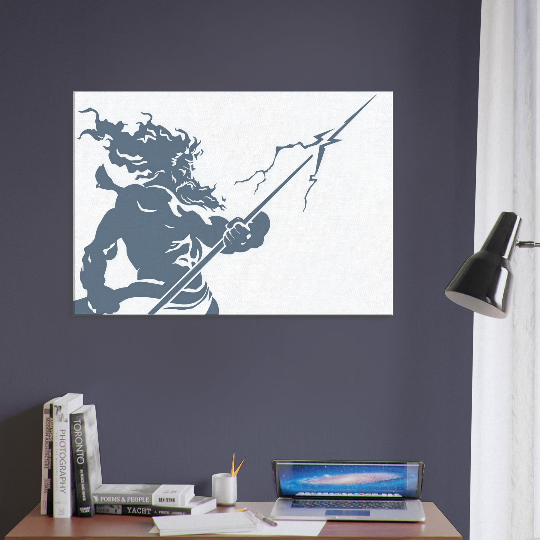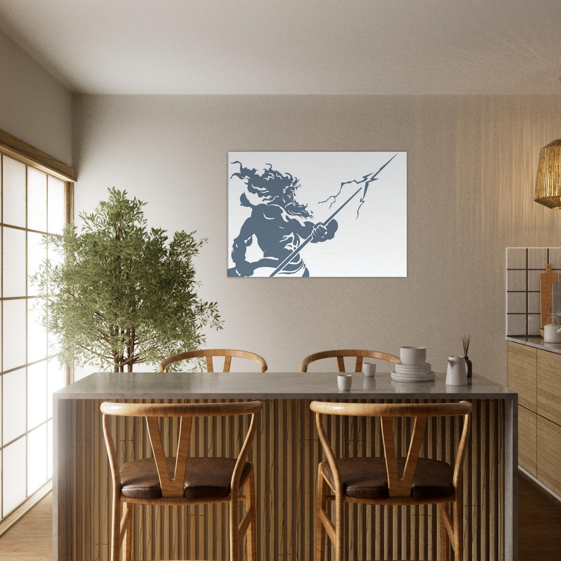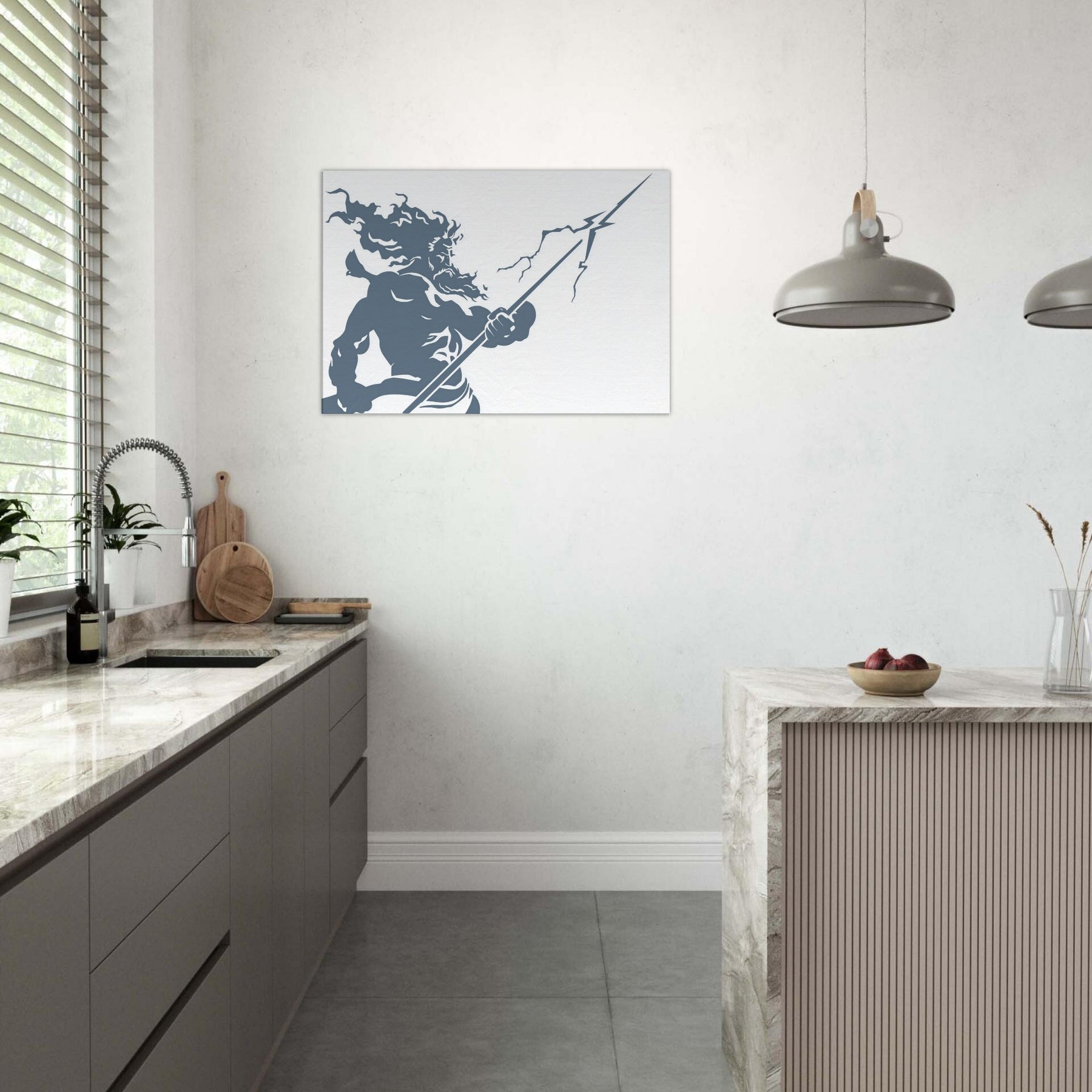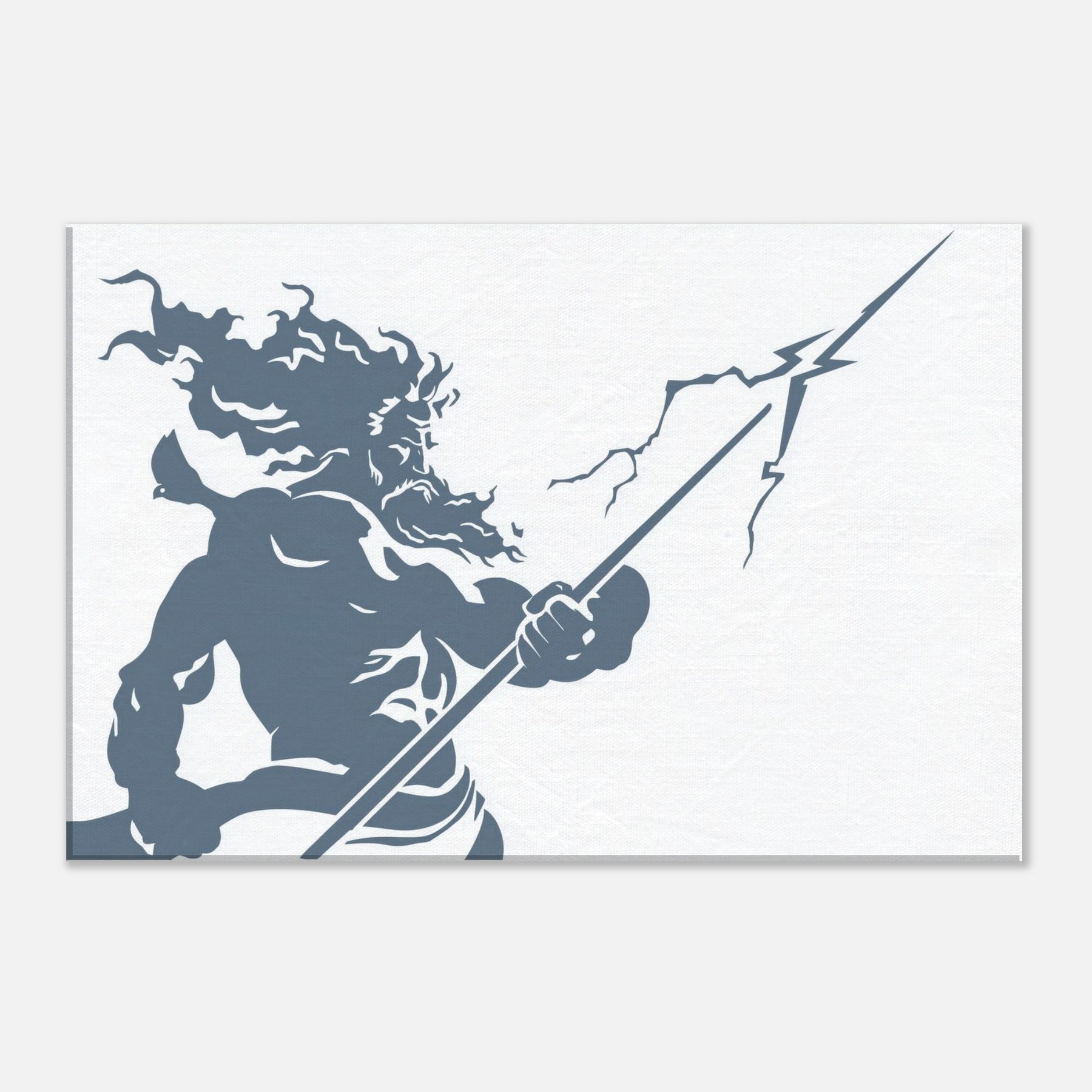 Zeus appears in stark, flowing line work, a mighty silhouette commanding storm and sky. The piece evokes thunder in a single, continuous gesture the helm of power, the bolt held aloft, wind curling around Herculean shoulders. The cool slate blue palette breathes calm into a room while remaining charged with mythic energy. Hang this centerpiece to awaken a living space: drama at eye level, atmosphere of ancient Olympus, and a contemplative, modern edge that pairs with minimal furniture and soft textures. The central subject is Zeus, God of Thunder and Sky.