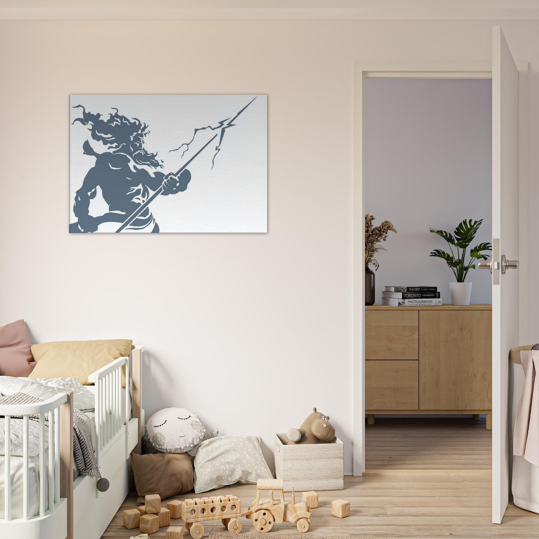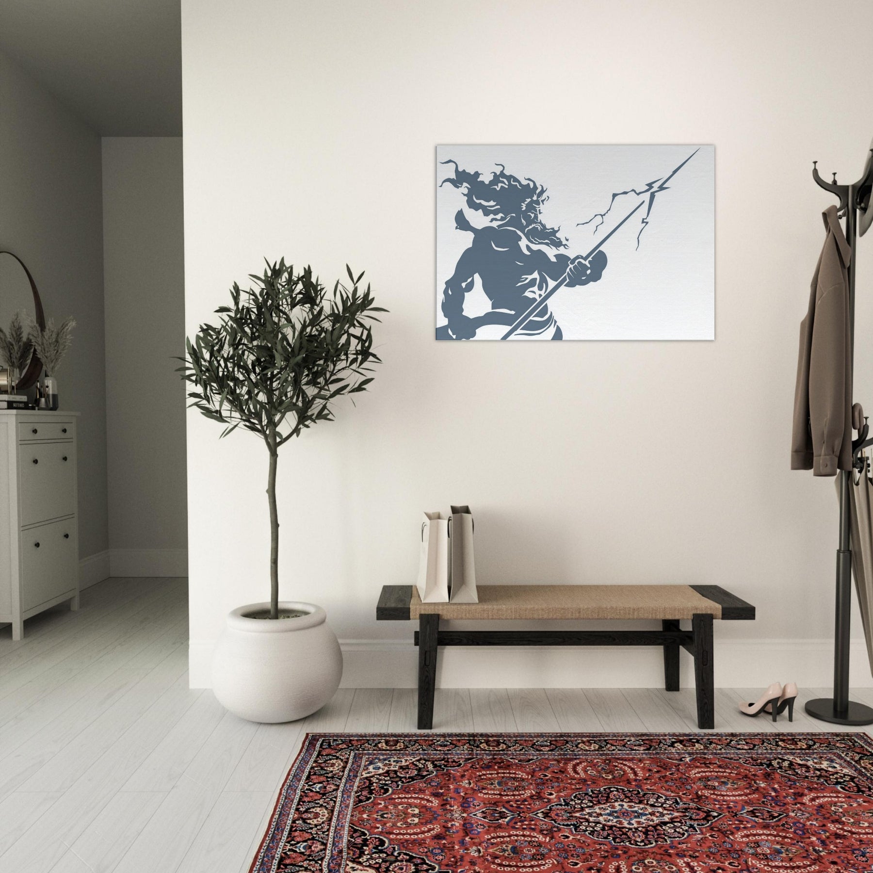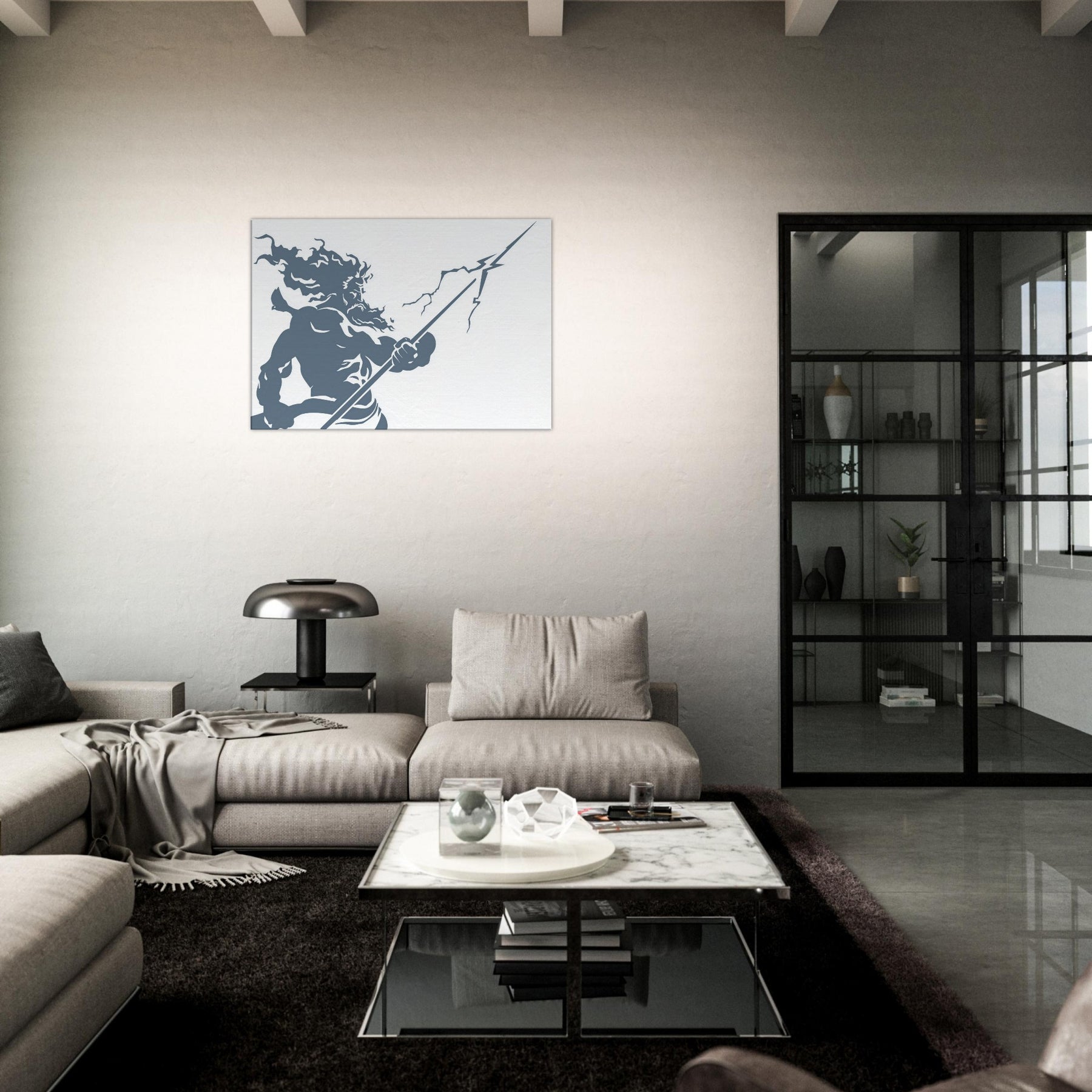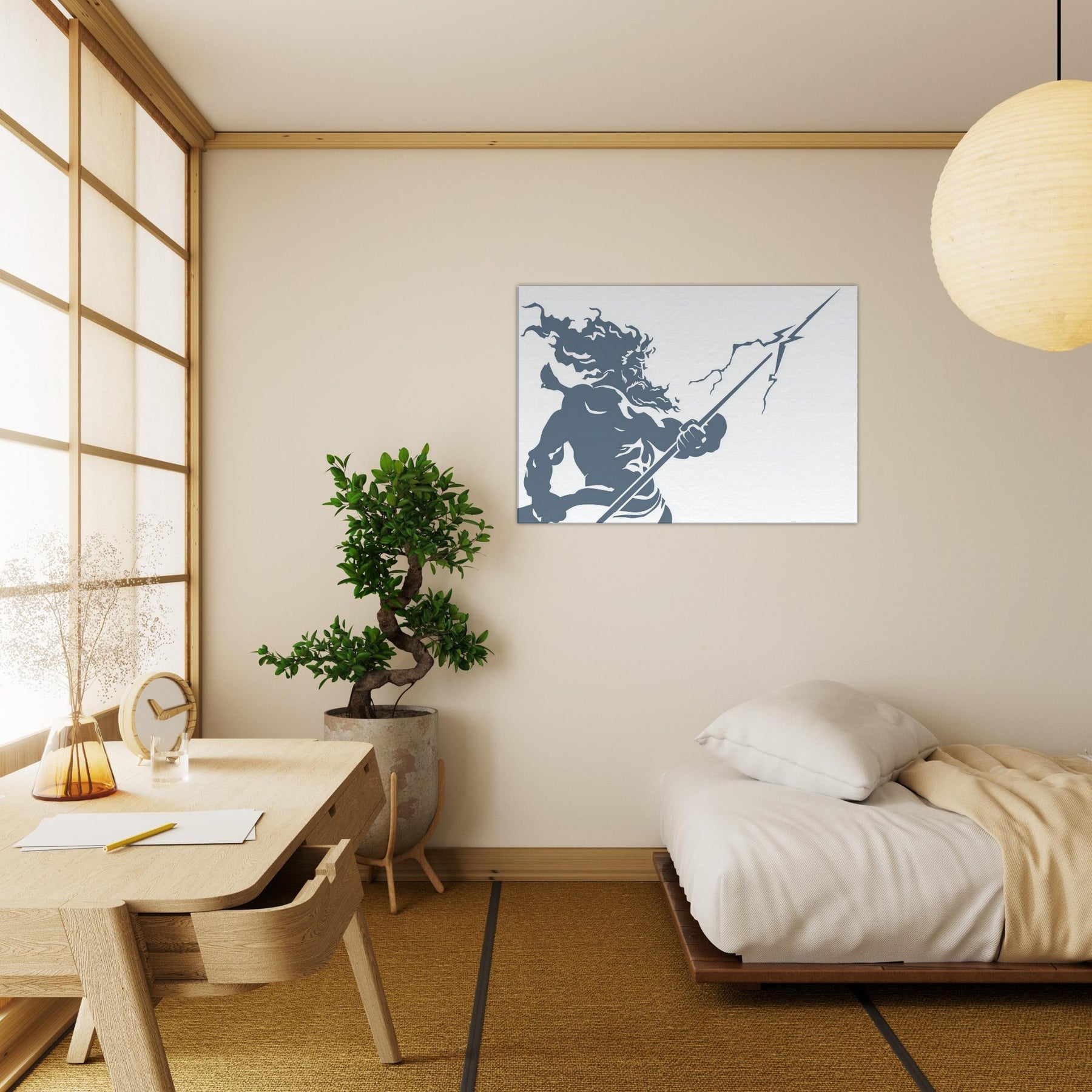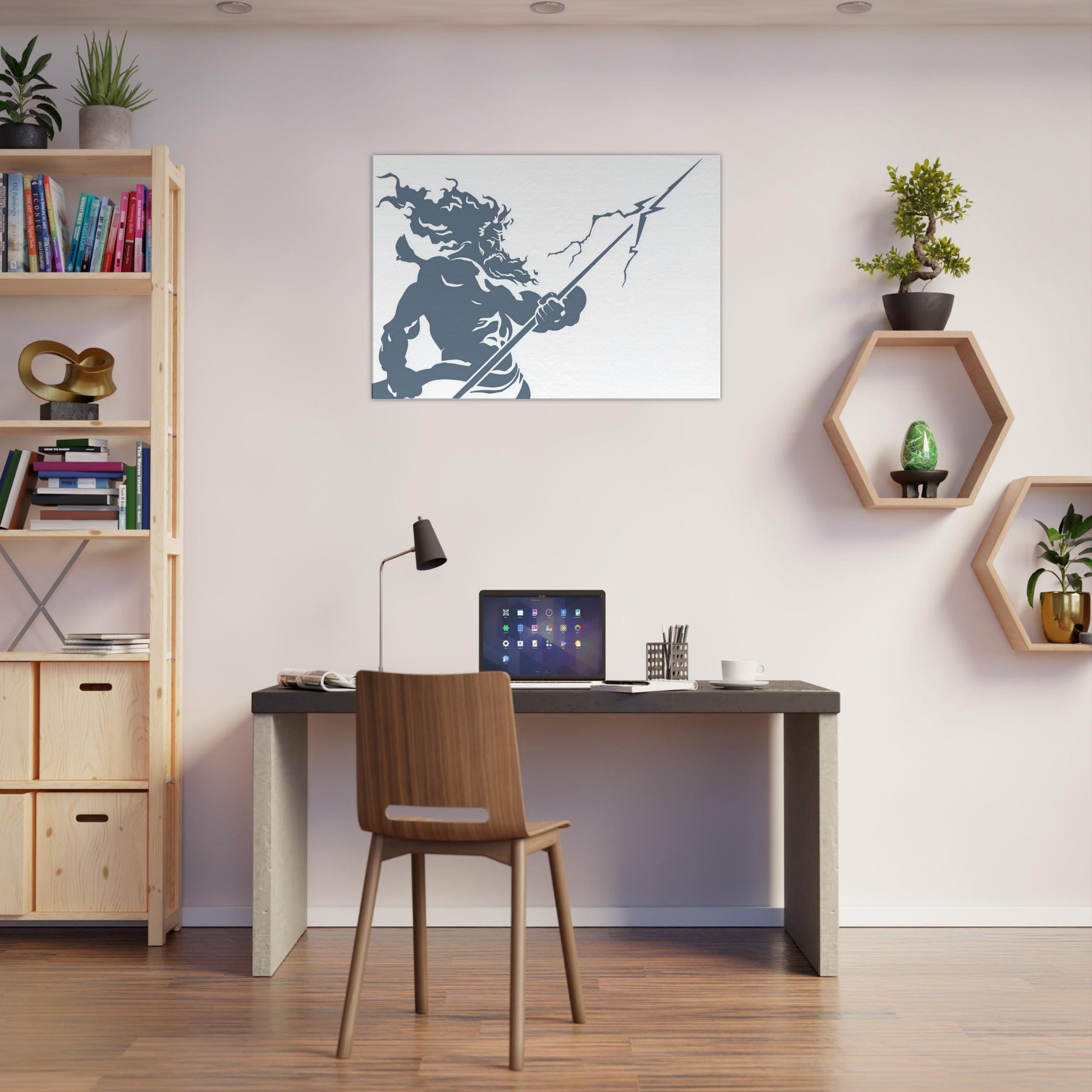 Zeus appears in stark, flowing line work, a mighty silhouette commanding storm and sky. The piece evokes thunder in a single, continuous gesture the helm of power, the bolt held aloft, wind curling around Herculean shoulders. The cool slate blue palette breathes calm into a room while remaining charged with mythic energy. Hang this centerpiece to awaken a living space: drama at eye level, atmosphere of ancient Olympus, and a contemplative, modern edge that pairs with minimal furniture and soft textures. The central subject is Zeus, God of Thunder and Sky.