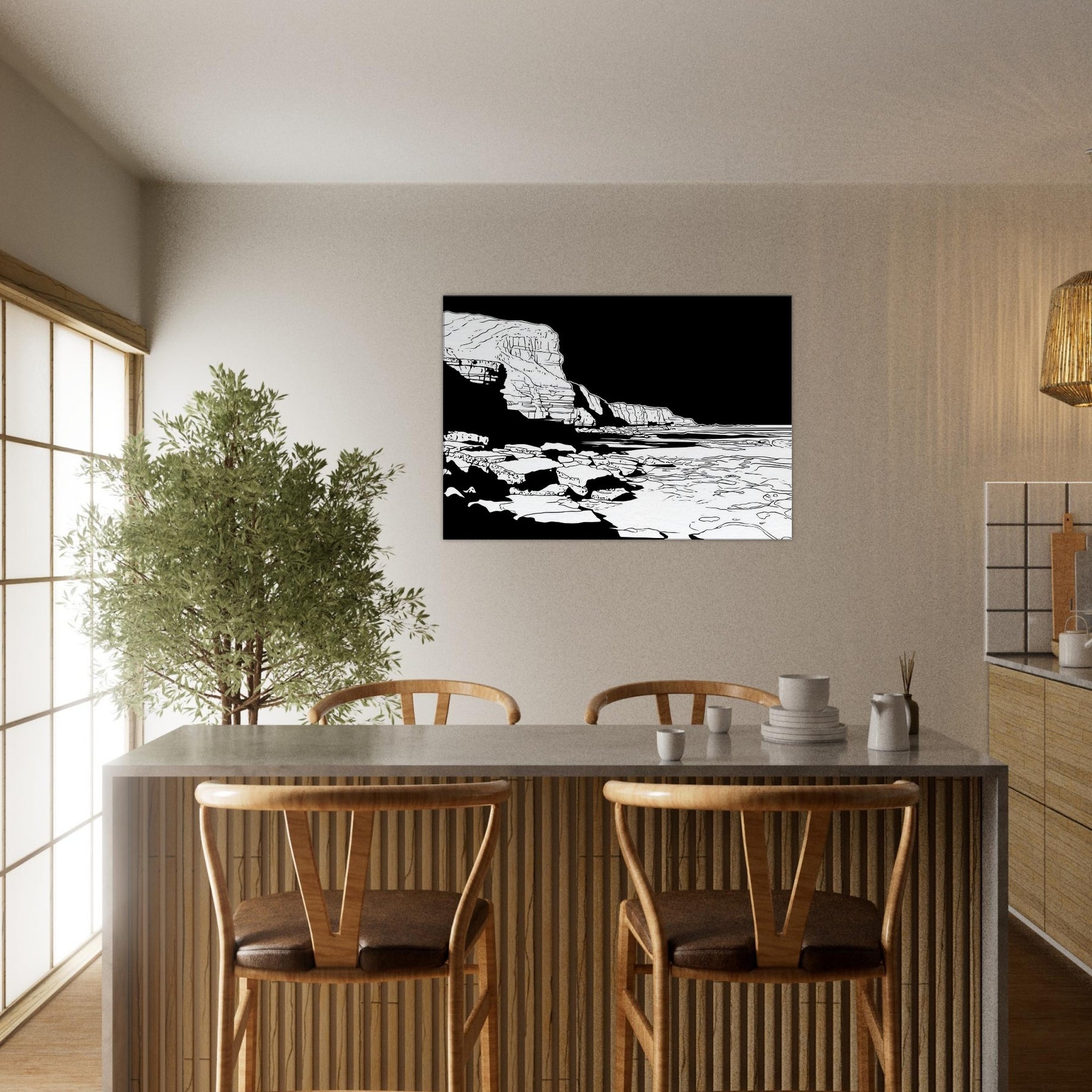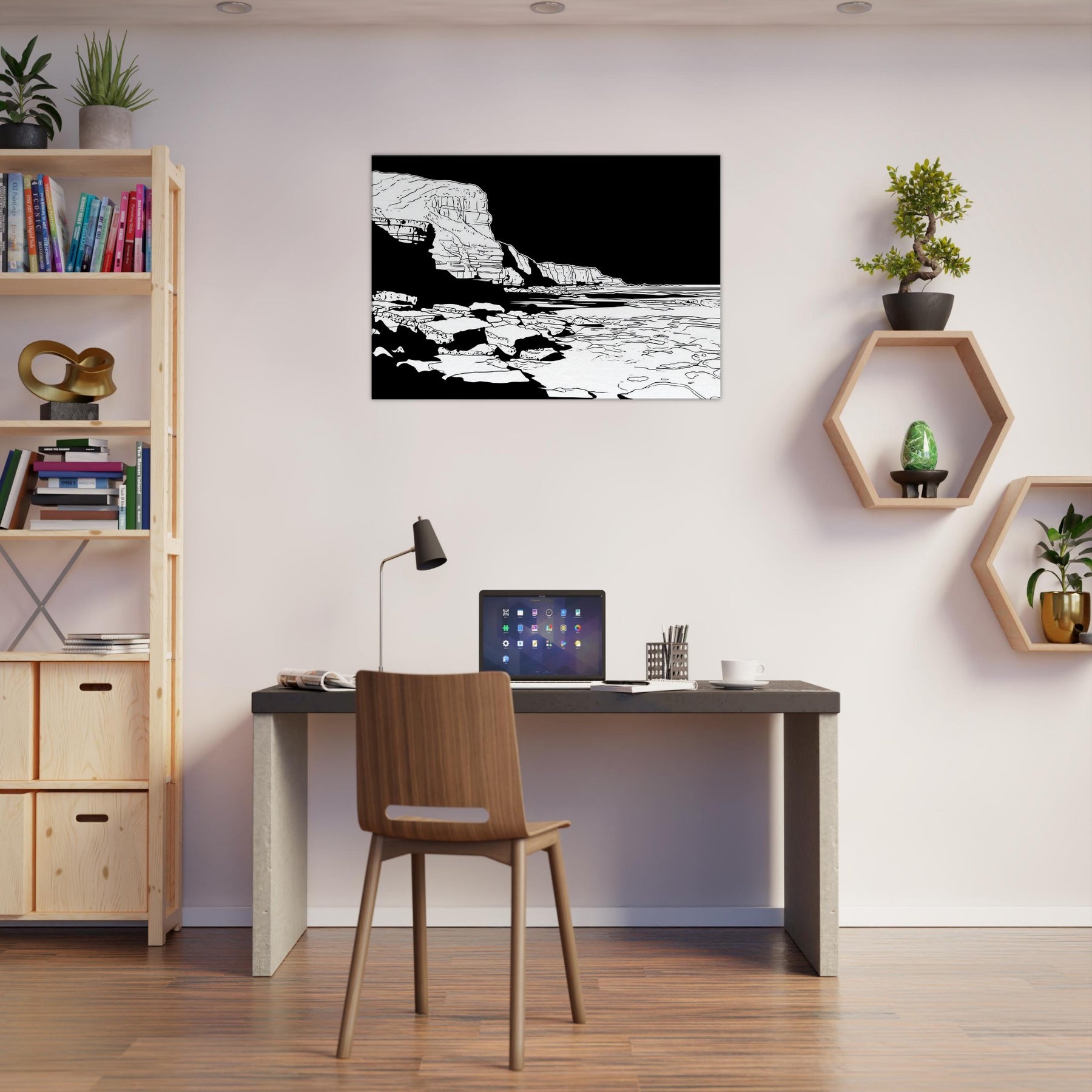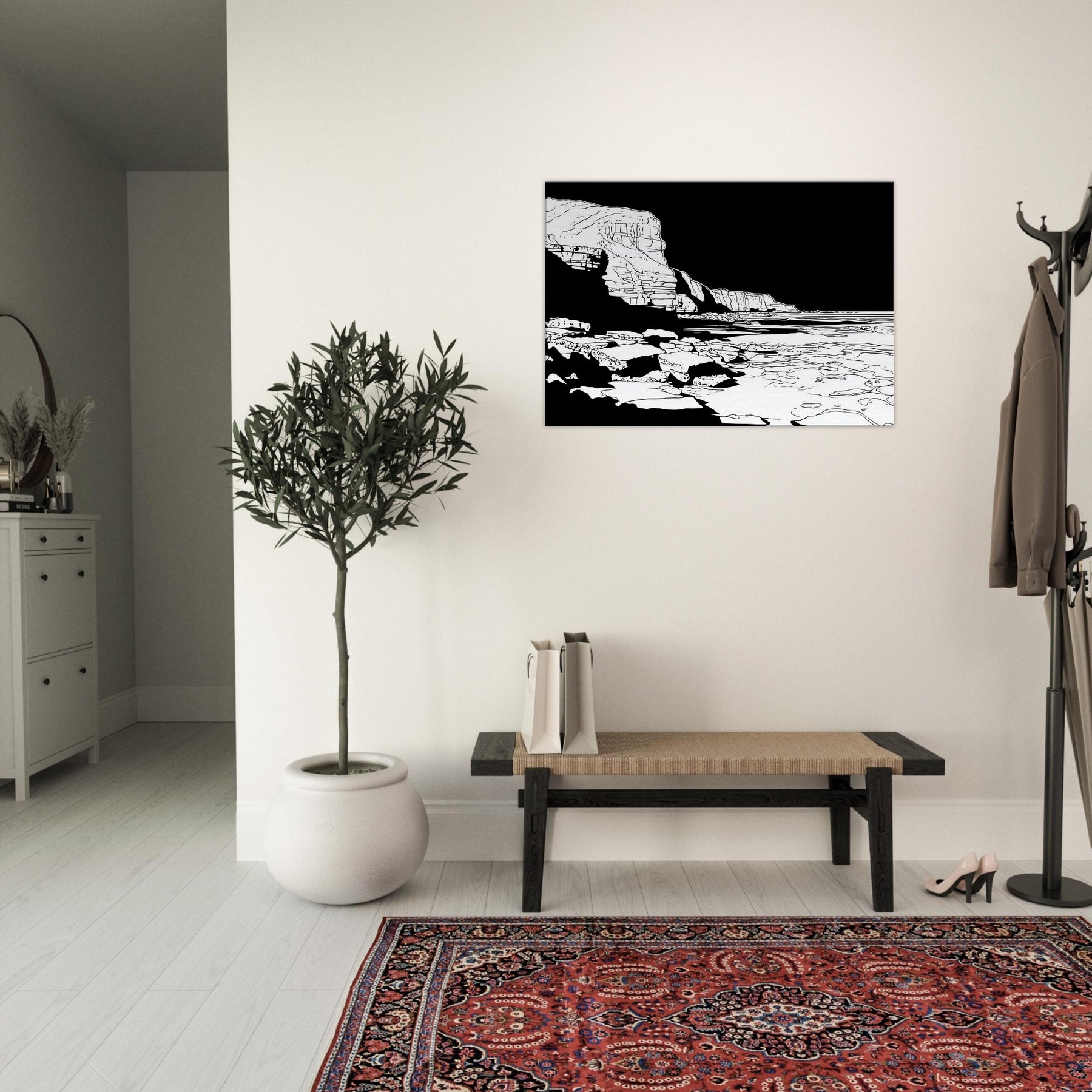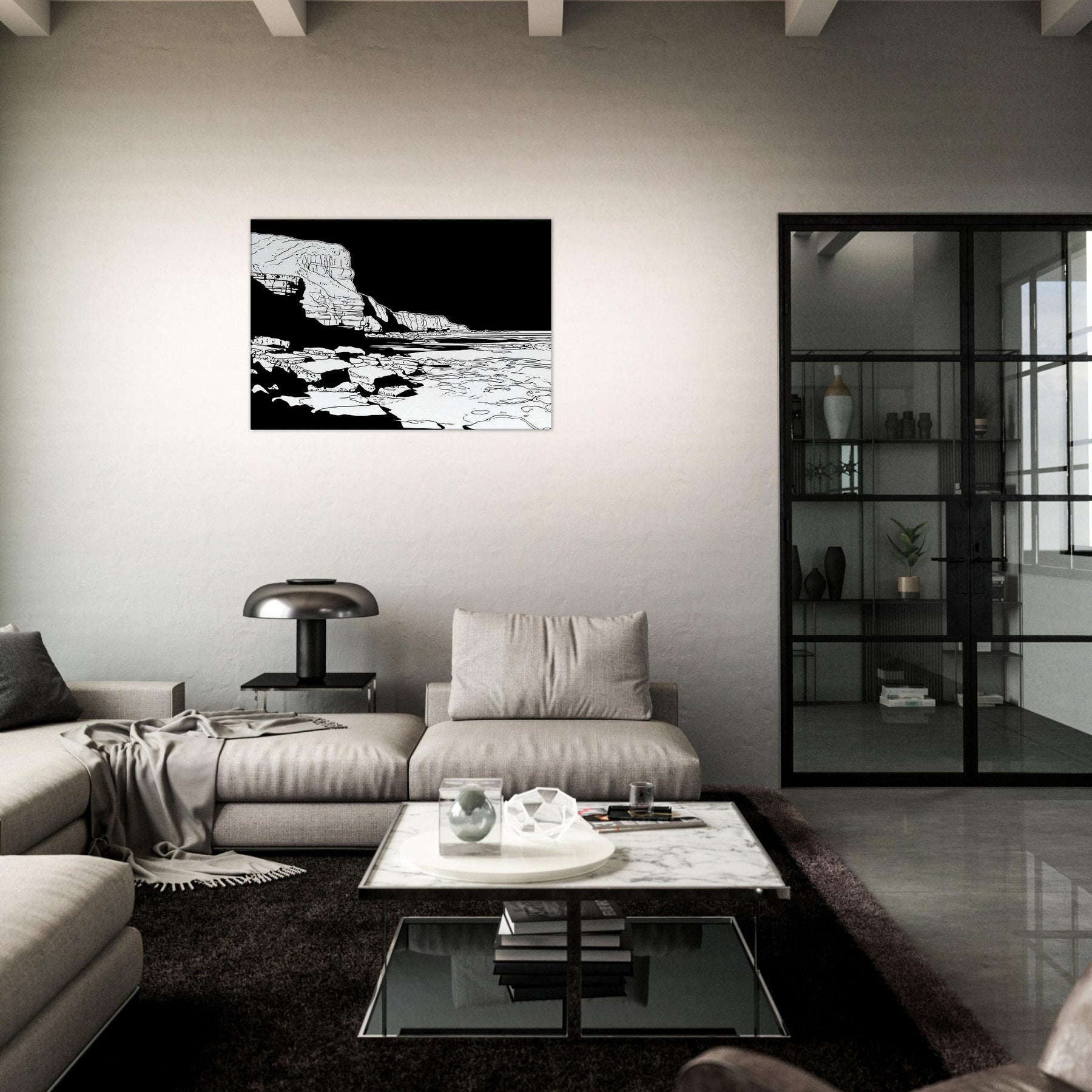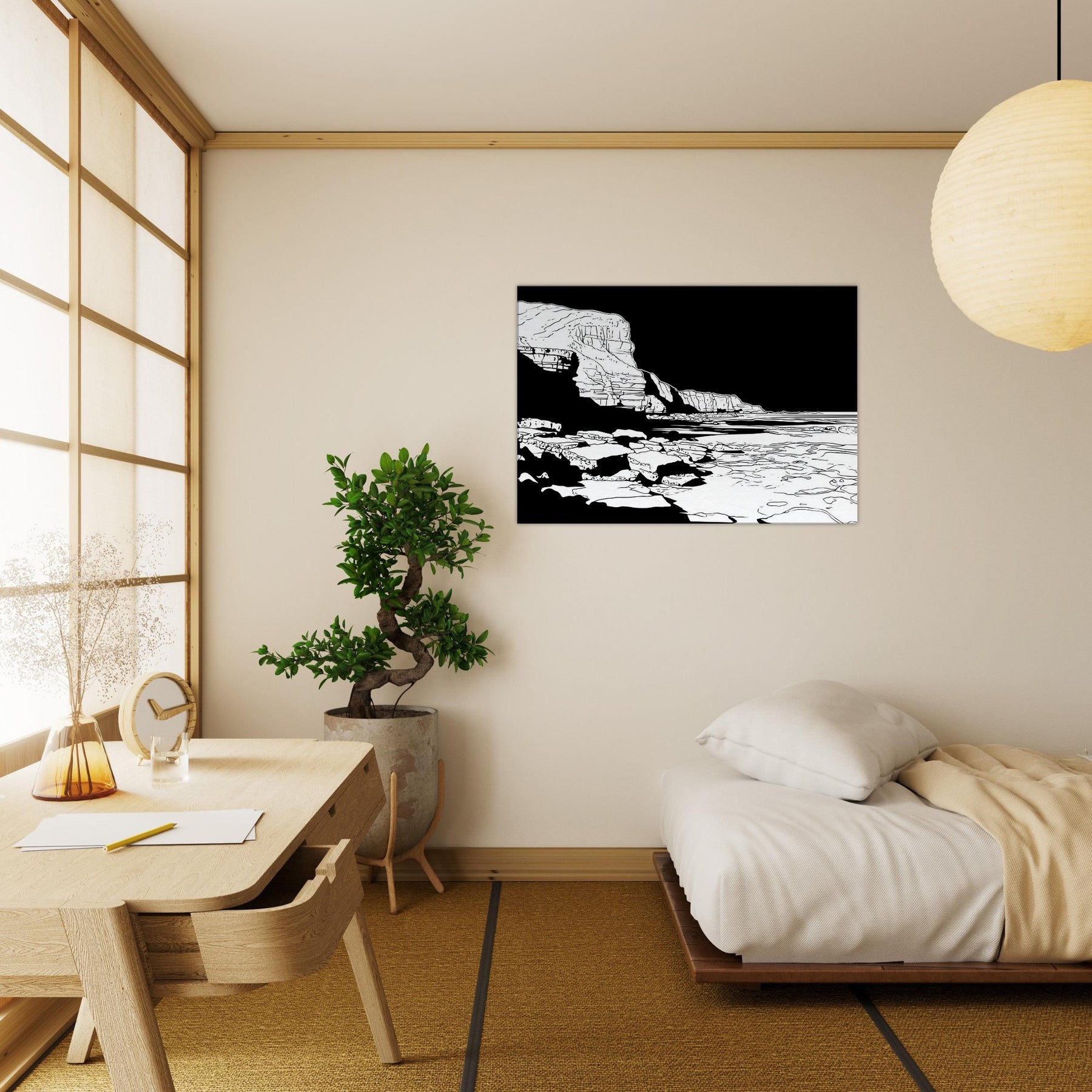 Step close and listen: a coastline of quiet lines that breathes in your room. This Coastal Cliffs study in line art reduces the dramatic sea to elegant contours, inviting reflection without distraction. The monochrome tide curls along the shore, creating a serene rhythm that cools a busy space and pairs beautifully with modern furnishings. A moment of coastal calm to elevate any living area with timeless nature inspired grace.