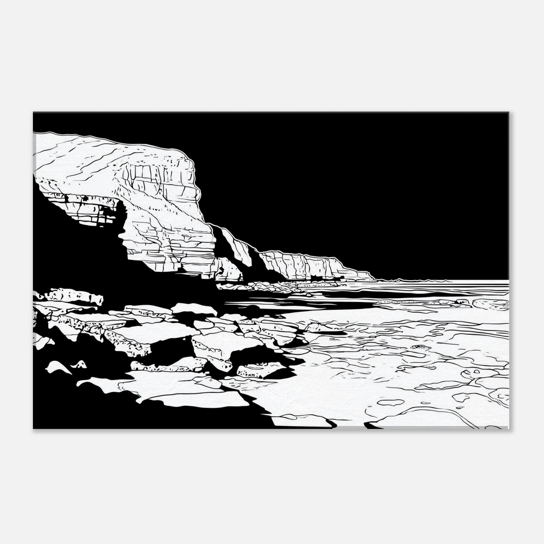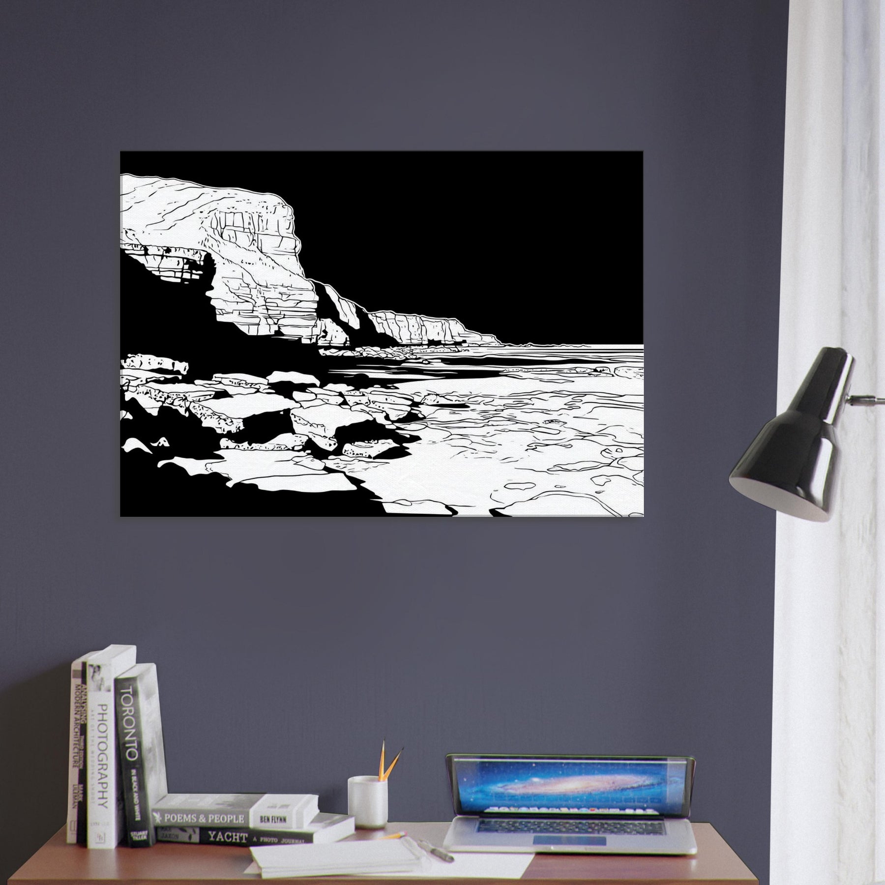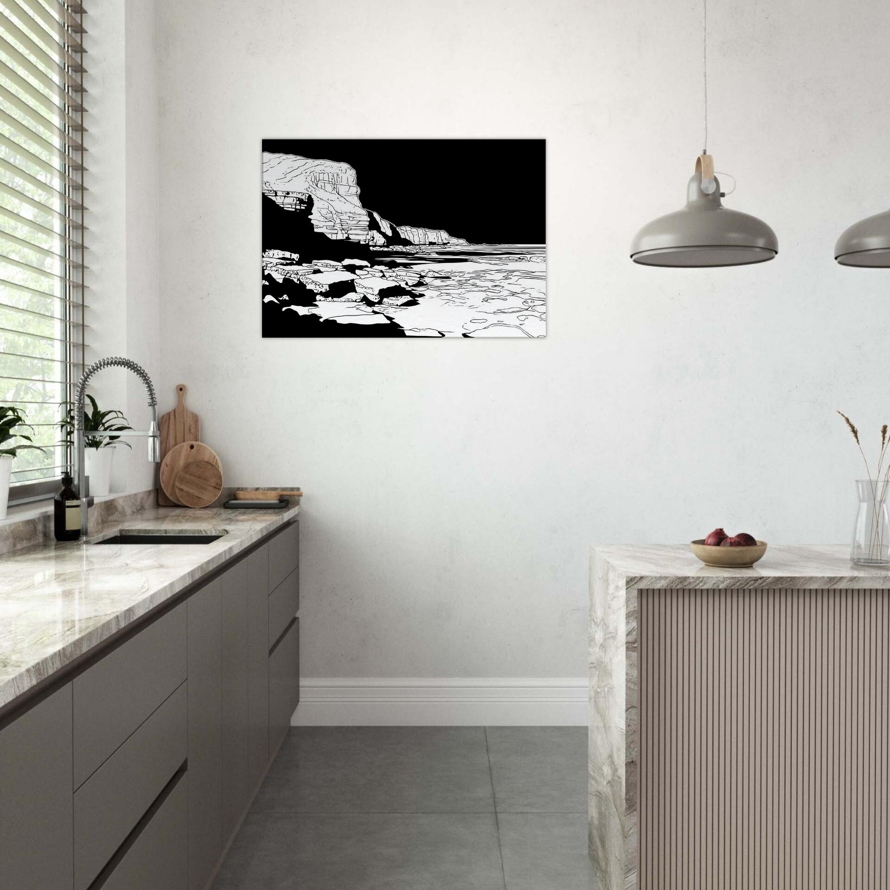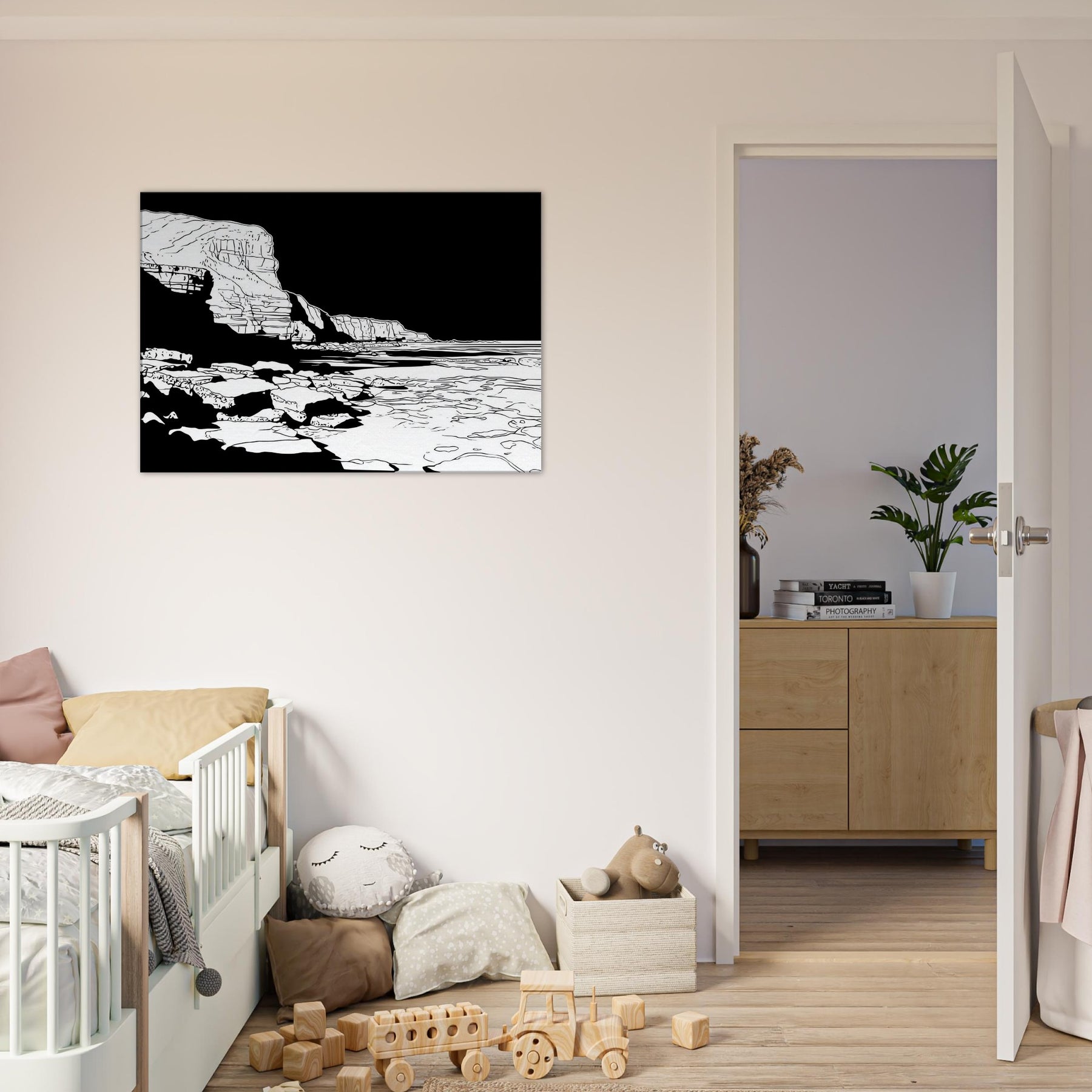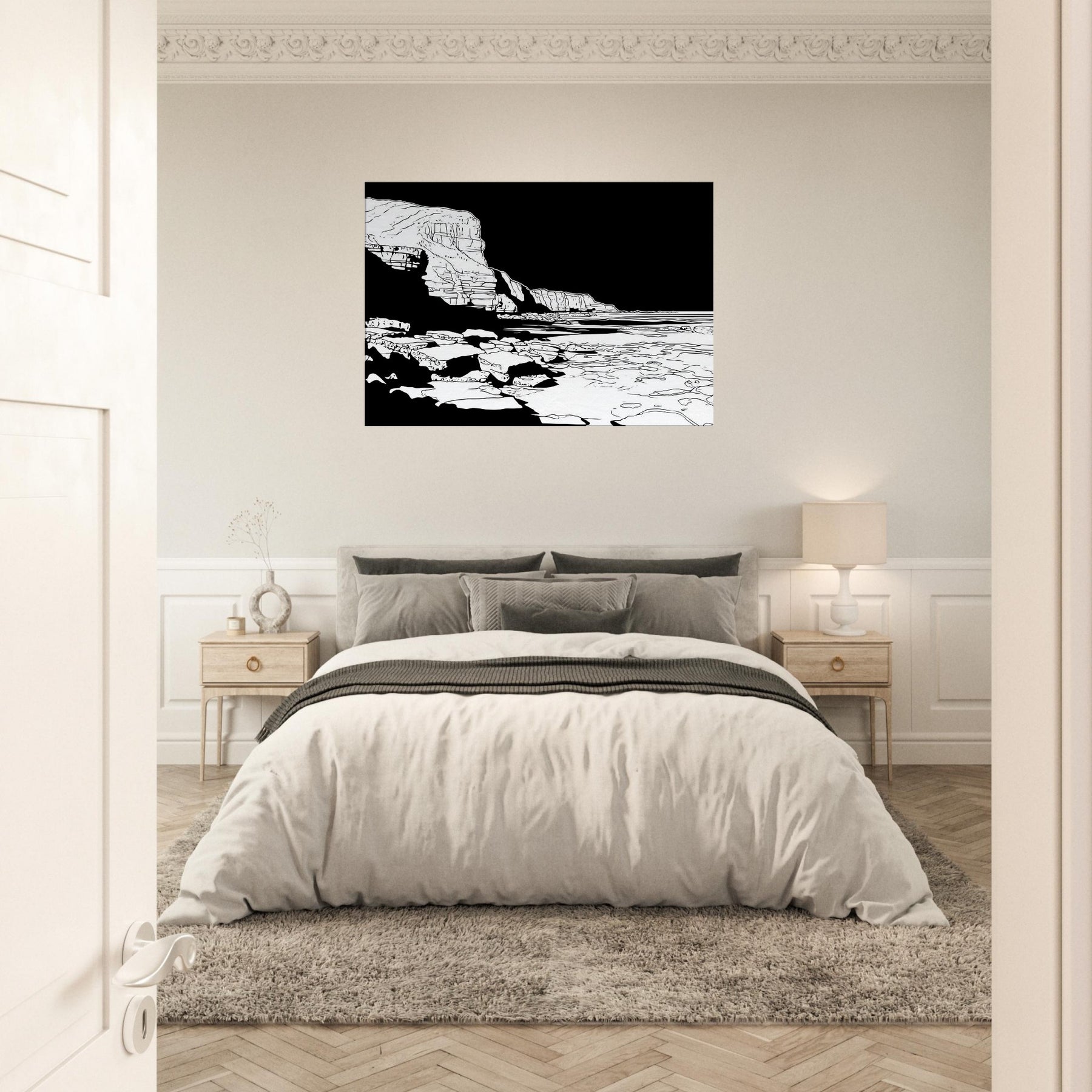 Step close and listen: a coastline of quiet lines that breathes in your room. This Coastal Cliffs study in line art reduces the dramatic sea to elegant contours, inviting reflection without distraction. The monochrome tide curls along the shore, creating a serene rhythm that cools a busy space and pairs beautifully with modern furnishings. A moment of coastal calm to elevate any living area with timeless nature inspired grace.