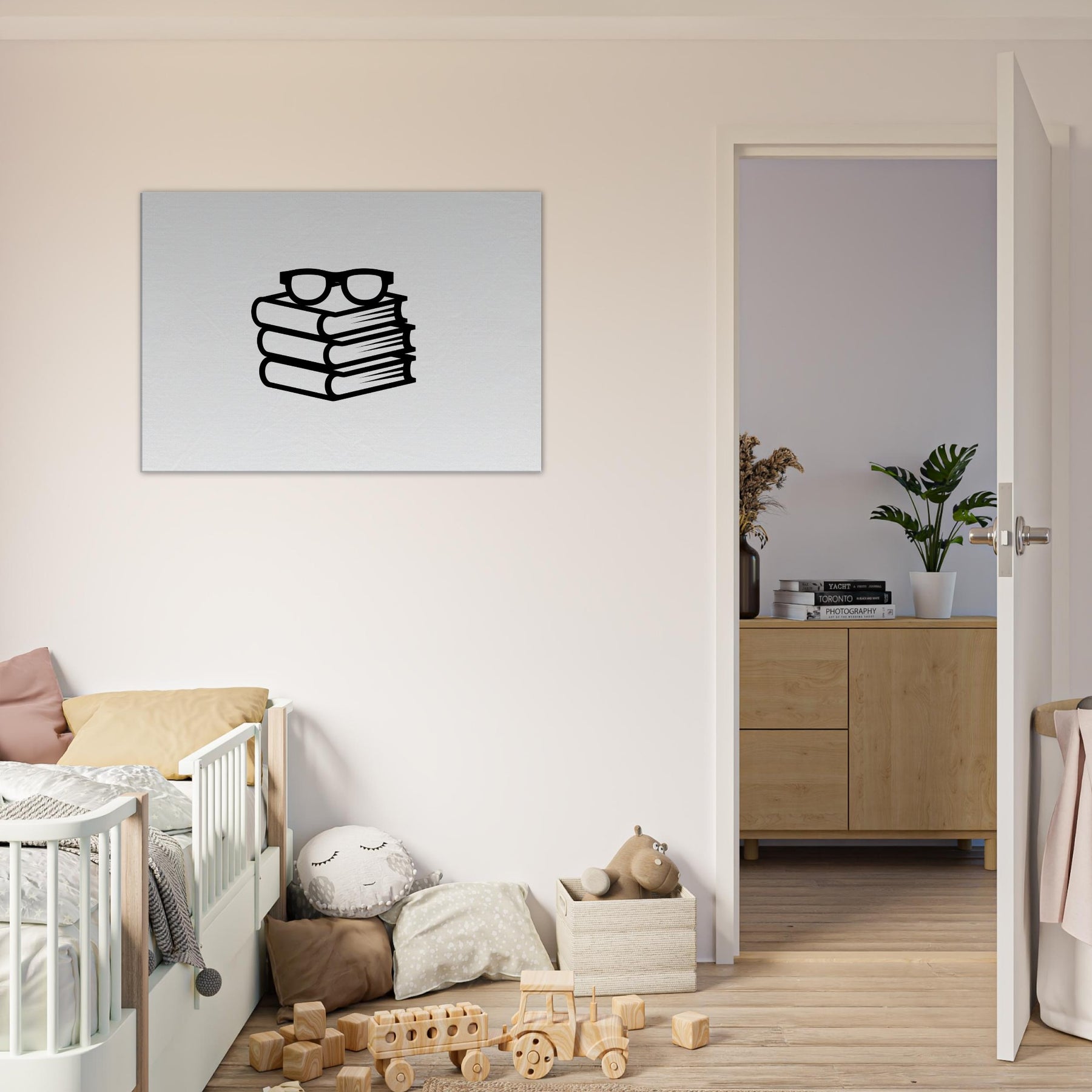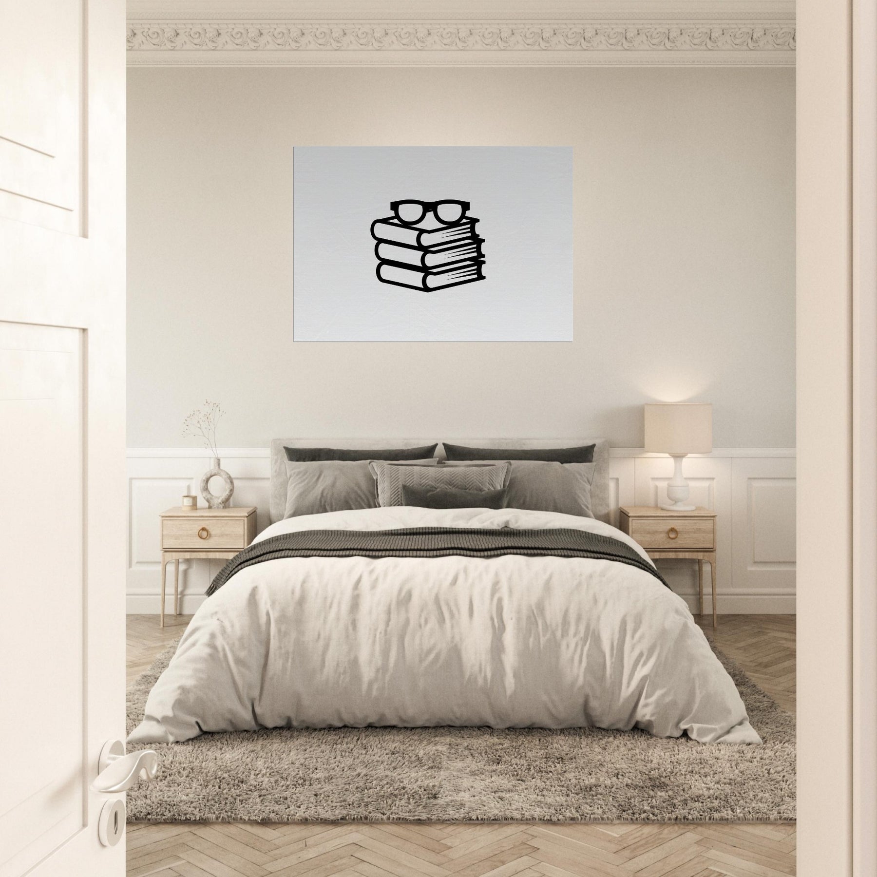 The Primary Subject, Book Stack with Glasses, is rendered in bold line art that feels both playful and refined. Stacked volumes support a pair of perched glasses, evoking a library hush and a quiet study. This imagery brings a scholarly calm to living rooms and workspaces alike, its stark black lines adding texture without overpowering the space. Perfect for a modern interior, it invites reflection, focus, and a subtle, everyday inspiration.
