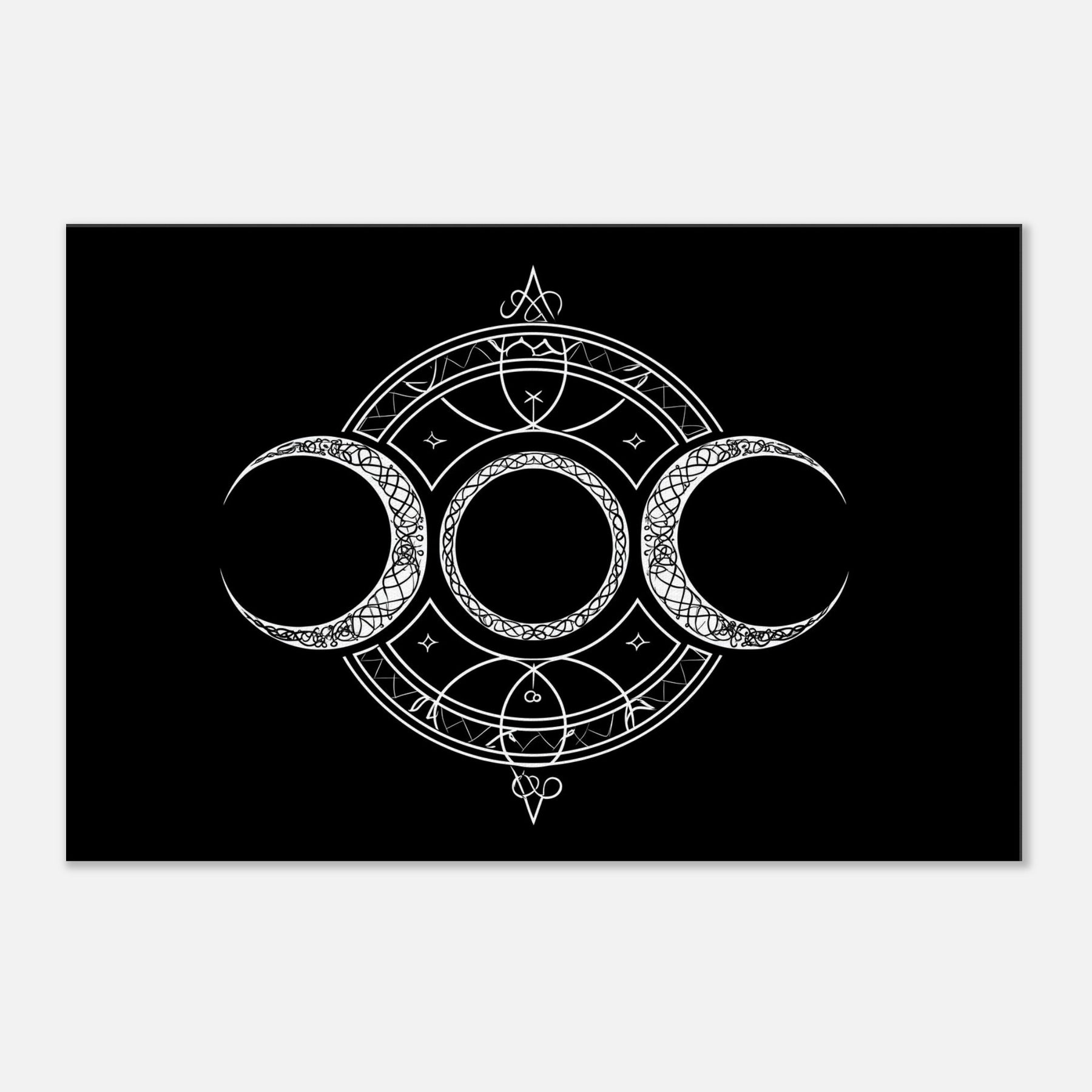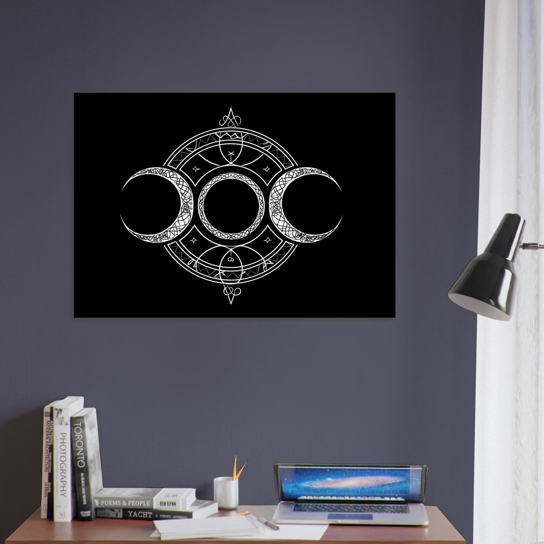 Step into a hush of nocturnal geometry with this Triple Moon line drawing, a gentle dance of circles and arcs that invites contemplation. The central trio of moons breathes in a quiet, open space, while delicate lines braid the rims with lace like precision. Rendered in luminous white against a midnight backdrop, it casts a serene glow that deepens living rooms, bedrooms, or libraries, enhancing mood, focus, and mystique without overpowering the space.
