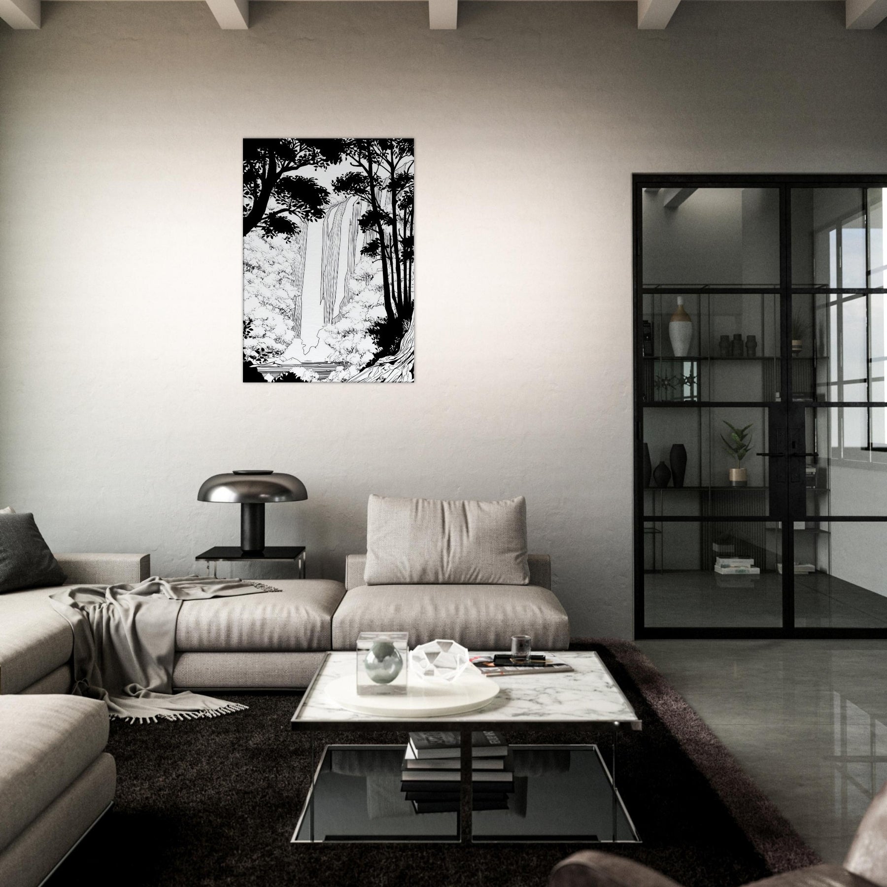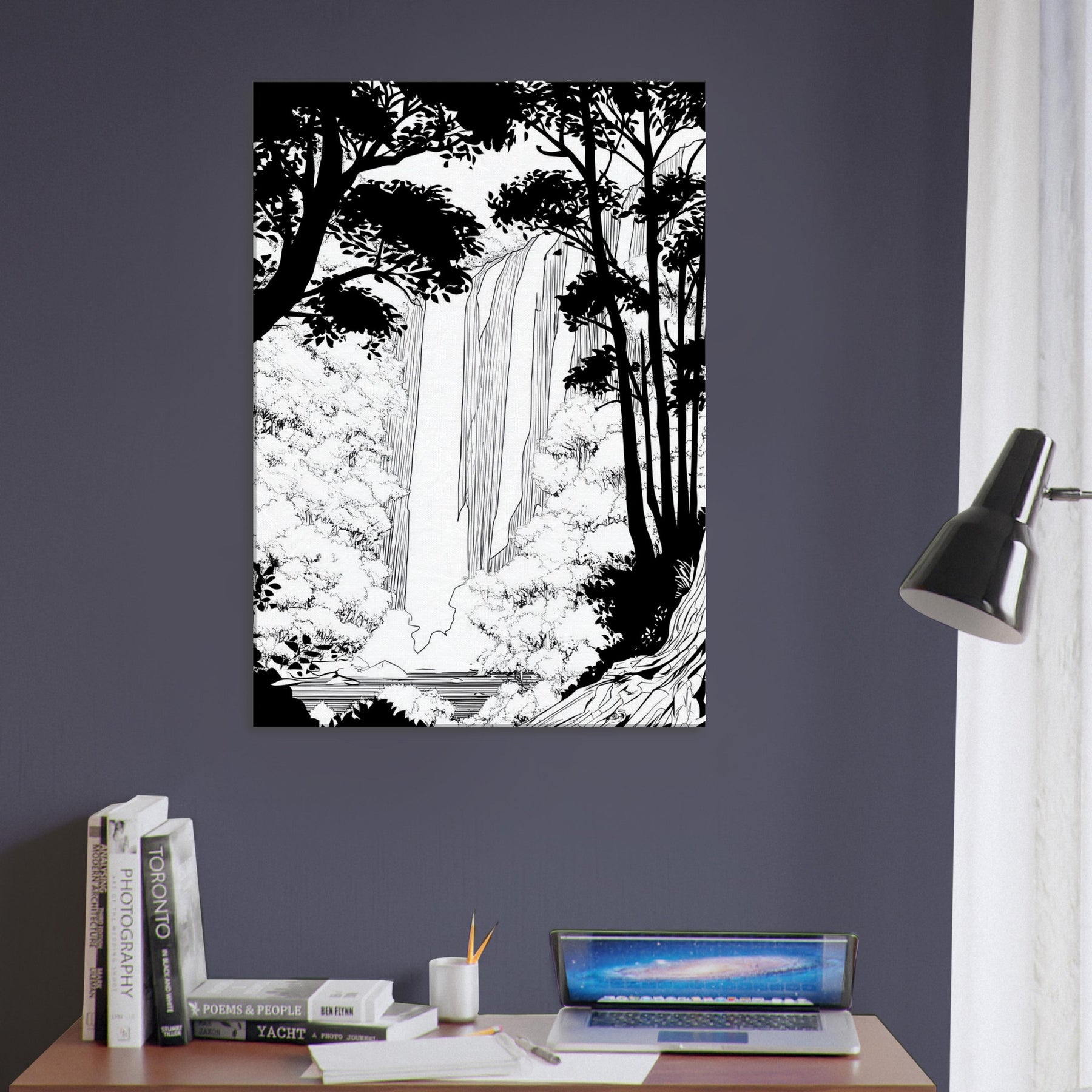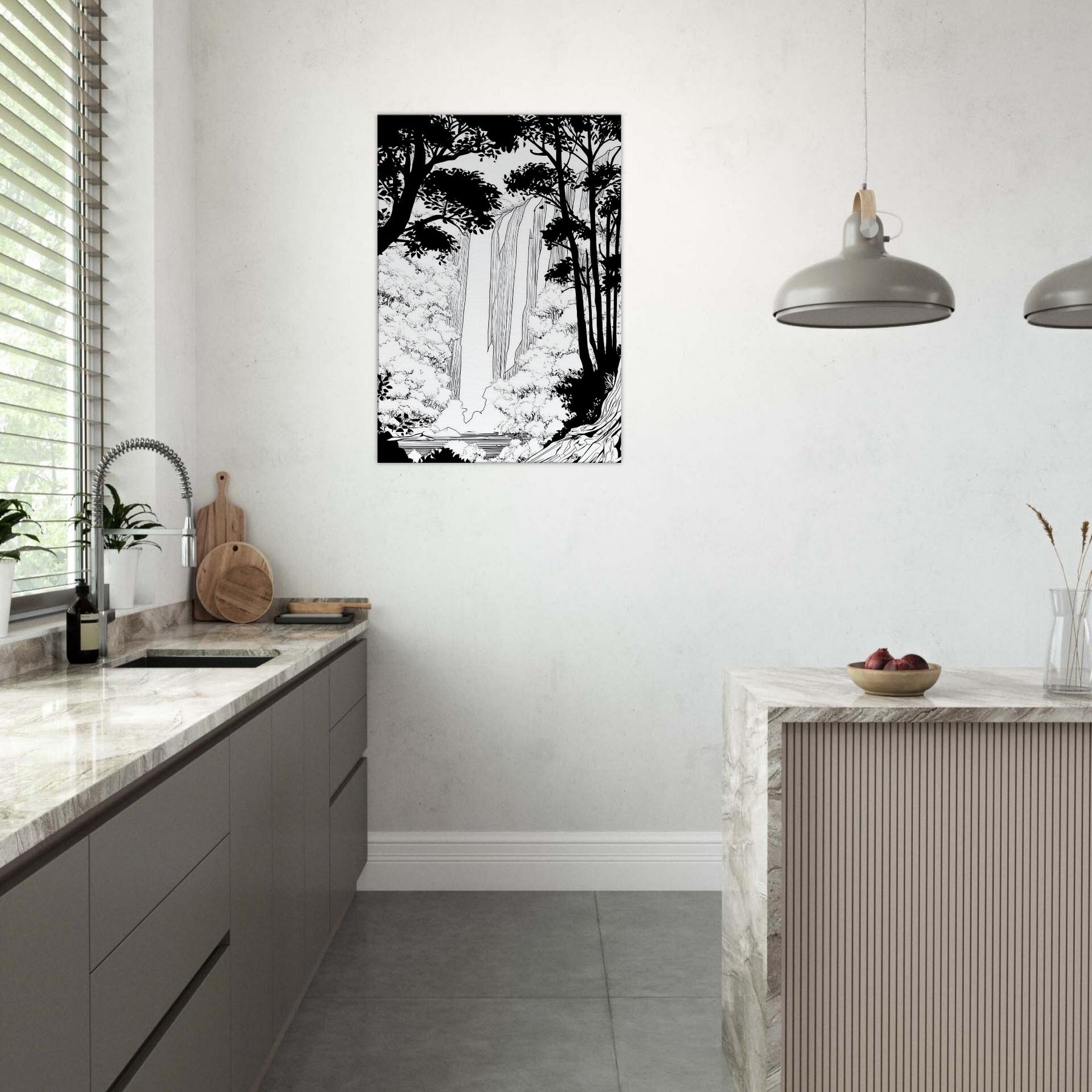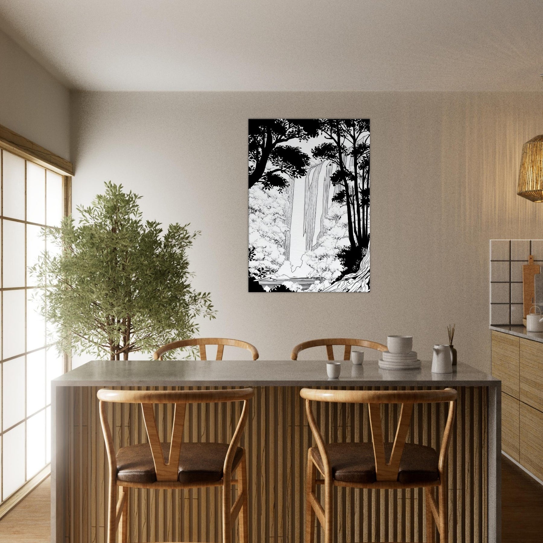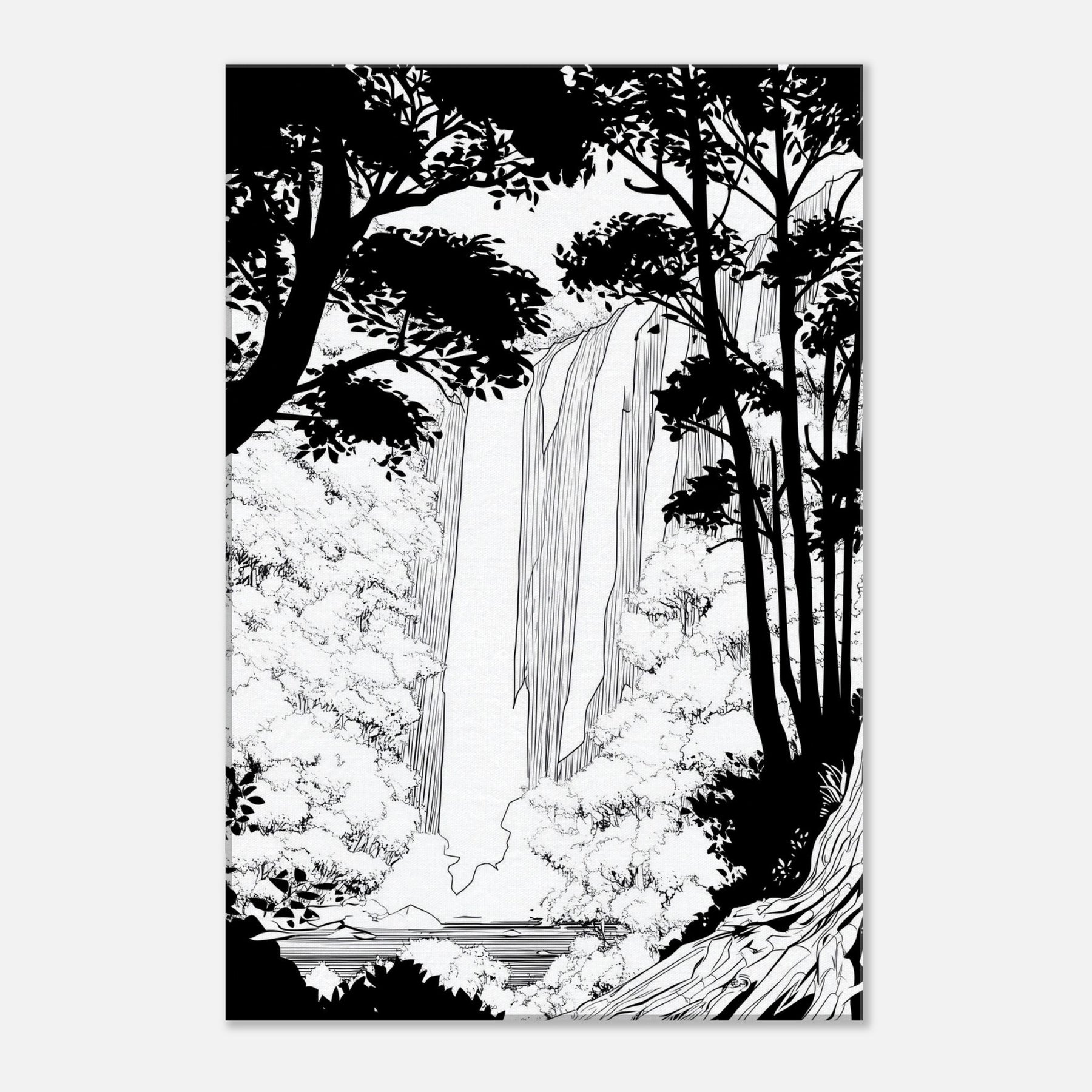 Tropical Rain invites a serene immersion into a rainforest world rendered in clean line. The waterfall spills through a forest of silhouetted trunks, with delicate foliage framing the scene. In stark contrast, the black and white palette breathes quiet energy, like rain softly tapping a window. As the primary subject, Tropical Rain, this piece elevates any living space with a calm, contemplative atmosphere, providing a focal point that feels timeless and modern. A refined reminder that nature's rhythm can be near at hand.