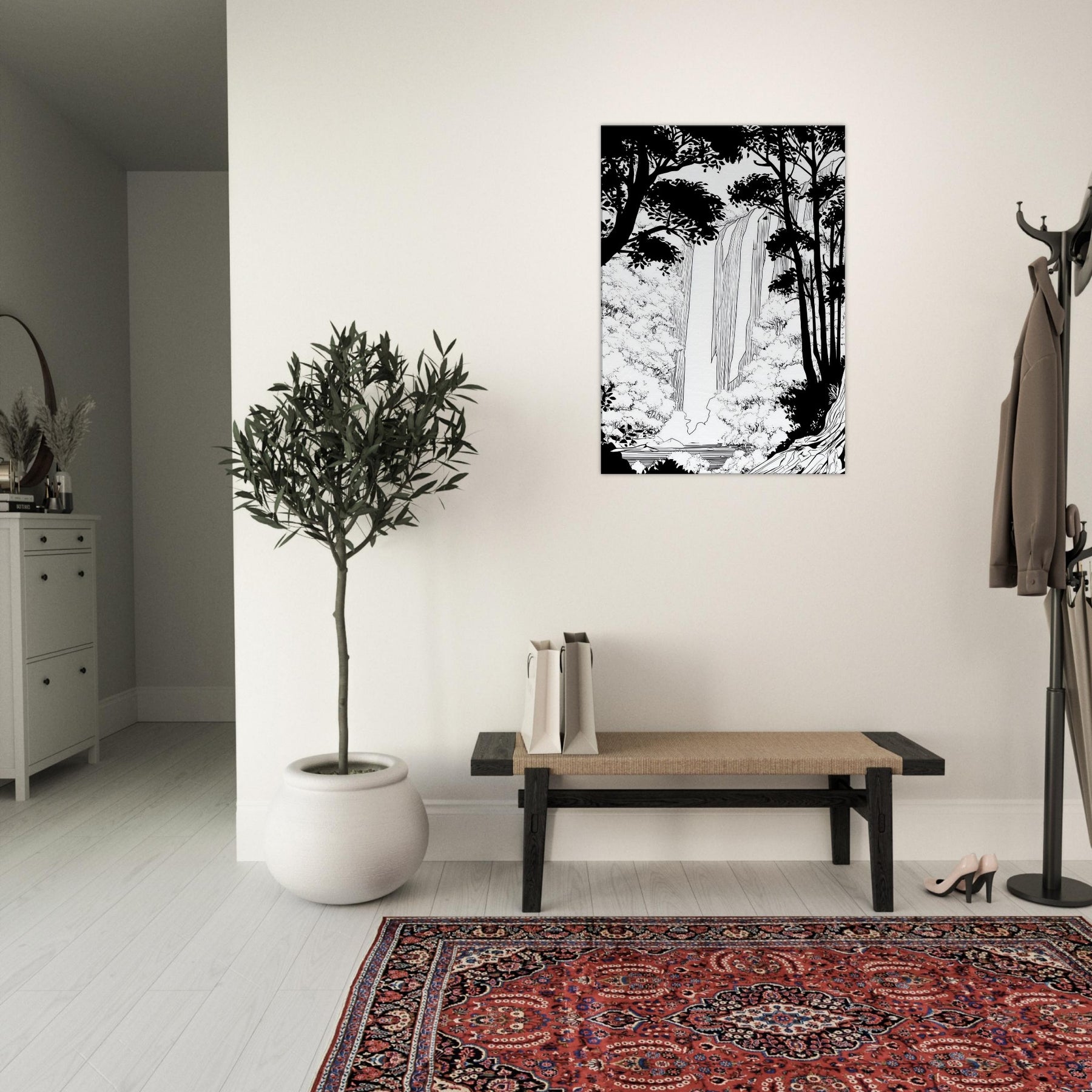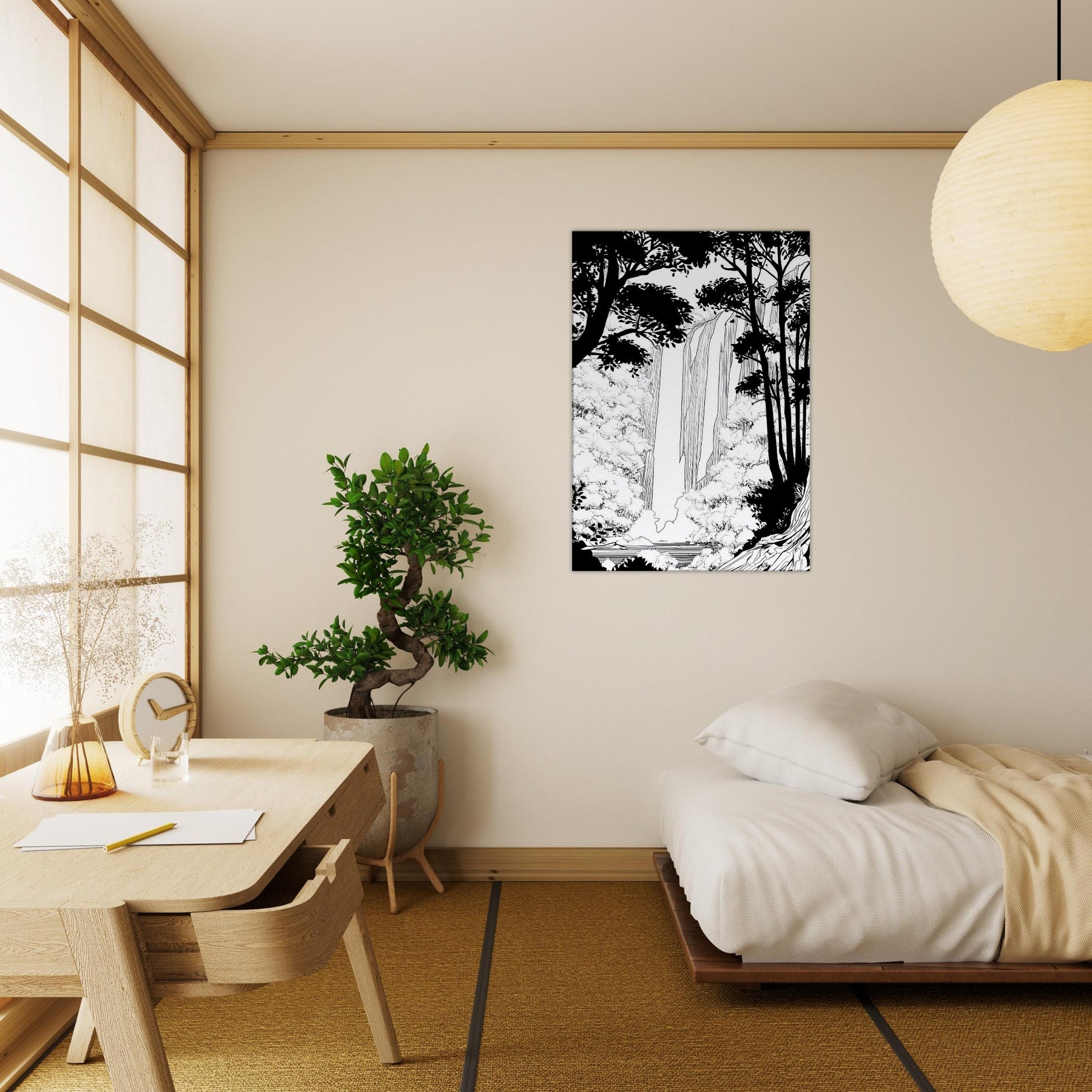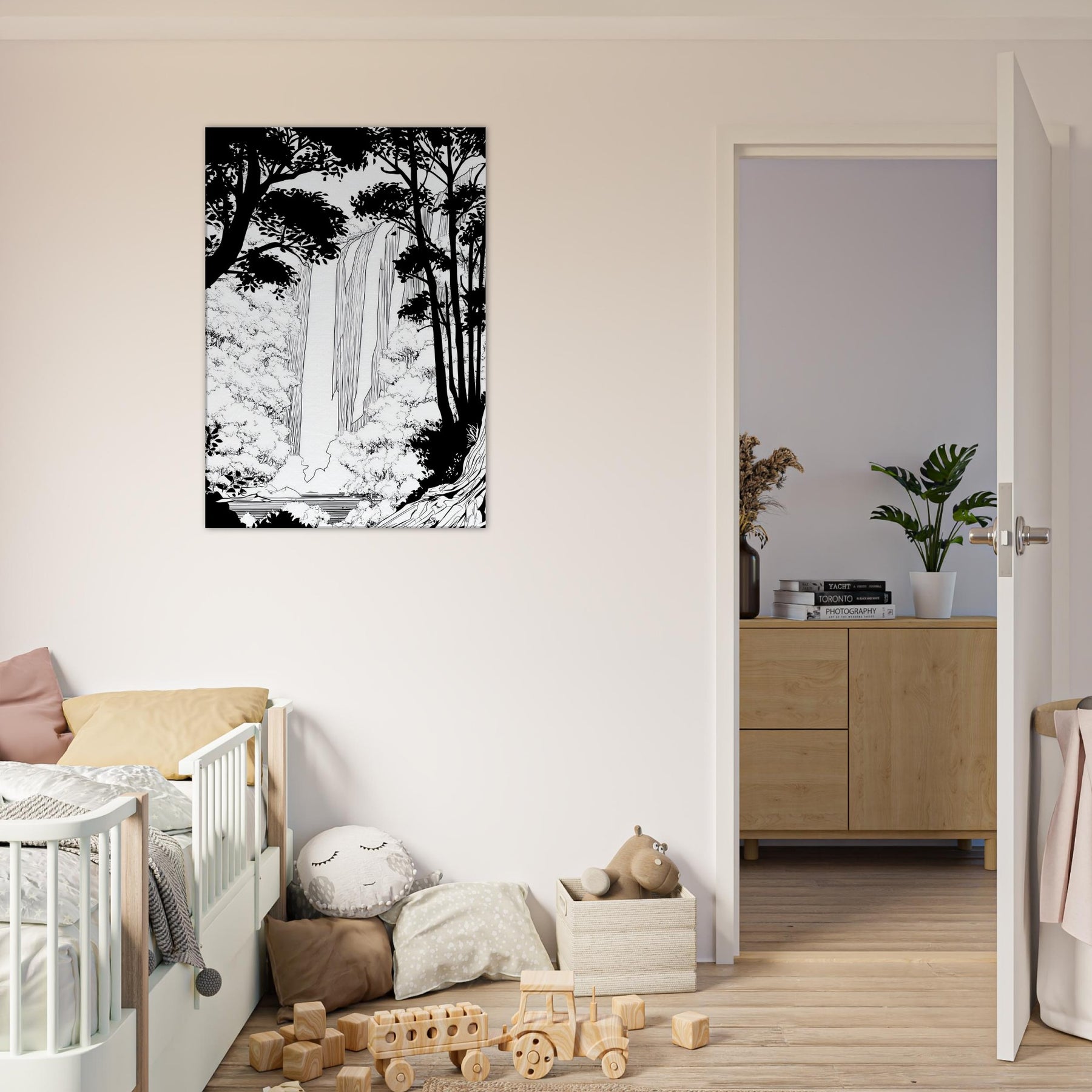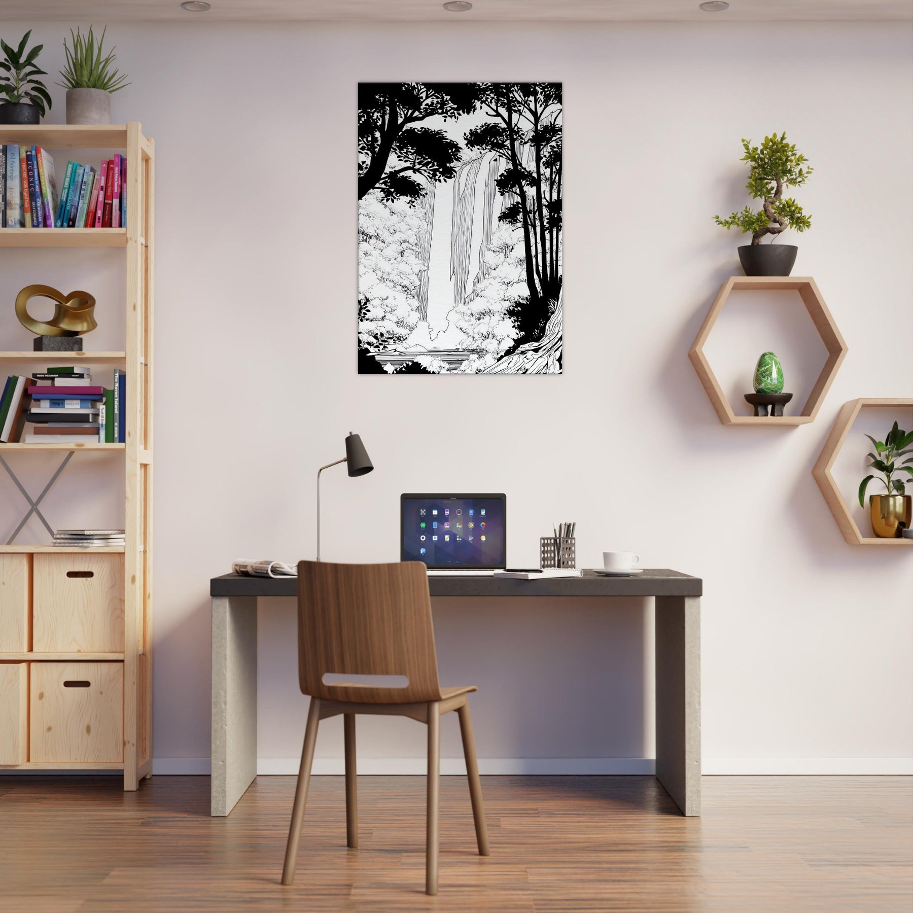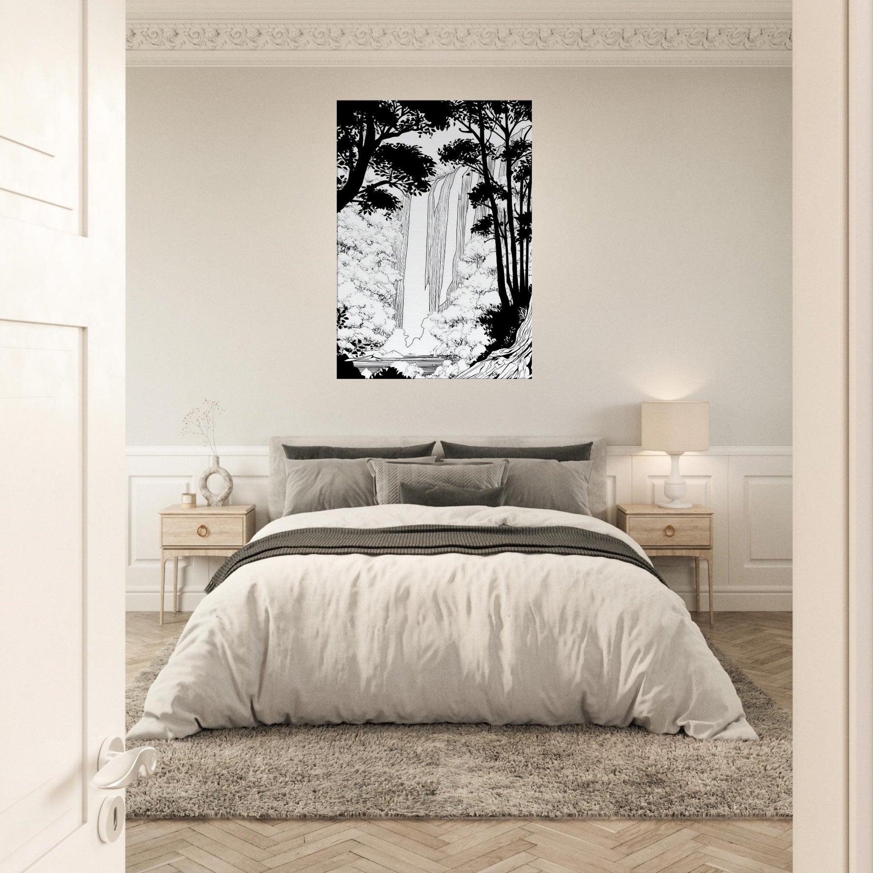 Tropical Rain invites a serene immersion into a rainforest world rendered in clean line. The waterfall spills through a forest of silhouetted trunks, with delicate foliage framing the scene. In stark contrast, the black and white palette breathes quiet energy, like rain softly tapping a window. As the primary subject, Tropical Rain, this piece elevates any living space with a calm, contemplative atmosphere, providing a focal point that feels timeless and modern. A refined reminder that nature's rhythm can be near at hand.