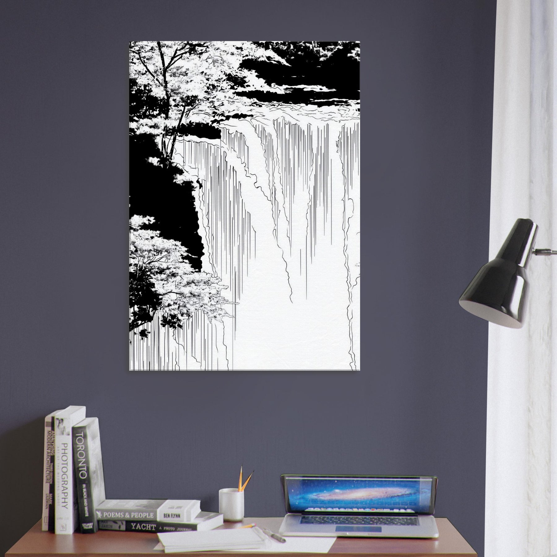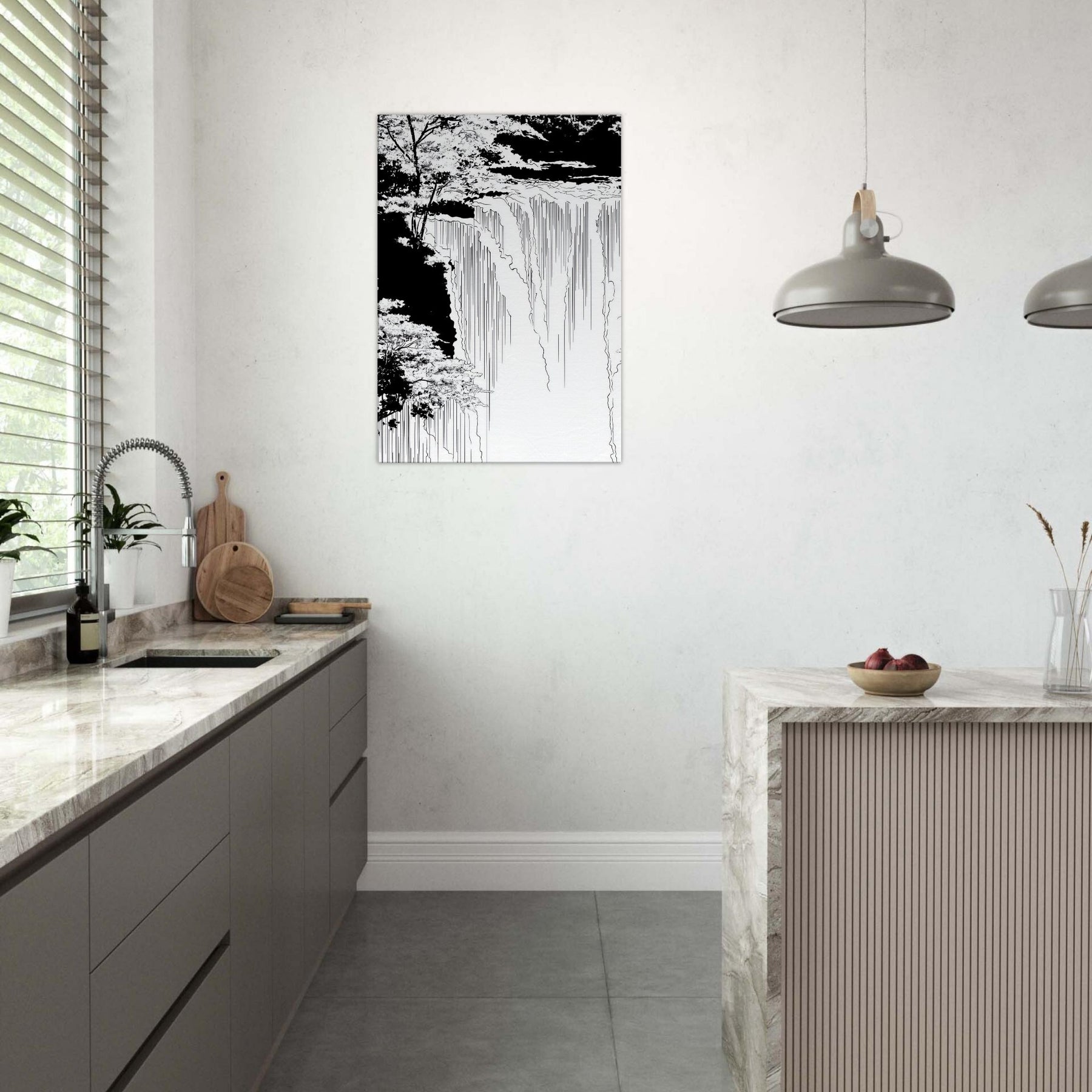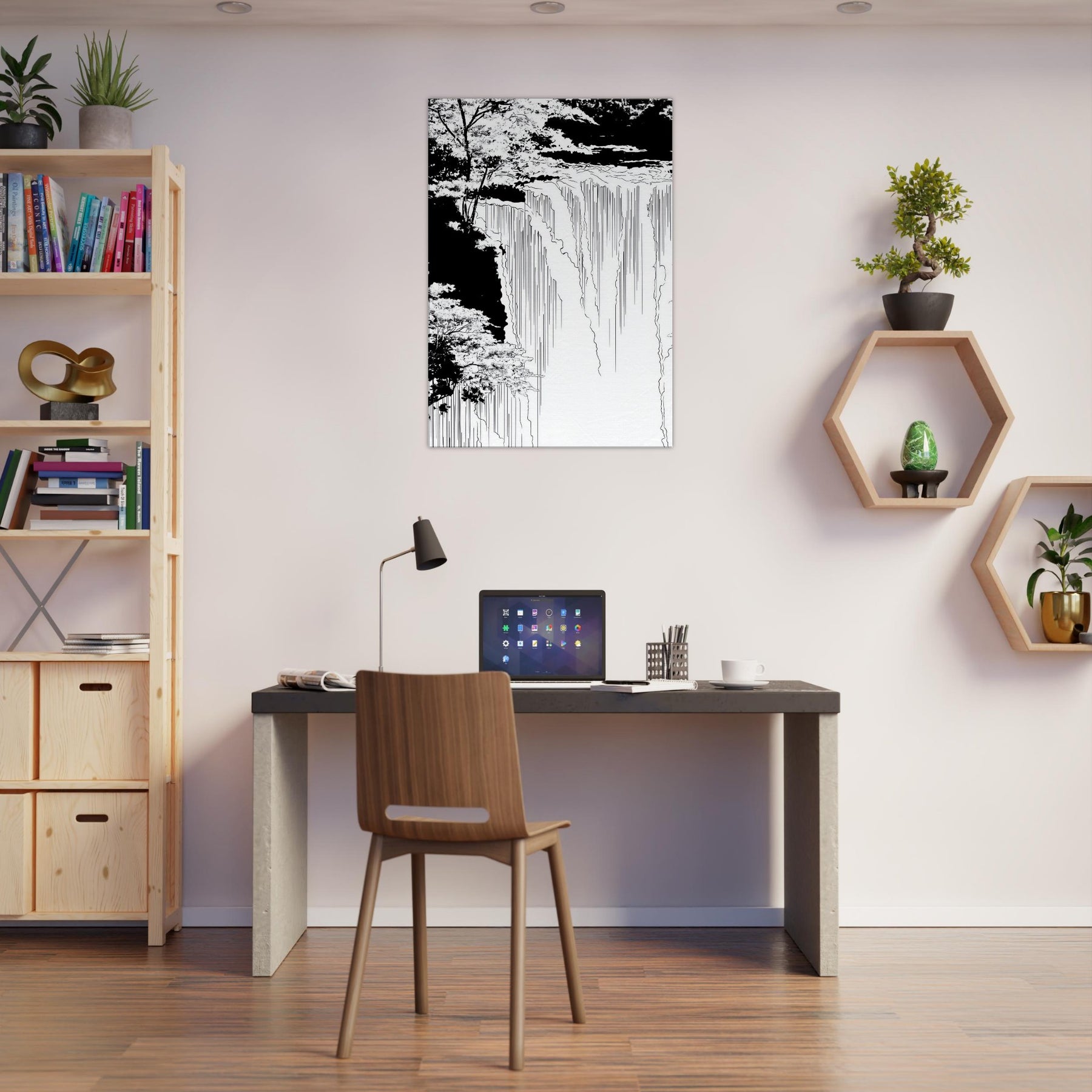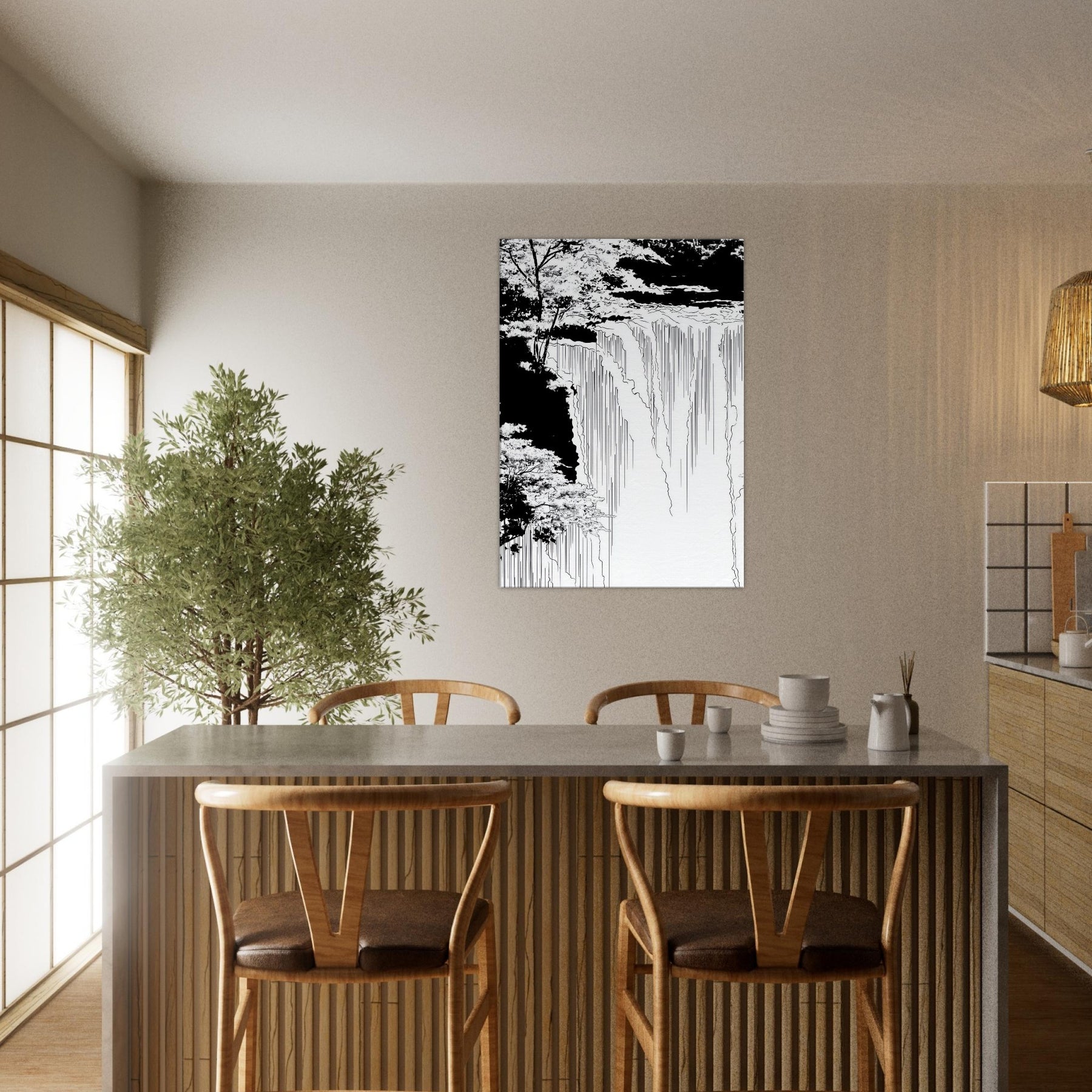 Immerse your space in the hush of Tropical Rain, captured in a poised line art flow that skims the edge of memory. Thin, continuous lines sketch rain and canopy, inviting the eye to wander from the shadowed edges to the luminous center. The piece breathe with cool, monochrome grace, turning a wall into a window of rain kissed calm. Ideal for a serene living area or a focused home office, it anchors tones and textures without shouting, elevating the room with quiet, natural poetry.