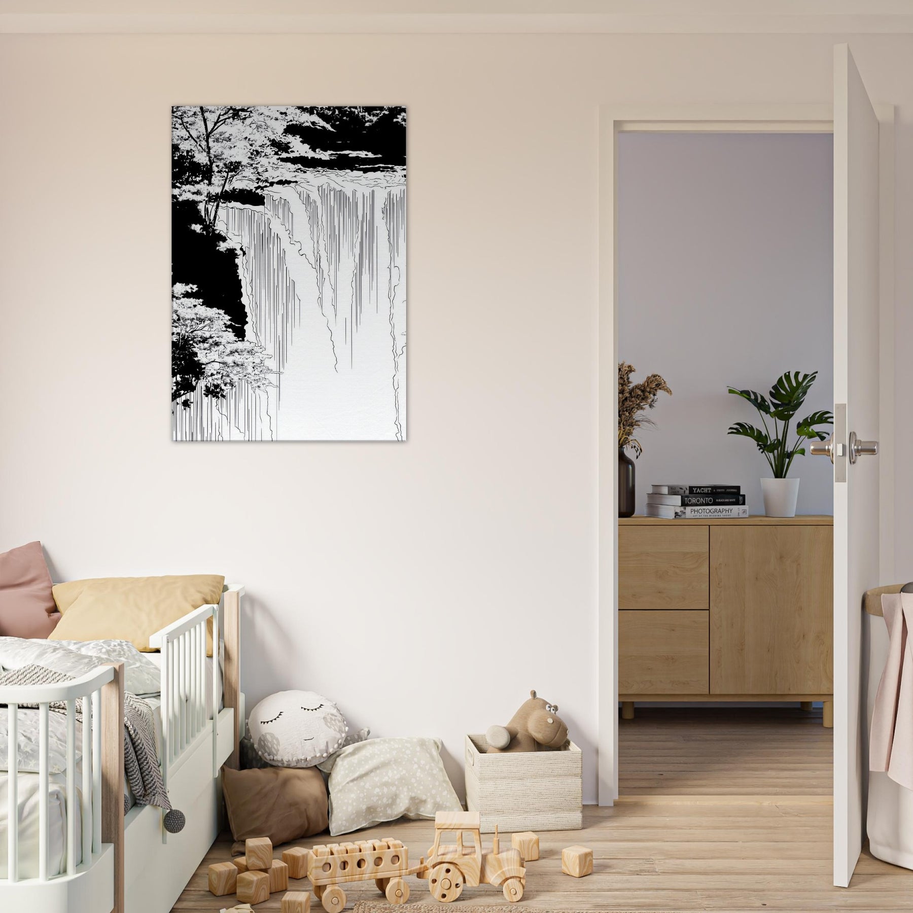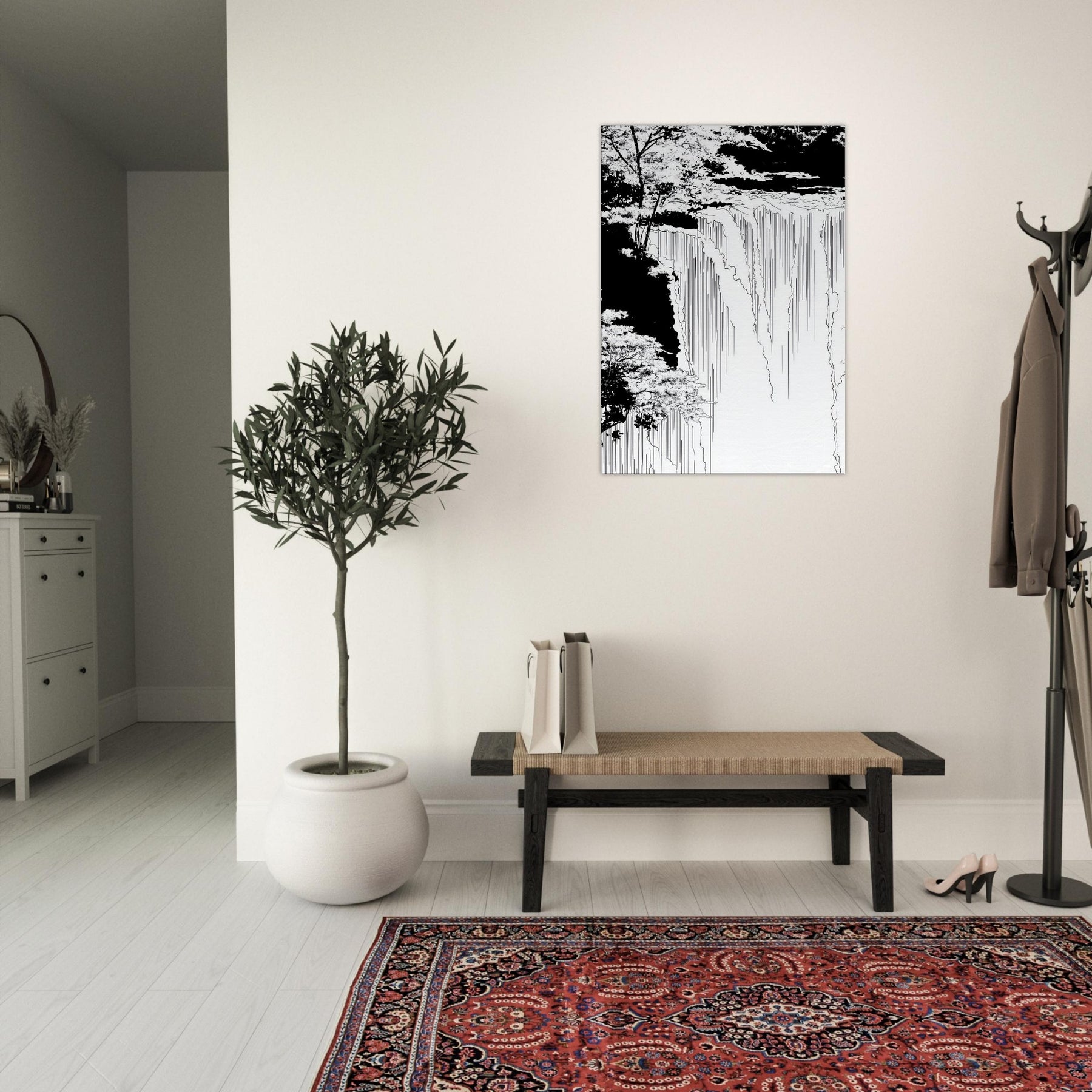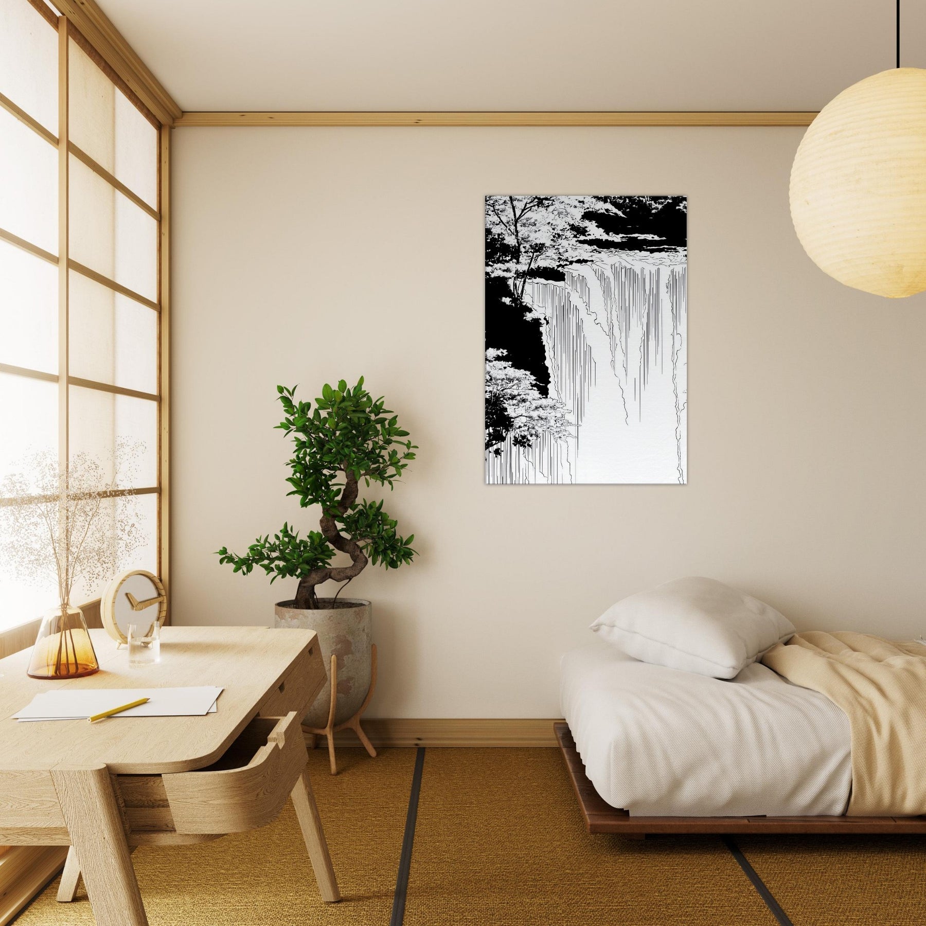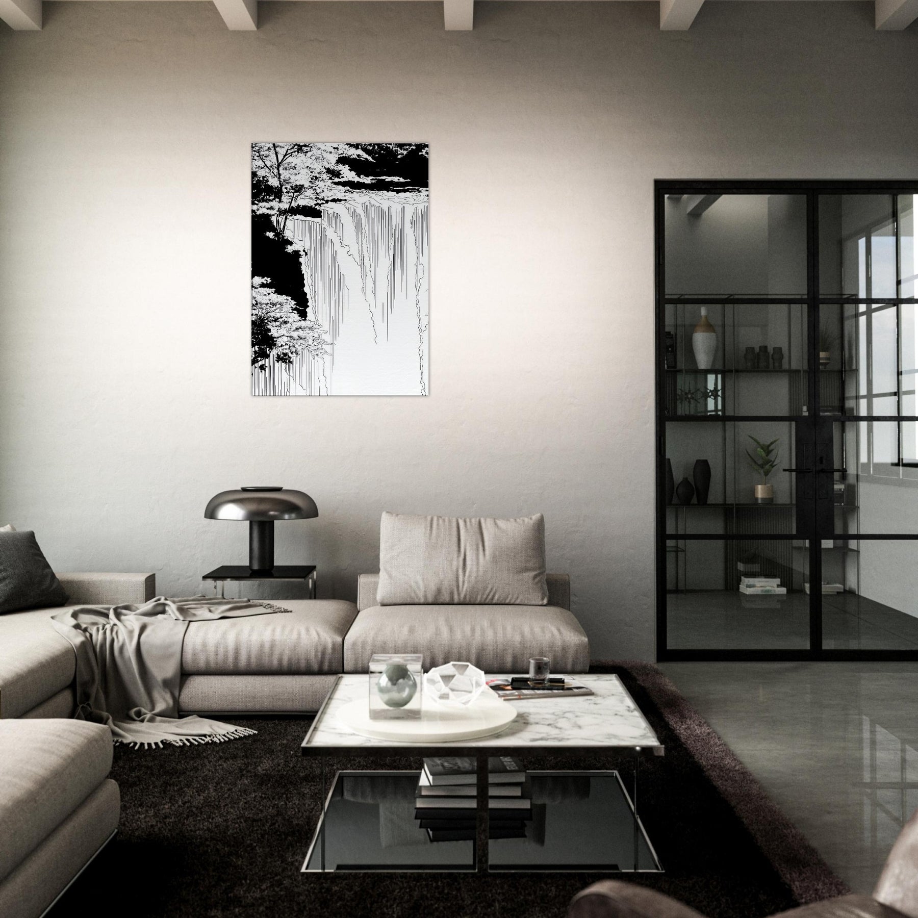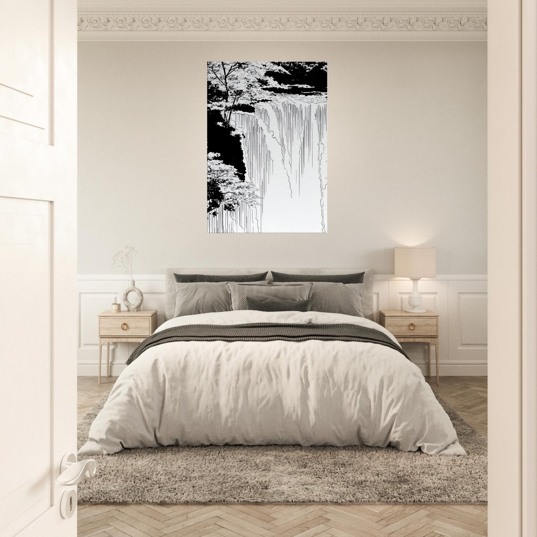 Immerse your space in the hush of Tropical Rain, captured in a poised line art flow that skims the edge of memory. Thin, continuous lines sketch rain and canopy, inviting the eye to wander from the shadowed edges to the luminous center. The piece breathe with cool, monochrome grace, turning a wall into a window of rain kissed calm. Ideal for a serene living area or a focused home office, it anchors tones and textures without shouting, elevating the room with quiet, natural poetry.