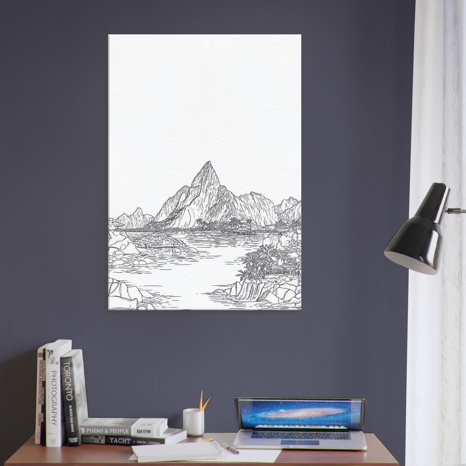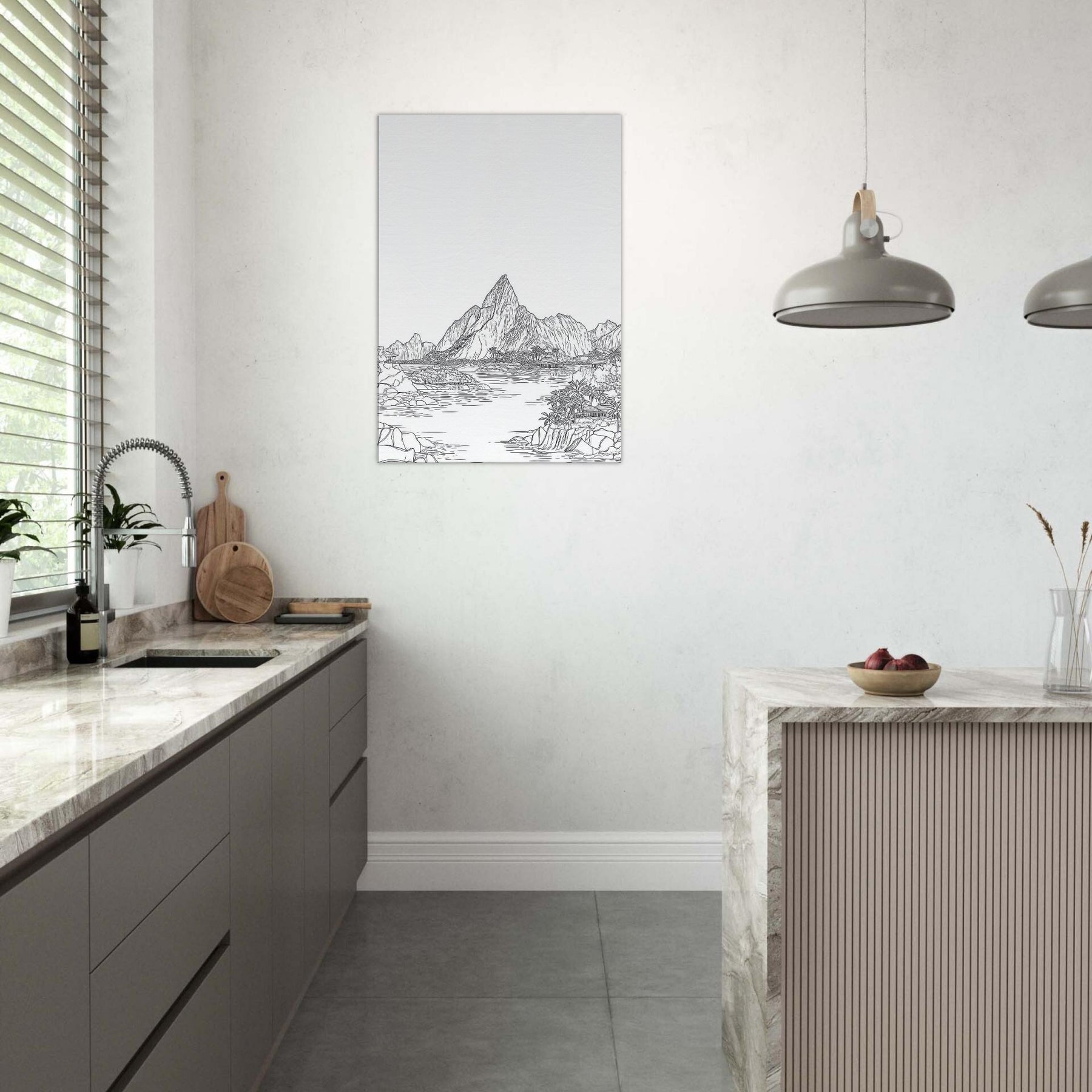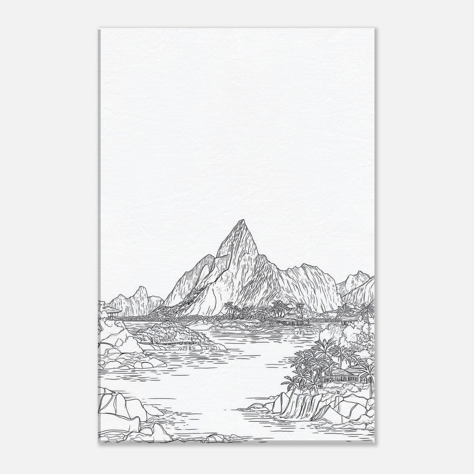 Escape to a quiet shoreline with this Tropical Island scene rendered in elegant line art. The composition unfolds with sunlit peaks, palm fringed coves, and shimmering water, all distilled into clean, confident strokes. This piece brings a sense of open air and quiet momentum to any room, inviting slow breaths and contemplative pause. Hang it in a living area or study to frame conversations in warmth and clarity, like a gentle island breeze.