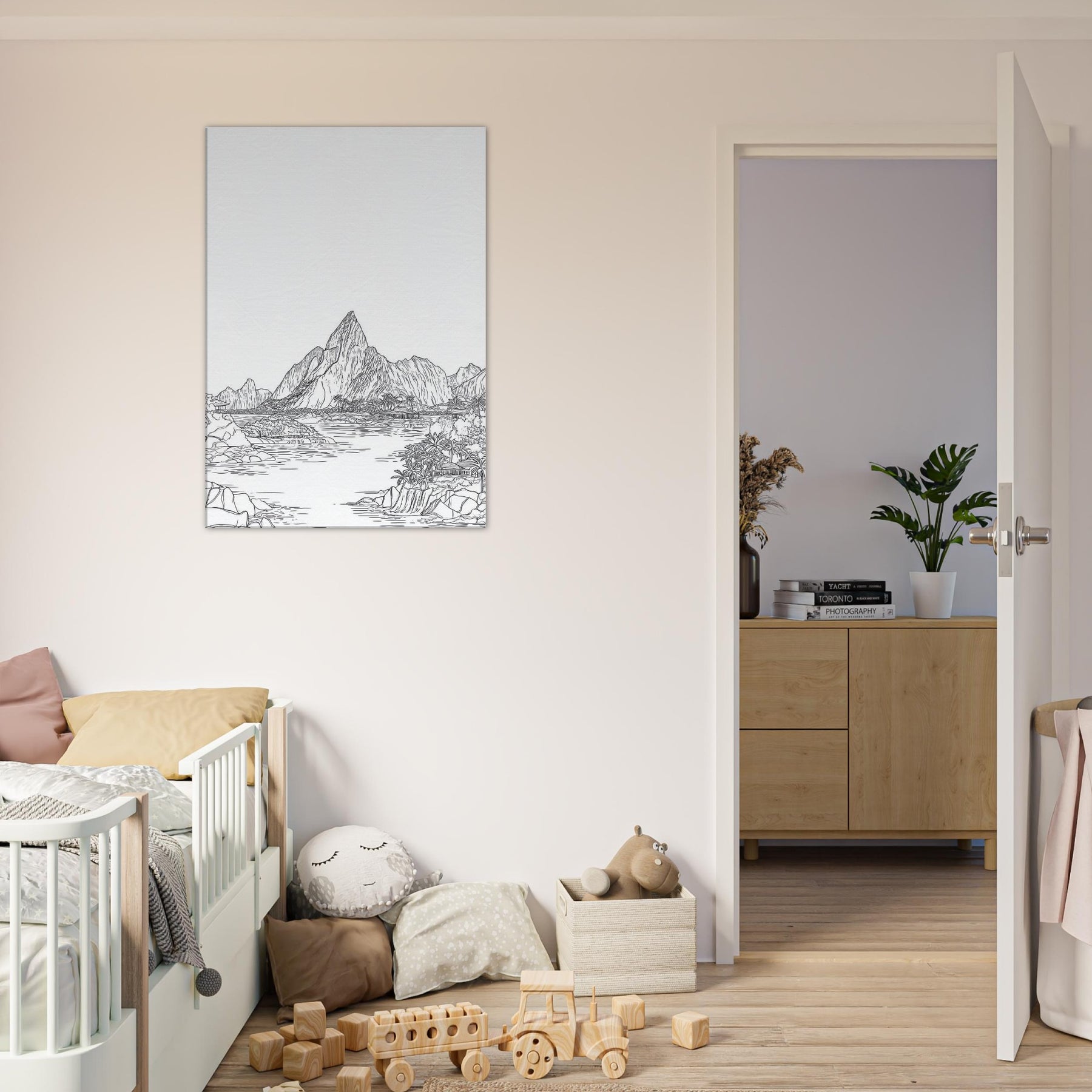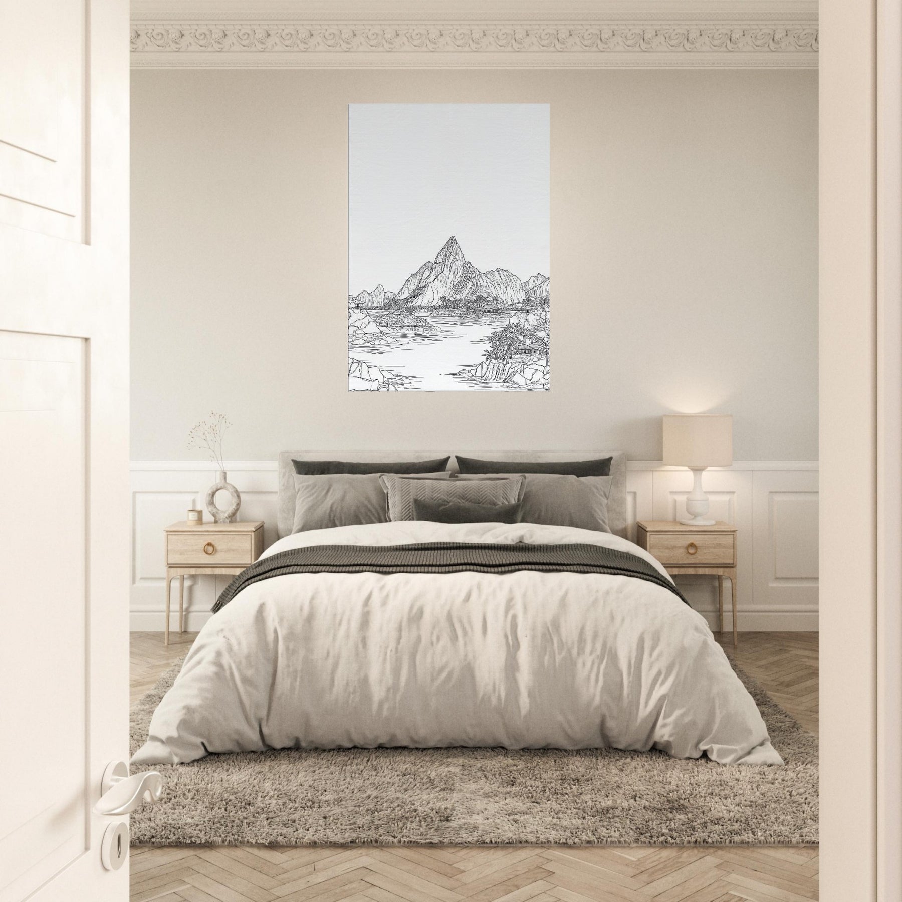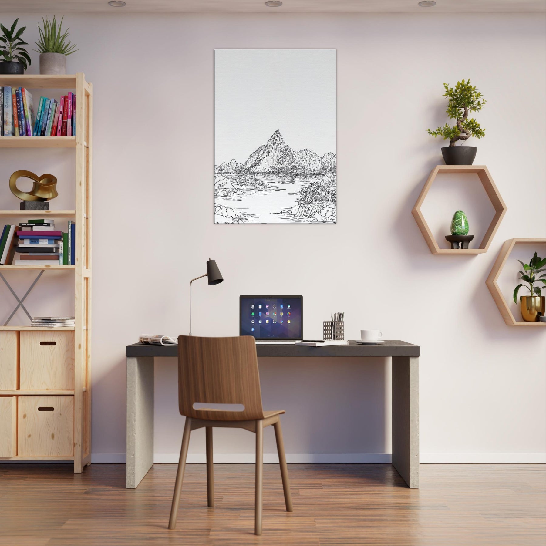 Escape to a quiet shoreline with this Tropical Island scene rendered in elegant line art. The composition unfolds with sunlit peaks, palm fringed coves, and shimmering water, all distilled into clean, confident strokes. This piece brings a sense of open air and quiet momentum to any room, inviting slow breaths and contemplative pause. Hang it in a living area or study to frame conversations in warmth and clarity, like a gentle island breeze.