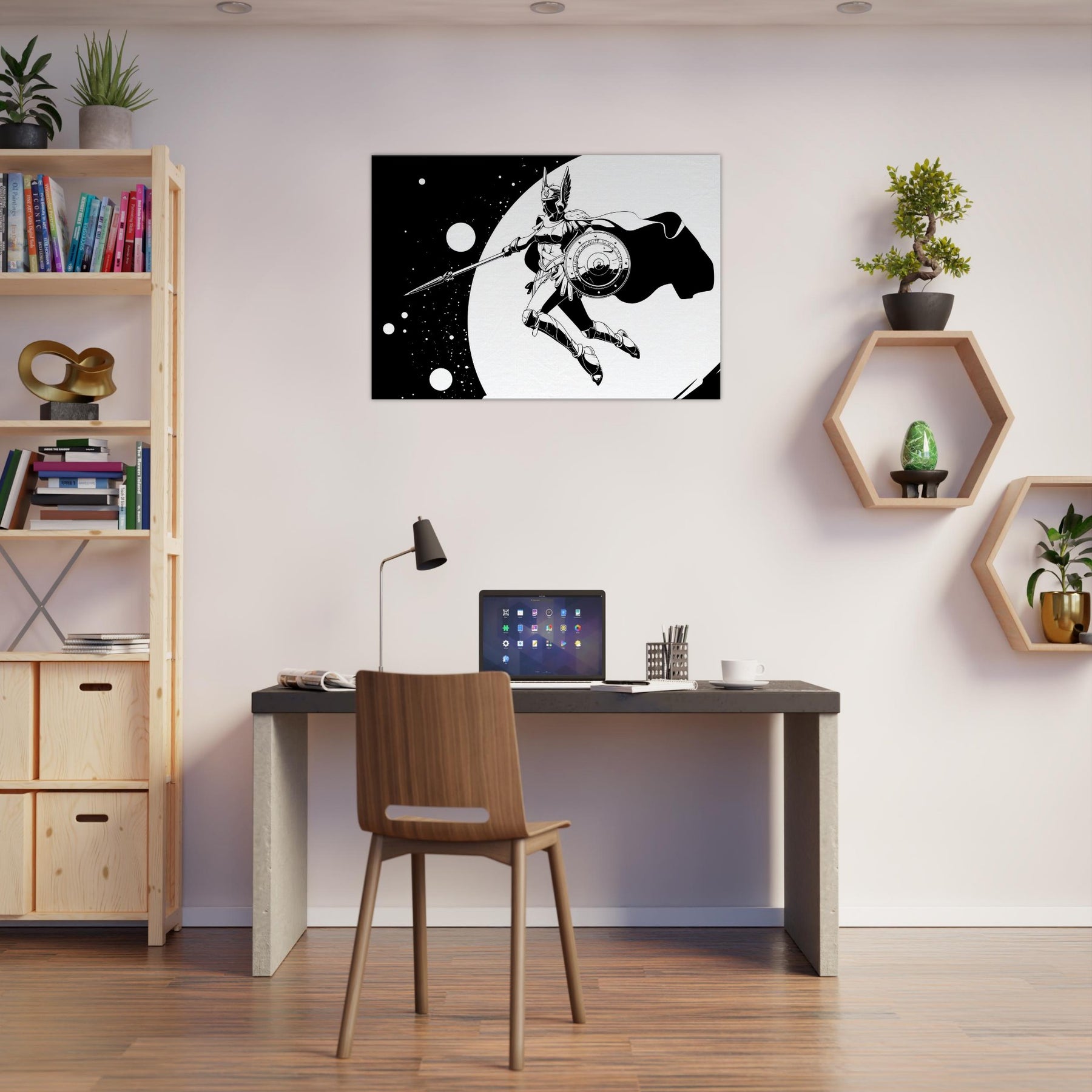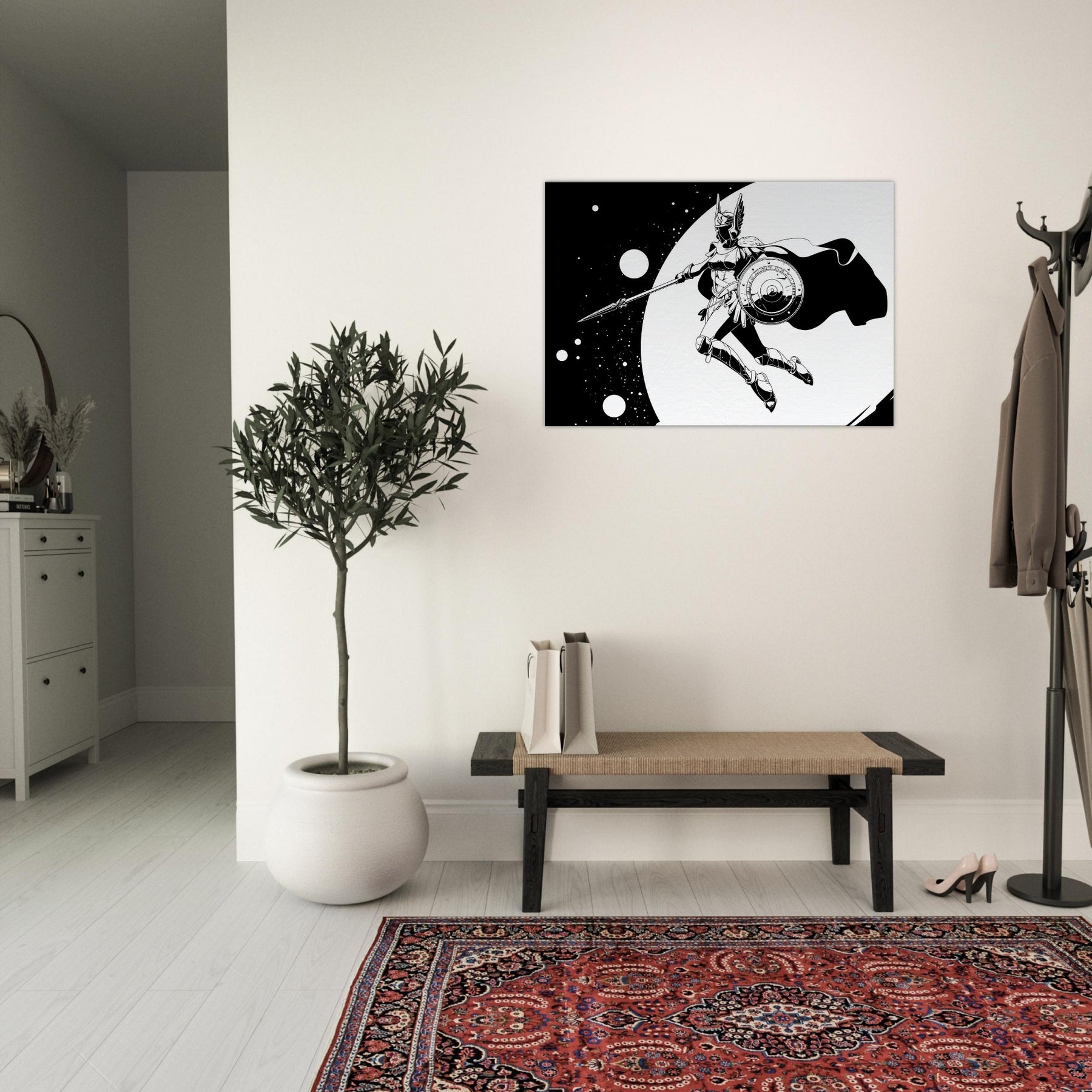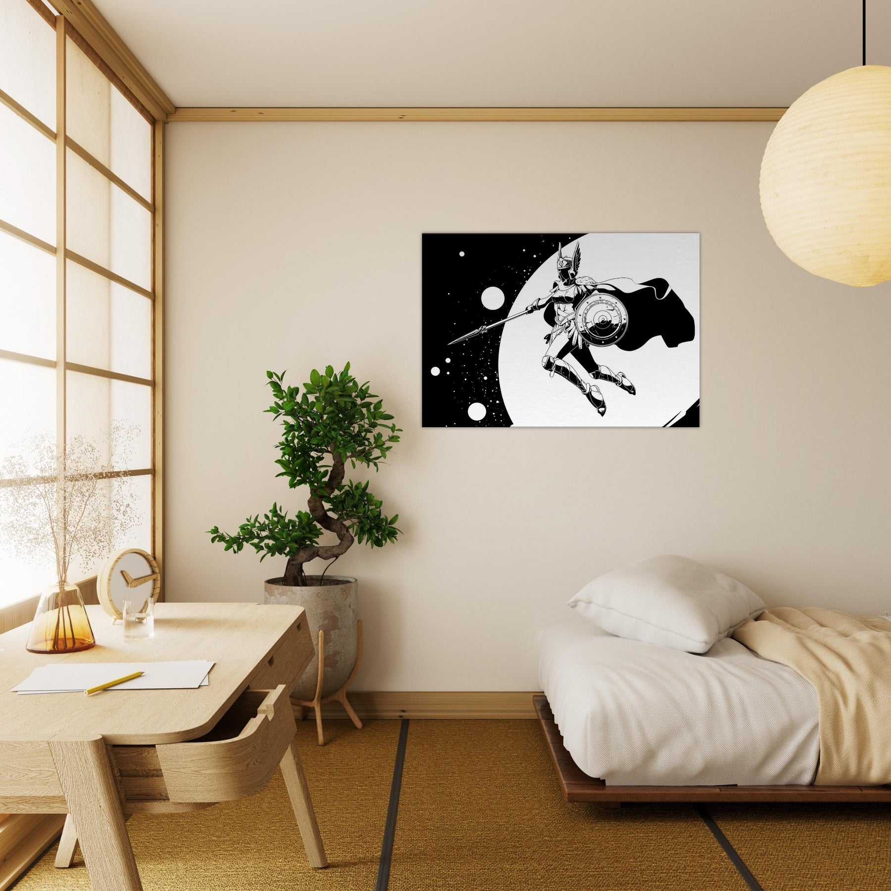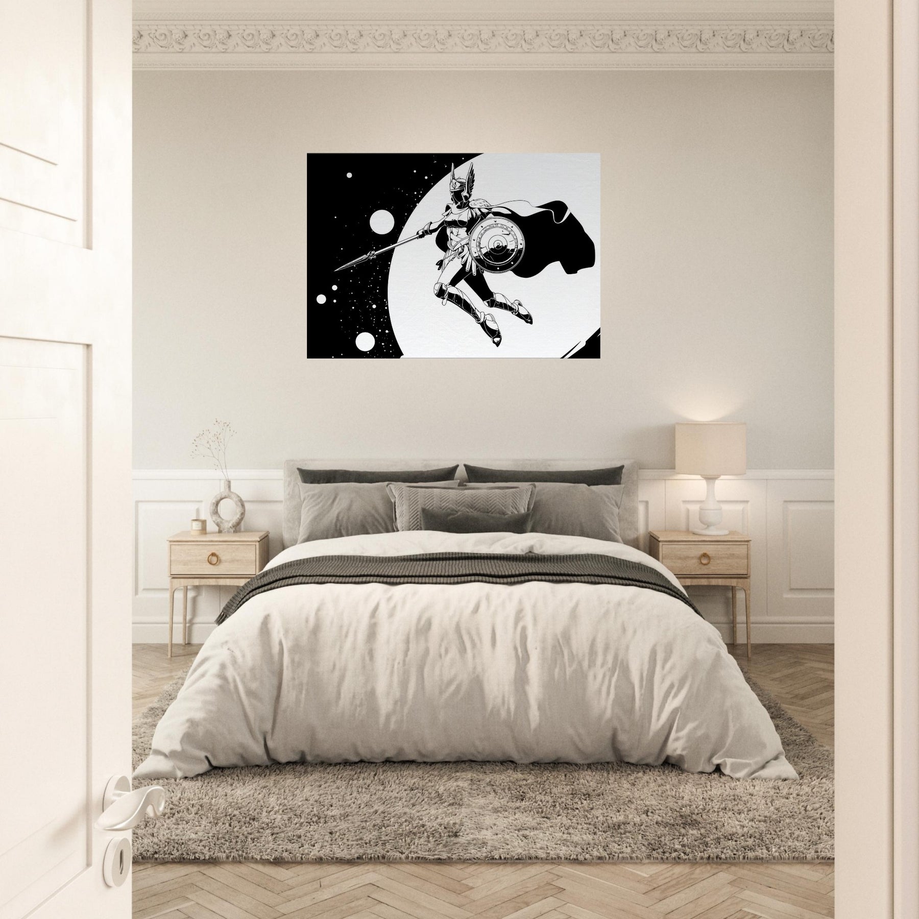 Valkyrie Descending from the Heavens unfurls in stark line and silhouette, weaving mythic power into a modern living space. This bold, monochrome scene captures motion and grace as the armored figure arches through space, spear poised, shield gleaming. The crisp contrasts and streamlined details invite quiet focus, turning a wall into a narrative window. Hang it over a sofa or in a study to infuse the room with epic romance, clarity, and enduring, celestial energy.