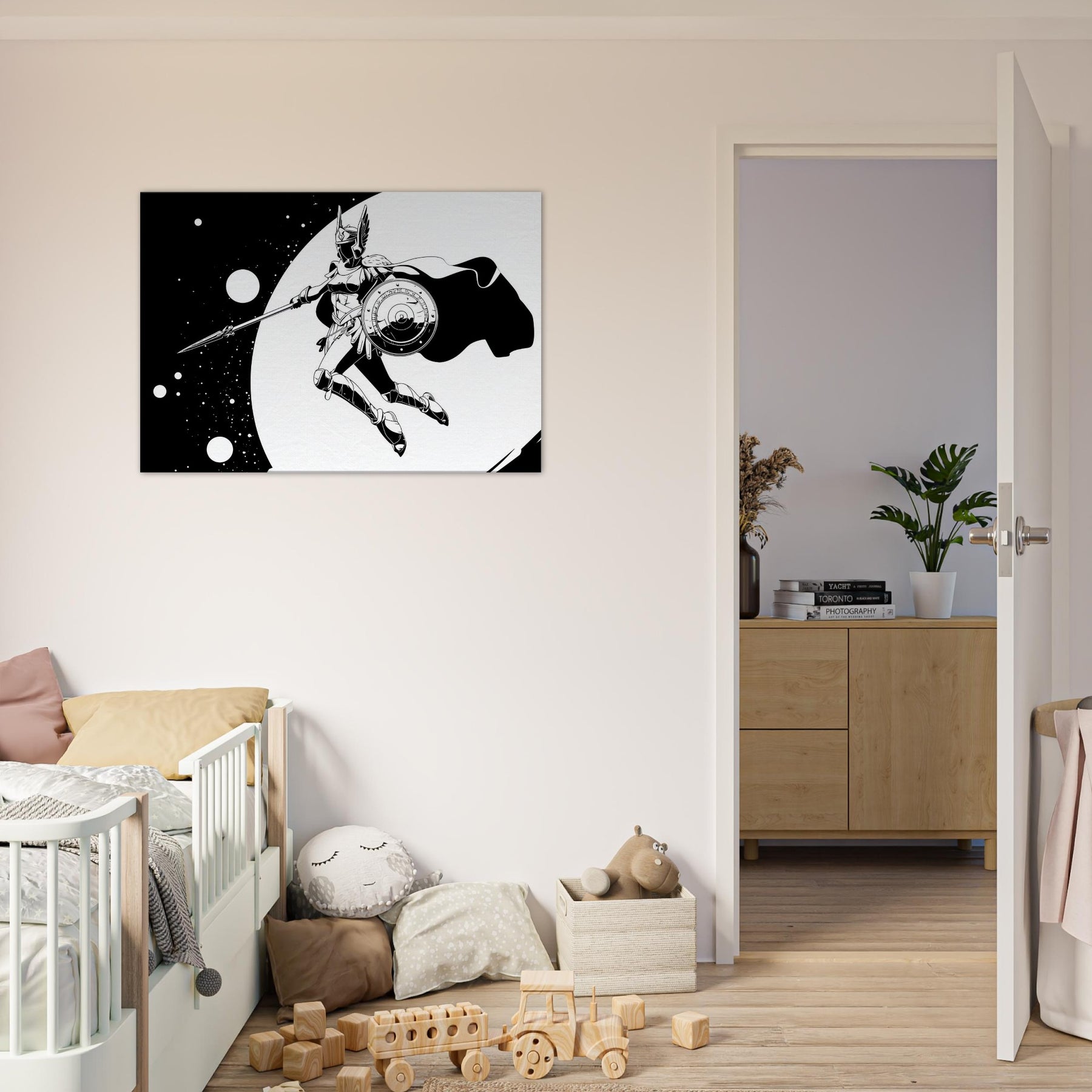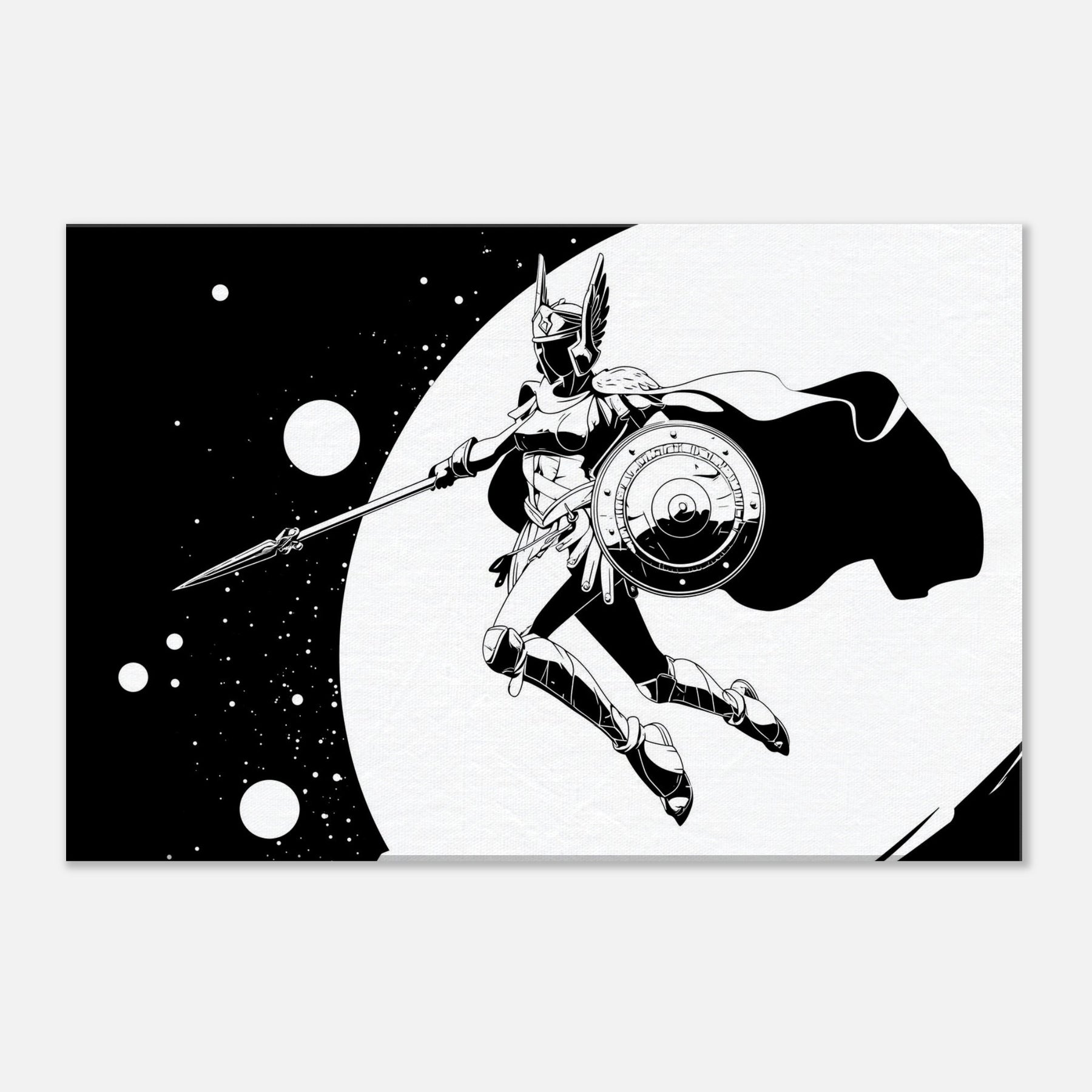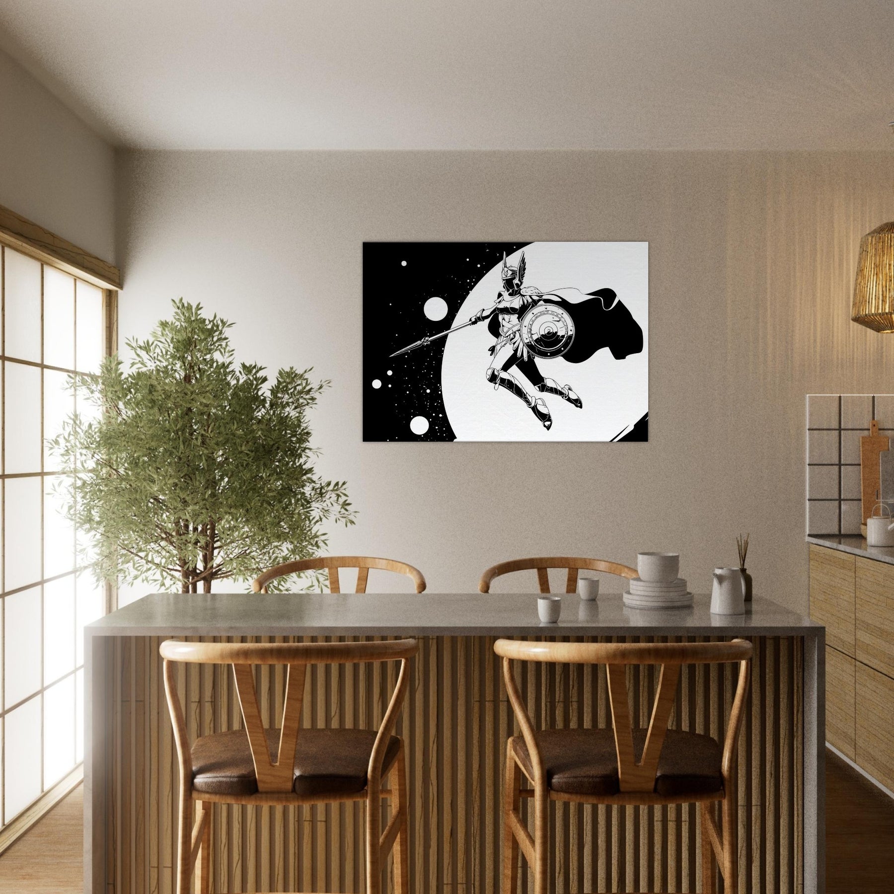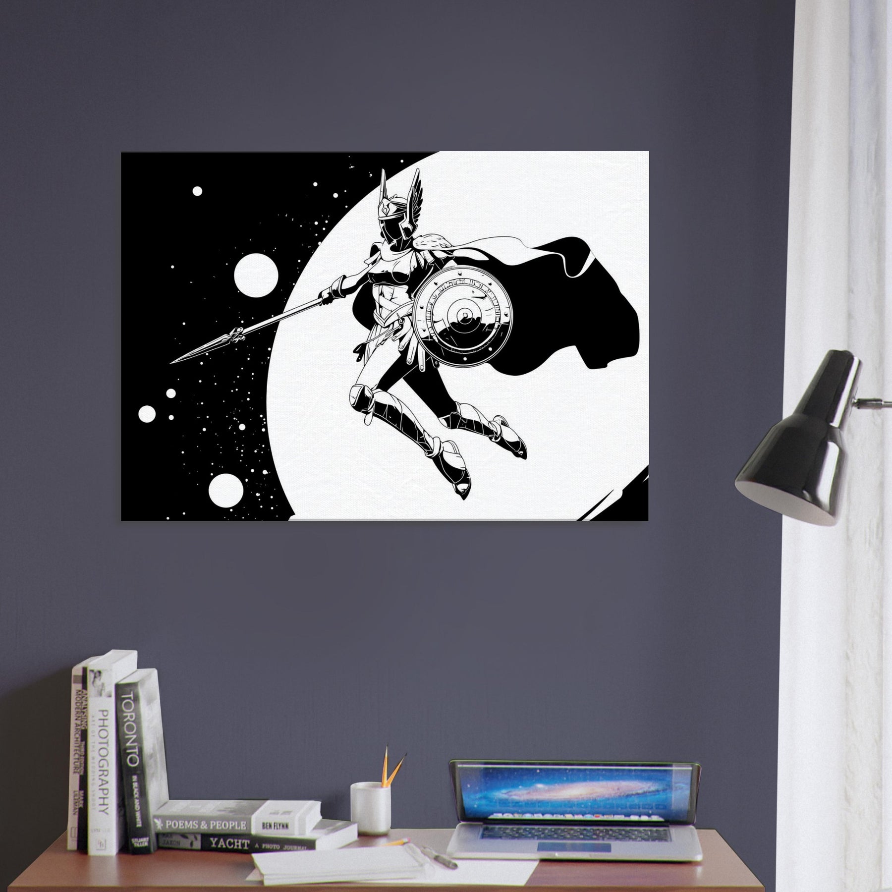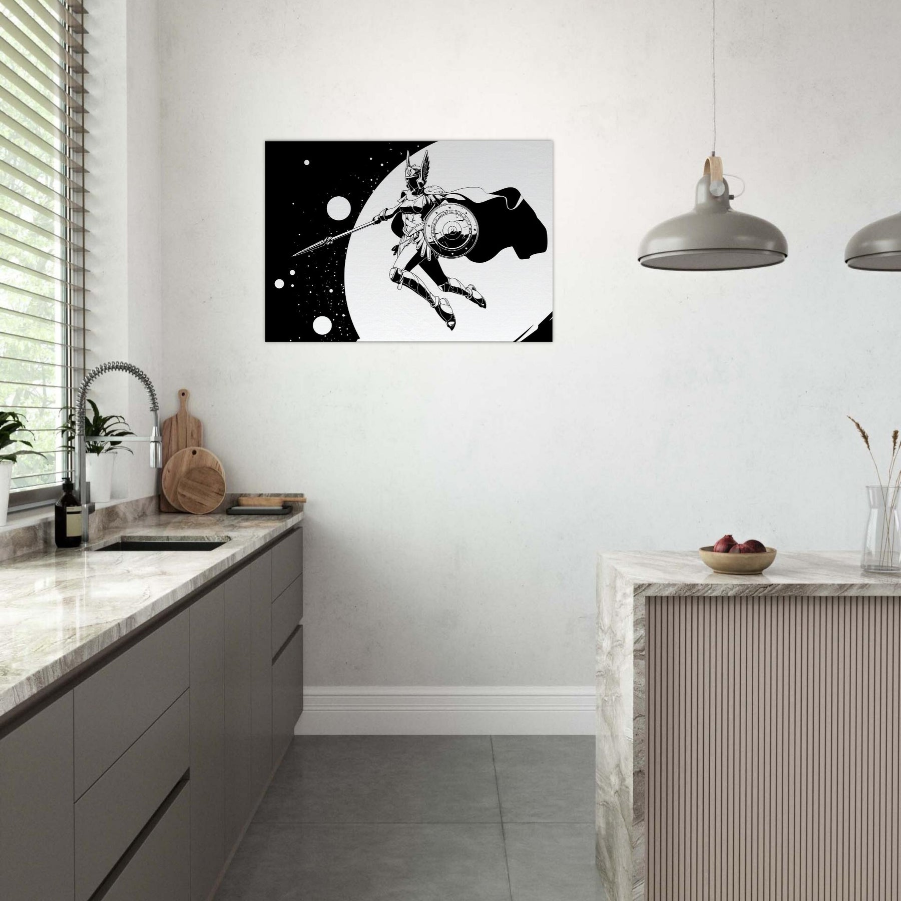 Valkyrie Descending from the Heavens unfurls in stark line and silhouette, weaving mythic power into a modern living space. This bold, monochrome scene captures motion and grace as the armored figure arches through space, spear poised, shield gleaming. The crisp contrasts and streamlined details invite quiet focus, turning a wall into a narrative window. Hang it over a sofa or in a study to infuse the room with epic romance, clarity, and enduring, celestial energy.