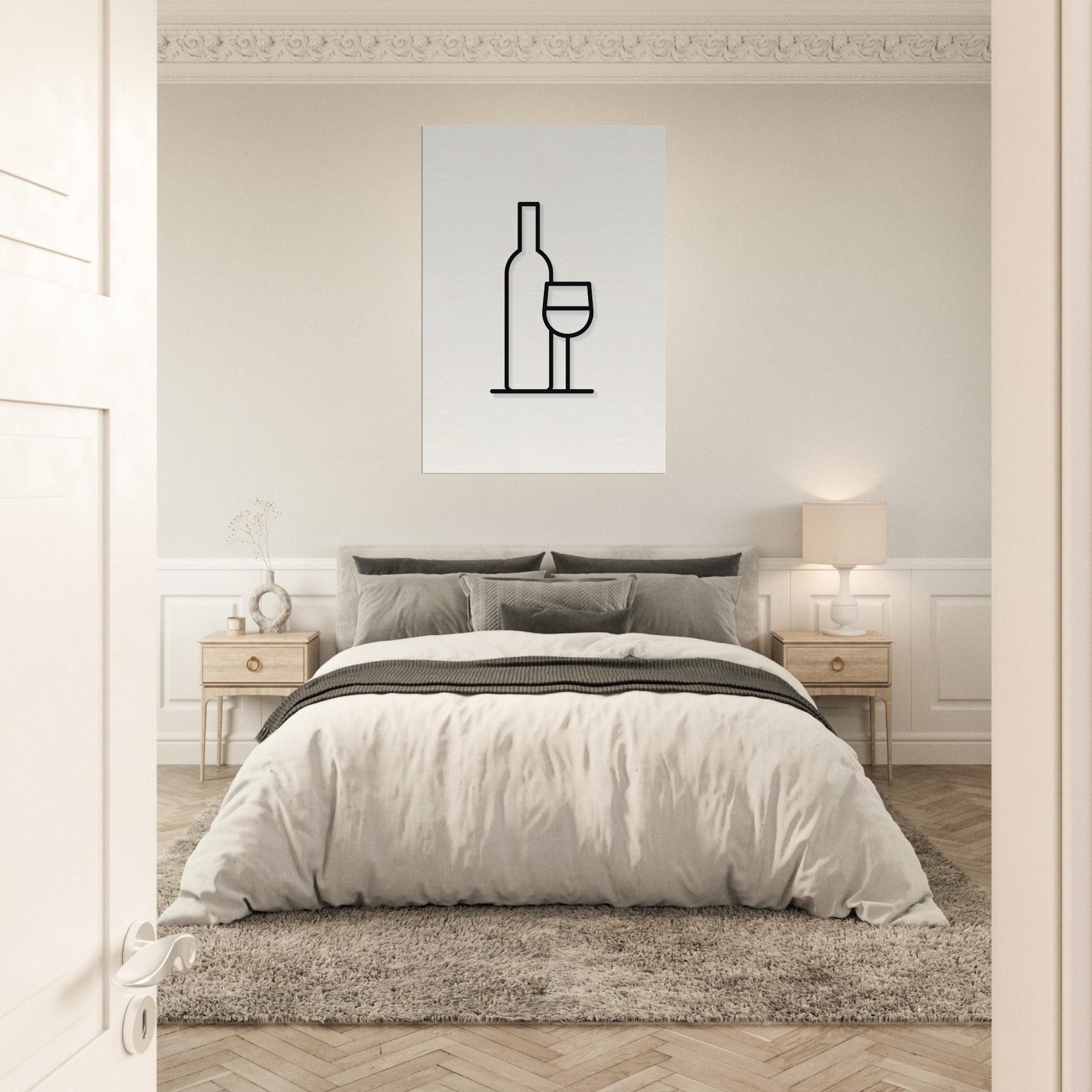 This line art study of a Wine Bottle and Glass distills a familiar ritual into pure form. The bold black contours float against a warm, neutral field, inviting a quiet pause in living spaces. As the eye travels the slender bottle and delicate stem, the scene suggests rituals of tea and wine alike conversations, candlelight, soft evenings. Perfect for a dining nook or lounge, it adds refined structure, a touch of elegance, and a contemporary mood that heightens texture, light, and everyday luxury without shouting.