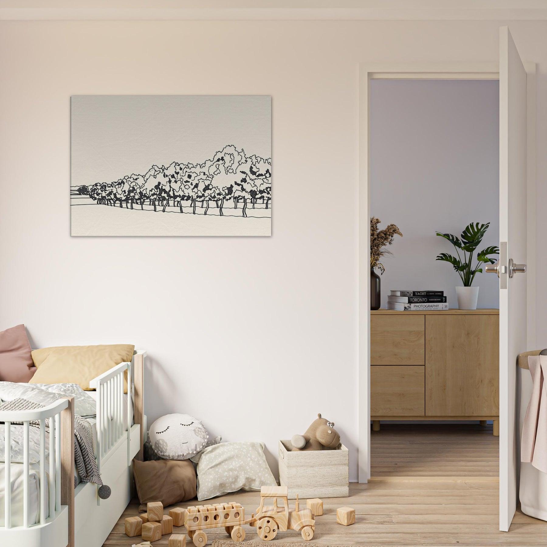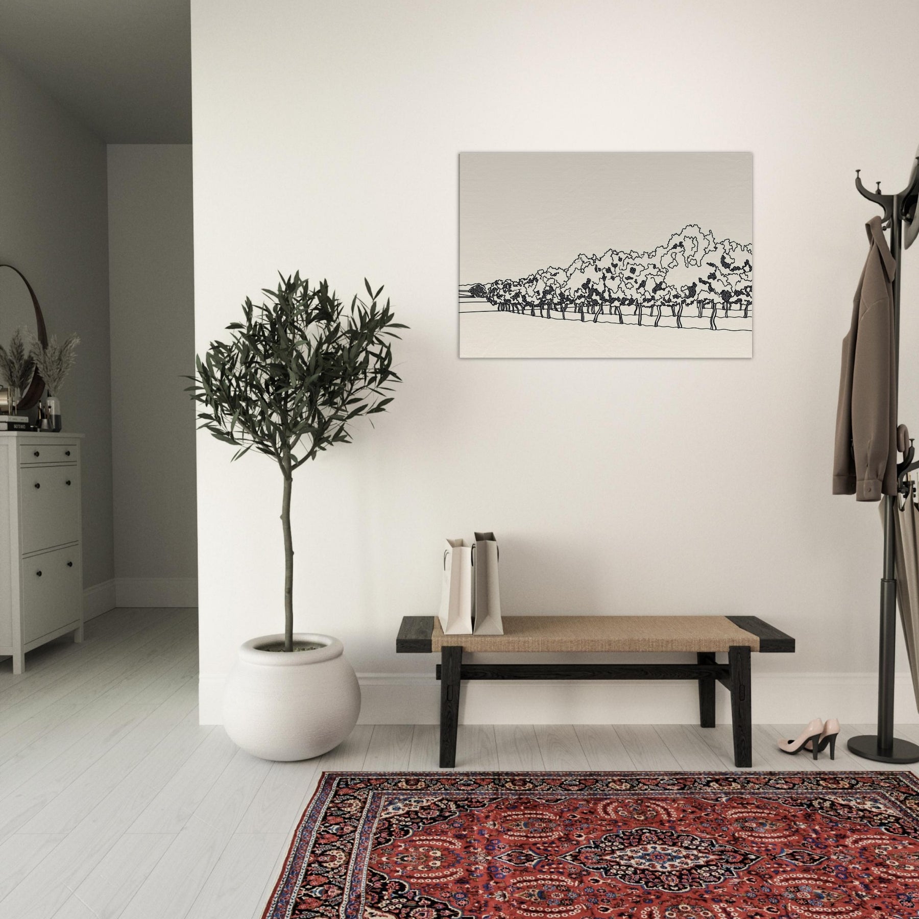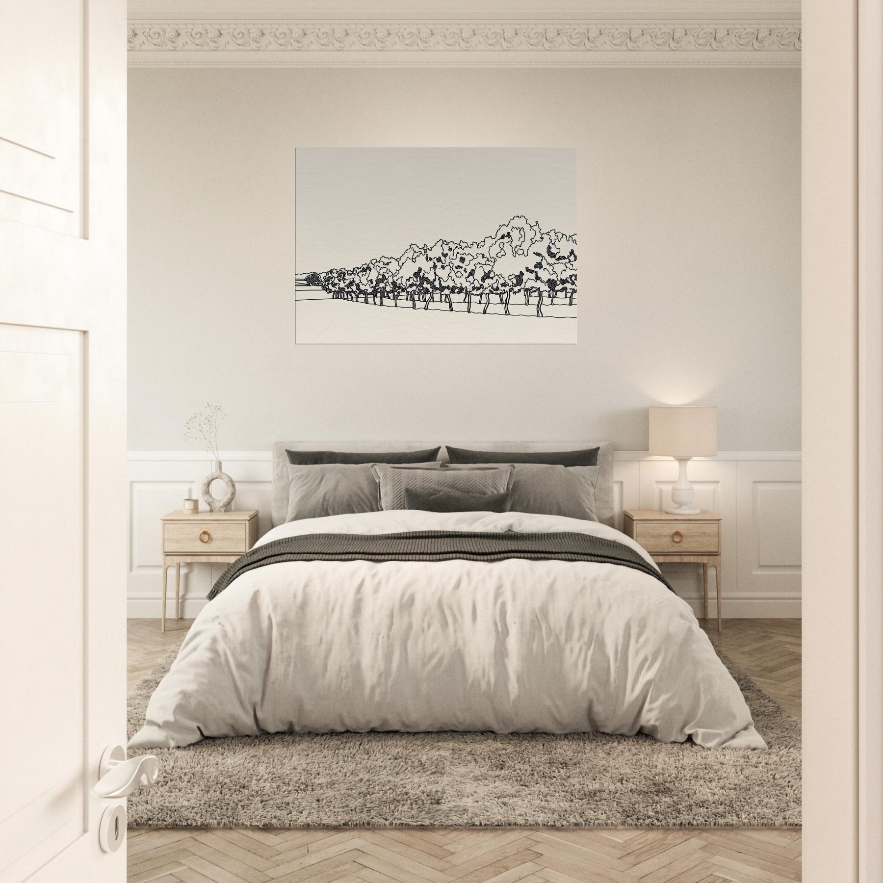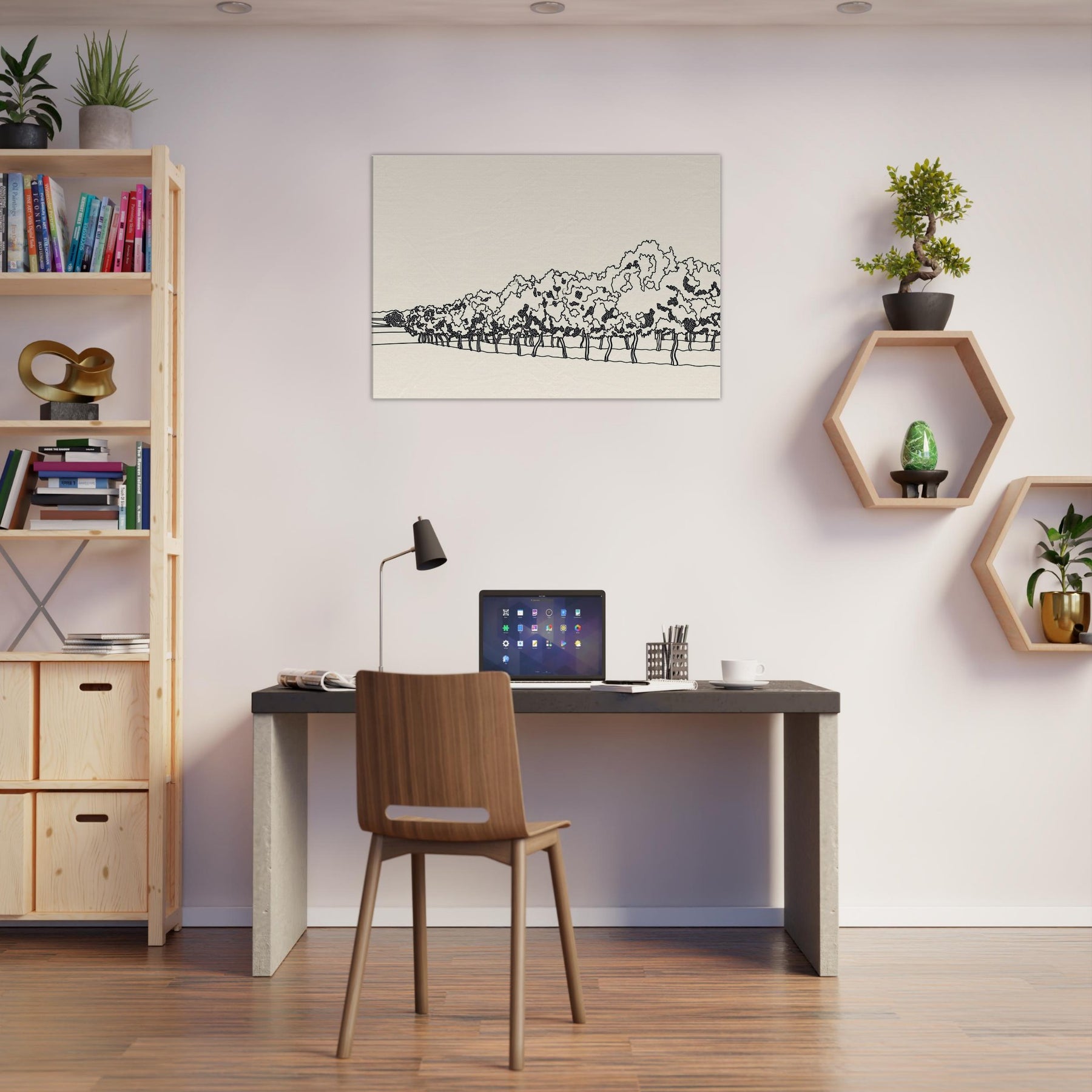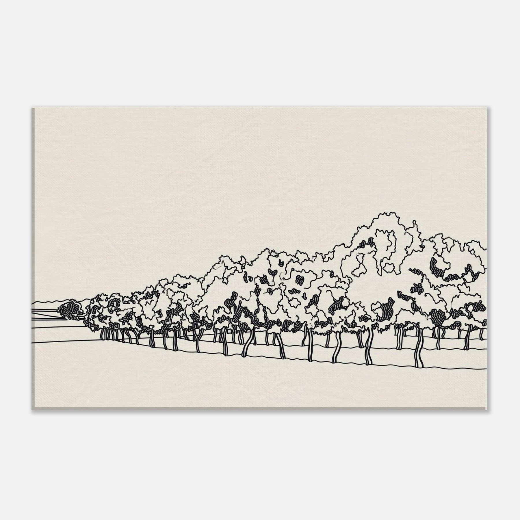 Rendered in elegant line art, this Vineyard scene unfurls across a pale field of negative space, where slender trunks and leafy canopies form a rhythmic chorus. The restraint of black on cream invites light to linger, turning walls into a resting place for the eye. In living rooms or studios, it brings a breath of quiet, pastoral cadence nature's architecture rendered with modern grace. The Vineyard's clean contouring pairs with minimal decor, inviting reflection, conversation, and a serene, timeless atmosphere.