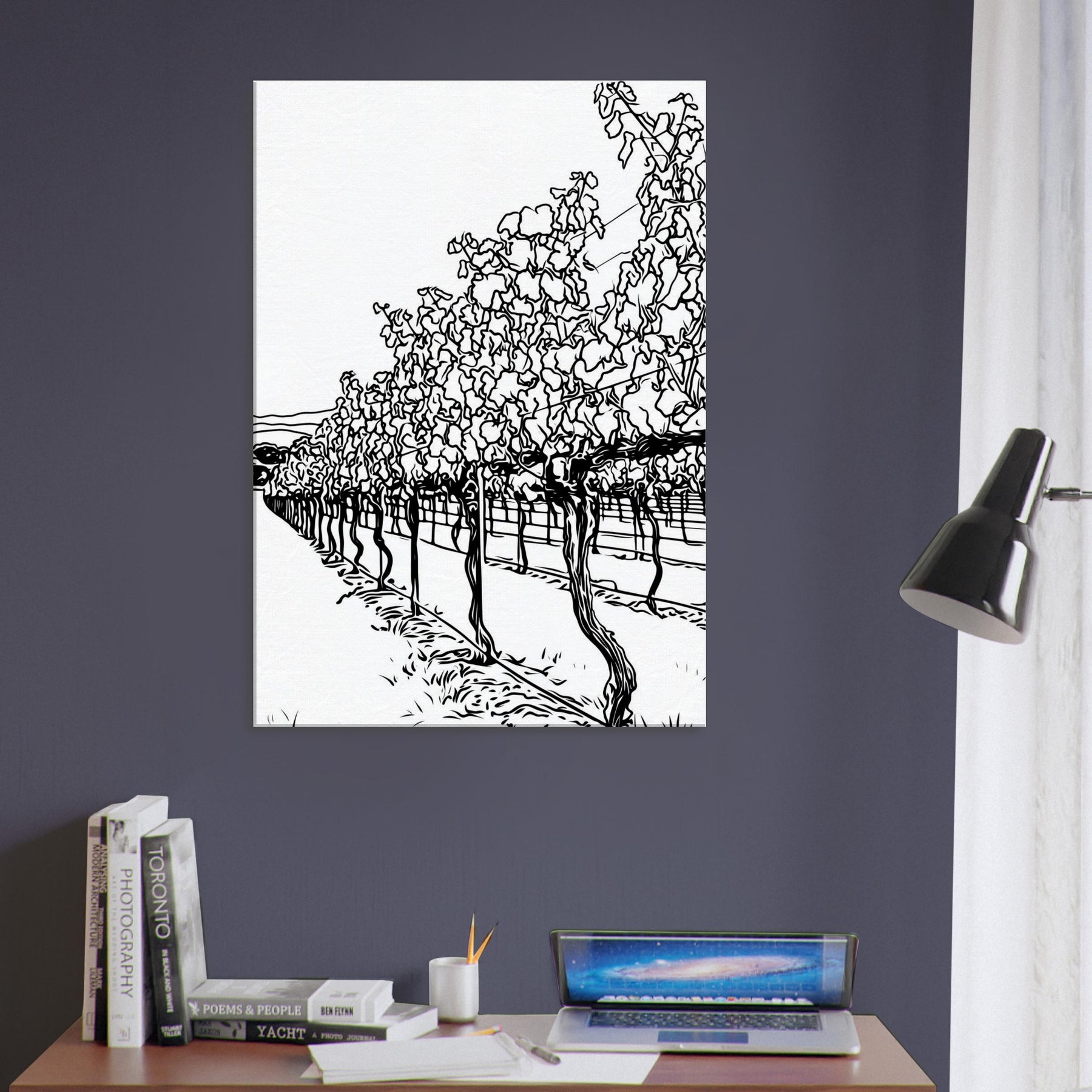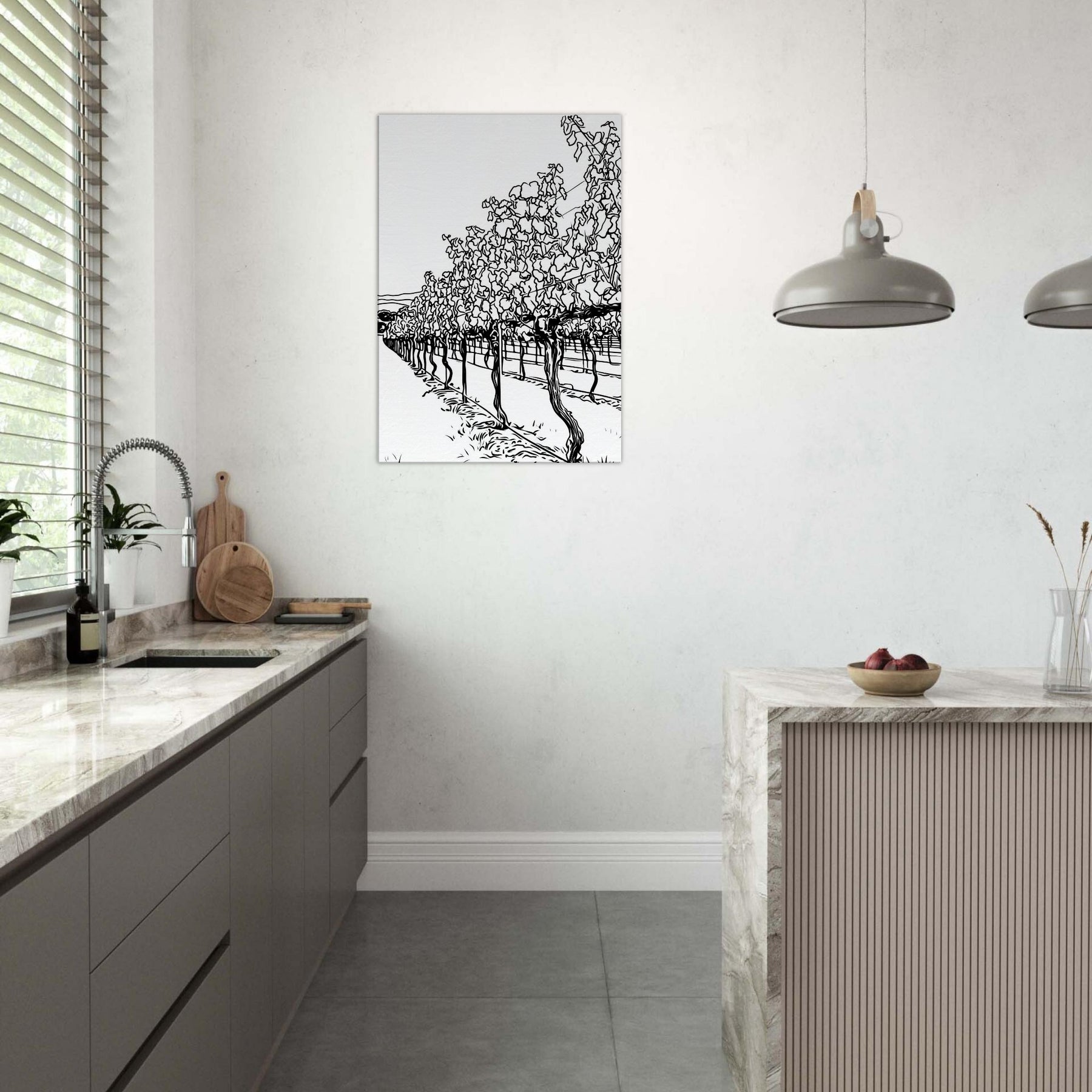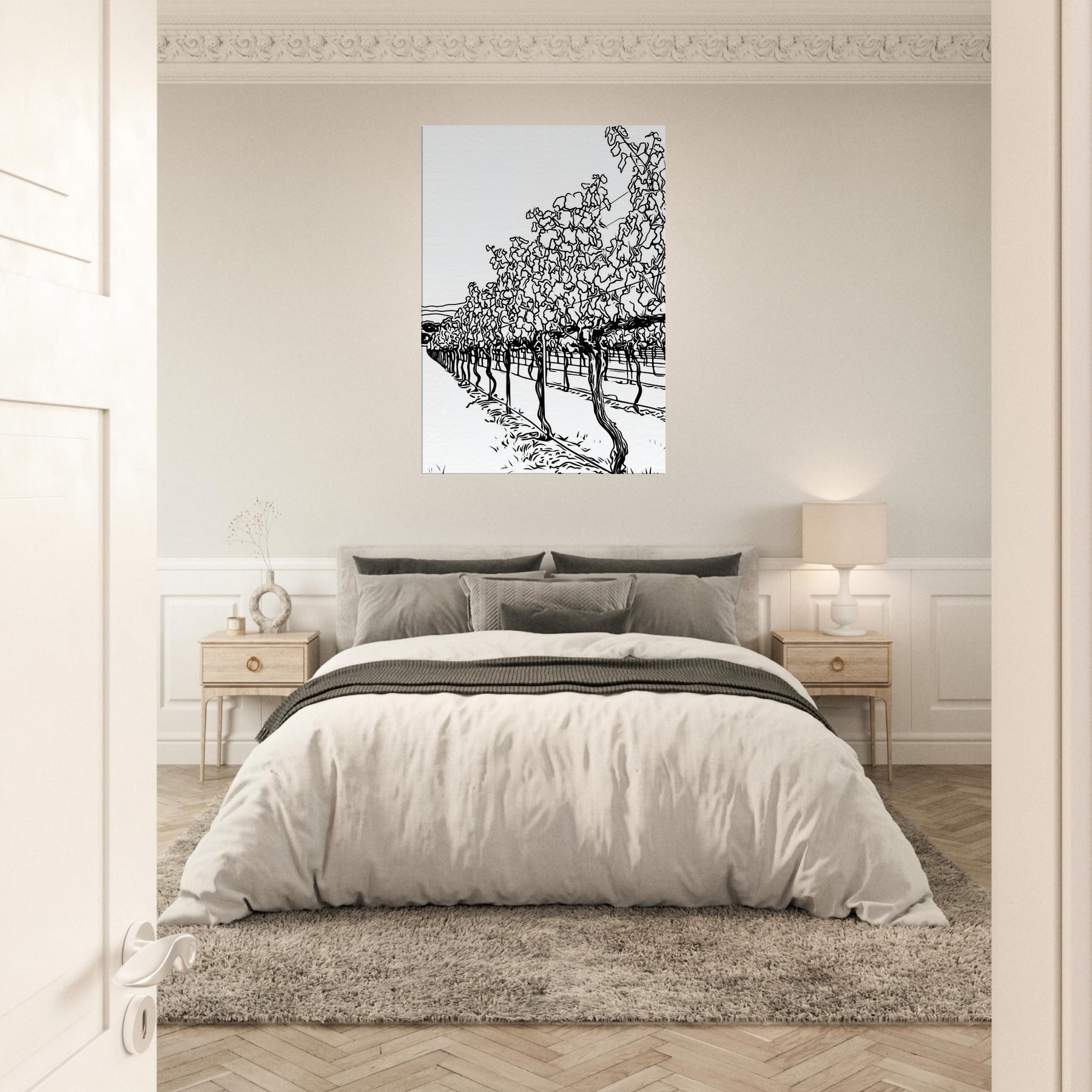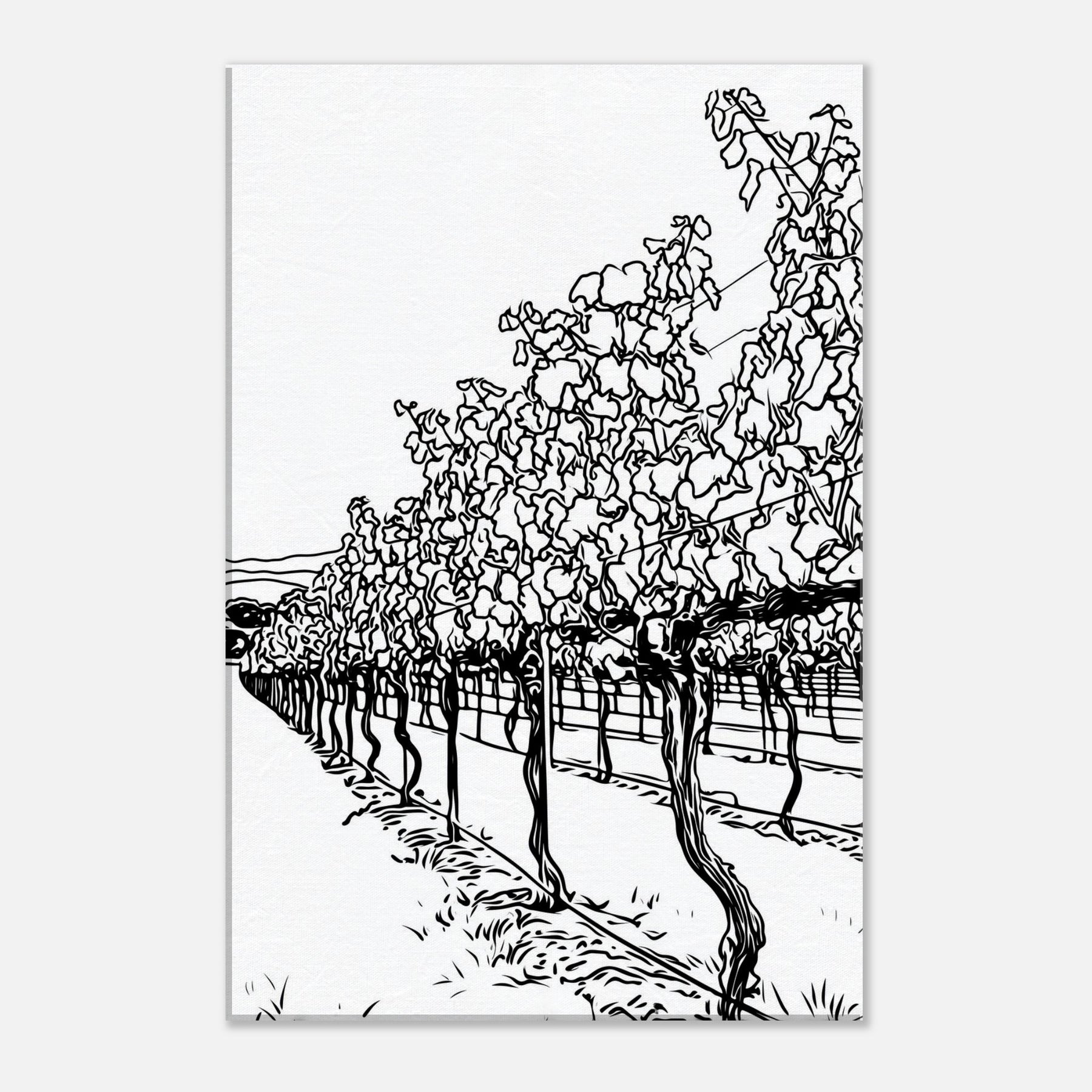 Immerse your space in the quiet procession of rows across a sunlit vineyard. This line drawn study captures the rhythm of vines, their twisted trunks and fluttering leaves reduced to graceful contours and shadows. The result is a calm, expansive atmosphere, airy, timeless, and unexpectedly intimate, that invites lounging, conversation, and contemplation. Placed in a living room or hallway, it elongates space with a tactile sense of season and breeze, turning bare walls into a tranquil of nature's architecture.