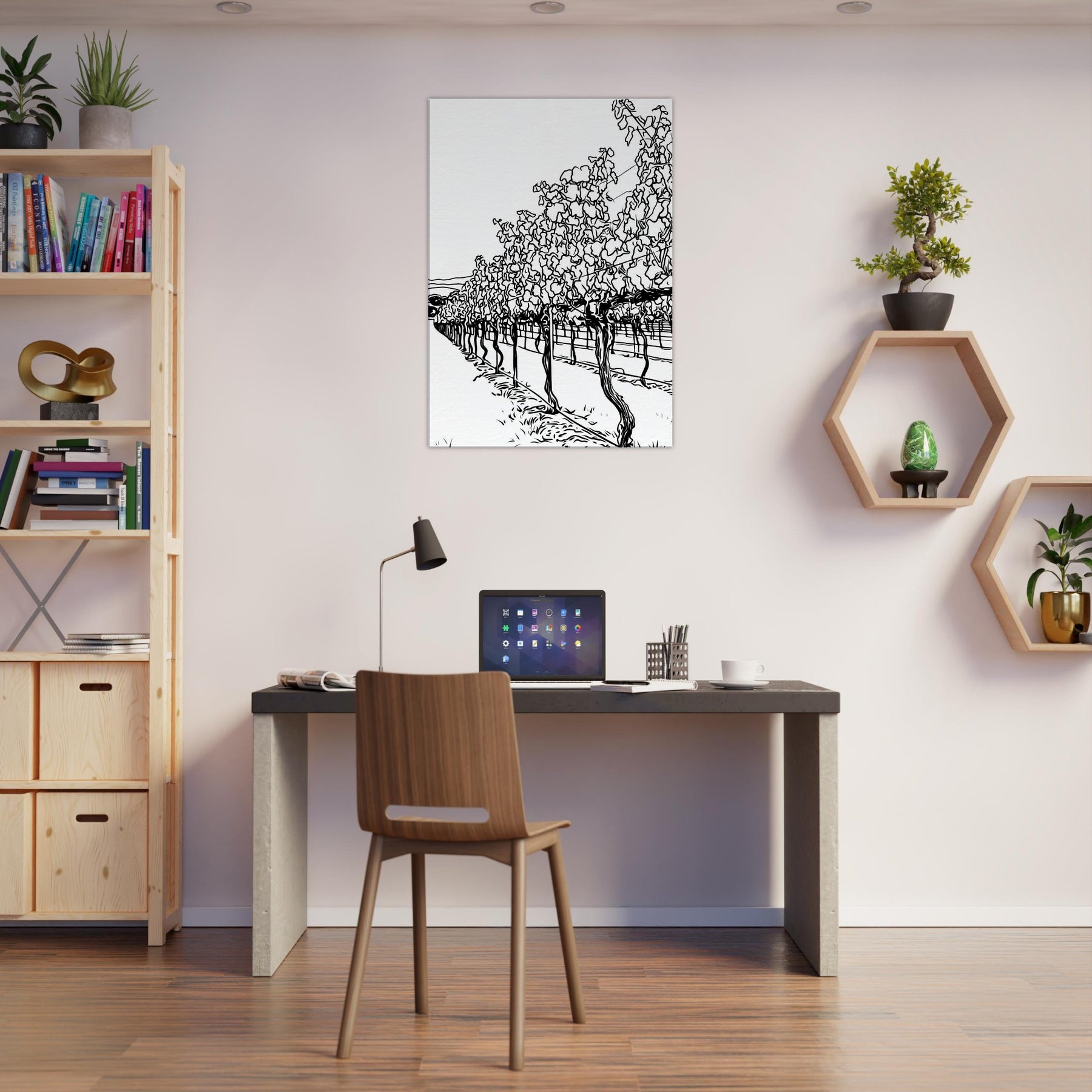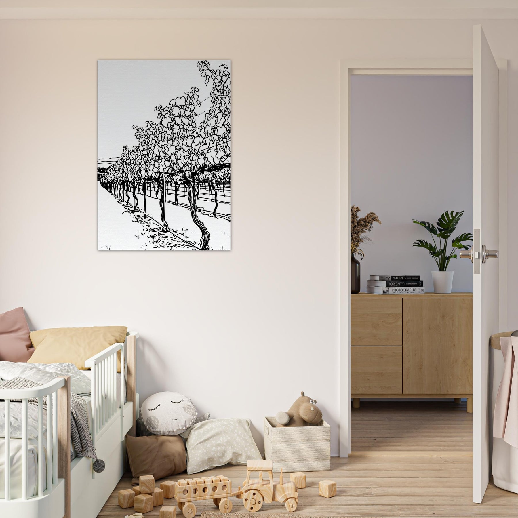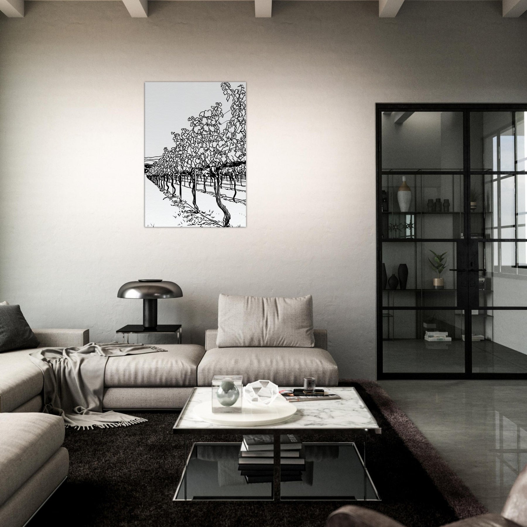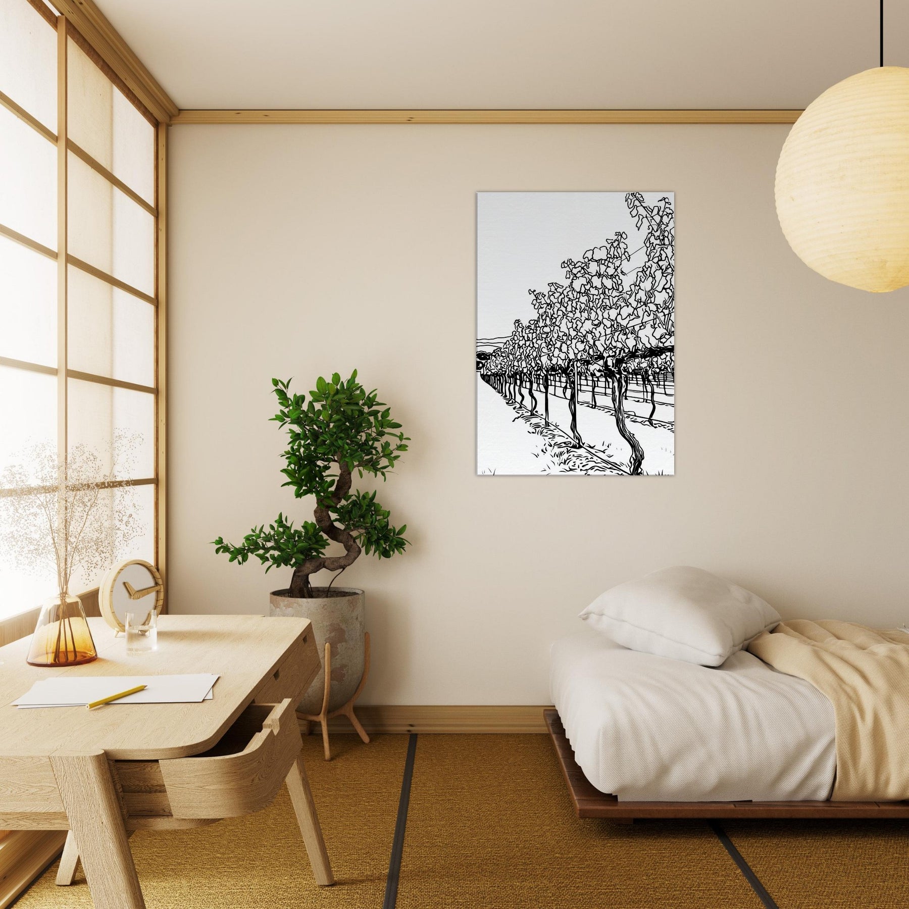 Immerse your space in the quiet procession of rows across a sunlit vineyard. This line drawn study captures the rhythm of vines, their twisted trunks and fluttering leaves reduced to graceful contours and shadows. The result is a calm, expansive atmosphere, airy, timeless, and unexpectedly intimate, that invites lounging, conversation, and contemplation. Placed in a living room or hallway, it elongates space with a tactile sense of season and breeze, turning bare walls into a tranquil of nature's architecture.