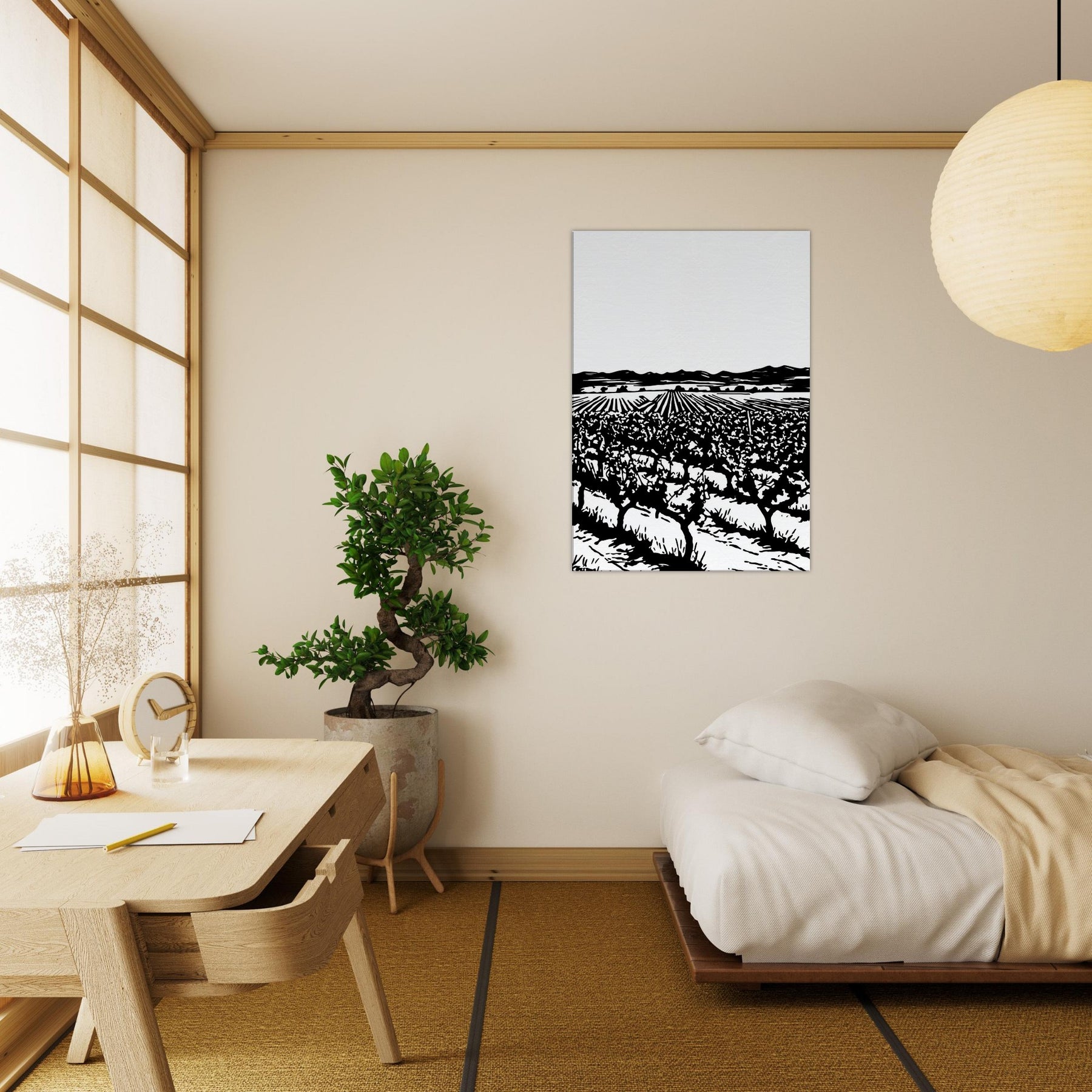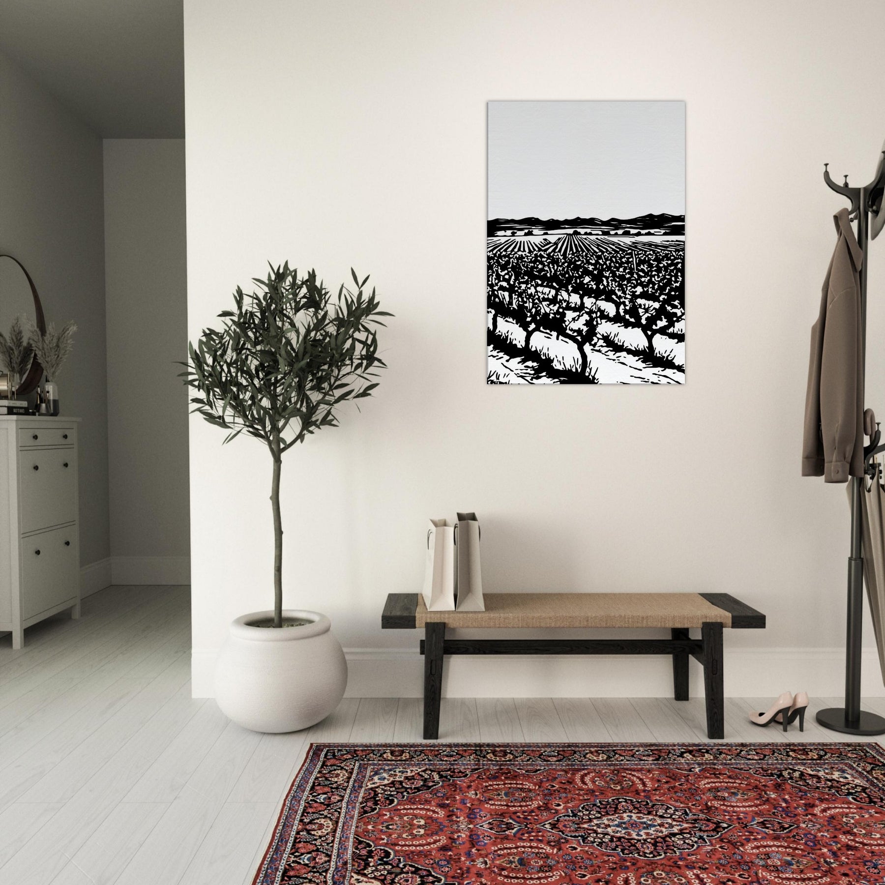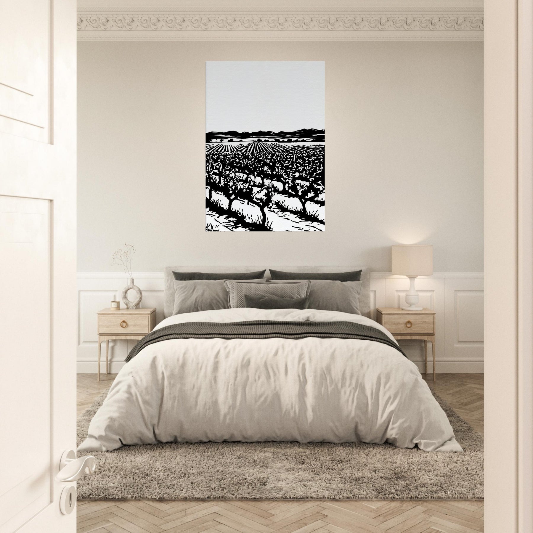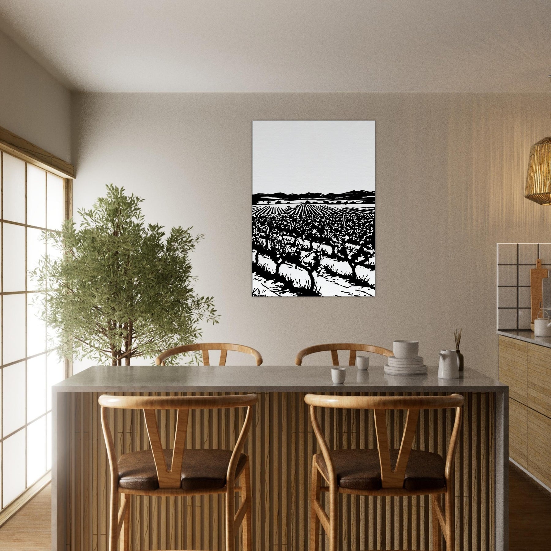 Vineyard Reverie unfolds in crisp, black and white line art, capturing rows of vines that ripple toward distant hills. This serene composition invites quiet contemplation: the open white space above suggests dawn light, while the densely inked vineyard below anchors the room with texture and rhythm. Perfect for a living room or hallway, it adds a tactile sense of nature, clarity, and calm. Pair with natural wood frames to echo vineyard terraces.