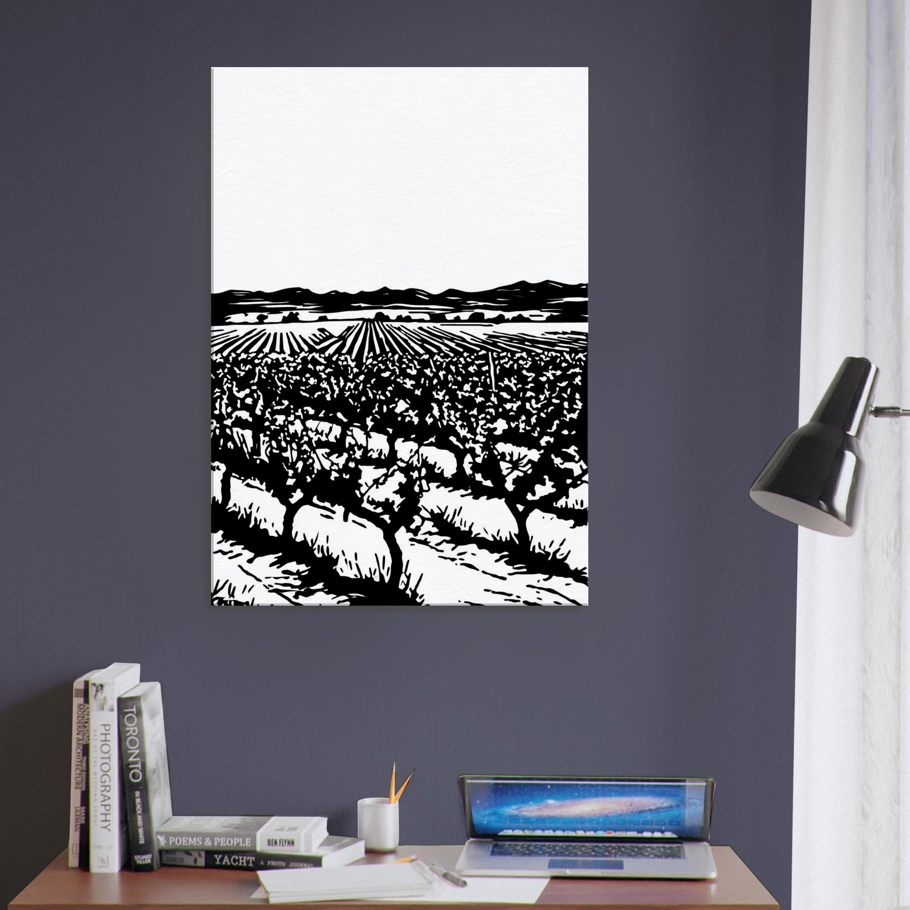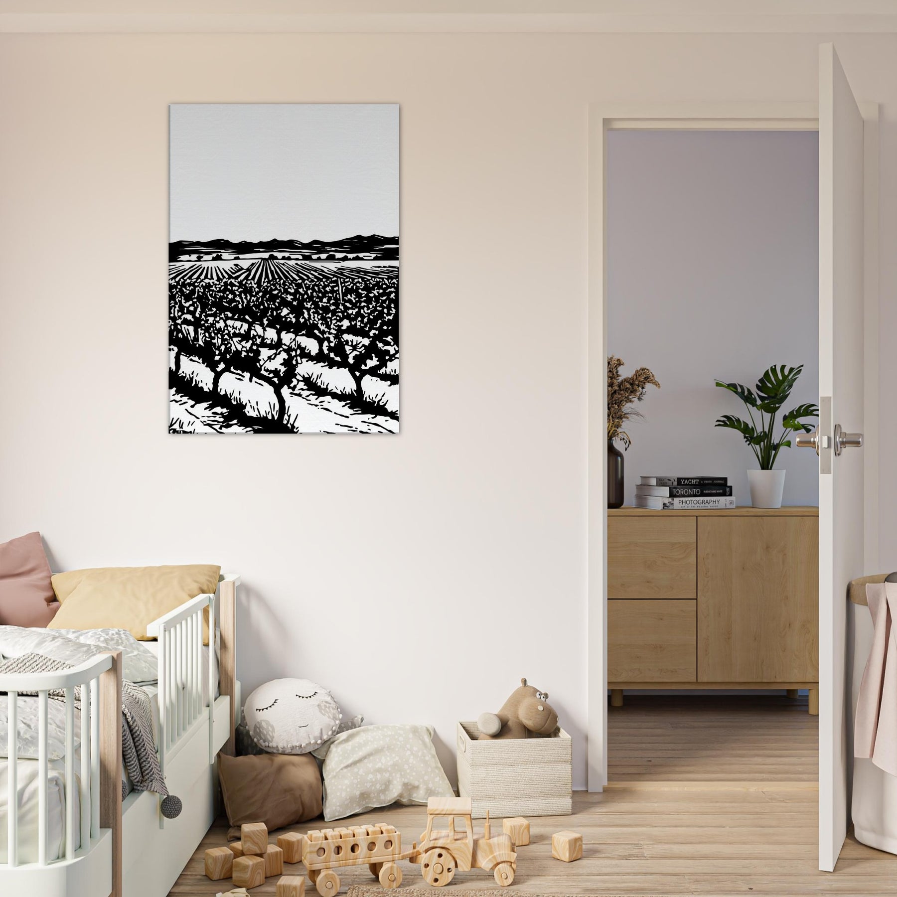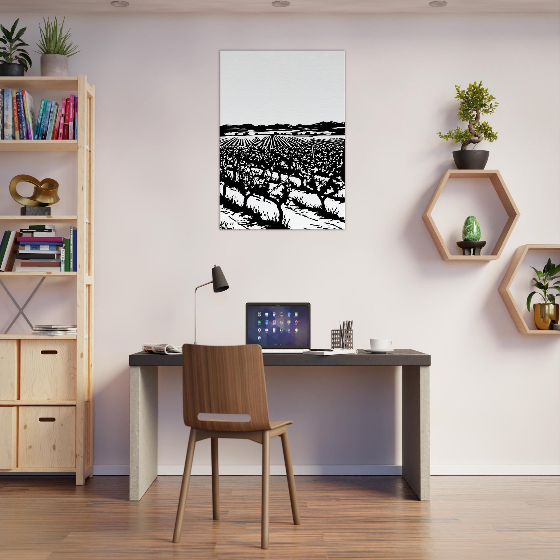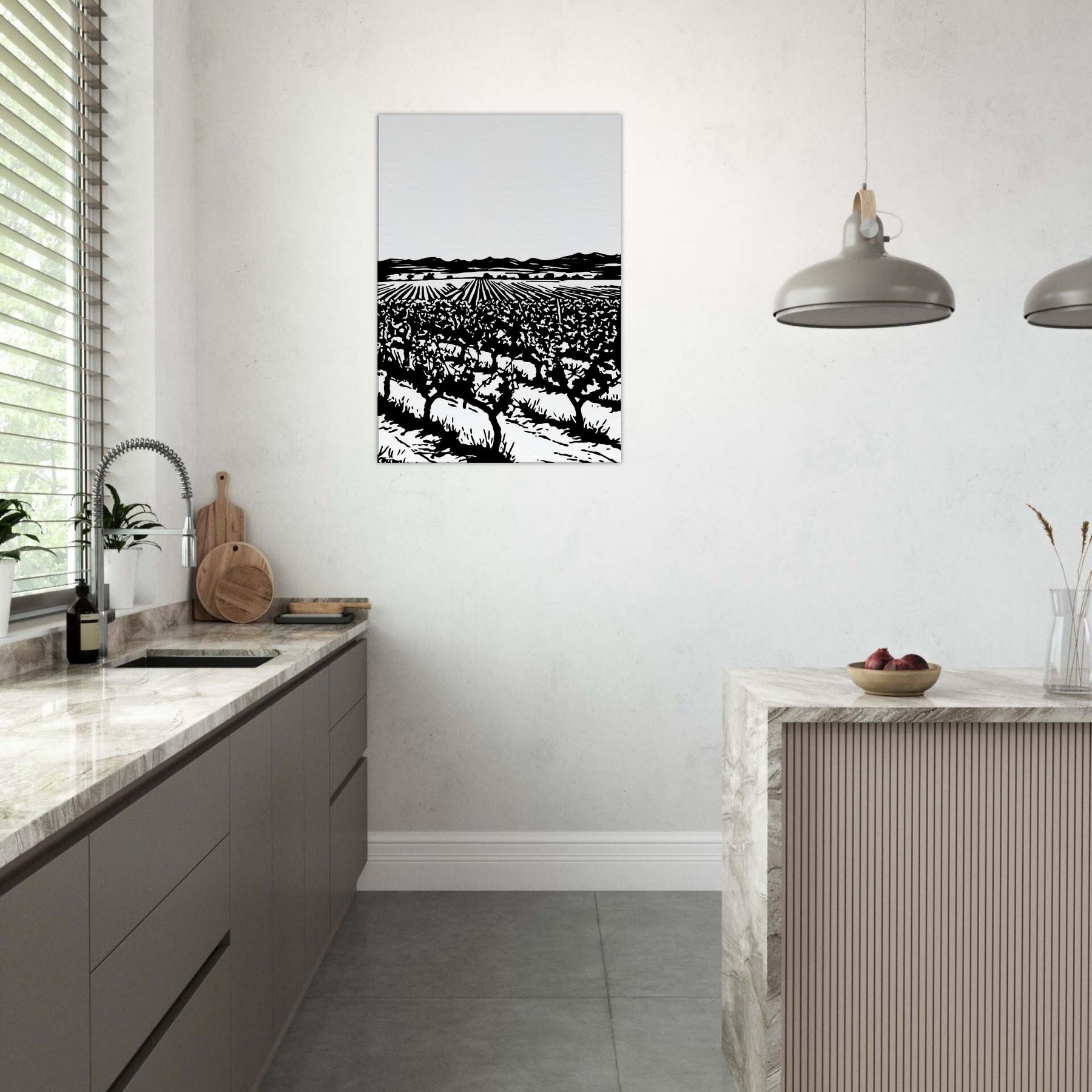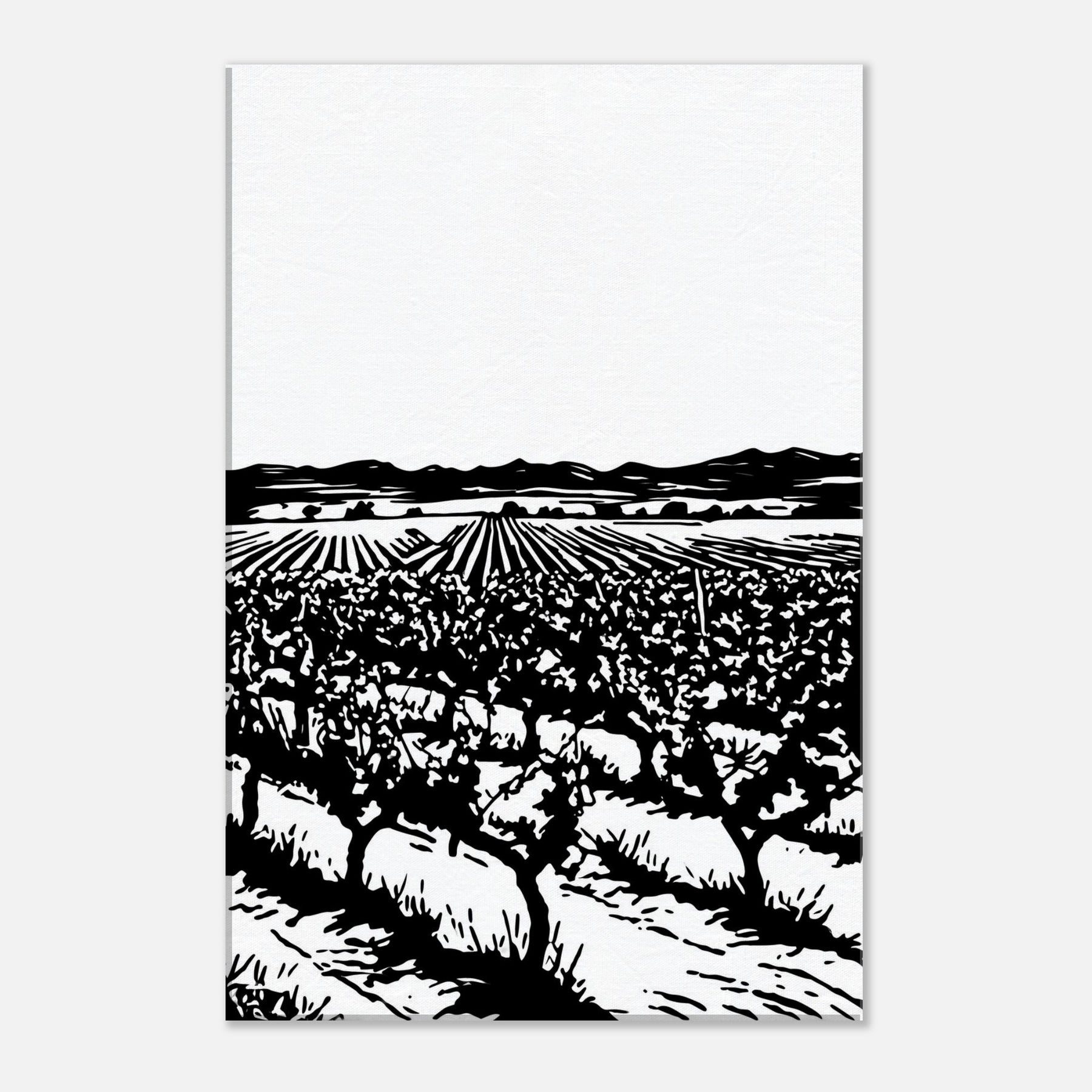 Vineyard Reverie unfolds in crisp, black and white line art, capturing rows of vines that ripple toward distant hills. This serene composition invites quiet contemplation: the open white space above suggests dawn light, while the densely inked vineyard below anchors the room with texture and rhythm. Perfect for a living room or hallway, it adds a tactile sense of nature, clarity, and calm. Pair with natural wood frames to echo vineyard terraces.