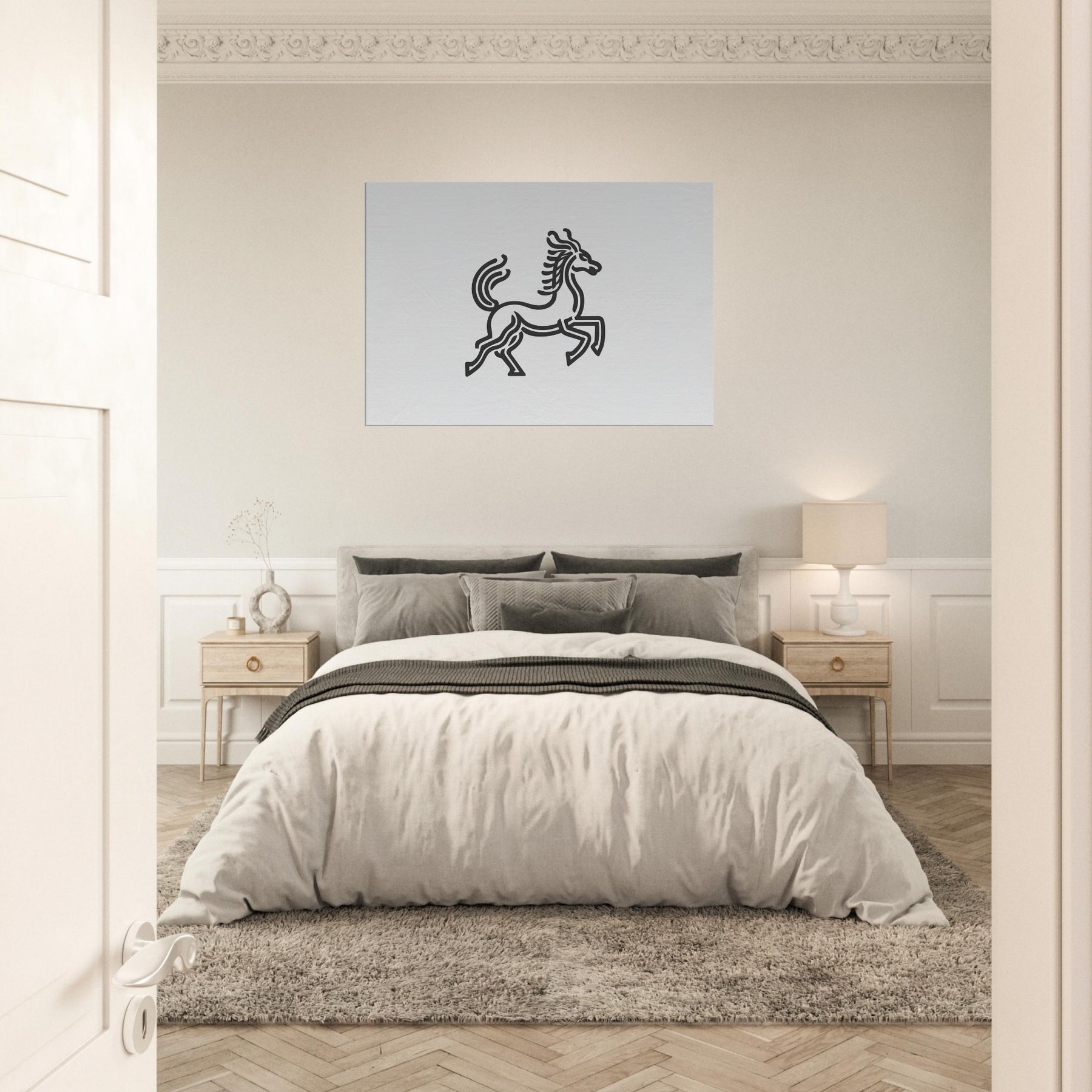 Qilin, the Chinese mythical unicorn like creature of virtue, strides through this line art study with quiet majesty. The bold, continuous contours carve the air into movement, while generous negative space invites contemplation. Painted in stark monochrome, the piece radiates calm energy that deepens a living room's atmosphere, pairs with natural textures, and catches shifting light at every hour. Hang it where you want focus, grace, and a touch of myth to elevate daily rituals into something almost ceremonial.