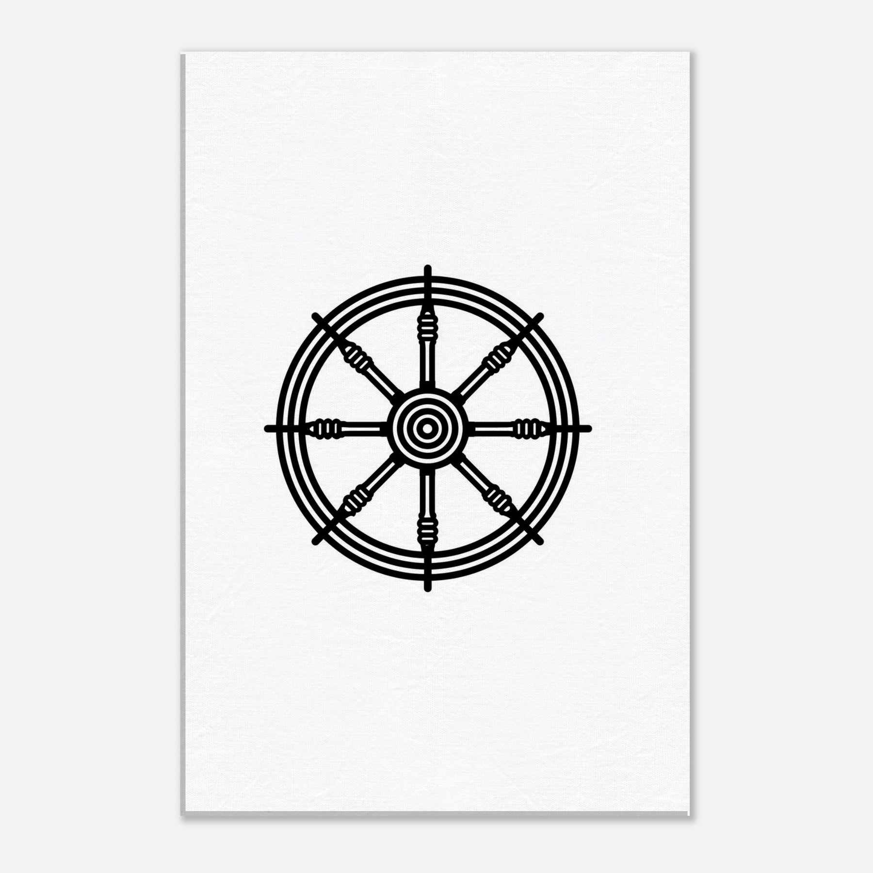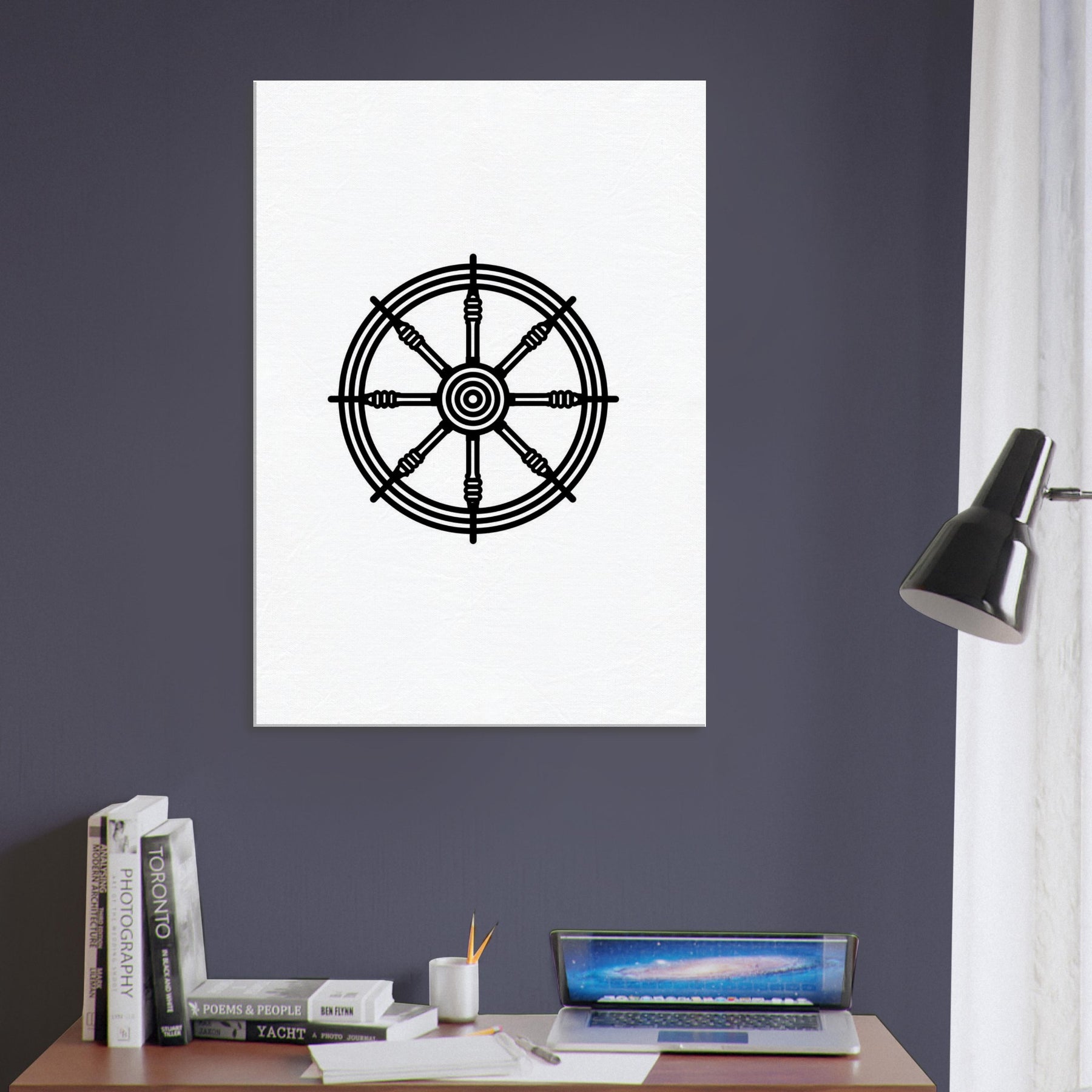 Let the Dharma Wheel (Dharmachakra) rotate gently through your living space, a line art compass guiding calm and focus. This spotless black and white symbol floats against white space, its concentric rings and six spokes inviting quiet contemplation. Ideal for a meditation corner or modern living room, it adds ritual grace without ornamentation a contemporary reminder to breathe, align, and begin anew. The piece pairs with natural wood frames and soft textiles, shaping a serene atmosphere where ideas circle and clarity returns.
