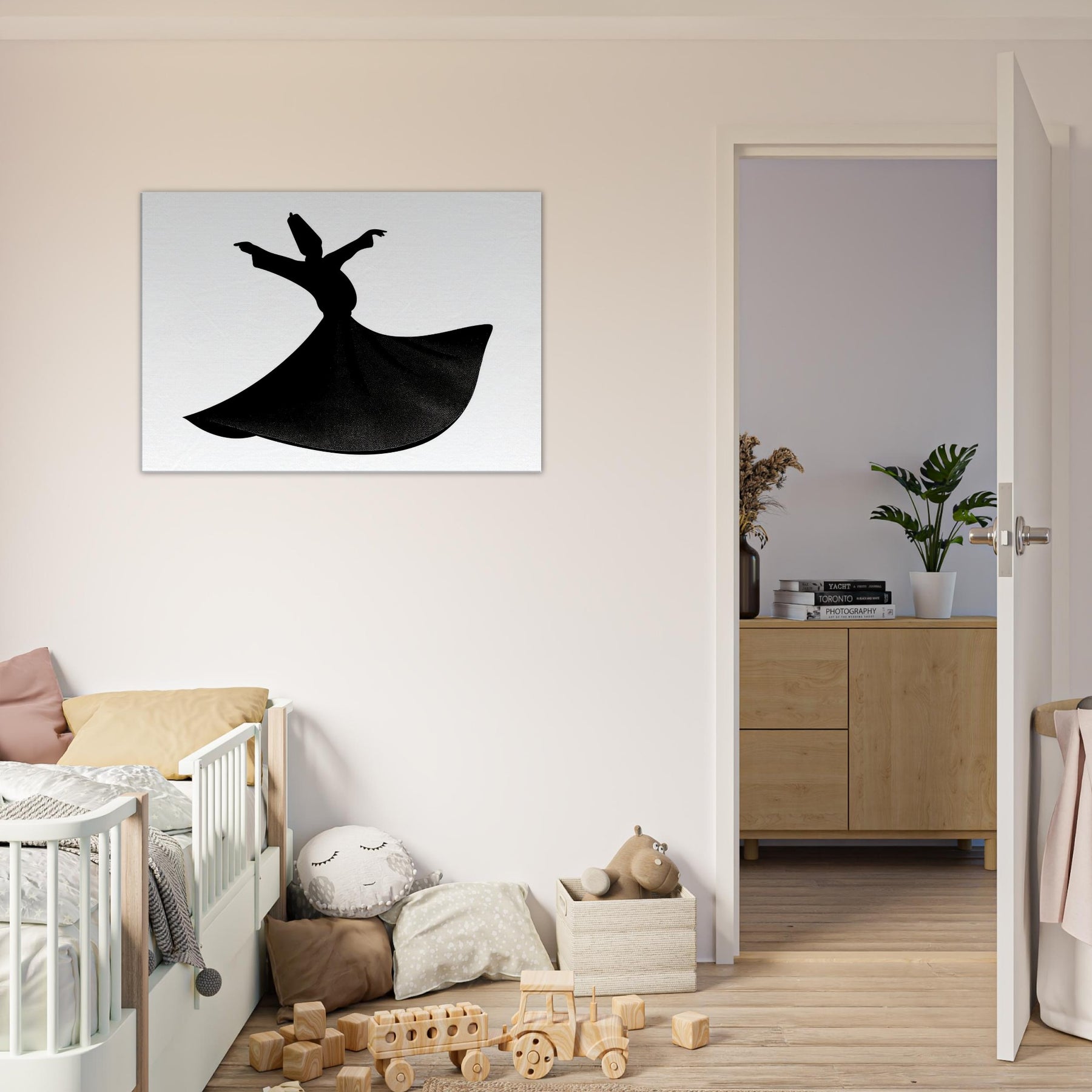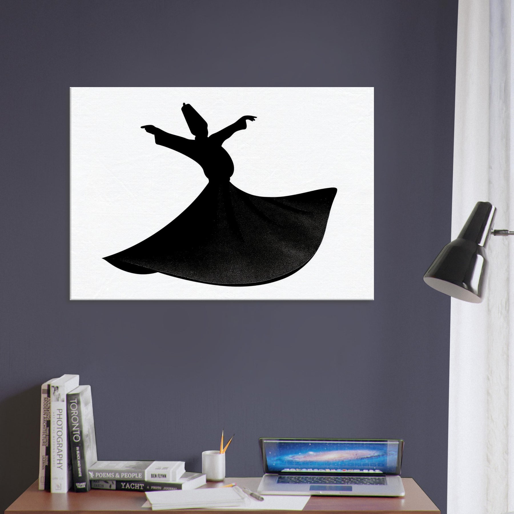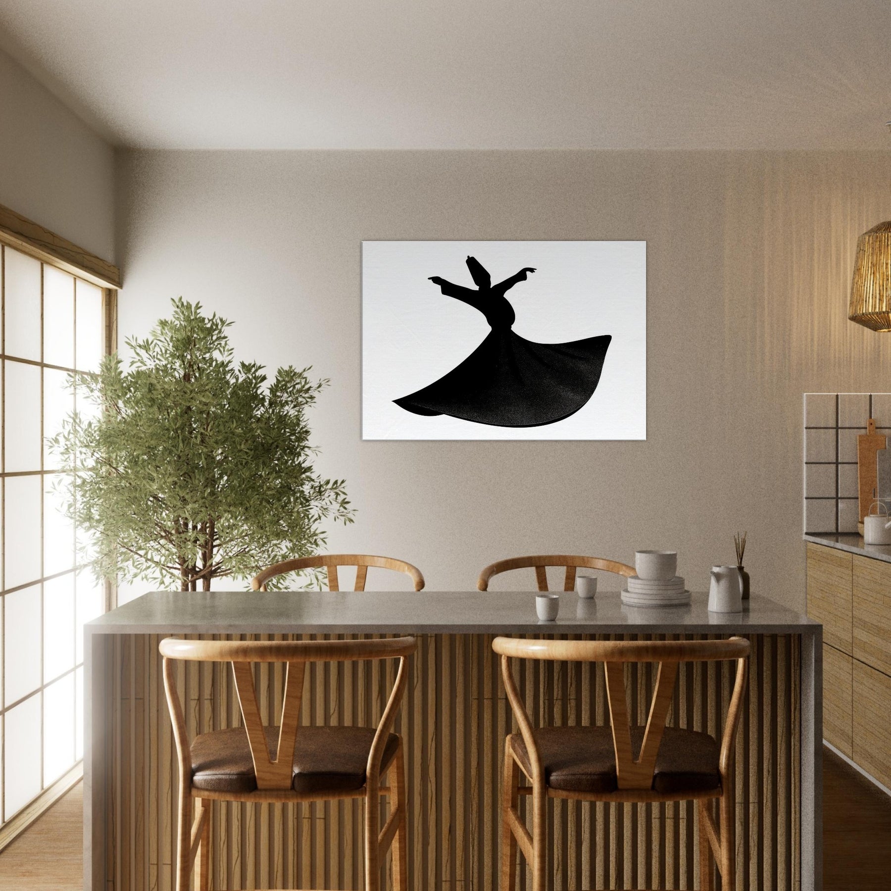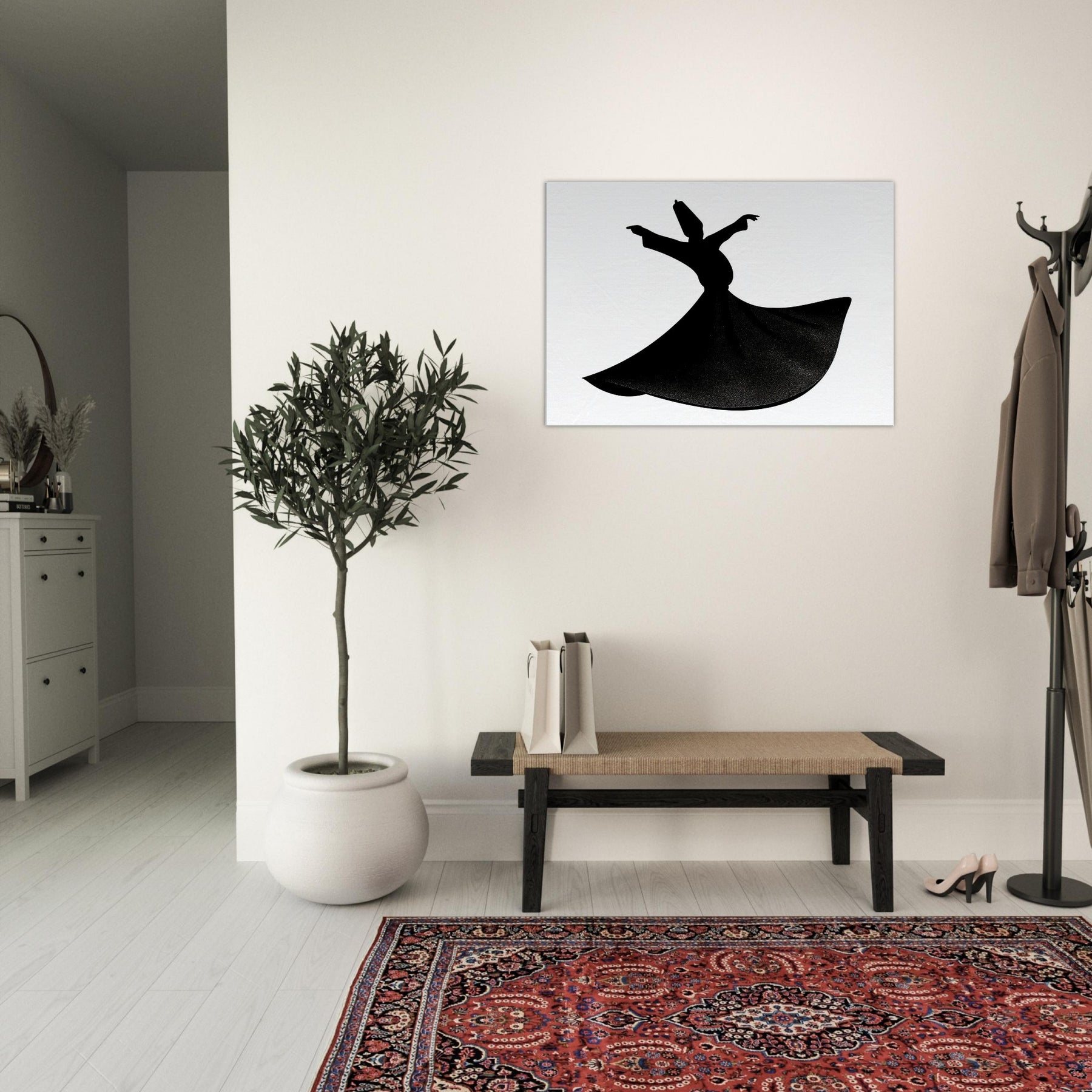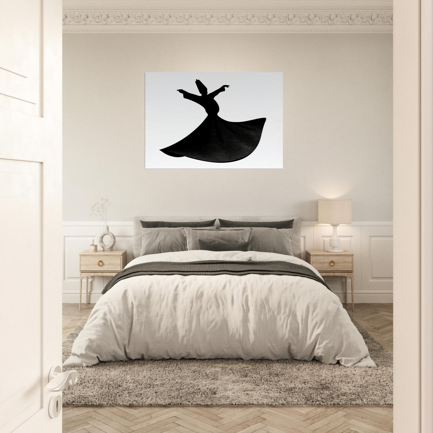 Whirling Dervish Silhouette unfurls with a single, continuous line that suggests movement without hurry, a serene circle of motion captured in stark black against ivory. This line art exudes mystery and grace, inviting quiet contemplation in any room. Hang it where morning light brushes the wall or above a reading chair to infuse the space with meditative energy, a subtle reminder to breathe, listen, and balance. The image lends architectural rhythm, turning a wall into a still, living doorway to inner spaciousness.