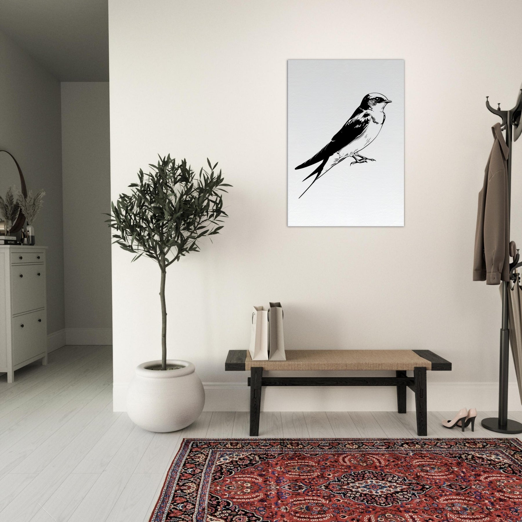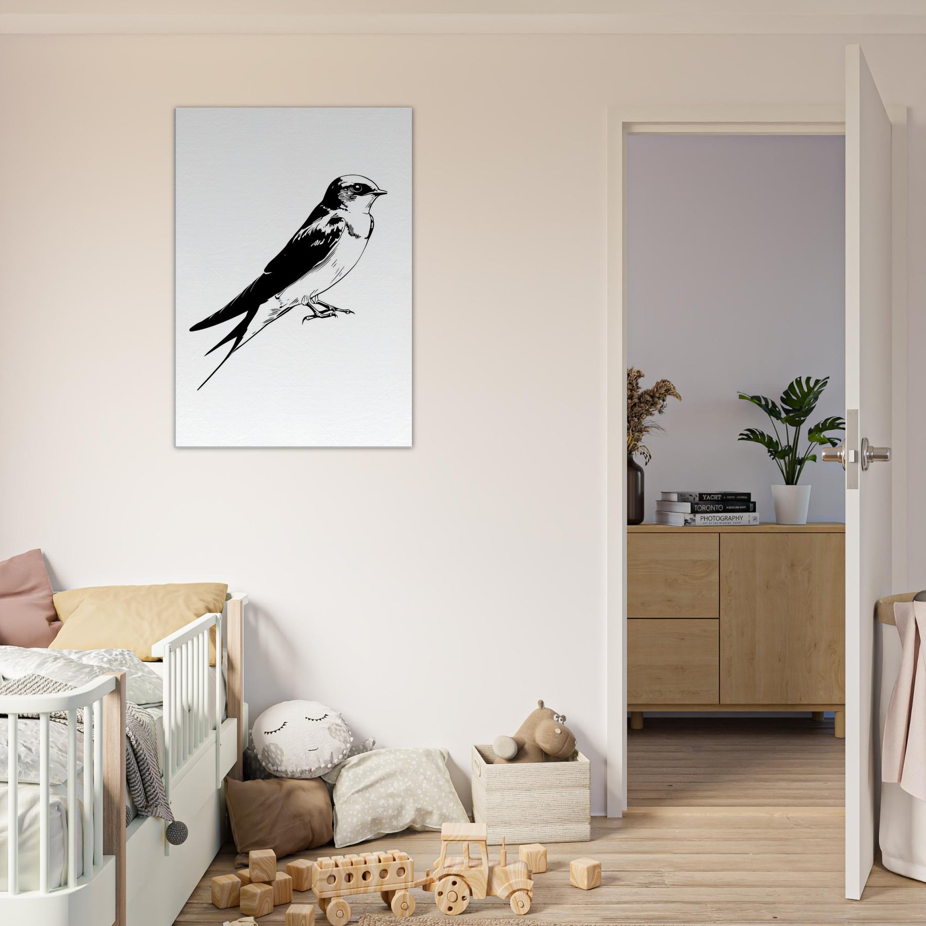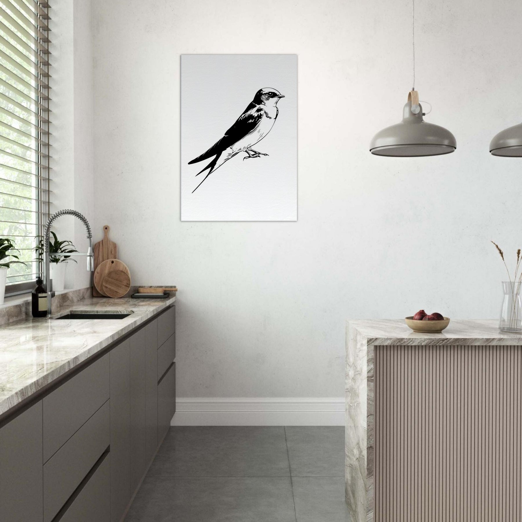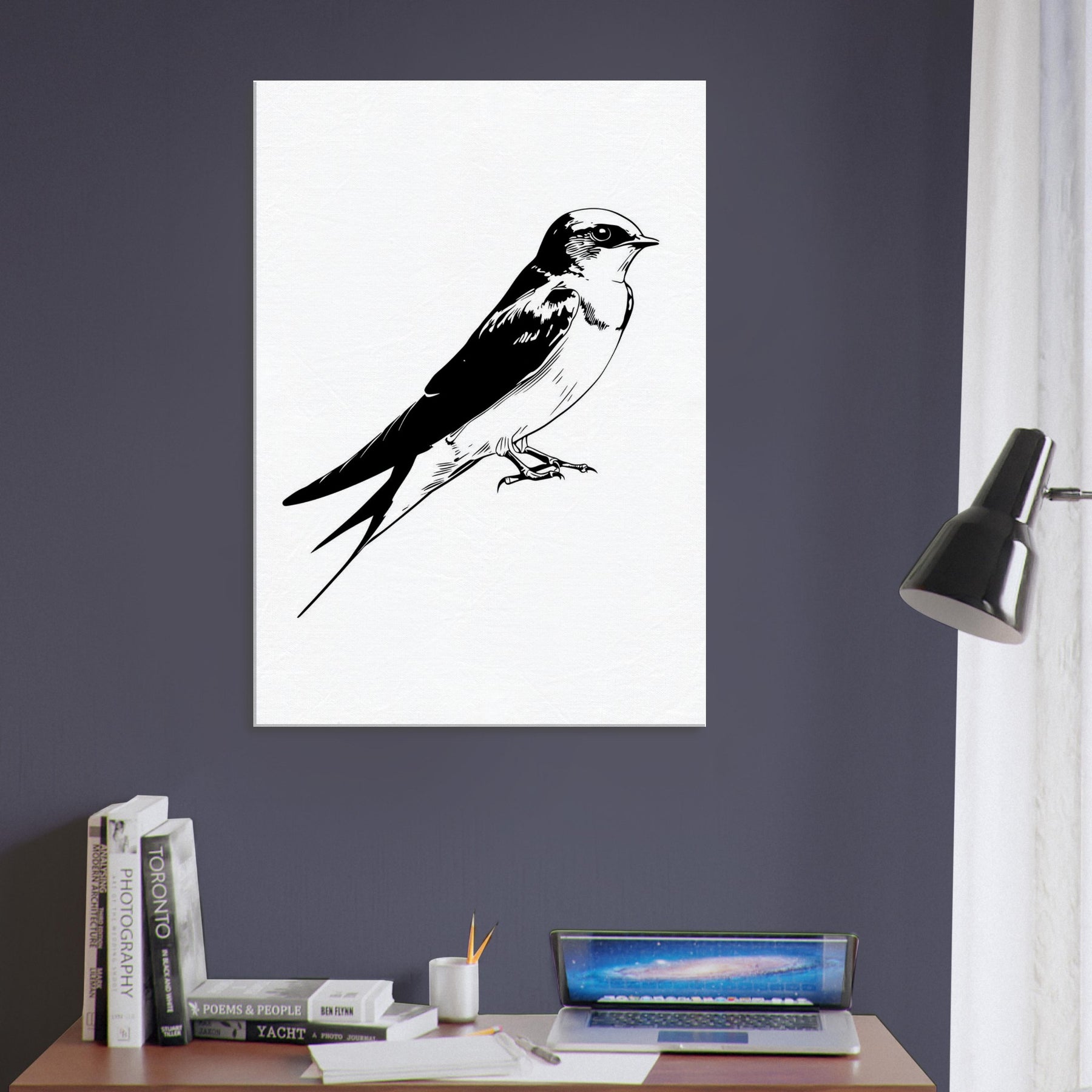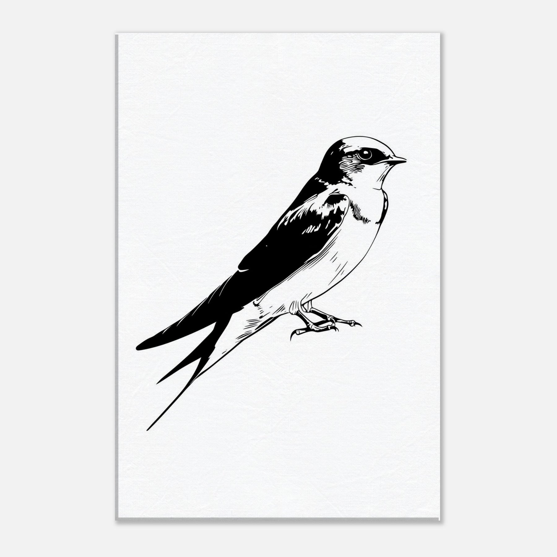 An elegant line drawing of a swallow rests in quiet poise, its swift silhouette captured in negative space. This monochrome study invites calm into a living room, where the clean curves echo with the soft rustle of linen and the hush of evening light. The restrained contrast comforts the eye, giving the space a sense of movement and grace without overpowering the room. A timeless accent that complements modern decor.