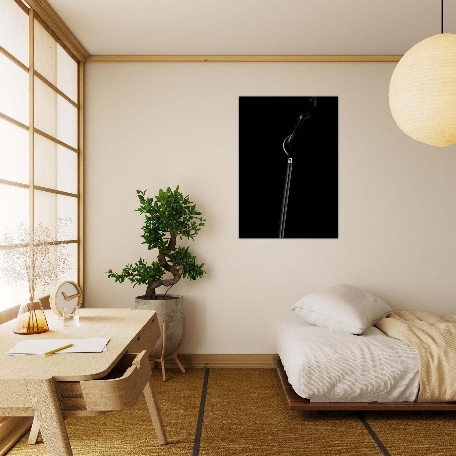 Incense with Smoke unfolds as a slender memorial in black and white, where two delicate sticks rise from a single point and surrender a wisp of fragrance into the hush of the room. This line art composition captures the moment when intention meets breath, inviting calm, focus, and quiet reflection. Placed on a wall, it becomes a meditative if minimal focal point, pairing well with modern furnishings, warm woods, and soft textiles to elevate a space with subtle drama and luminous simplicity.