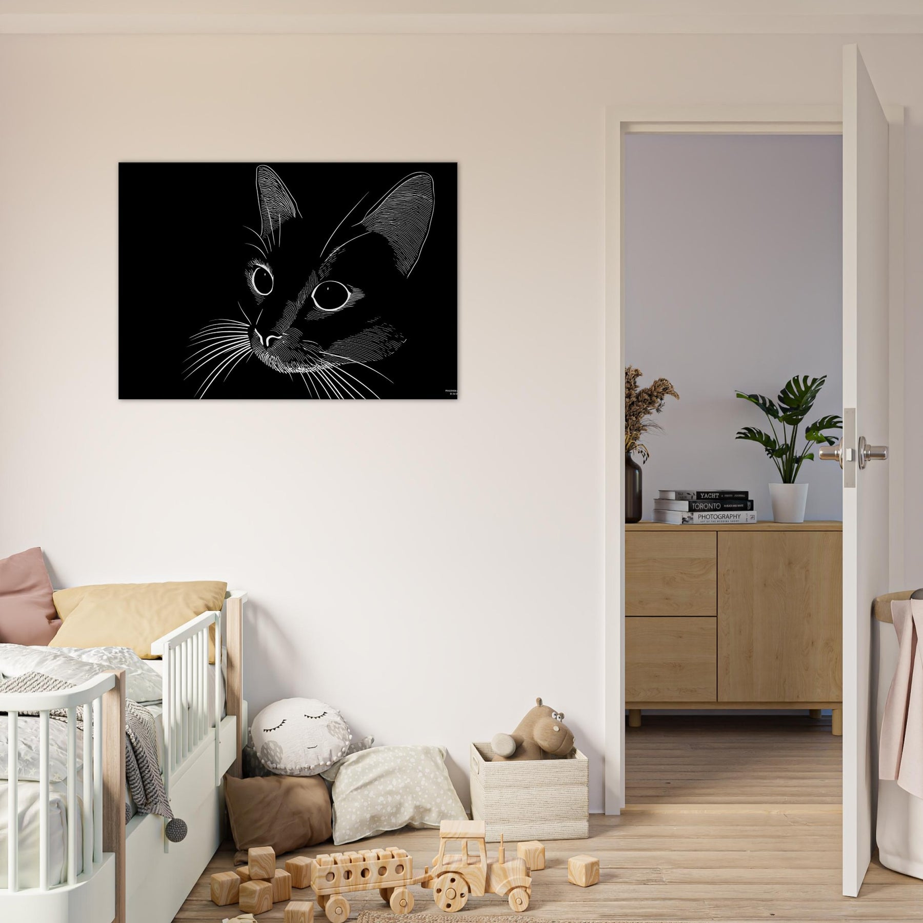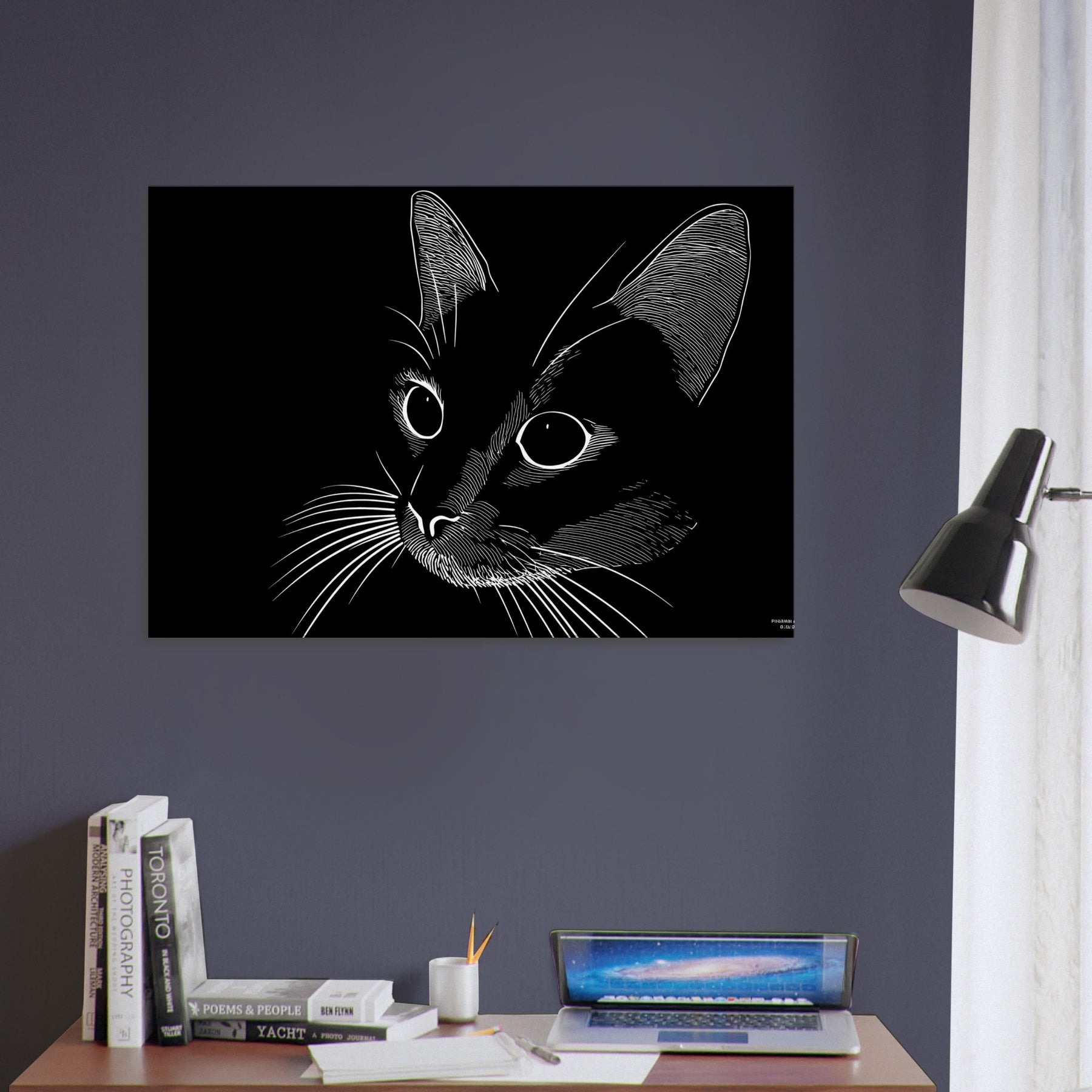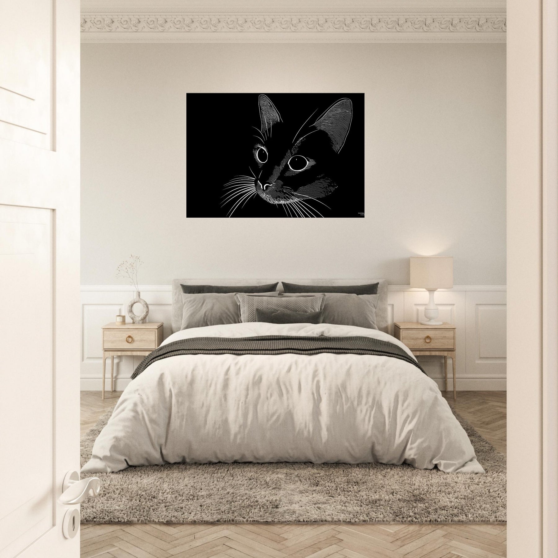As the Primary Subject, the cat is rendered in a single, unbroken white line against velvet black, inviting quiet reflection. This minimalist study exudes calm and elegance, a whisper of movement captured in negative space. The atmosphere feels intimate yet expansive, making it perfect for a serene corner or an entryway vignette. Its restrained contrast elevates neutrals and textures alike, allowing soft lamps, wood grains, and plush fabrics to breathe. A refined piece that enhances daily living with subtle, cinematic grace.