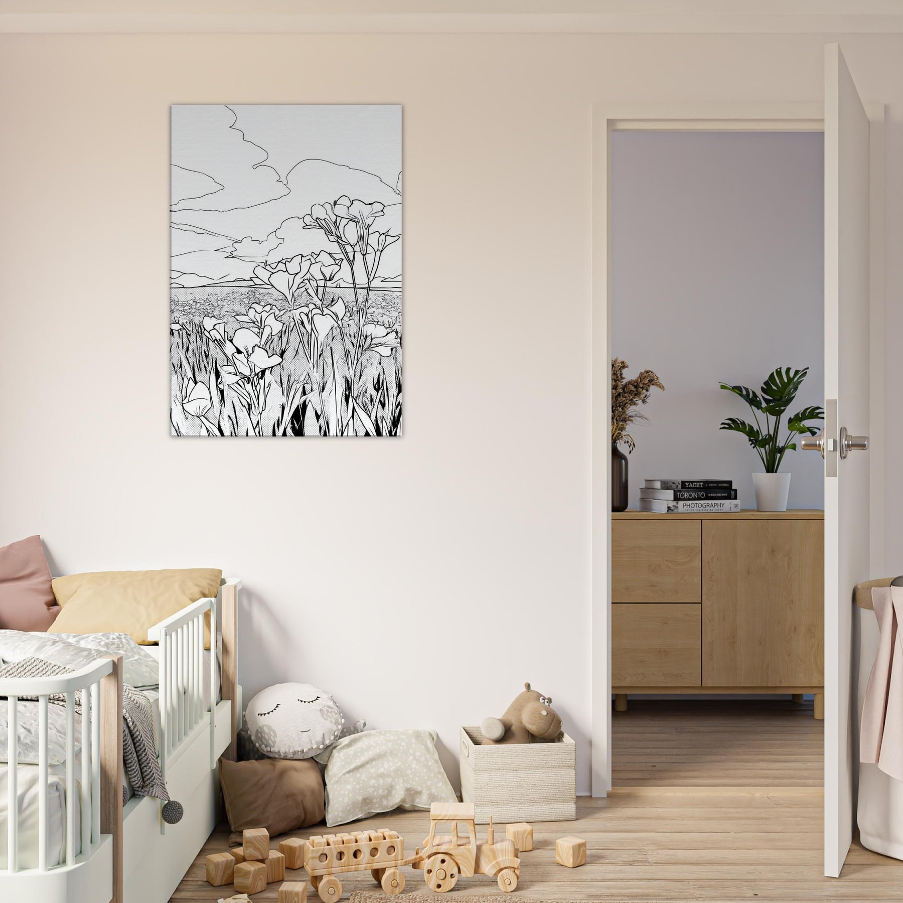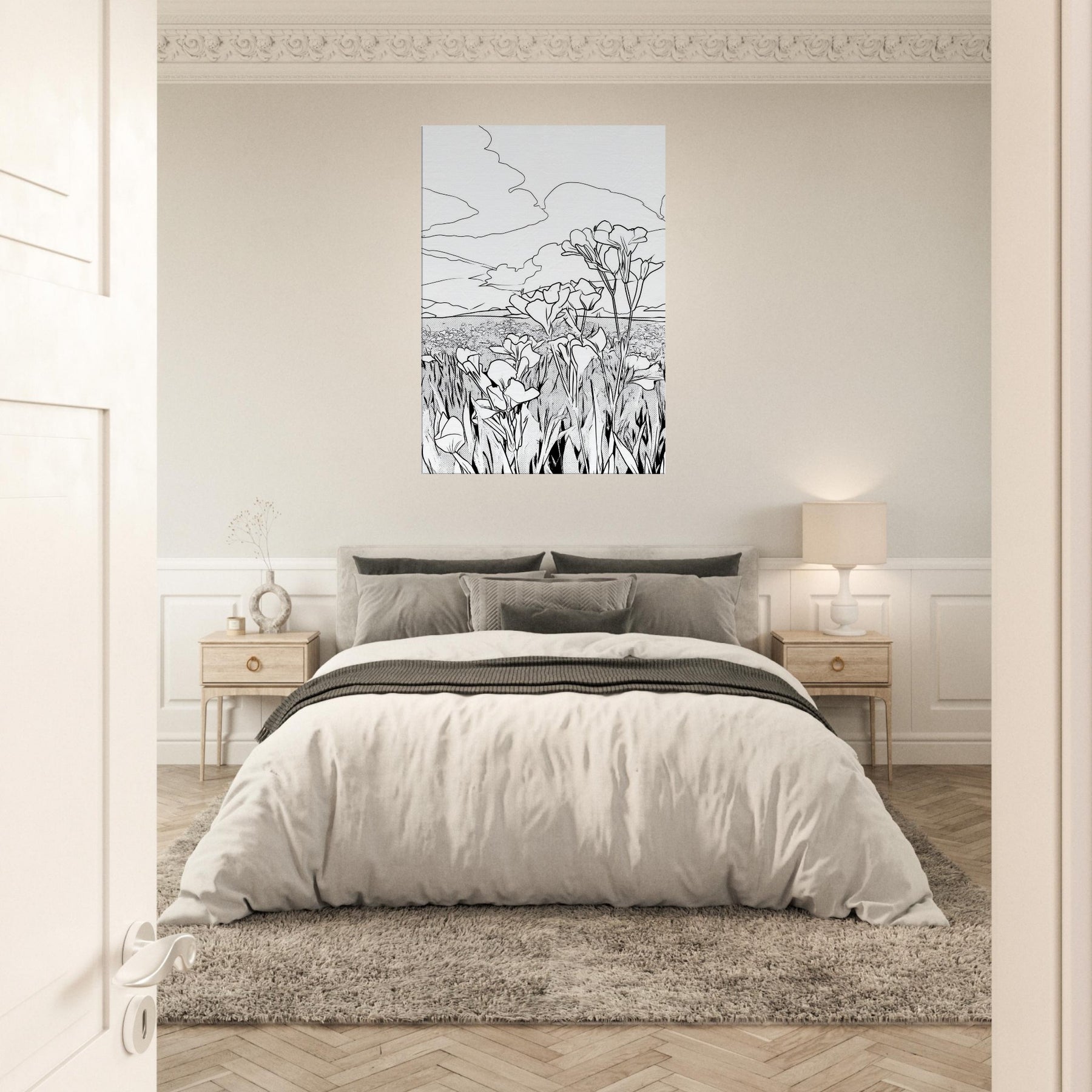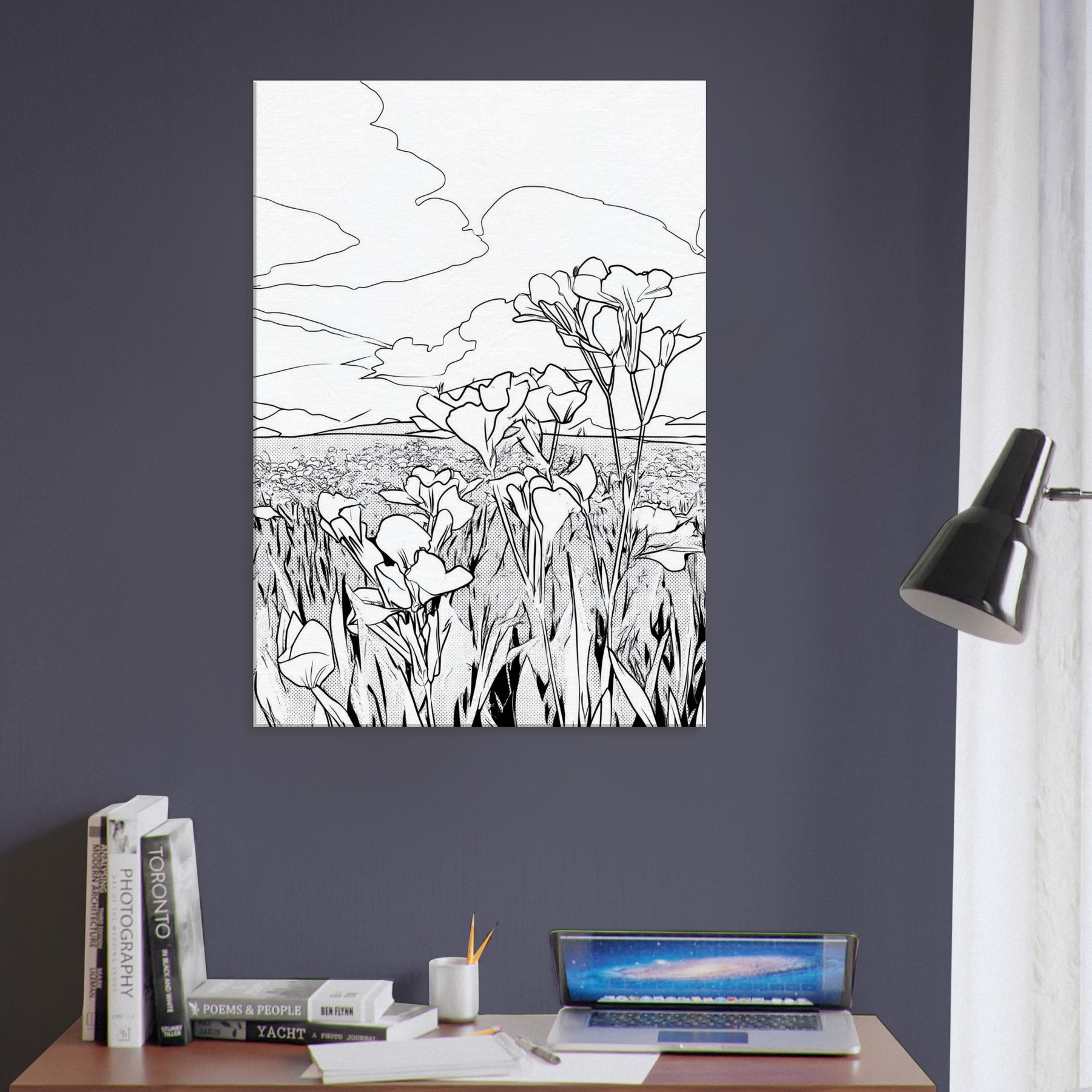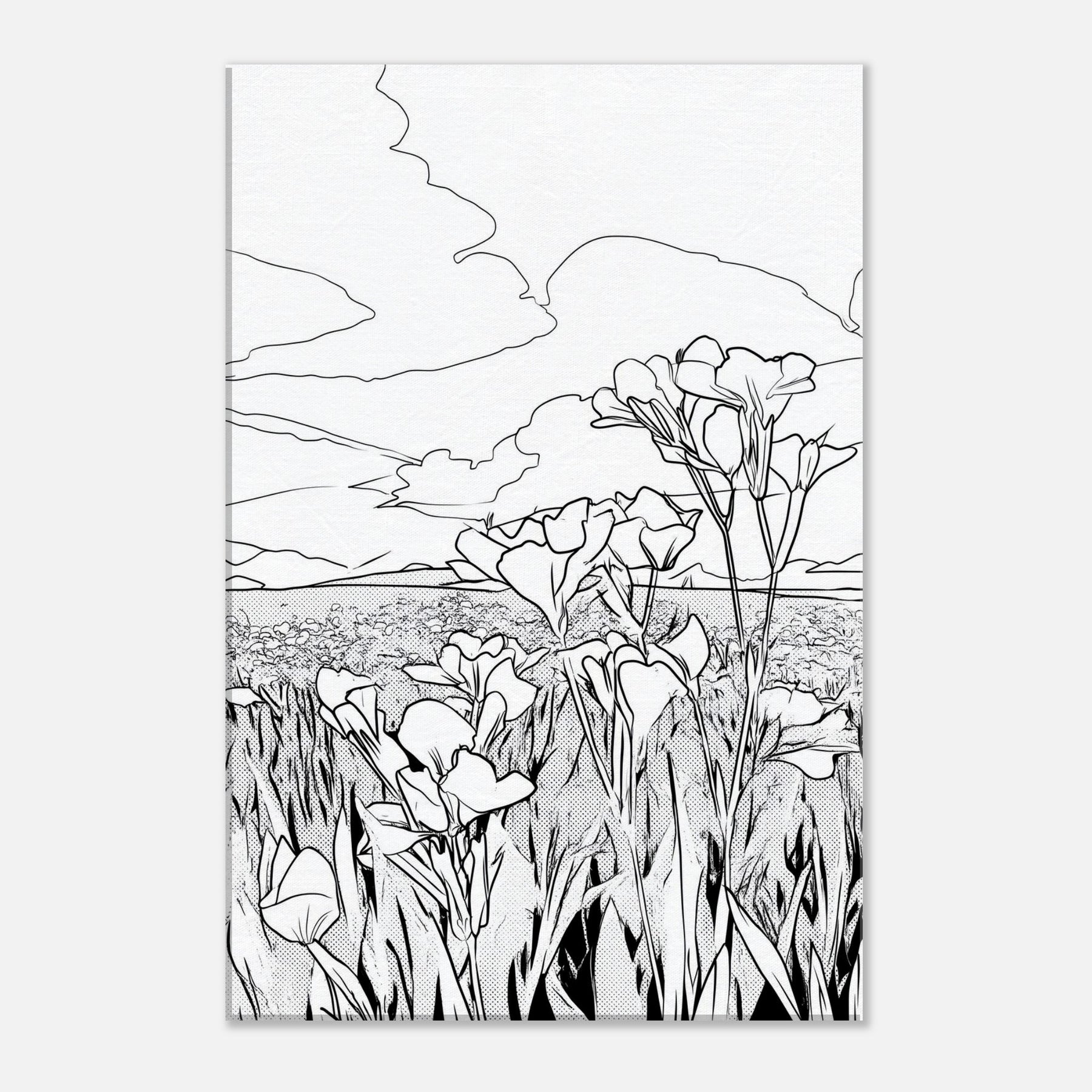 Let the Flower Field unfold in quiet, elegant line work that captures nature’s rhythm in a single frame. This wall art renders a horizon of blossoms with clean, continuous strokes, inviting a sense of calm and openness. The monochrome simplicity breathing on your wall creates space for rest, reflection, and everyday grace, whether hung above a sofa or in a hallway gallery. It pairs beautifully with natural textures, casting a serene atmosphere without overpowering the room.