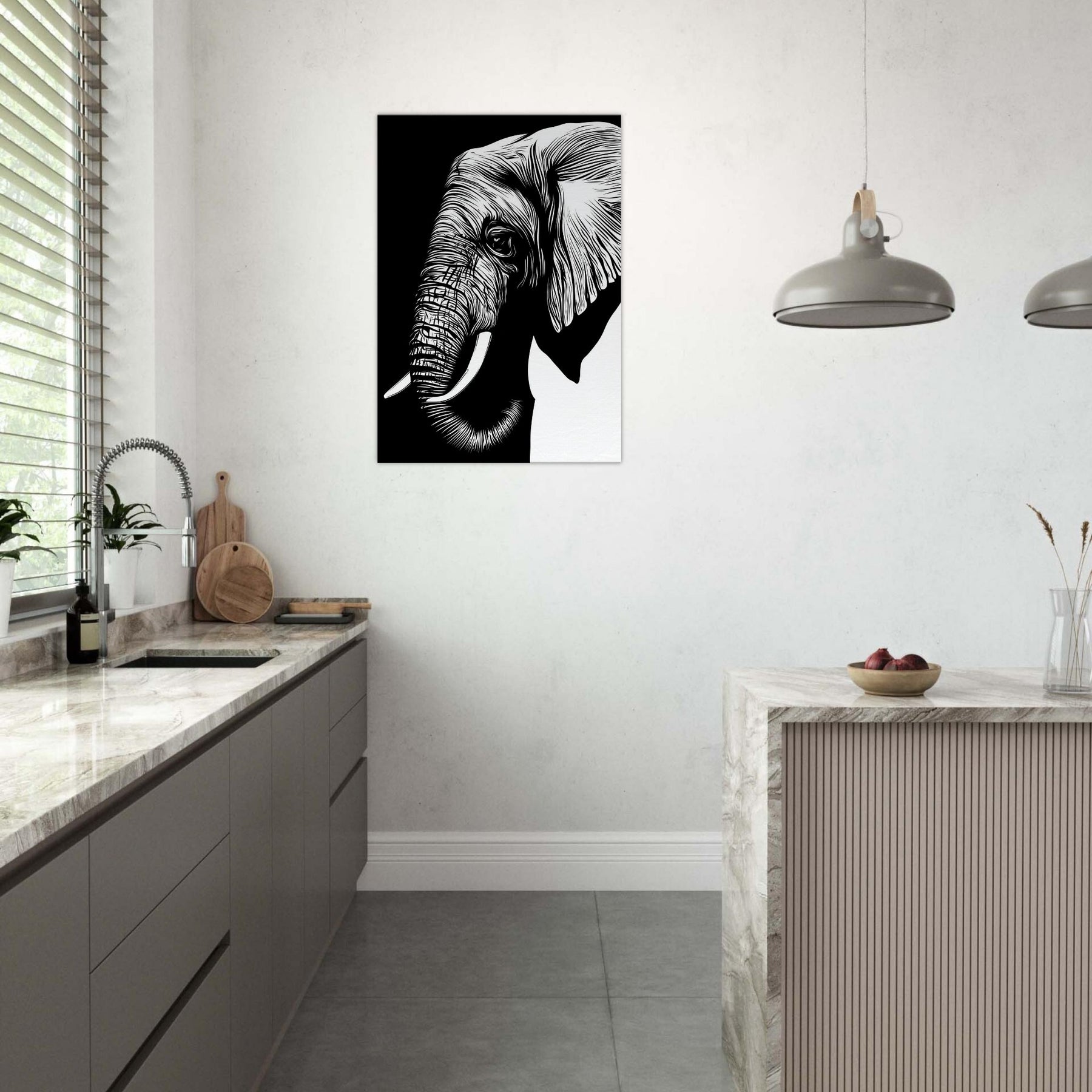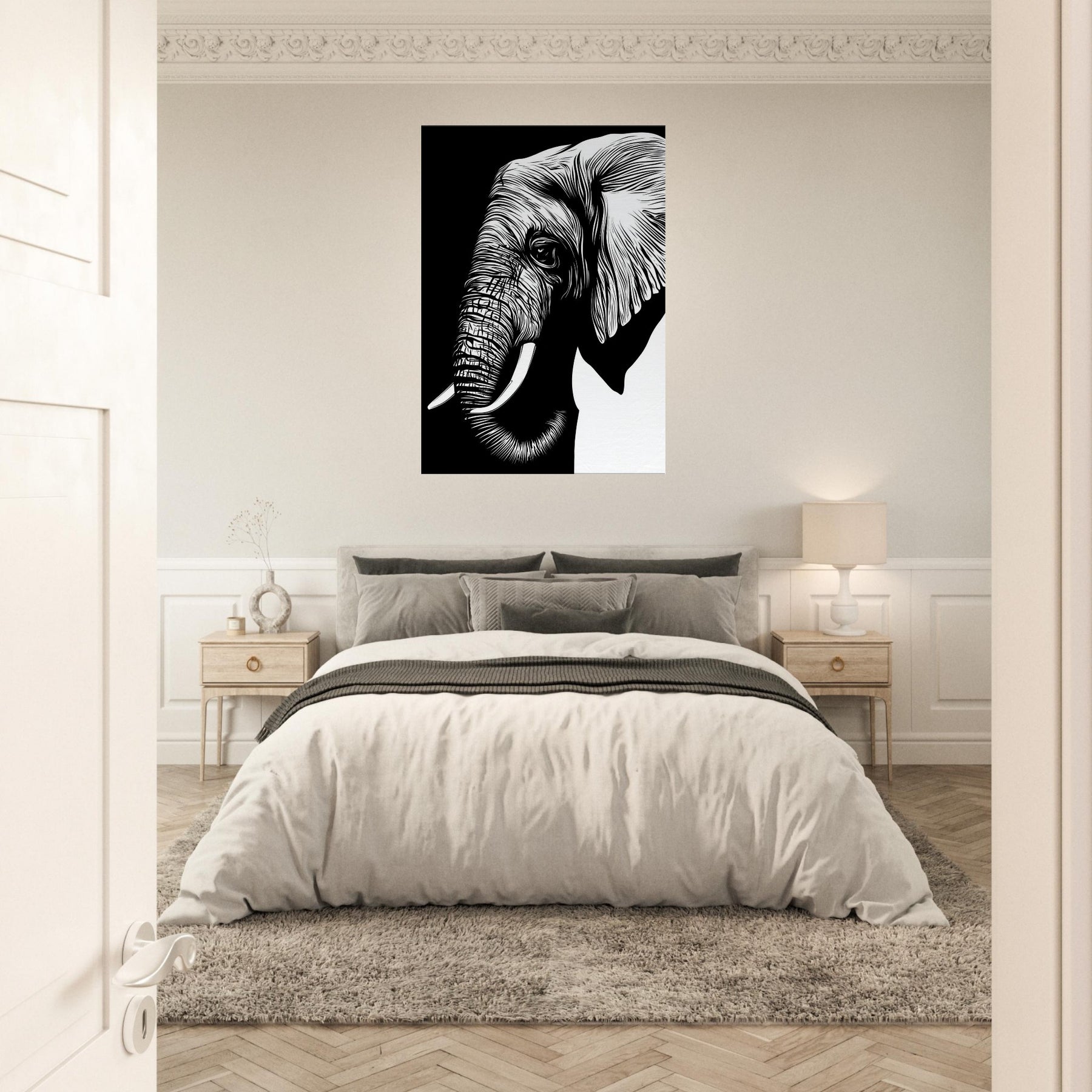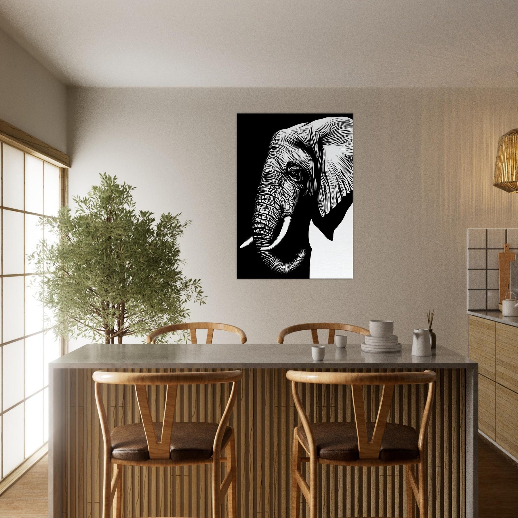 An elegant, minimalist of the Elephant, reduced to clean lines that breathe with quiet power. The bold black and white contrast invites a room to pause, while the gentle curvature of its tusk and ear suggests memory and grace. Displayed in a sunlit corner or above a sofa, this piece brings a sense of calm, spaciousness, and refined focus. It pairs with natural textures and muted palettes, letting you feel the presence of wildlife without visual clutter.