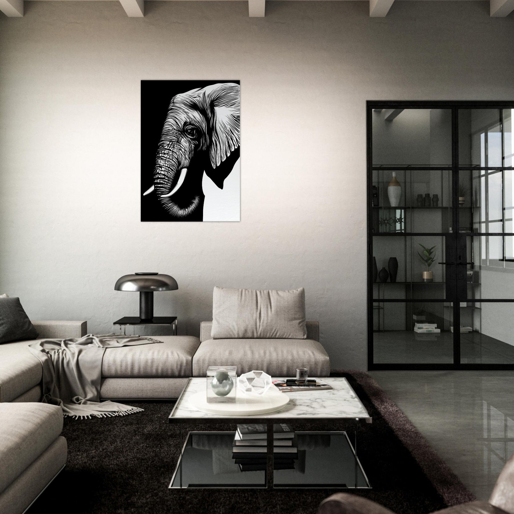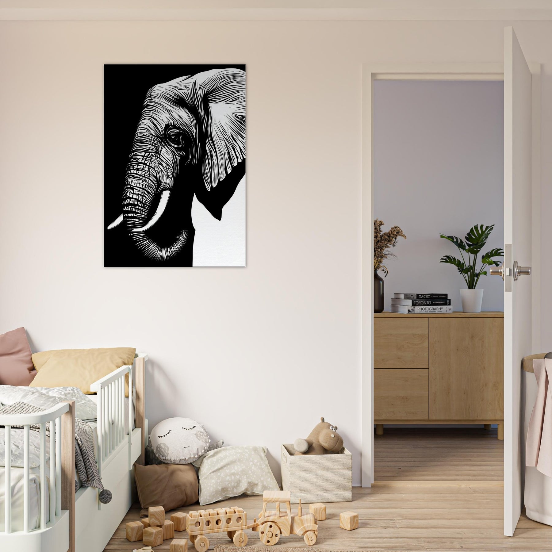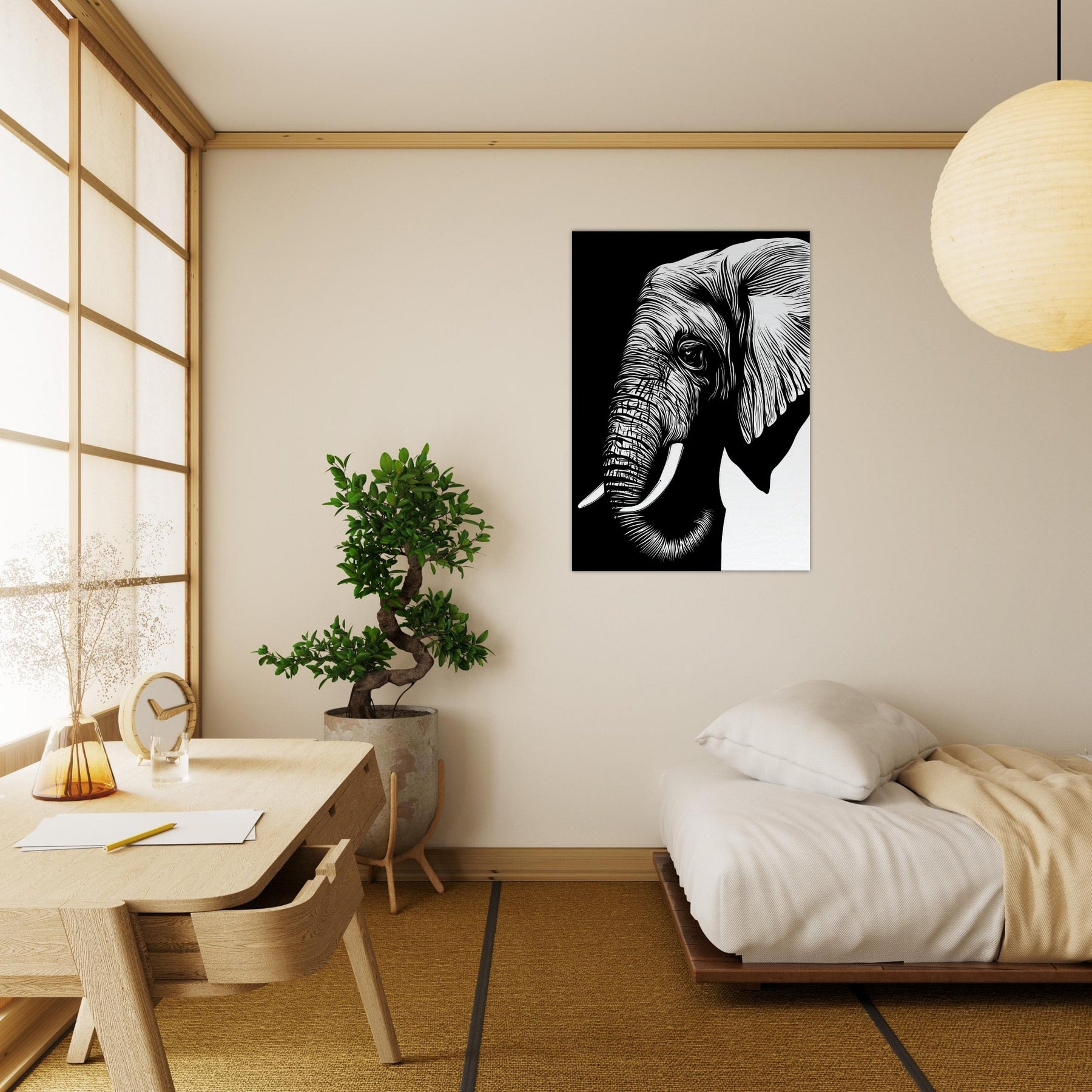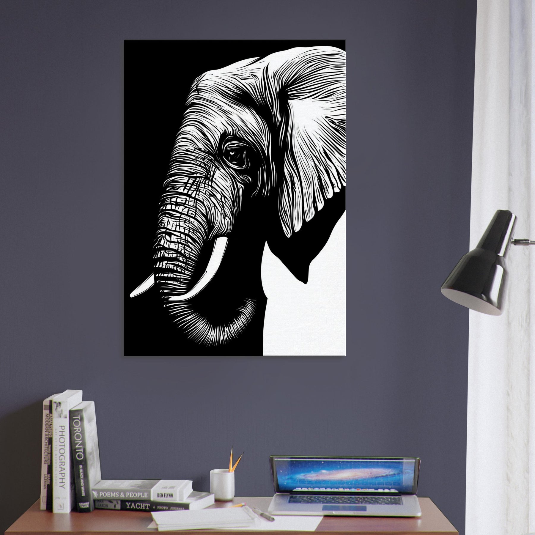 An elegant, minimalist of the Elephant, reduced to clean lines that breathe with quiet power. The bold black and white contrast invites a room to pause, while the gentle curvature of its tusk and ear suggests memory and grace. Displayed in a sunlit corner or above a sofa, this piece brings a sense of calm, spaciousness, and refined focus. It pairs with natural textures and muted palettes, letting you feel the presence of wildlife without visual clutter.