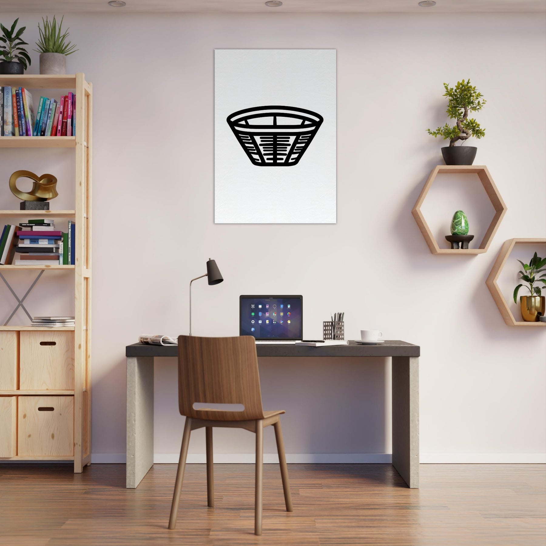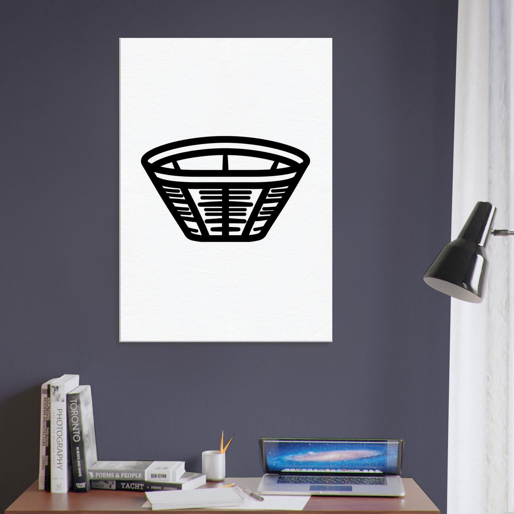This Bamboo Basket line drawing brings quiet warmth into any space. The bold, unbroken contours sketch a humble basket with calm, sculptural presence, inviting slow breaths and easy focus. Its stark black on white simplicity enhances light, texture, and negative space, making a wall feel more intimate and expansive at once. Perfect for living rooms, bedrooms, or entryways, this piece adds a subtle, tactile energy an everyday icon reimagined as timeless minimalism.