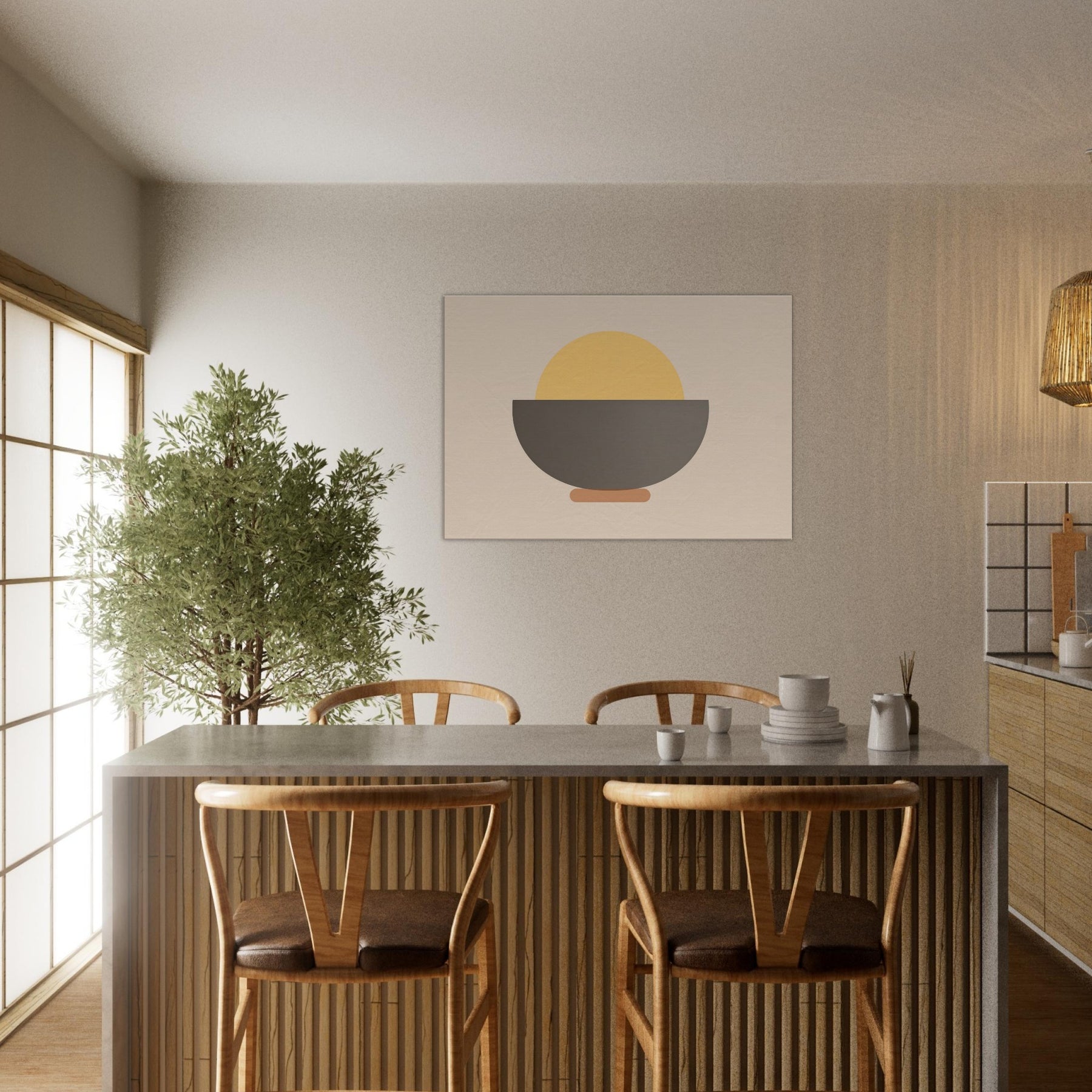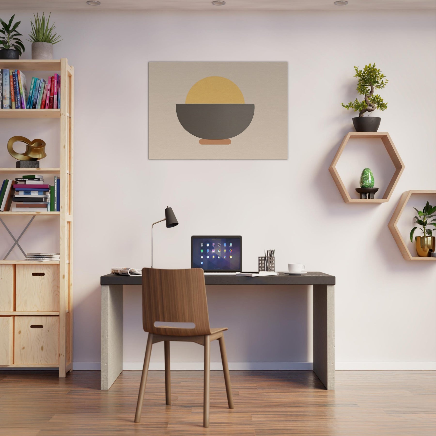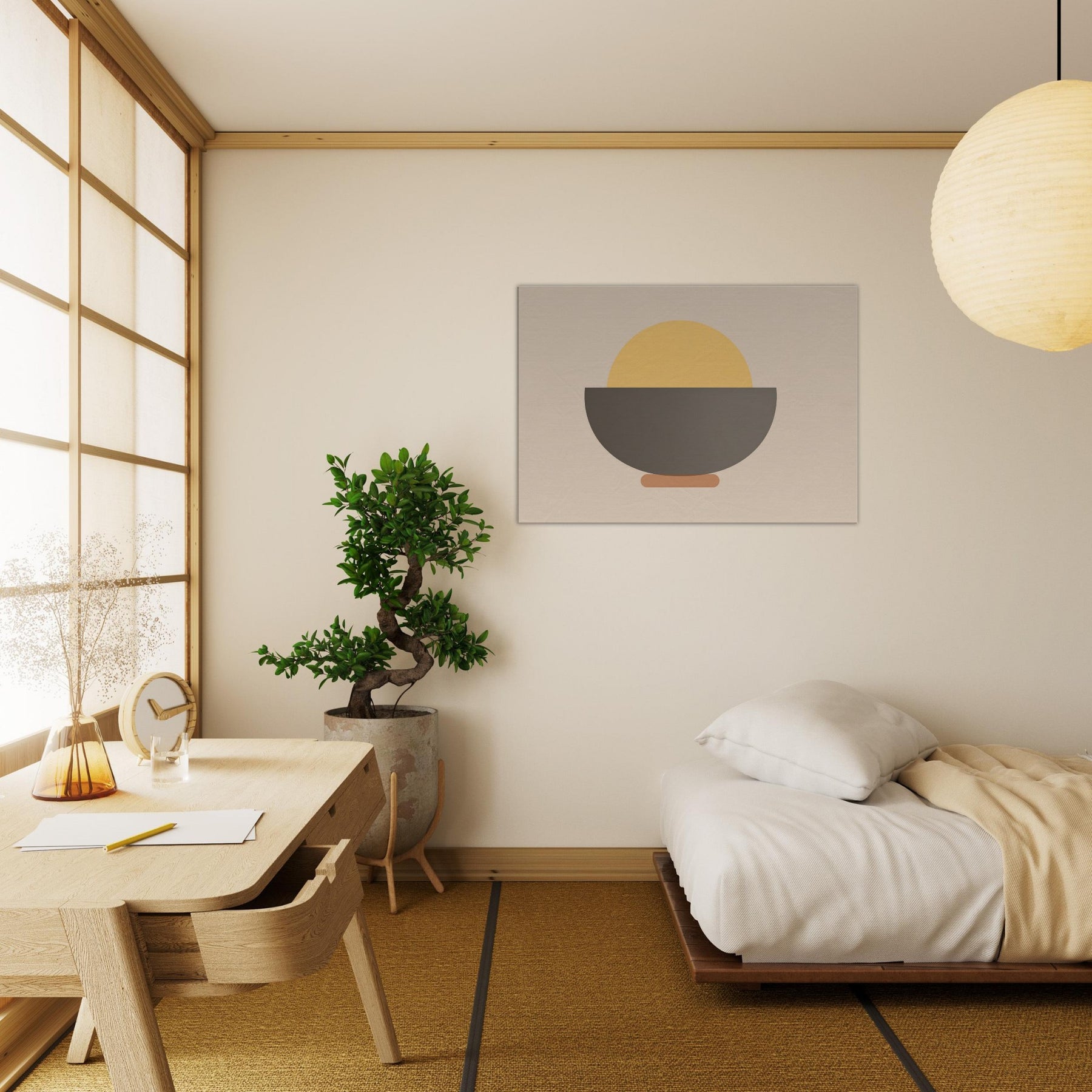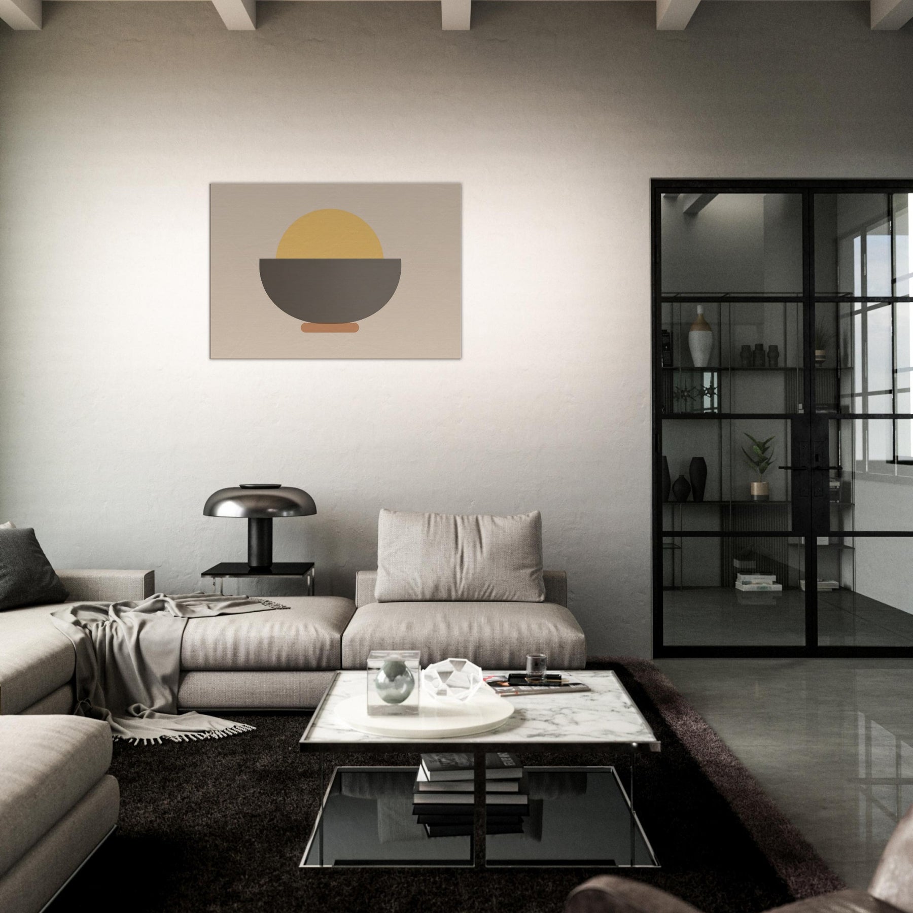 This serene arrangement centers the Primary Subject, Singing Bowl, rendered in a restrained minimalist form that feels like a mindful breath. The warm sun disc rises from a quiet, charcoal bowl, balancing soft peach tones with a grounded, earthy base. It invites a hushed, meditative mood into any room, amplifying a living space with subtle rhythm and glow. Perfect above a sofa or in a quiet corner, where evenings soften into contemplation.
