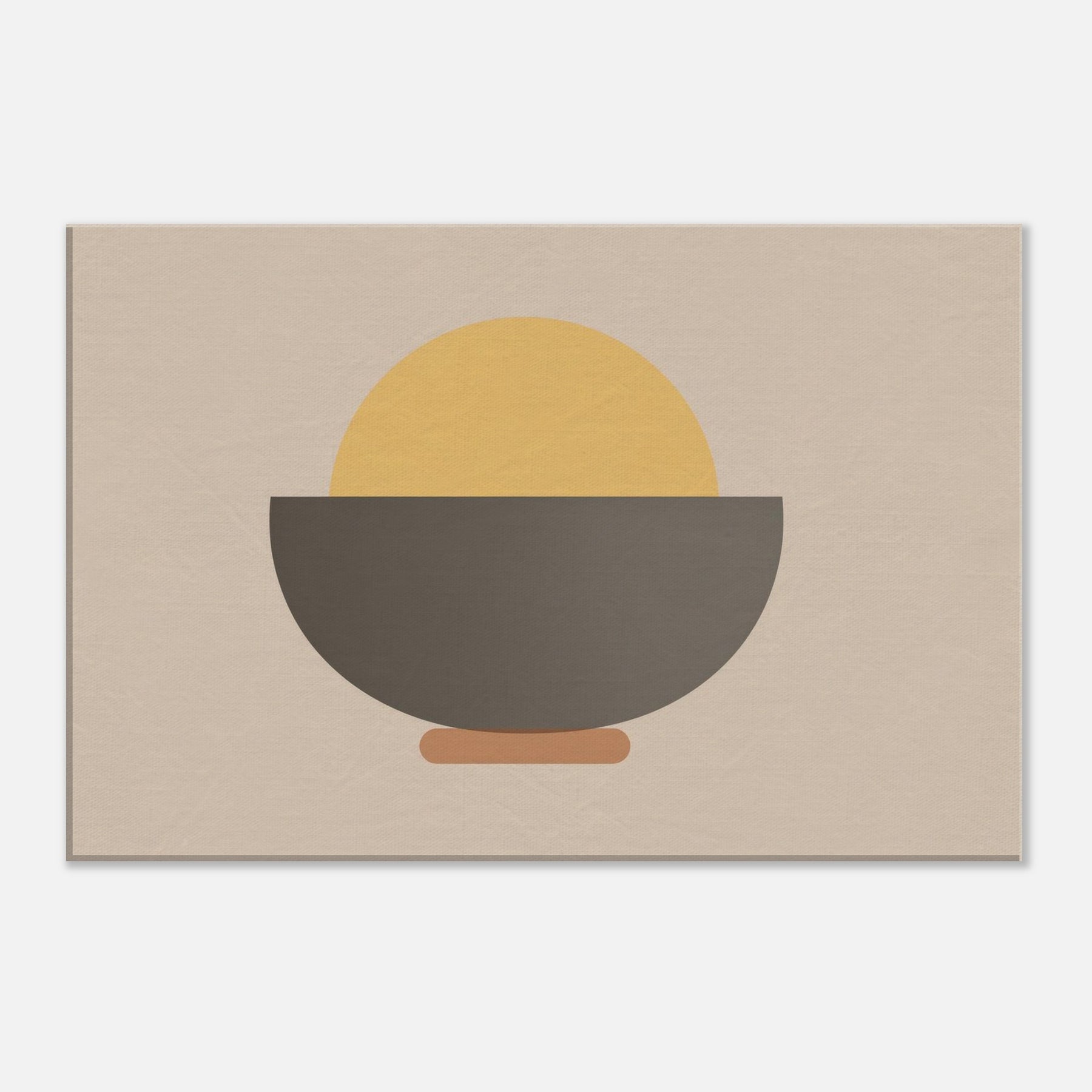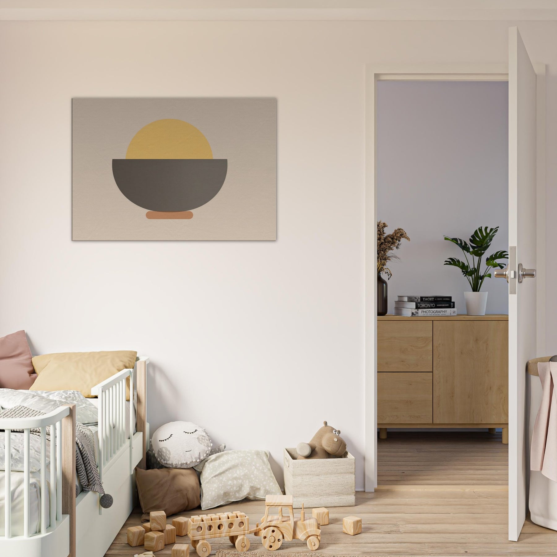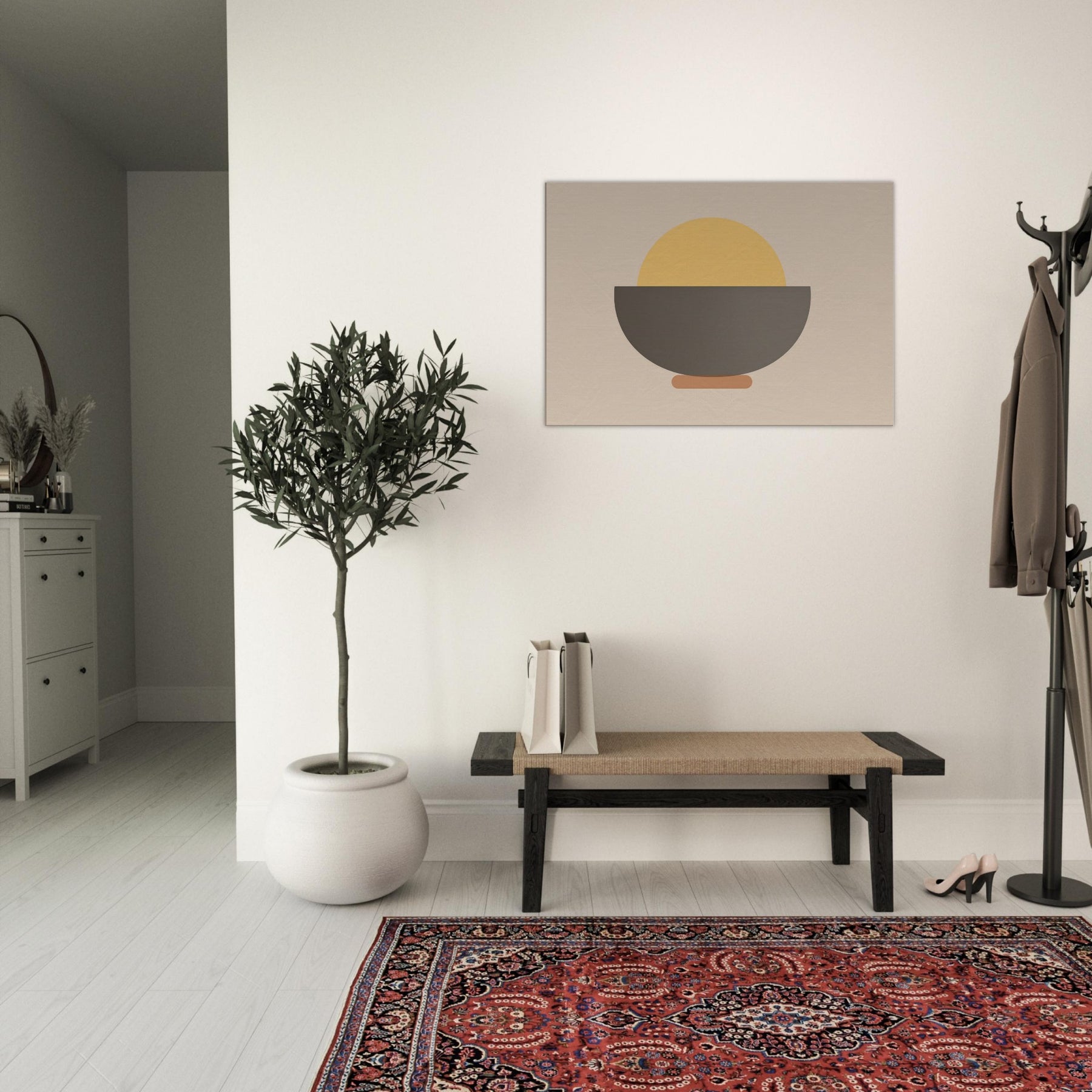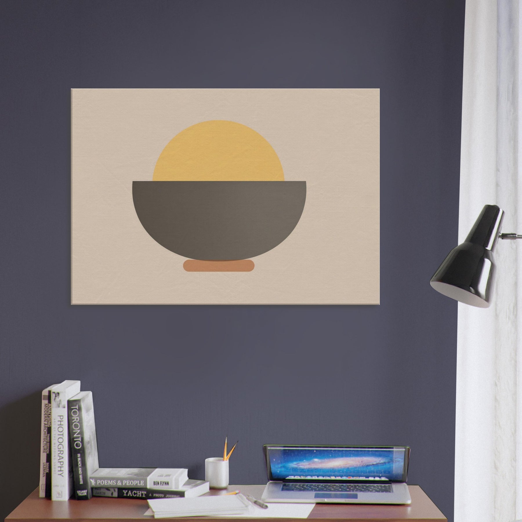 This serene arrangement centers the Primary Subject, Singing Bowl, rendered in a restrained minimalist form that feels like a mindful breath. The warm sun disc rises from a quiet, charcoal bowl, balancing soft peach tones with a grounded, earthy base. It invites a hushed, meditative mood into any room, amplifying a living space with subtle rhythm and glow. Perfect above a sofa or in a quiet corner, where evenings soften into contemplation.