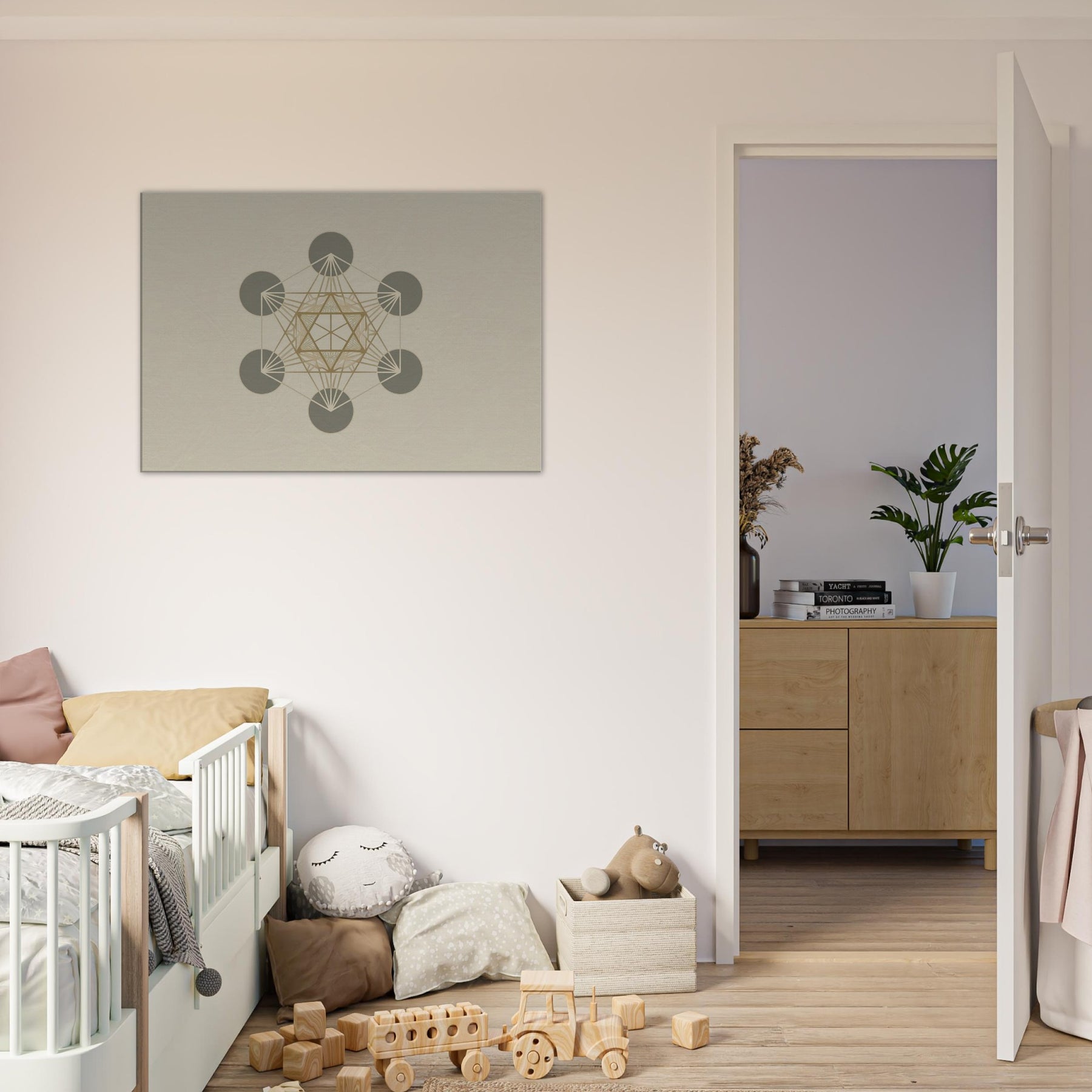 Metatron’S Cube unfurls in a quiet hymn of lines, where circles orbit a delicate nucleus of triangles. The minimalist geometry radiates a calm that softens the room, inviting breath and contemplation. This piece transforms a wall into a portal, catching light and rendering space with a subtle, sacred resonance. In its mystical discipline, Metatron’S Cube becomes a focal point for evening reflection, morning stillness, and the everyday ritual of simply being present.