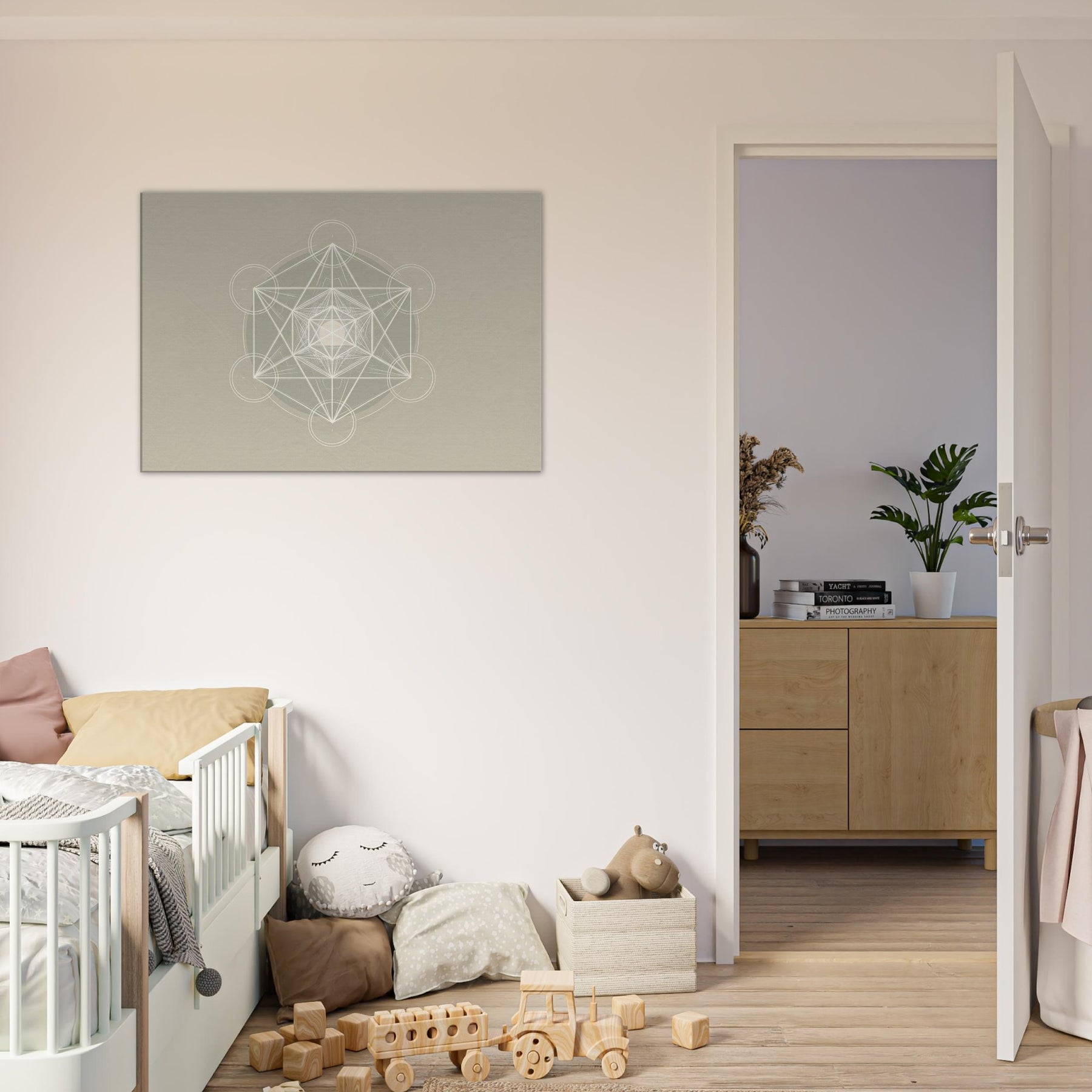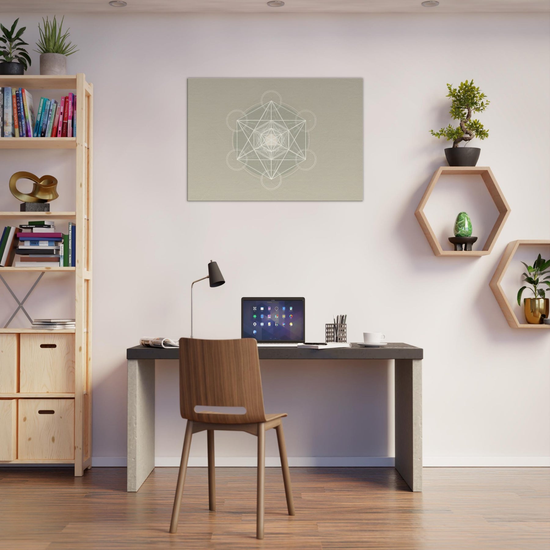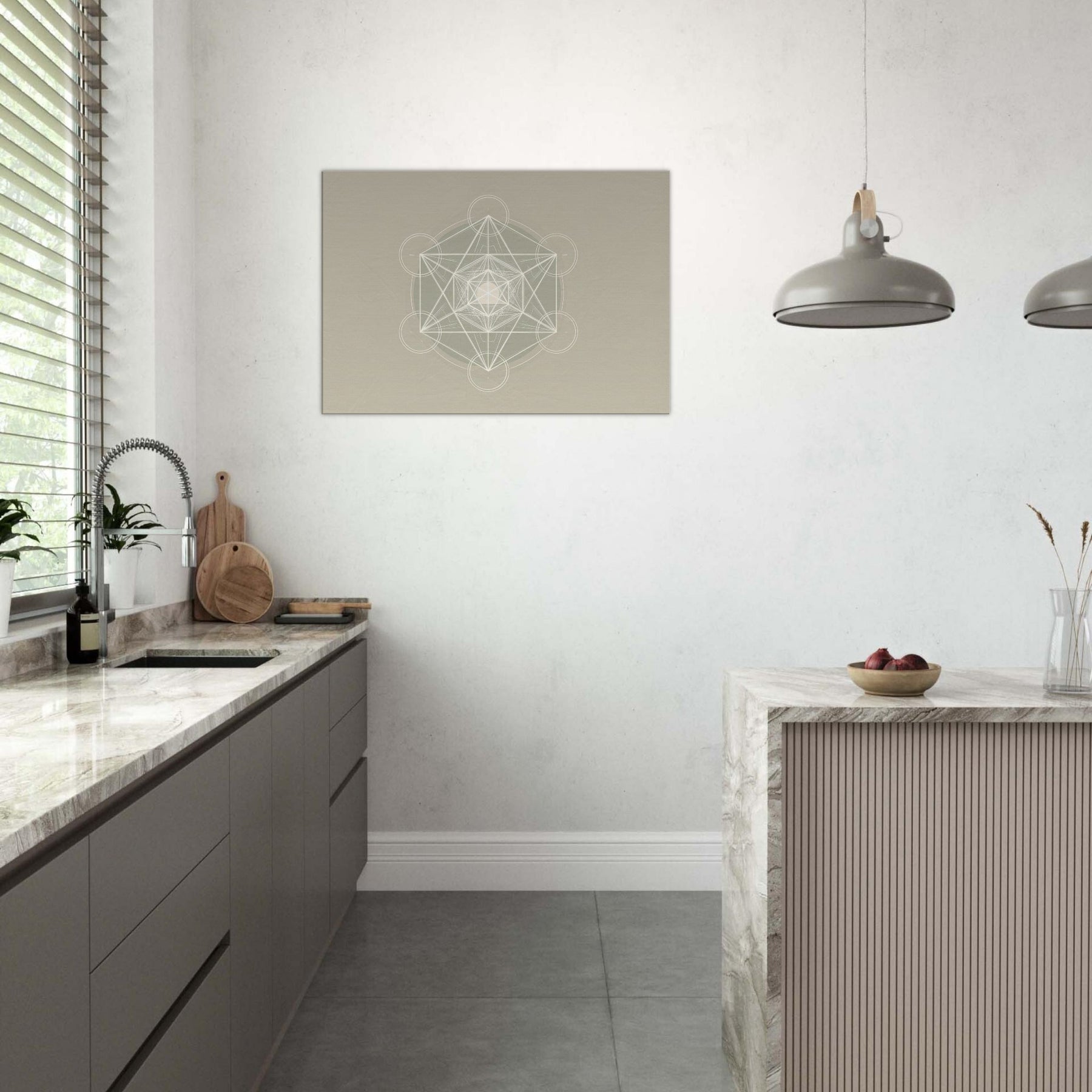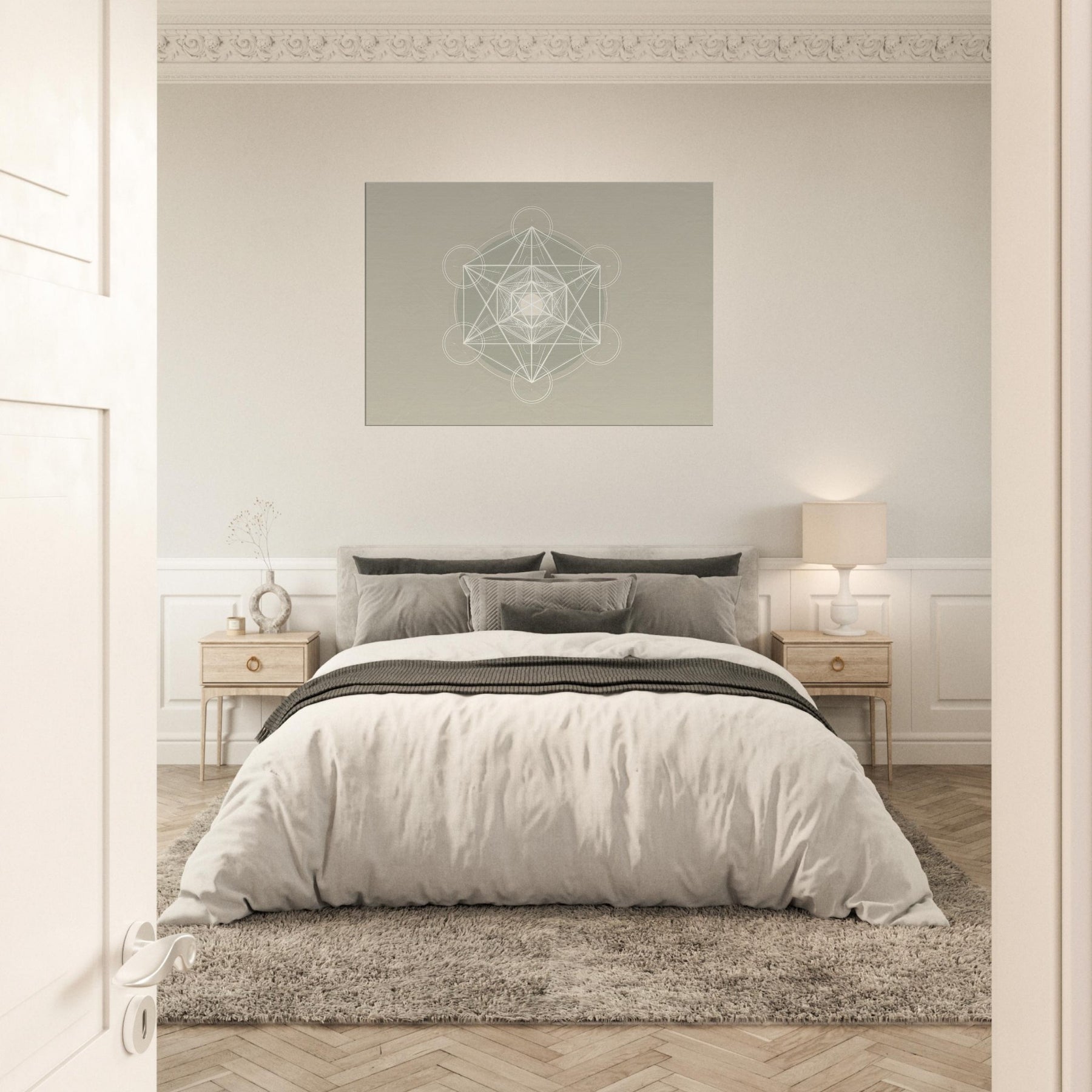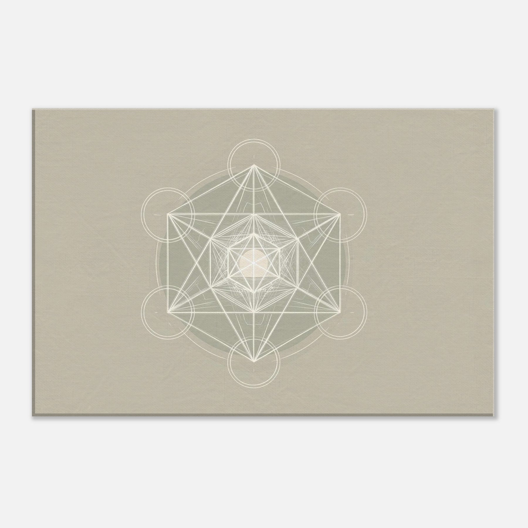 Metatron’s Cube unfolds in pristine white linework against a soft, warm beige field, a minimalist meditation on sacred geometry. Each line threads toward a luminous center, inviting stillness and focus as light brushes the surface. This piece softens a room with quiet luminosity, turning walls into a sanctuary where ideas settle and breath slows. Perfect for a living space or study, it pairs contemporary restraint with a mystical glow, elevating mood without shouting, and guiding the eye toward calm, collected contemplation.