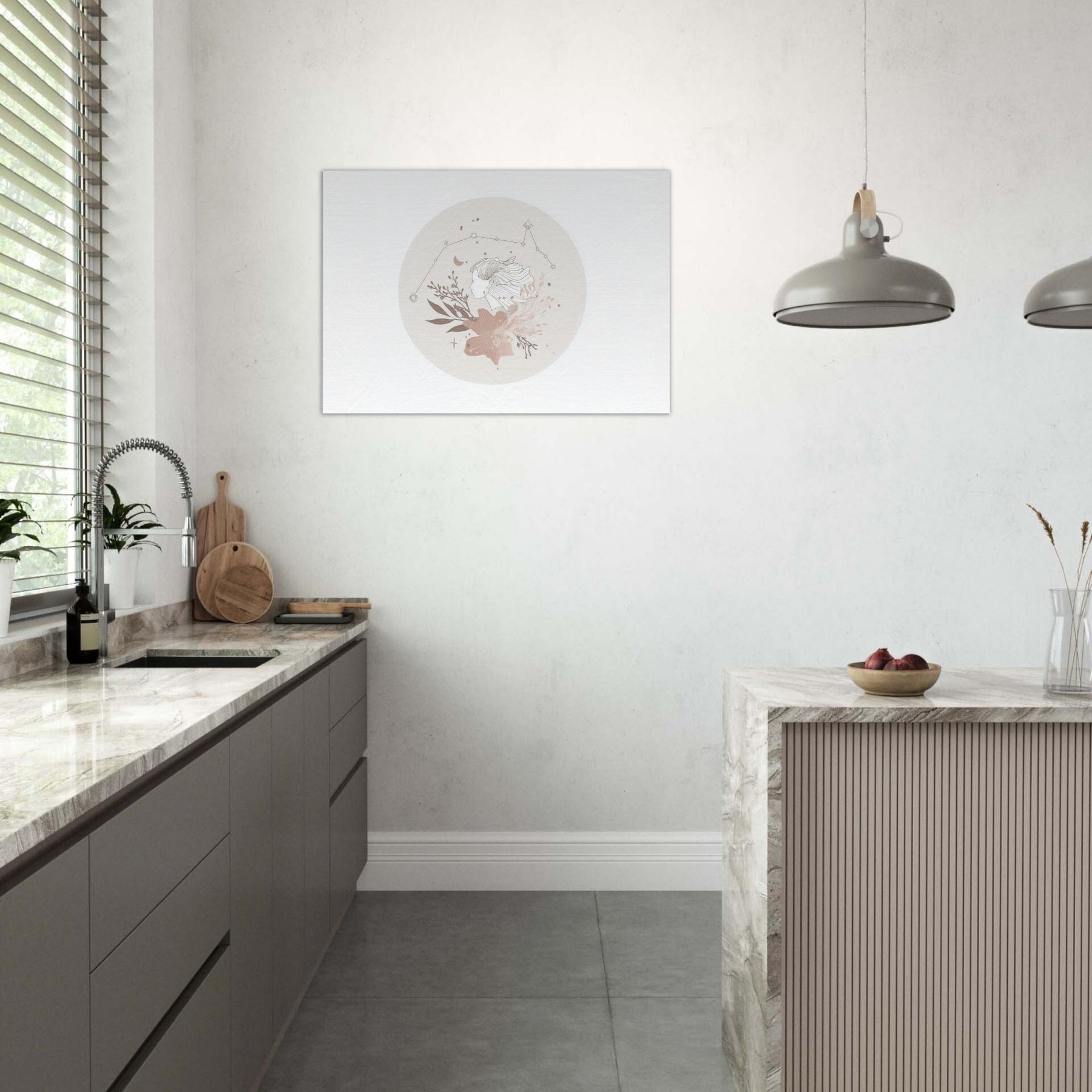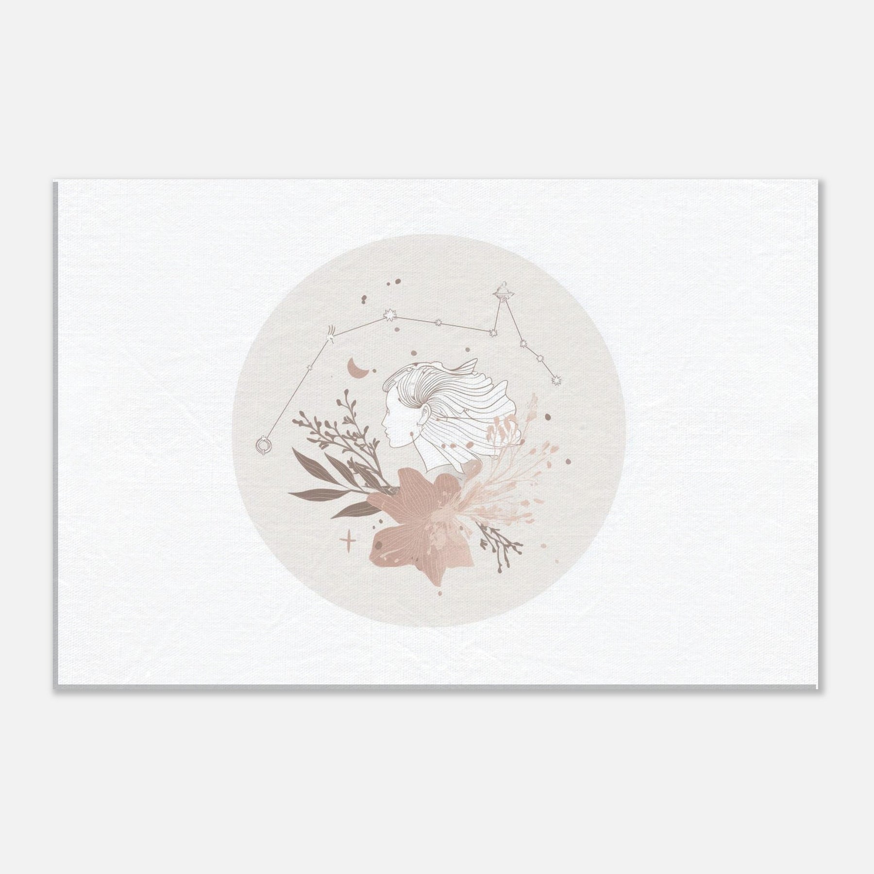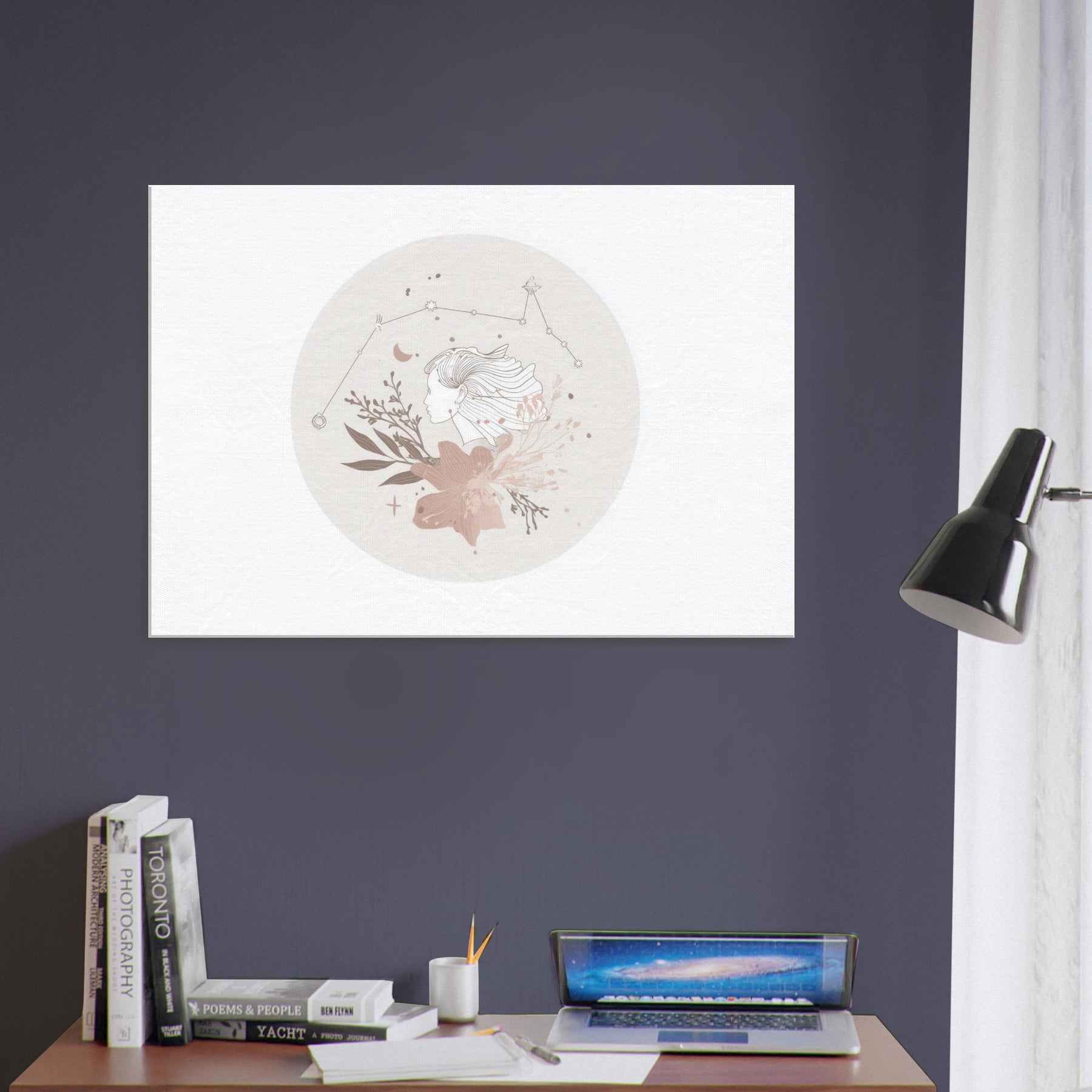 Centered on the Primary Subject, a Zodiac Constellation (Minimal Line) unfurls in a single, graceful contour. The composition blends delicate botanical flourishes with a pale, lunar palette, inviting quiet reflection. This piece exudes a soft, celestial glow that feels like a breath of night air perfect for a calm living room or serene bedroom. It adds a sense of rhythm and wonder, turning walls into a quiet horizon where imagination drifts among stars, petals, and gentle lines.