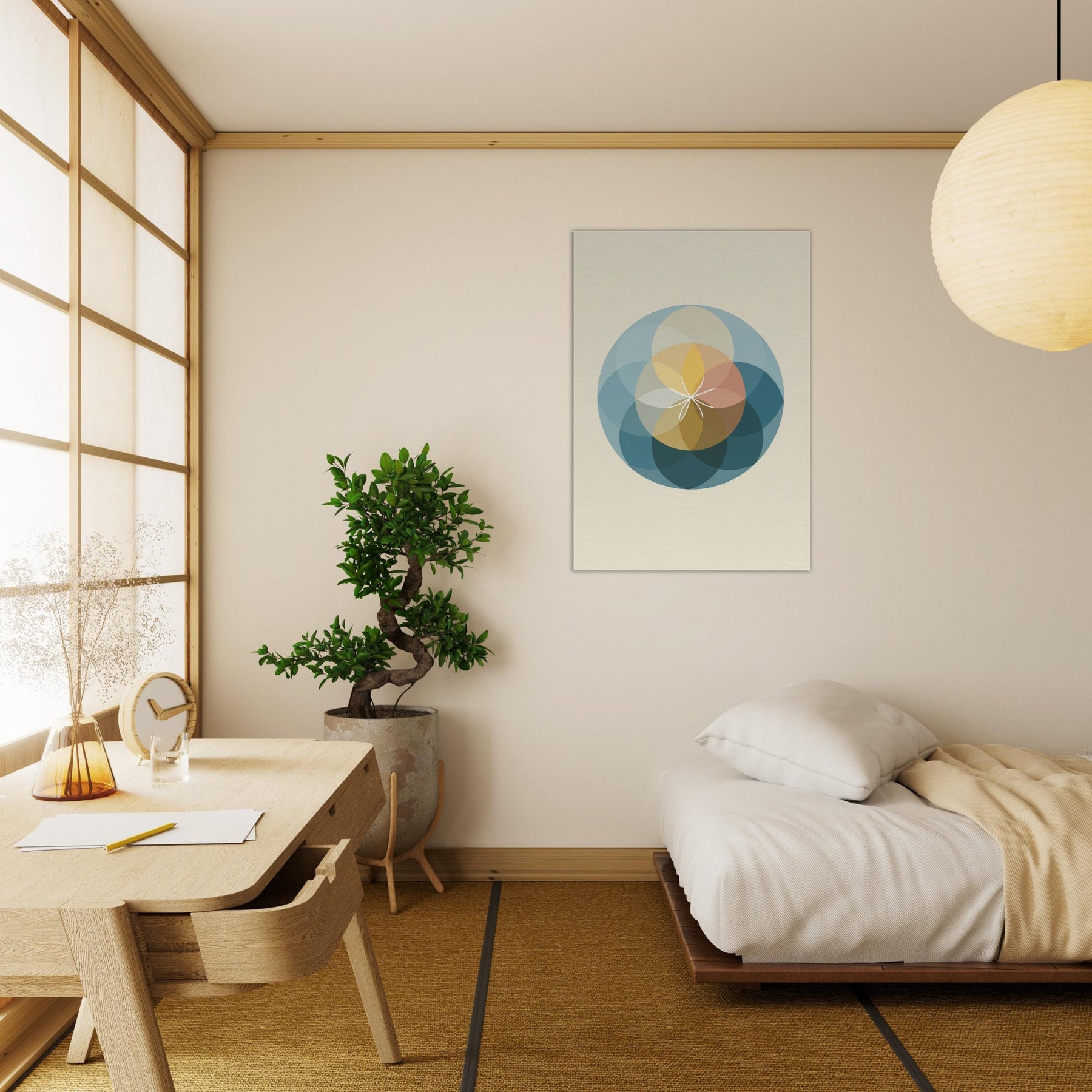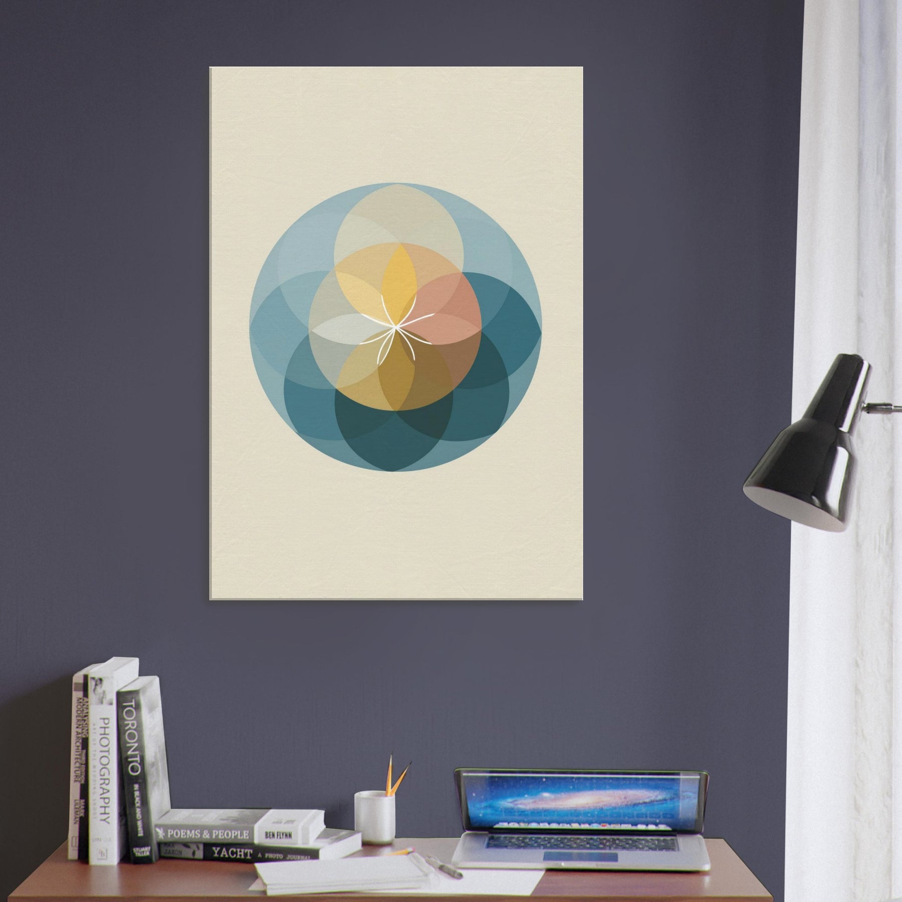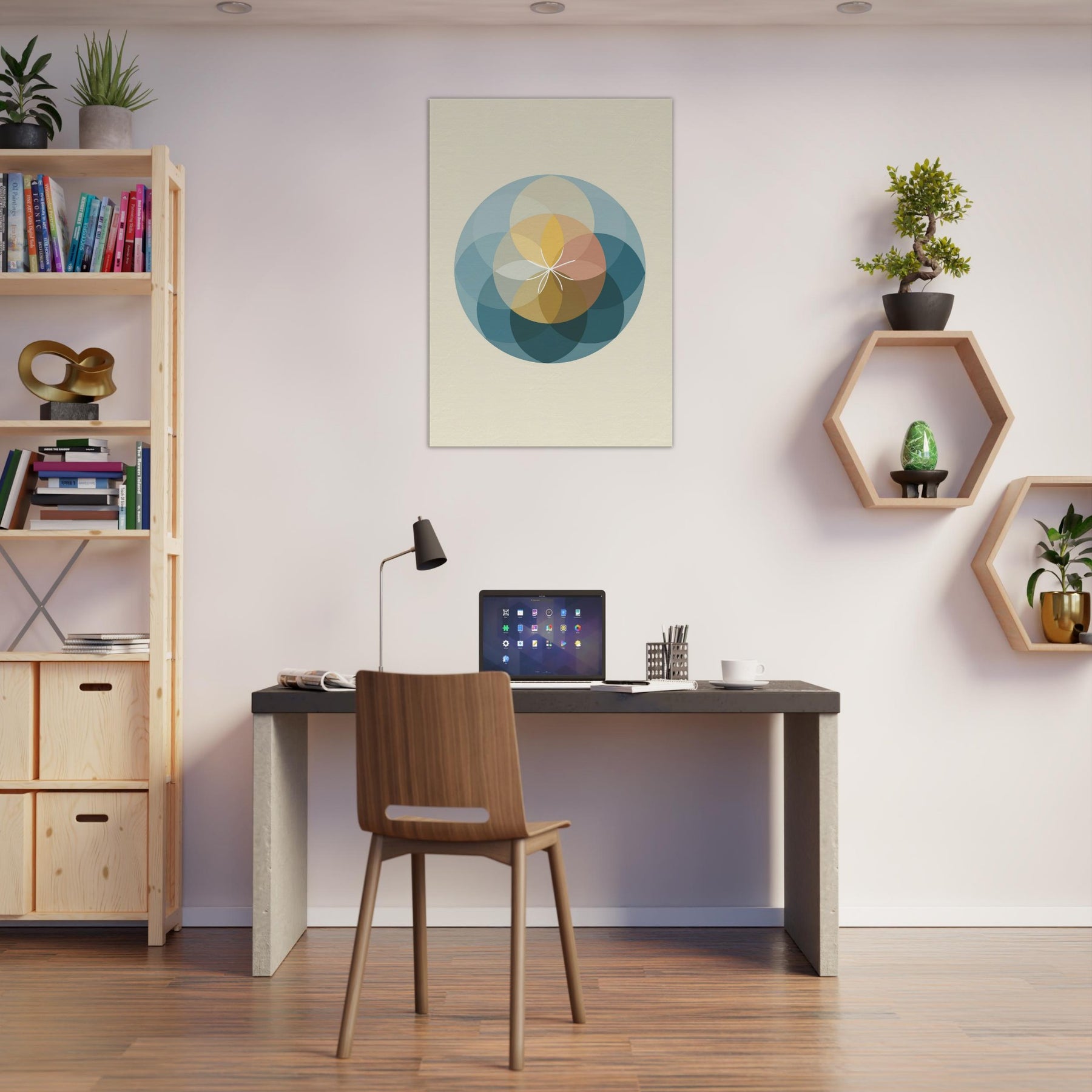Drawn in a quiet, minimalist language, this piece distills the Chakras into overlapping circles of muted blues, teals, golds, and amber. The concentric rings breathe with soft translucence, inviting calm into a living room or meditation corner. As daylight shifts, the artwork glows with an everyday halo, turning walls into a quiet sanctuary where intention and space meet. The piece invites breath, balance, and a subtle, mystical focus without overpowering your décor.