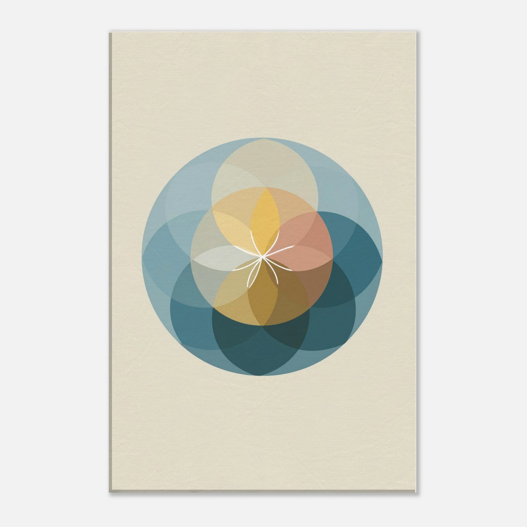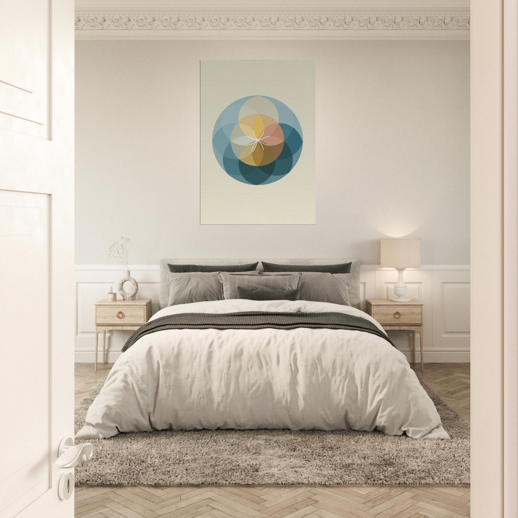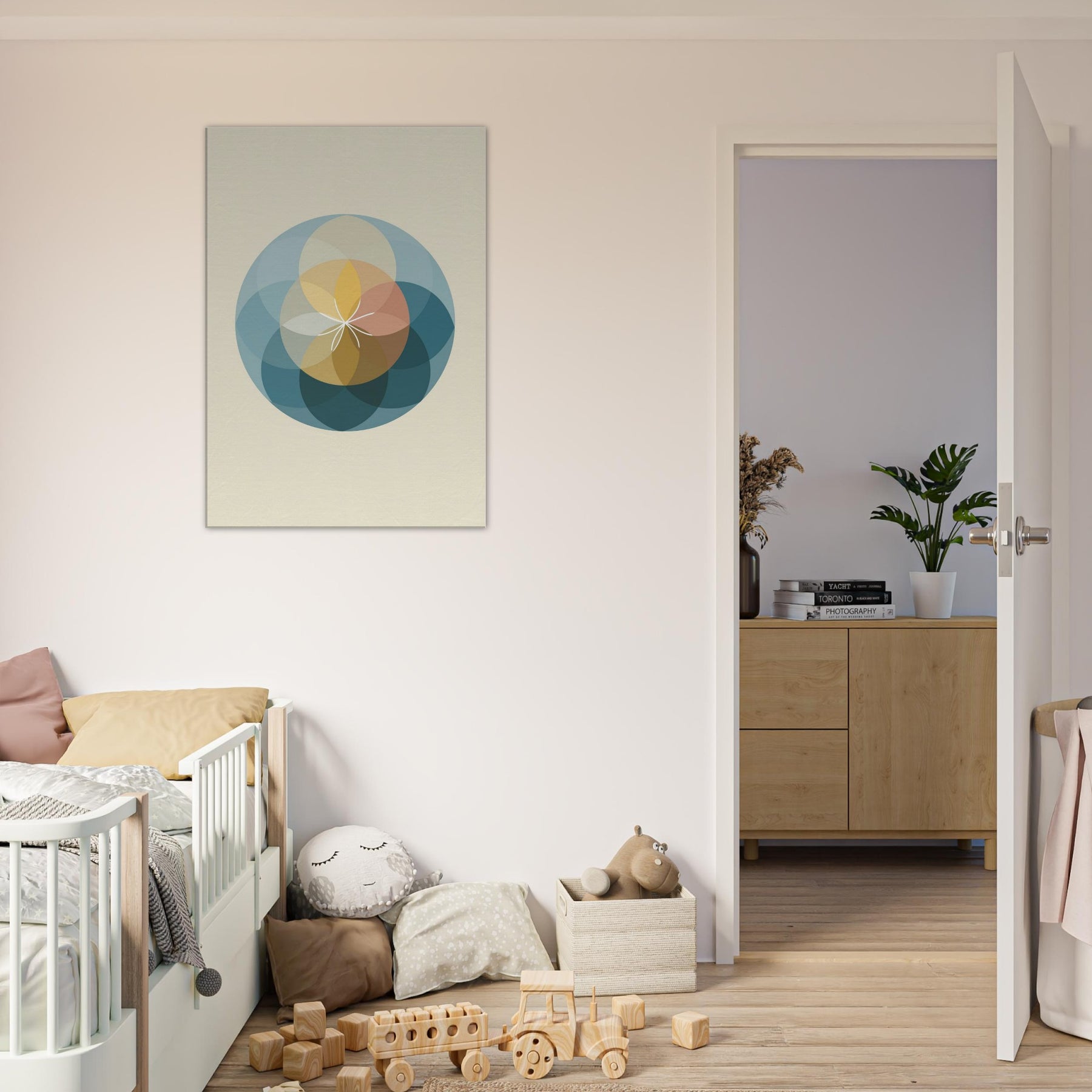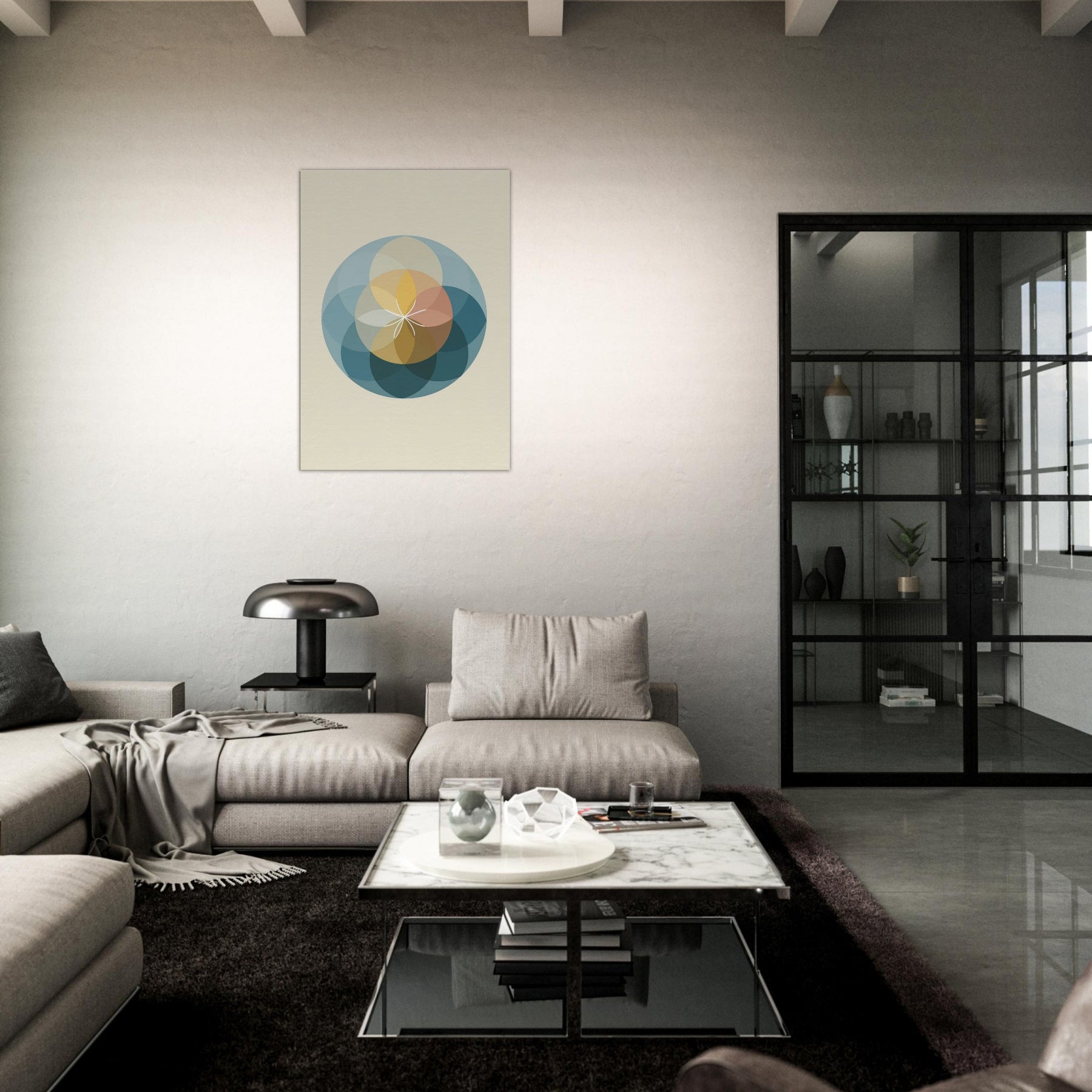 Drawn in a quiet, minimalist language, this piece distills the Chakras into overlapping circles of muted blues, teals, golds, and amber. The concentric rings breathe with soft translucence, inviting calm into a living room or meditation corner. As daylight shifts, the artwork glows with an everyday halo, turning walls into a quiet sanctuary where intention and space meet. The piece invites breath, balance, and a subtle, mystical focus without overpowering your décor.