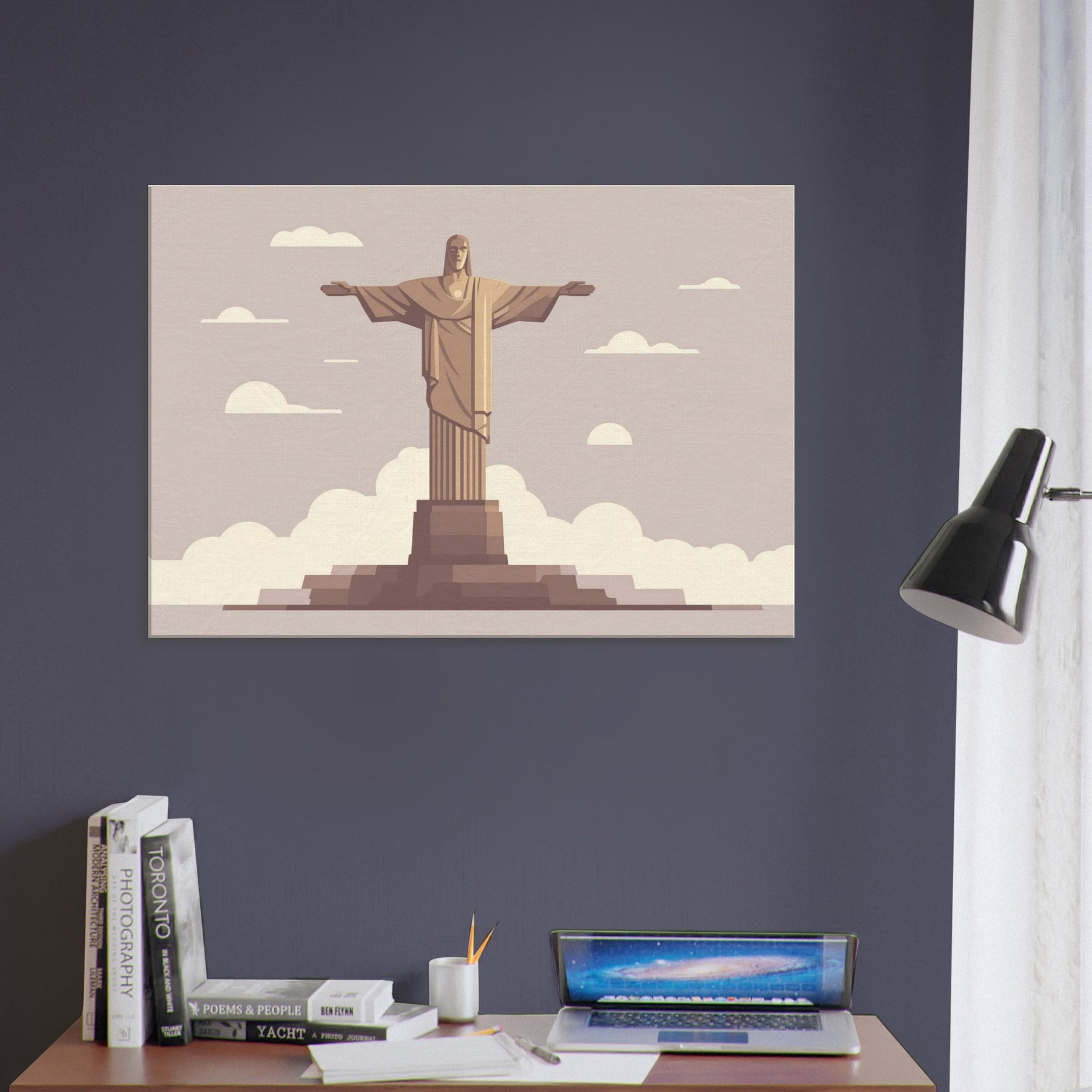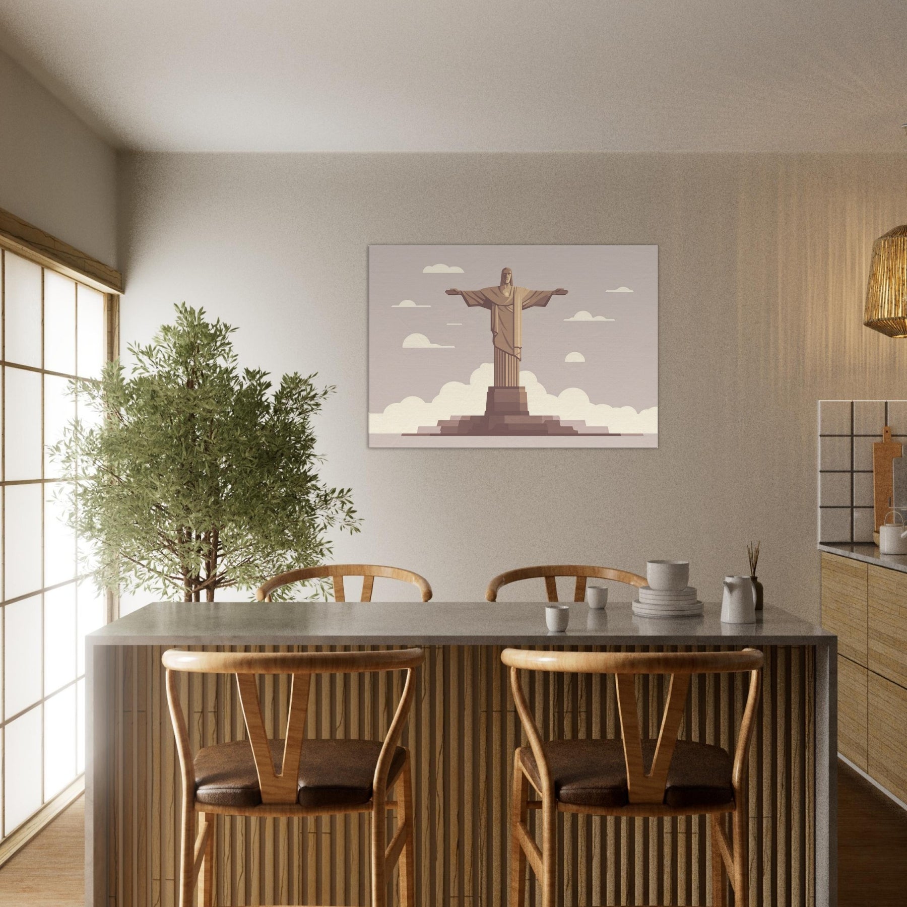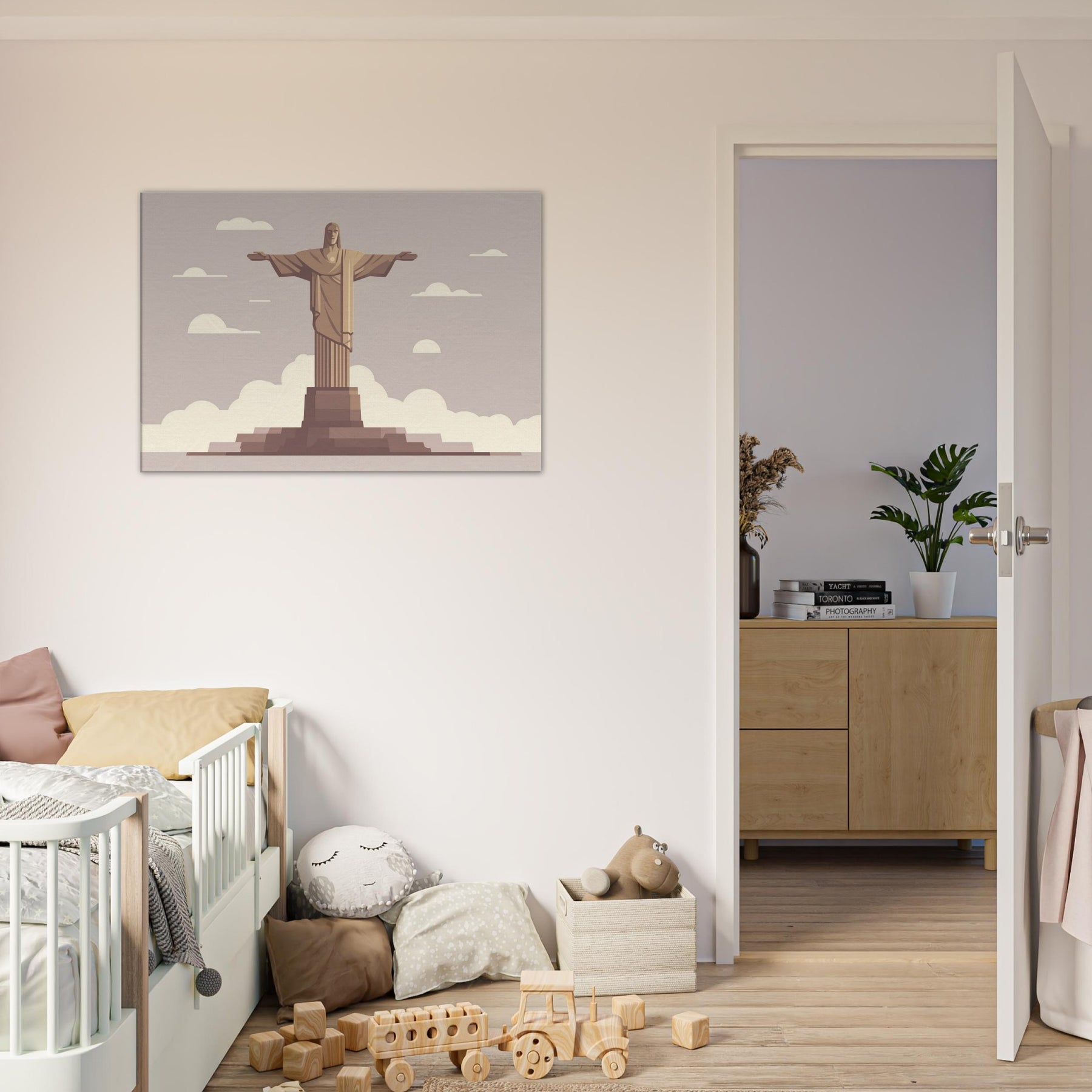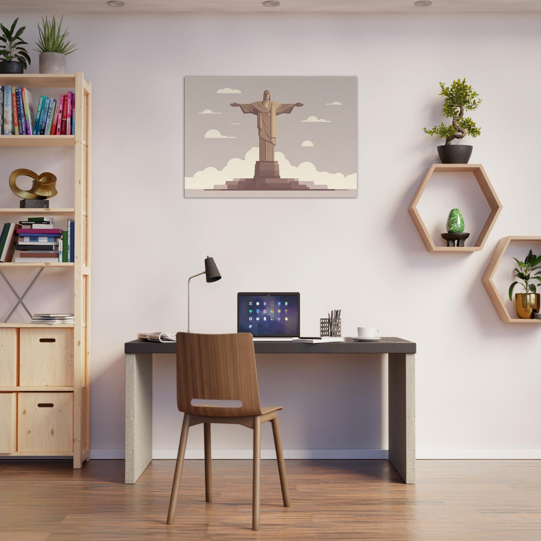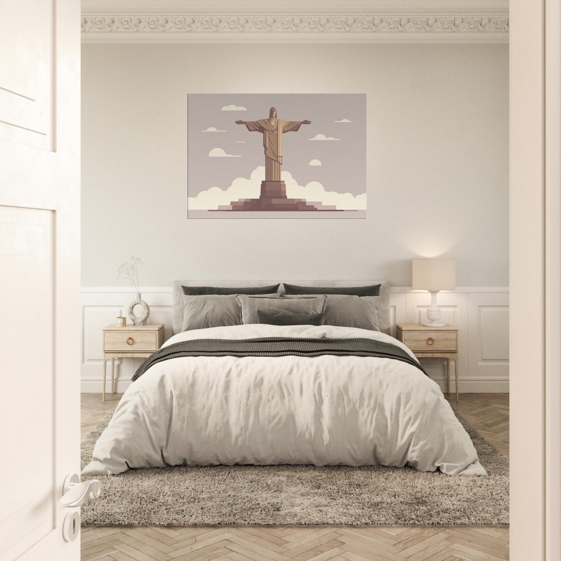 An elegant, minimalist of Christ the Redeemer that feels both monumental and intimate. The piece dissolves the statue into warm, earthy tones, rising from soft clouds to cast a serene glow across any room. It invites quiet reflection and a sense of elevated calm, turning your living space into a contemplative sanctuary. Perfect above a sofa or in a hallway, it pairs urban chic with spiritual grace, inviting guests to pause, breathe, and glimpse a skyline’s quiet monument.