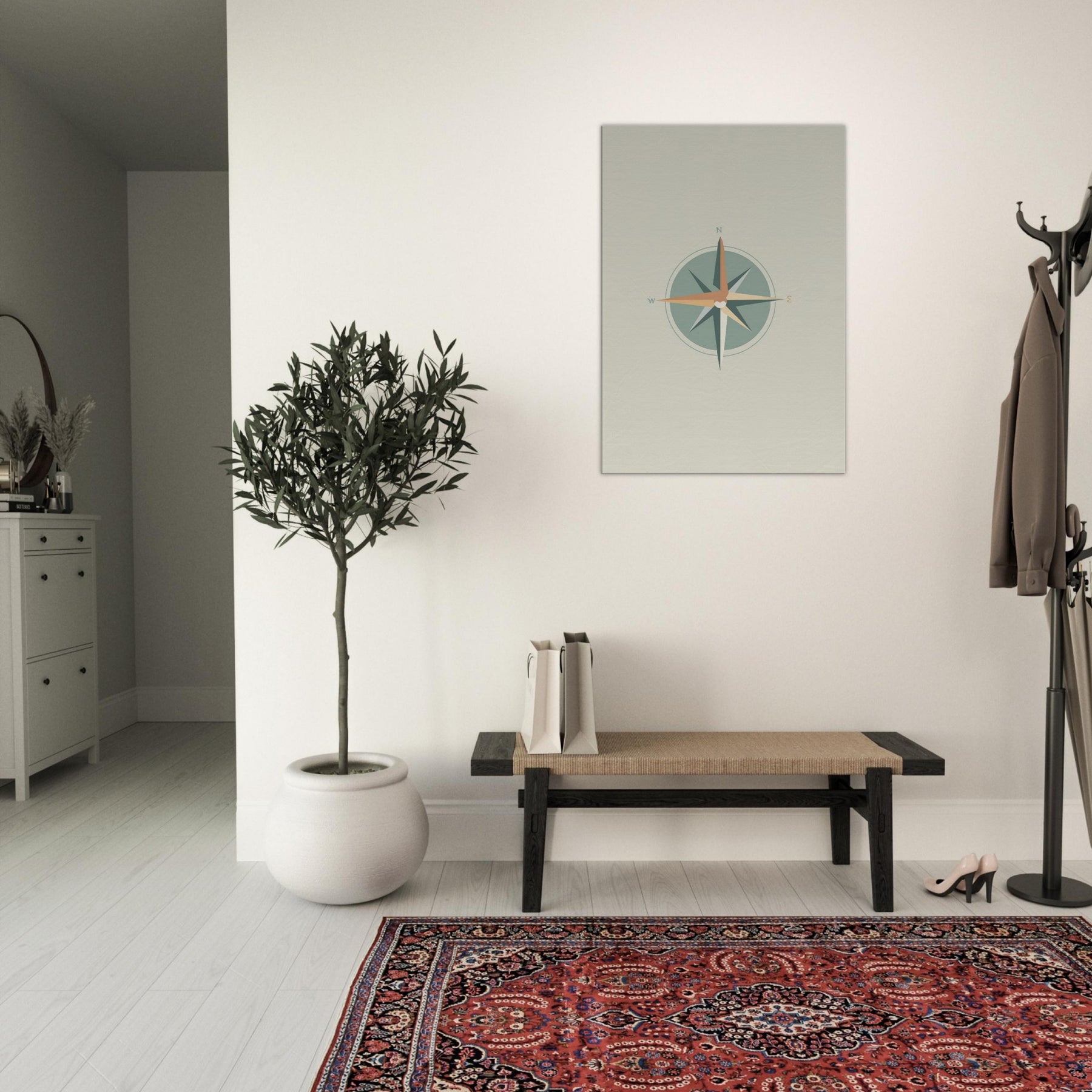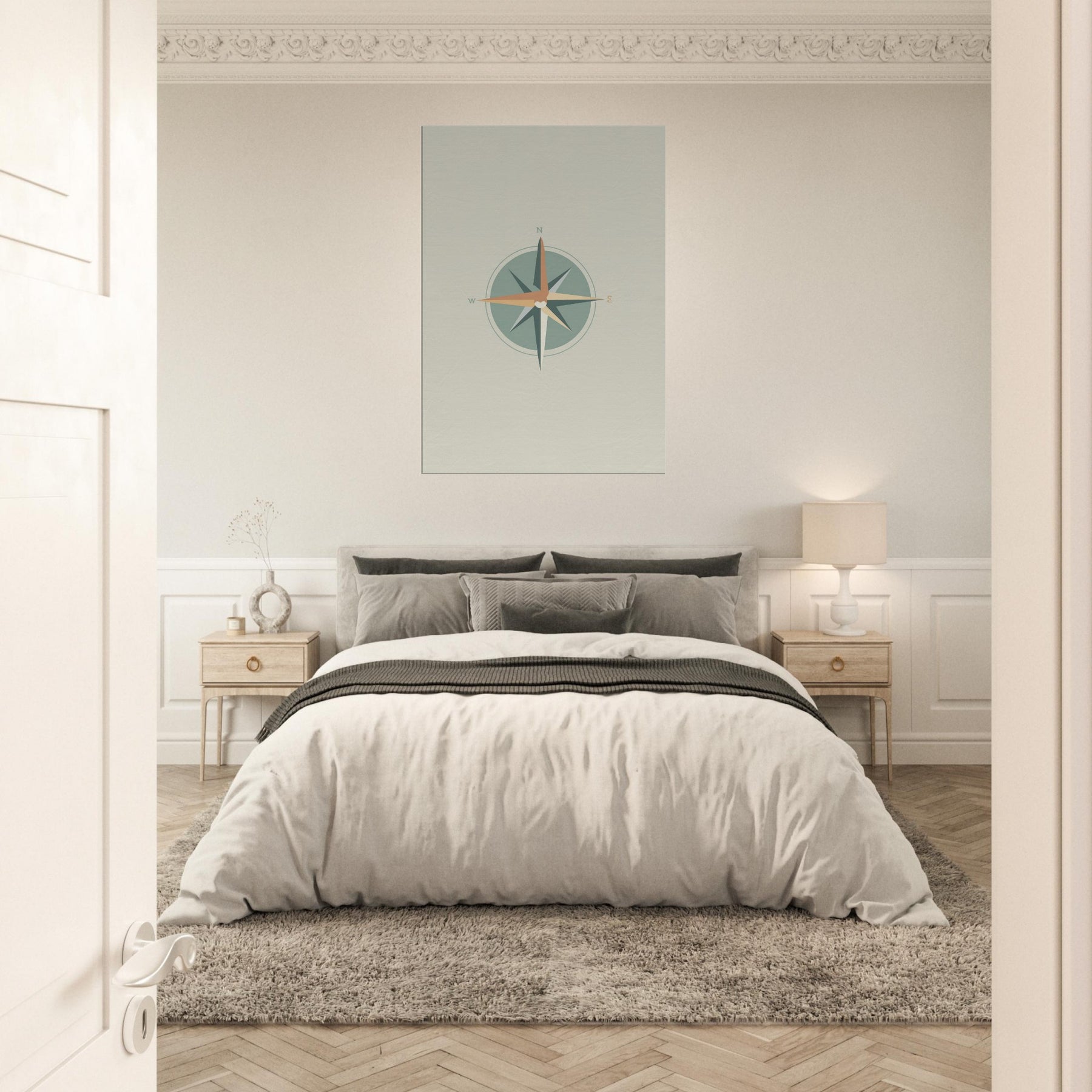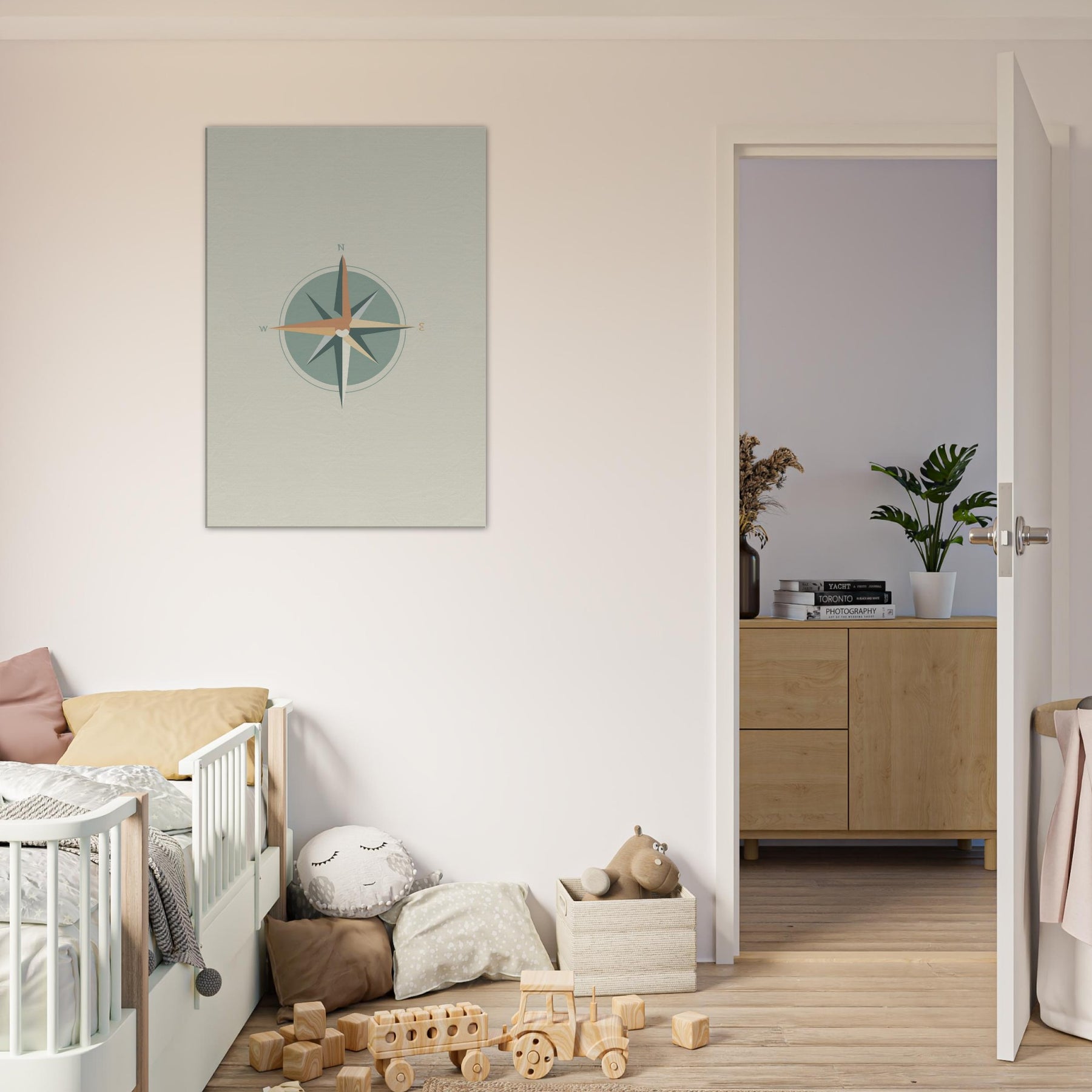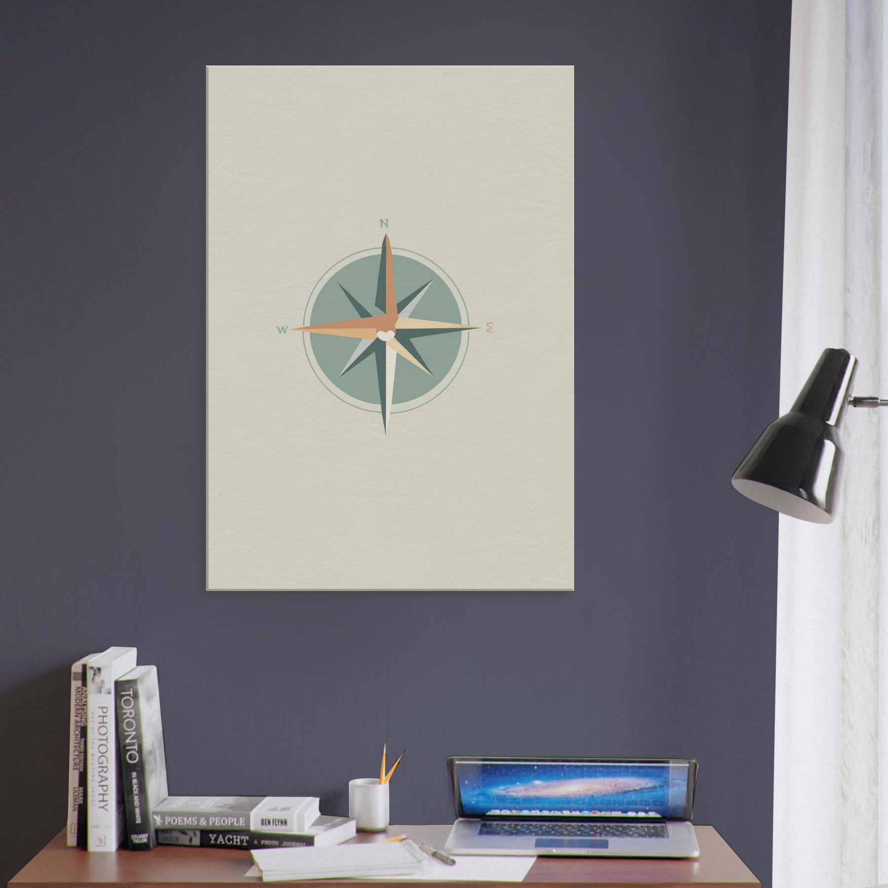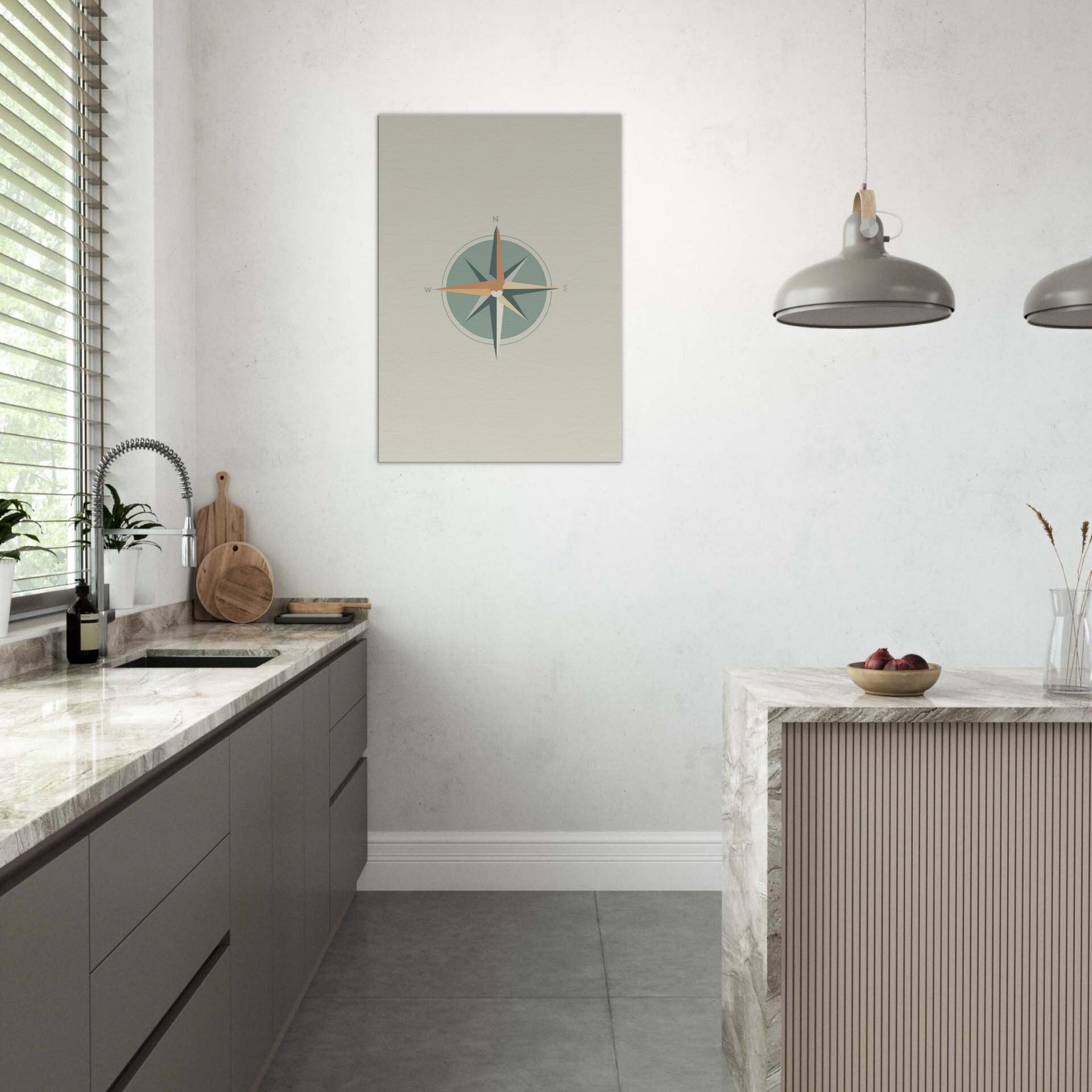 Let the quiet radiance of this Compass print orient your living space. Crafted with clean lines and restrained color, it invites stillness as the circle centers the scene. The compass points N, E, S, W anchor the room with a sense of direction, guiding conversations and evenings alike. In a minimalist setting, the soft sage and warm terracotta hues glow like dawn light, turning a wall into a subtle invitation to pause, breathe, and choose your next direction.