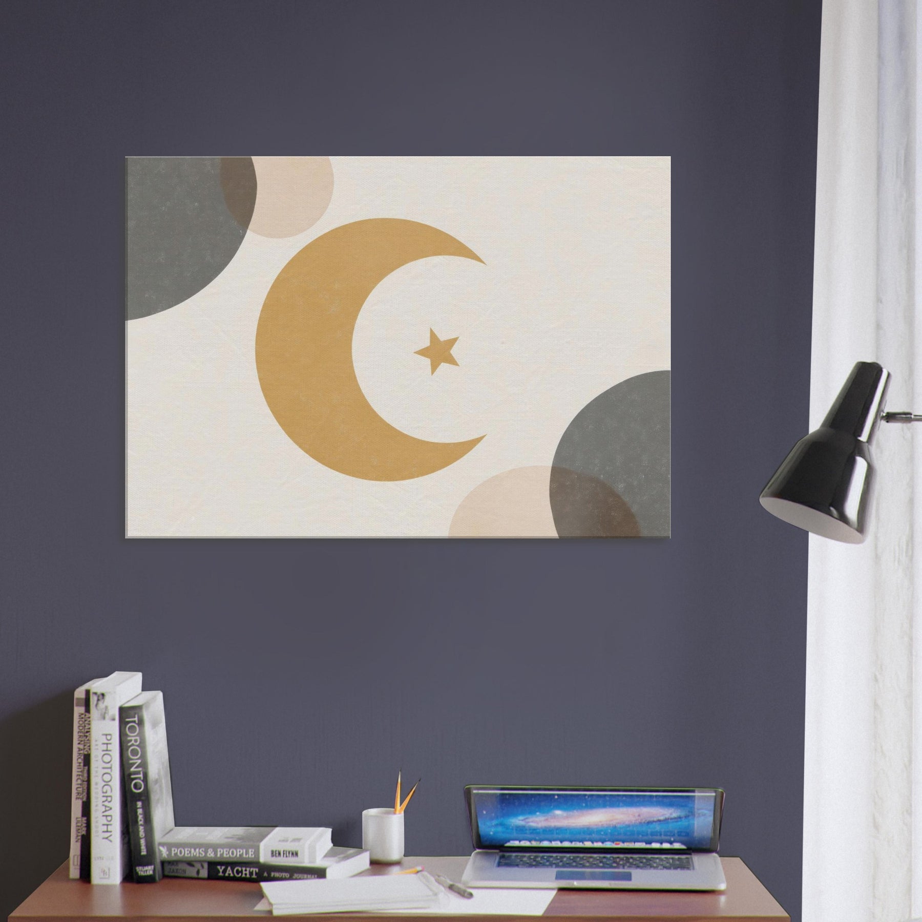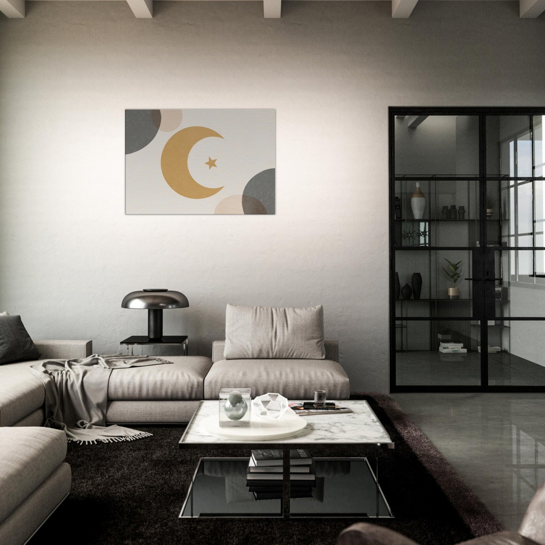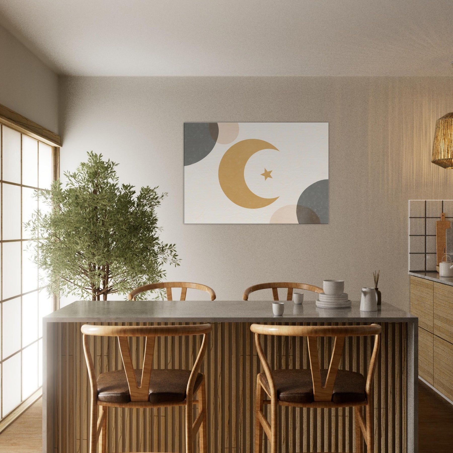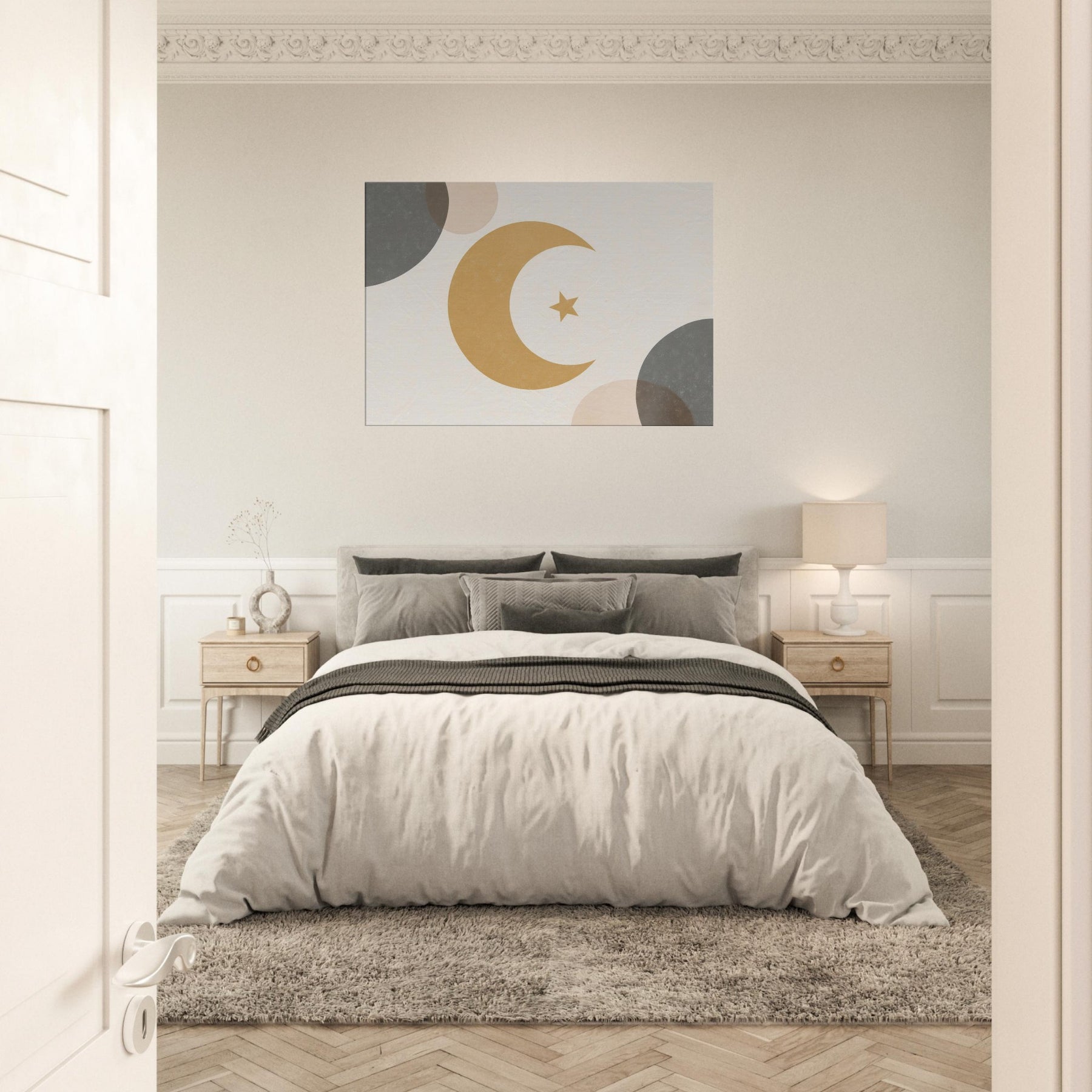 In the quiet geometry of gold, cream, and slate, the Crescent & Star glides across a calm field, inviting stillness and wonder. This minimalist composition channels mystic solitude soft arcs, a solitary star, and restrained color whispers that echo twilight and lunar glow. Perfect for a living room or studio corner, it adds a hushed atmosphere, balancing warm light with cool silhouettes. Let the Crescent & Star become a focal hush, guiding conversation and contemplation. The central subject is Crescent & Star (Minimal).