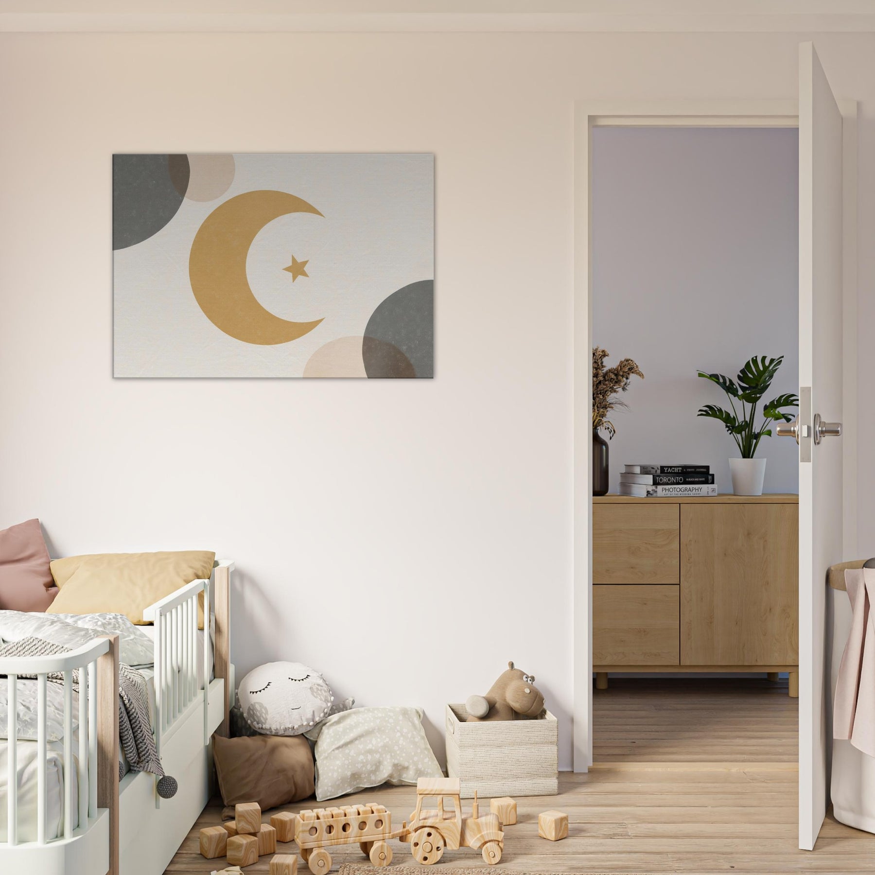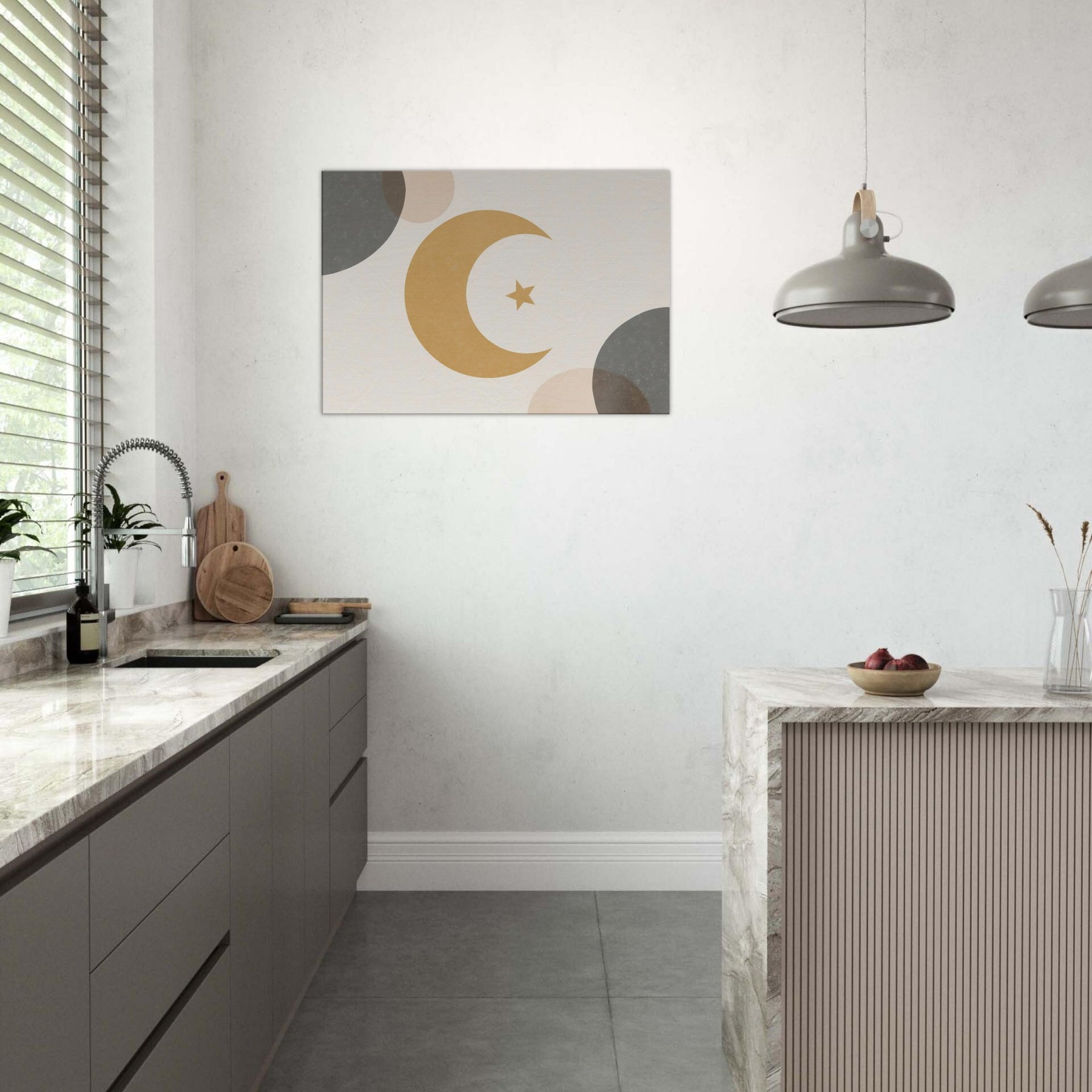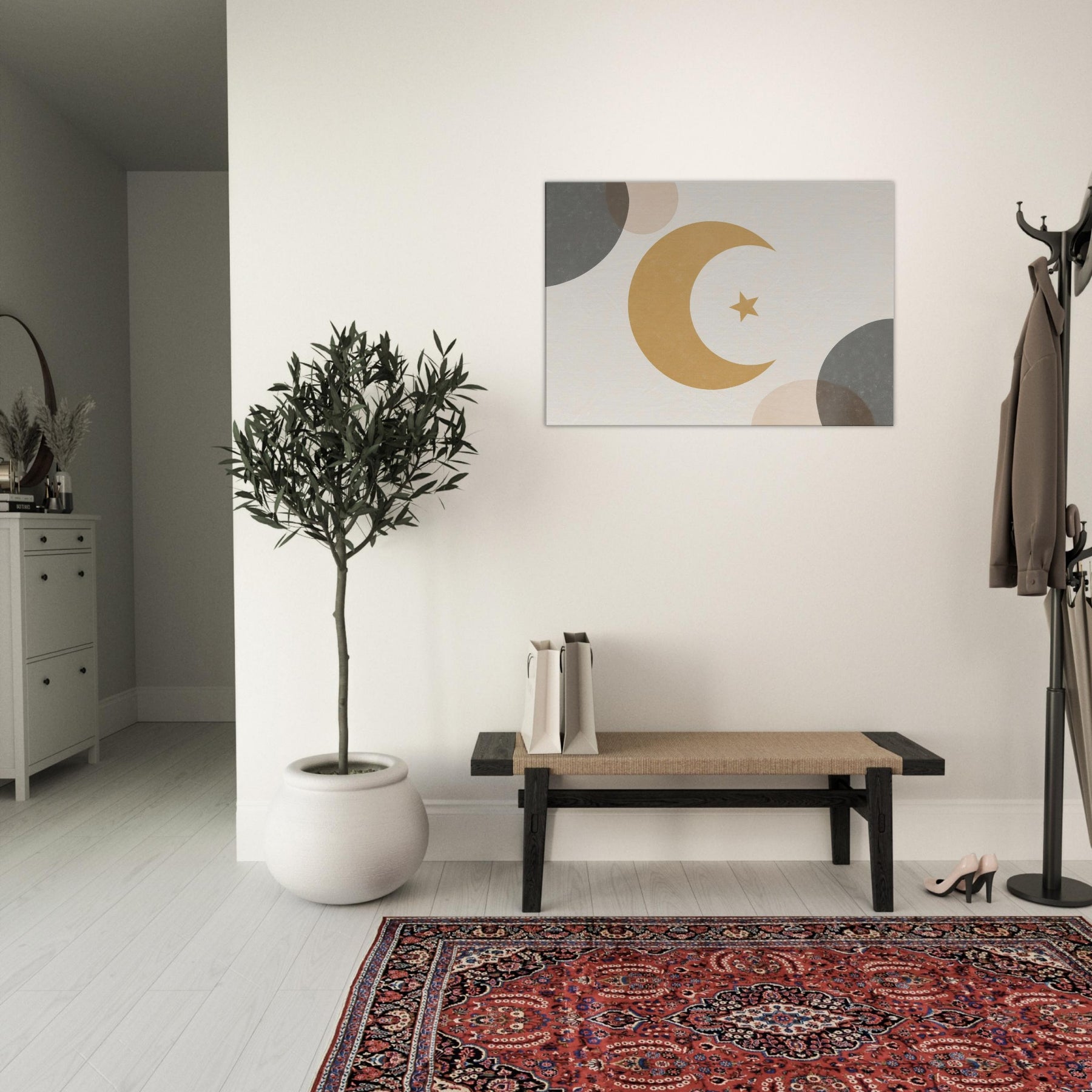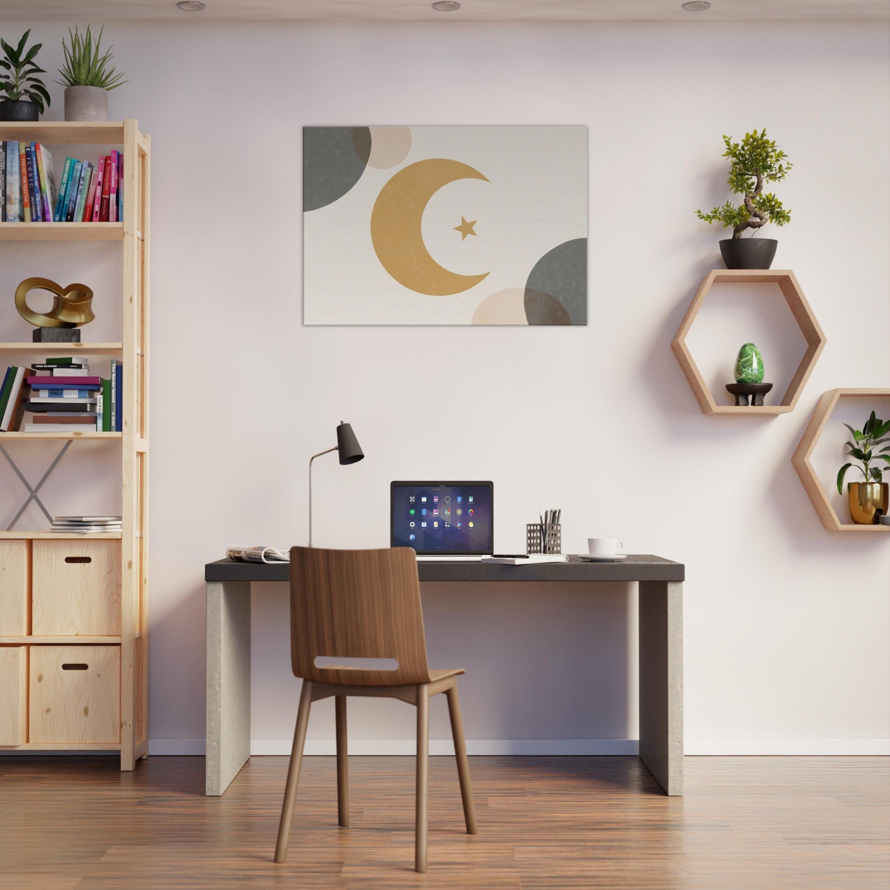 In the quiet geometry of gold, cream, and slate, the Crescent & Star glides across a calm field, inviting stillness and wonder. This minimalist composition channels mystic solitude soft arcs, a solitary star, and restrained color whispers that echo twilight and lunar glow. Perfect for a living room or studio corner, it adds a hushed atmosphere, balancing warm light with cool silhouettes. Let the Crescent & Star become a focal hush, guiding conversation and contemplation. The central subject is Crescent & Star (Minimal).