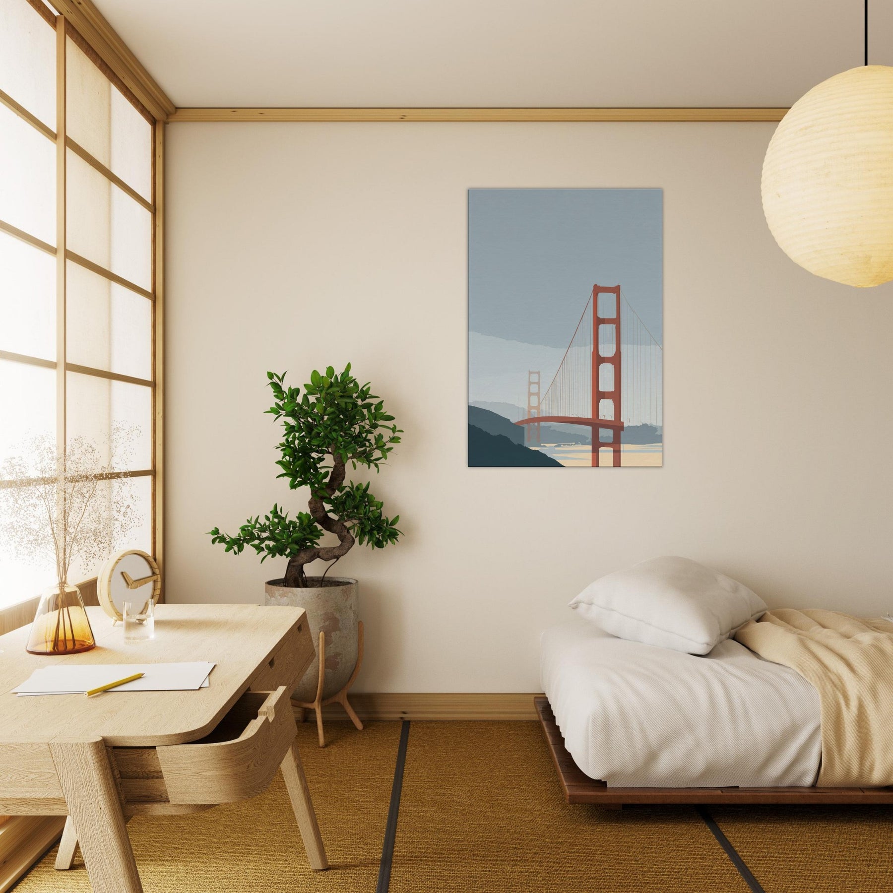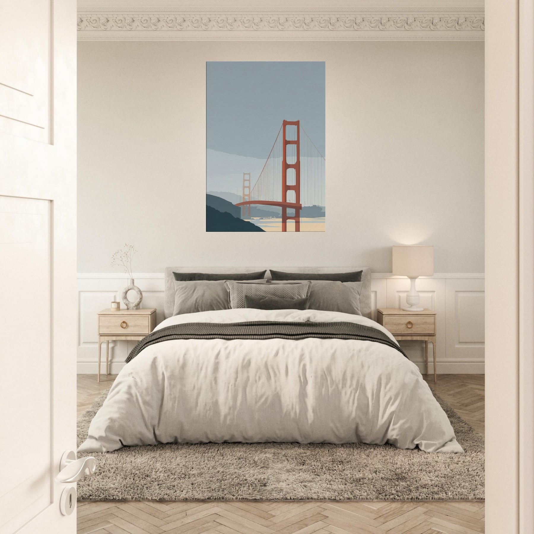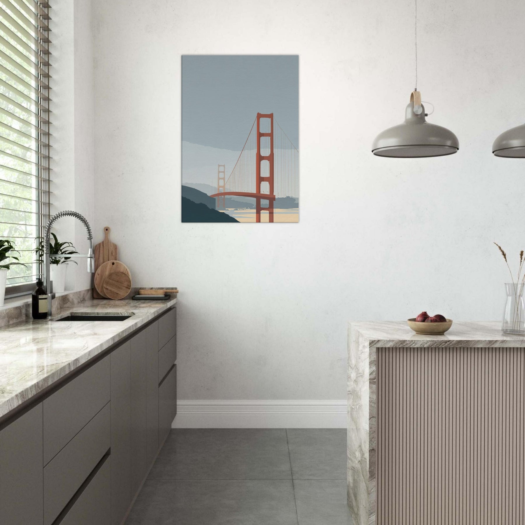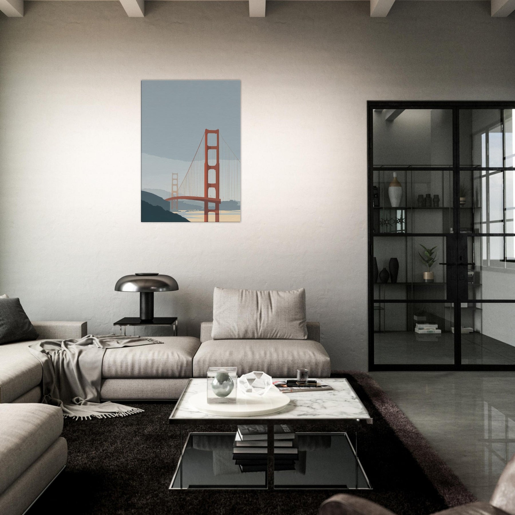 Let the Golden Gate Bridge breathe in your room with a quiet, cinematic presence. This minimalist interpretation invites light and space to mingle with color warm terracotta towers set against soft skies and sea, reduced to essential lines and gentle planes. It creates a calm, contemplative mood, perfect for a living room or study, where every glance reveals a new silhouette. A refined centerpiece that elevates modern interiors without shouting.