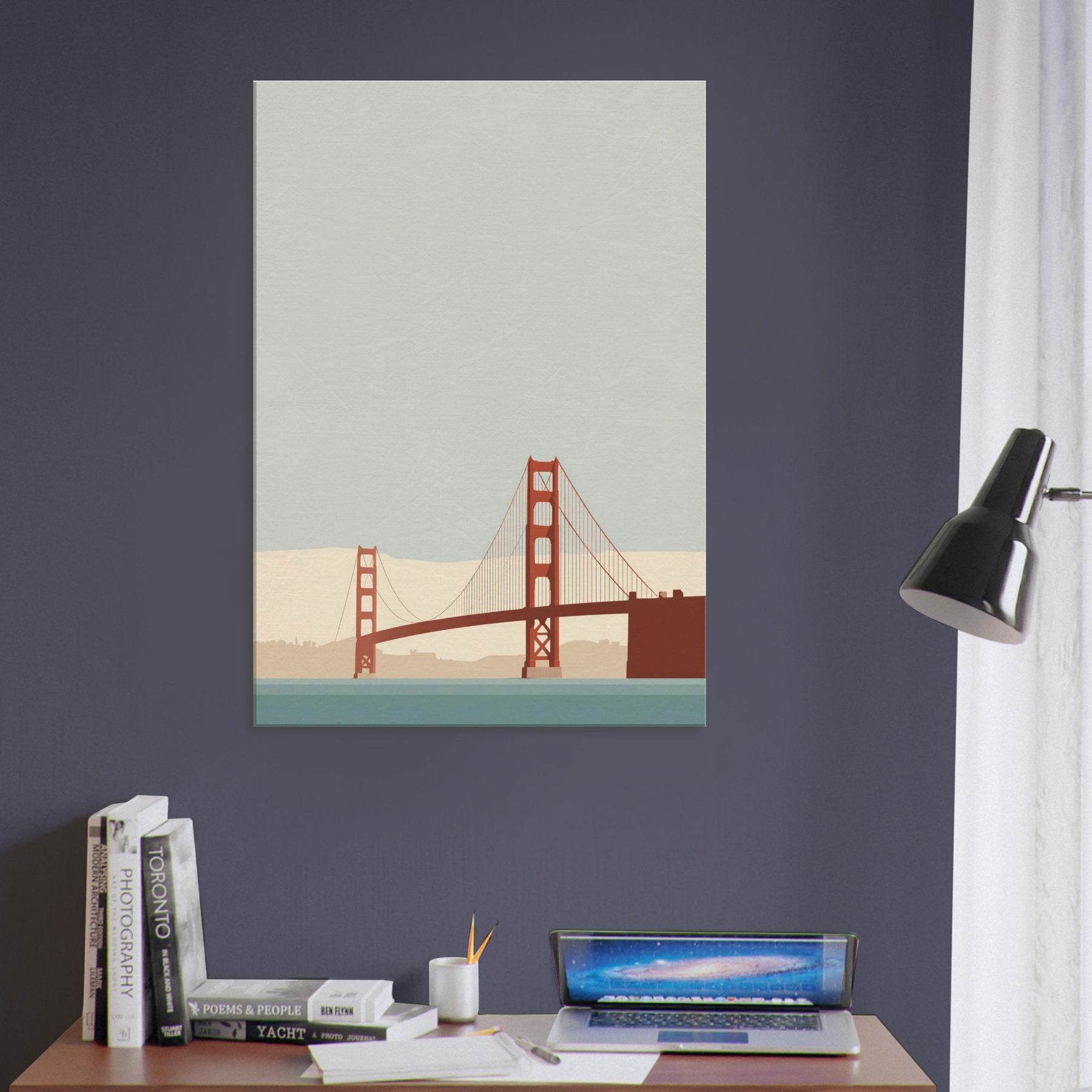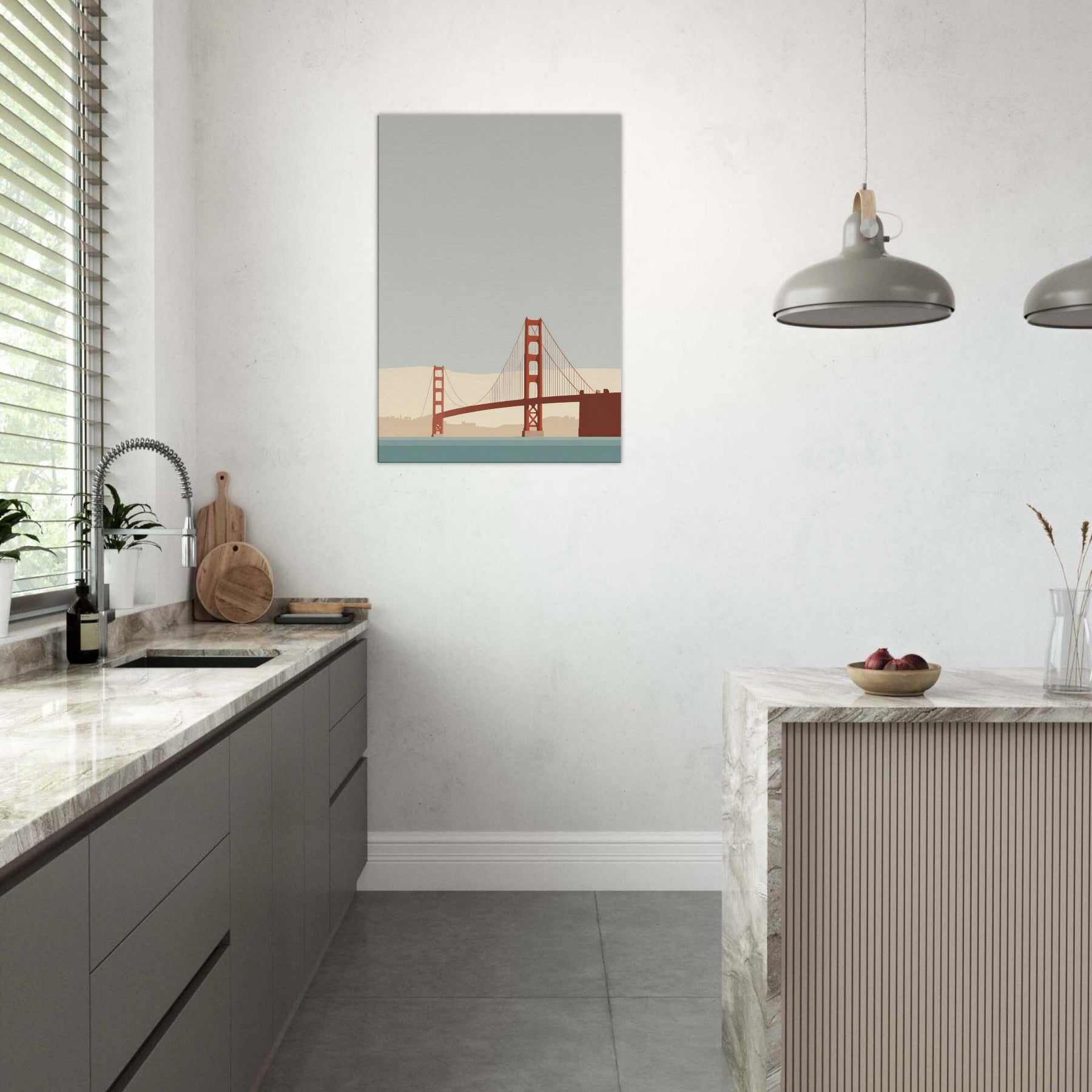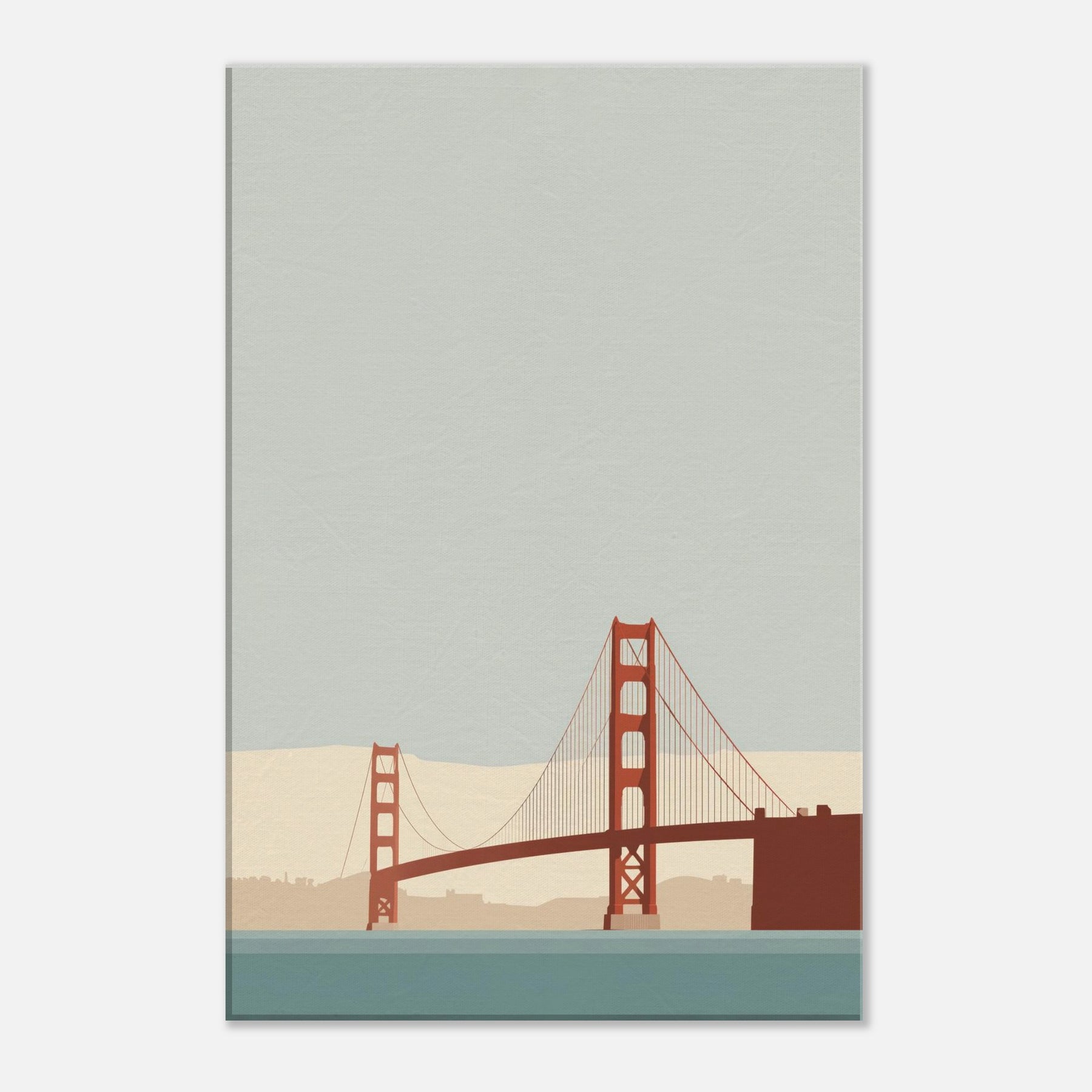 Let the Golden Gate Bridge emerge as a poised line of memory and light. This minimalist portrayal strips away detail to reveal a quiet arc of steel, suspended over a calm, sea tinted hush. The soft beige horizon and muted teal water invite stillness, turning any room into a sanctuary of focus and ease. Hang it in a living room or study to soften edges, elevate conversations, and let the city's iconic silhouette glow with restrained grace.