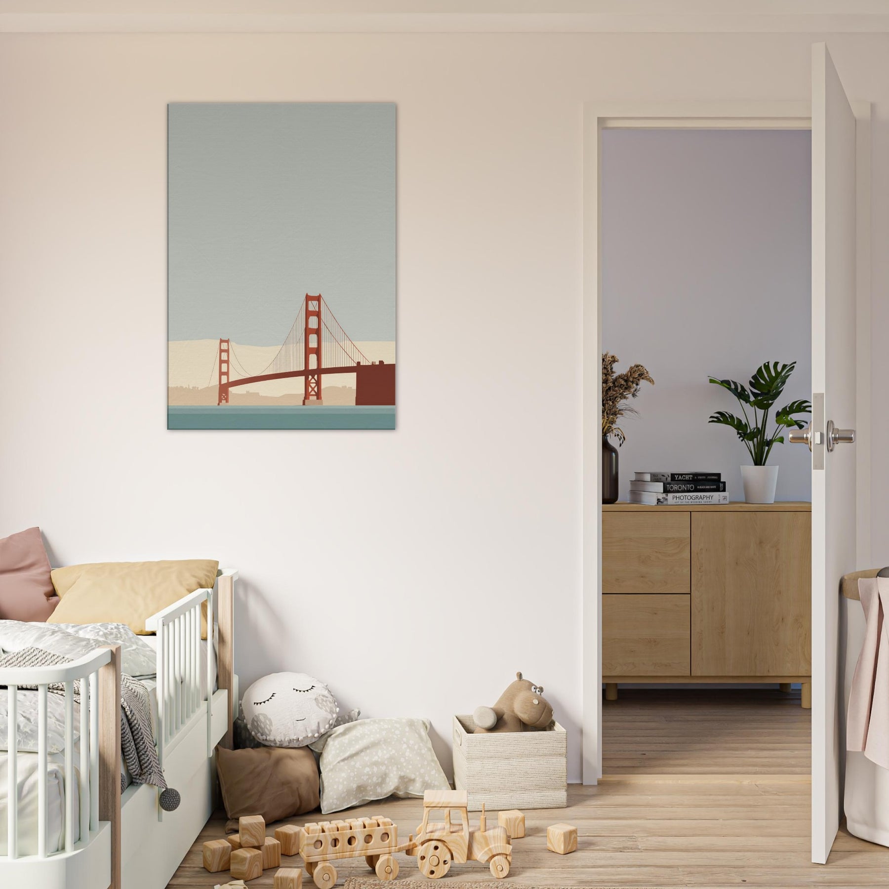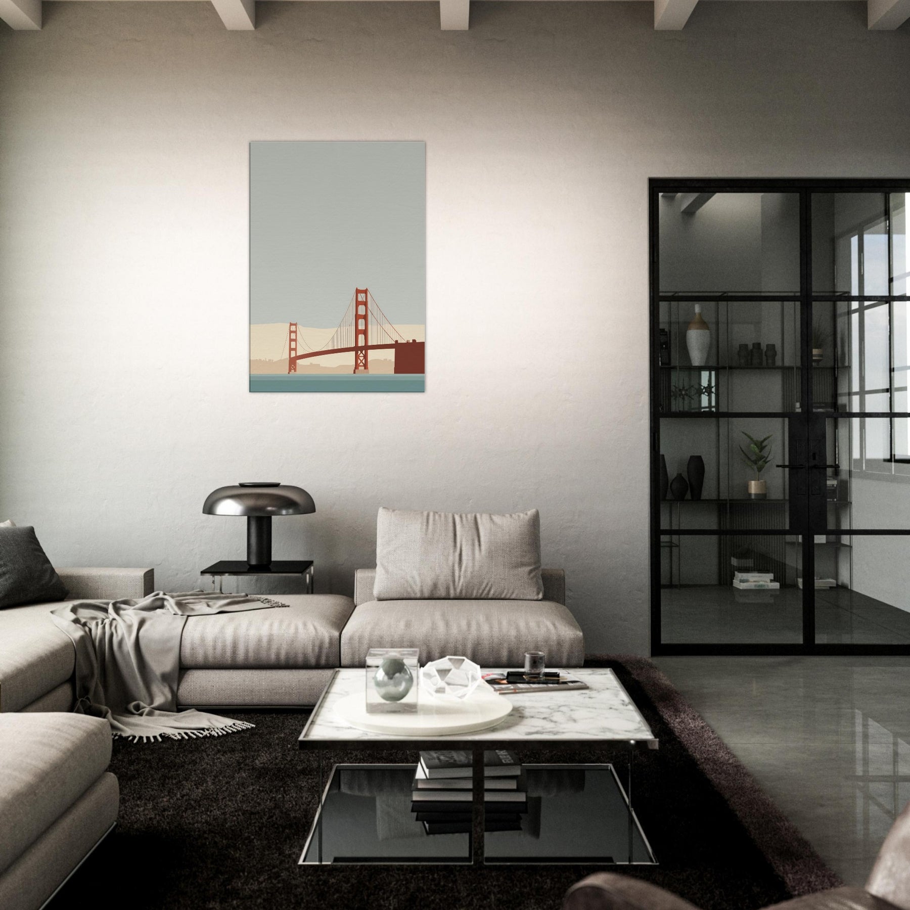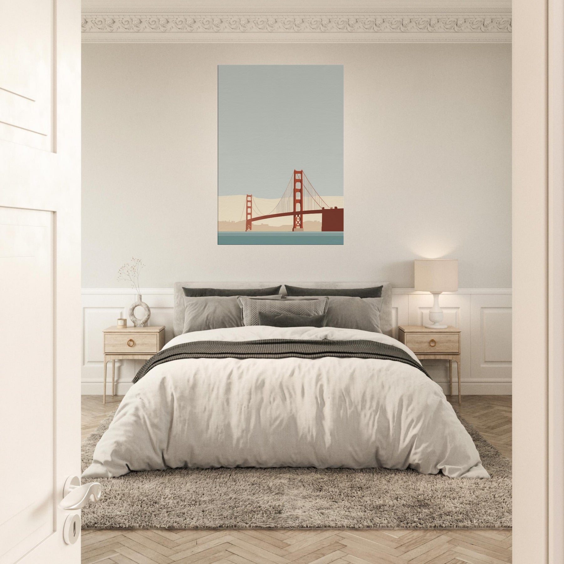 Let the Golden Gate Bridge emerge as a poised line of memory and light. This minimalist portrayal strips away detail to reveal a quiet arc of steel, suspended over a calm, sea tinted hush. The soft beige horizon and muted teal water invite stillness, turning any room into a sanctuary of focus and ease. Hang it in a living room or study to soften edges, elevate conversations, and let the city's iconic silhouette glow with restrained grace.