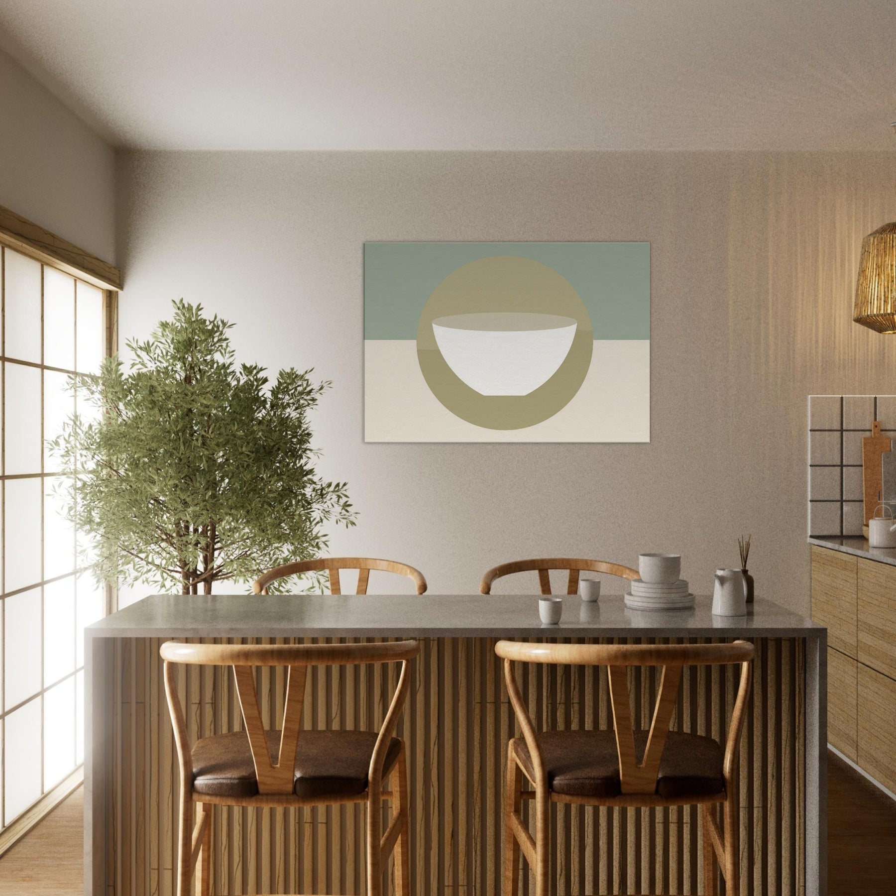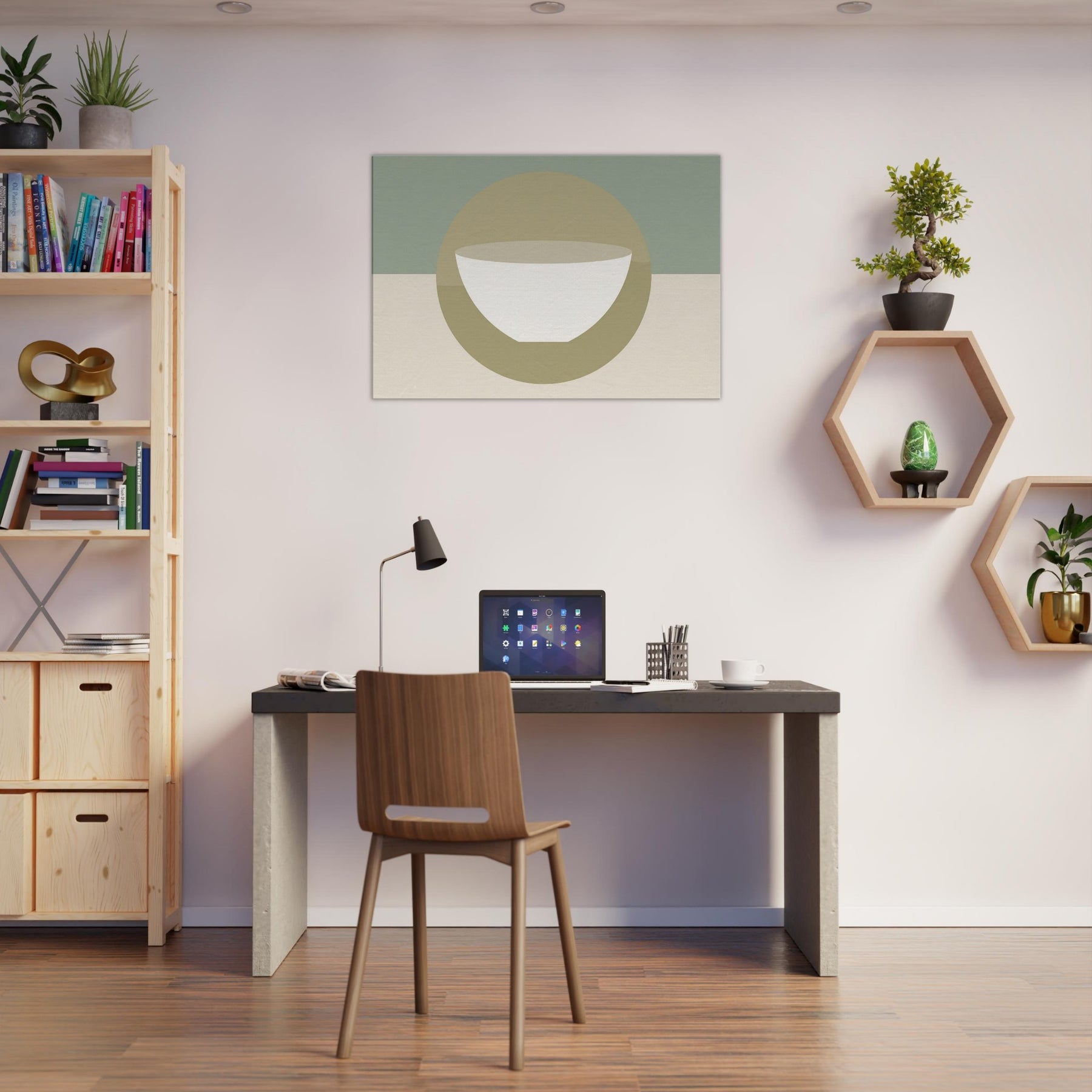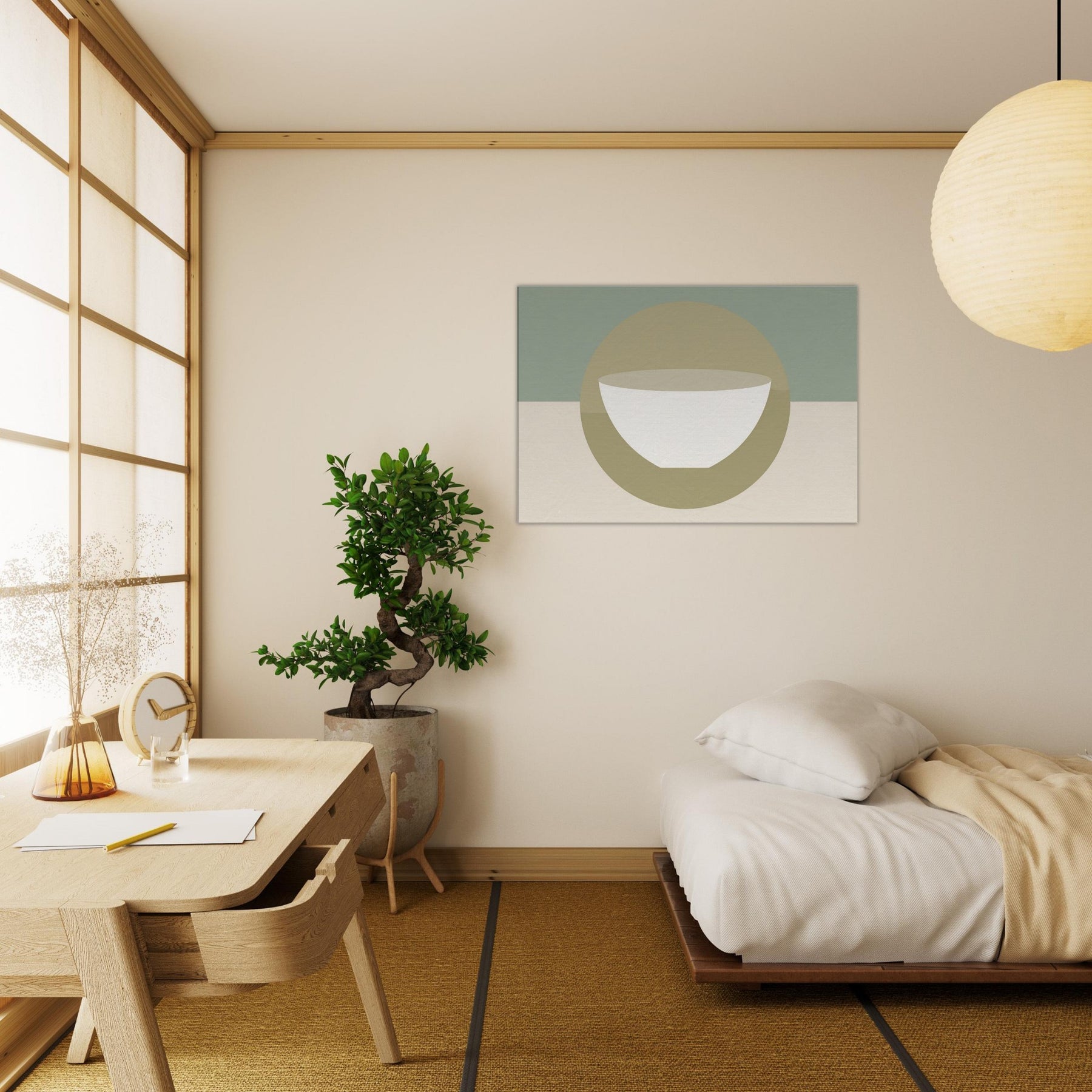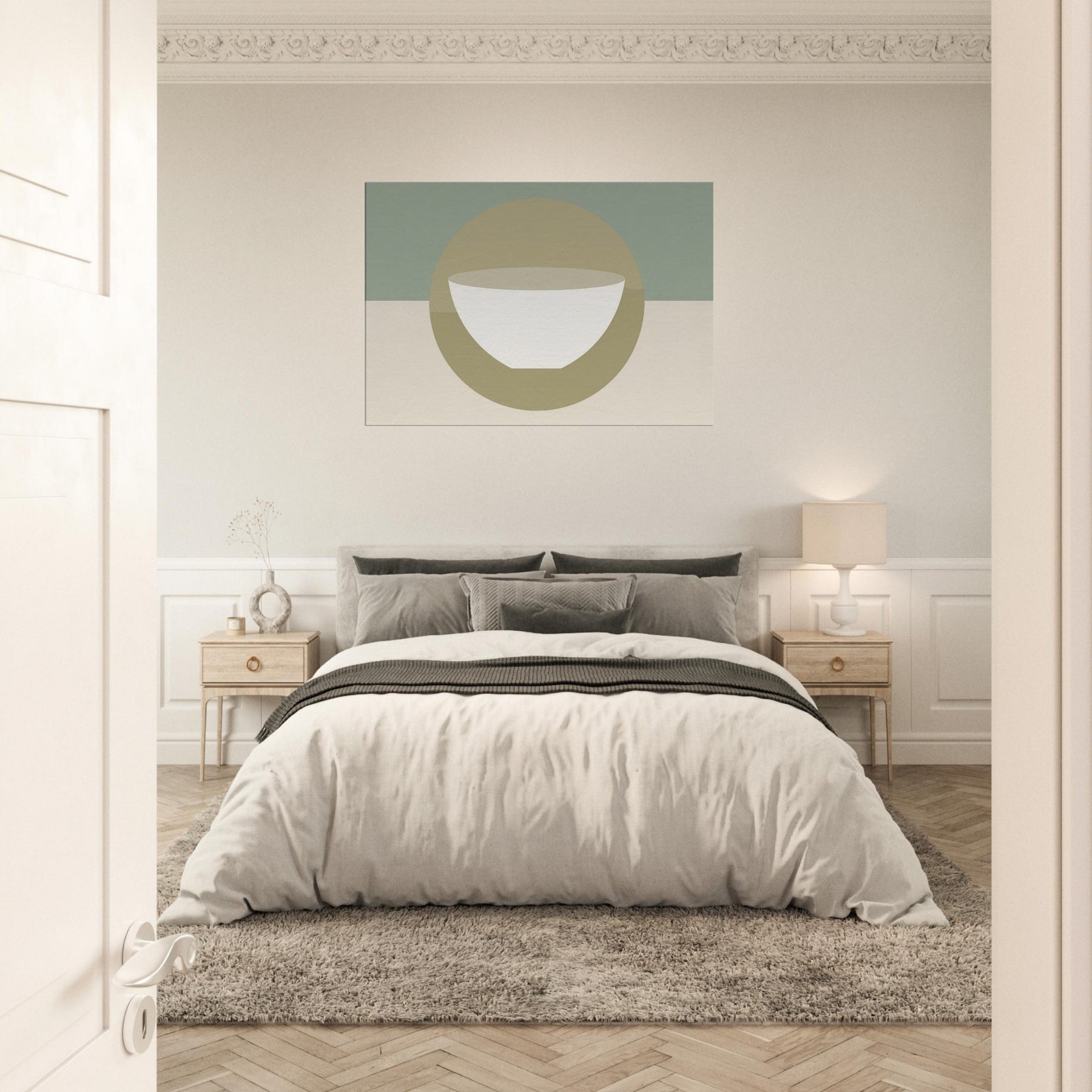 An understated circle frames a pristine bowl, evoking a Singing Bowl in tranquil reverie. The minimalist palette soft sage, warm beige, and ivory bathes the room in breathing light, while the gentle geometry invites momentary stillness. In a living space, it softens chatter, anchors seating areas, and creates a hushed focal point that feels both ancient and modern. This piece carries a mystical aura, turning walls into a quiet sanctuary where soundless resonance flows with every glance, inviting balance, reflection, and a daily pause.