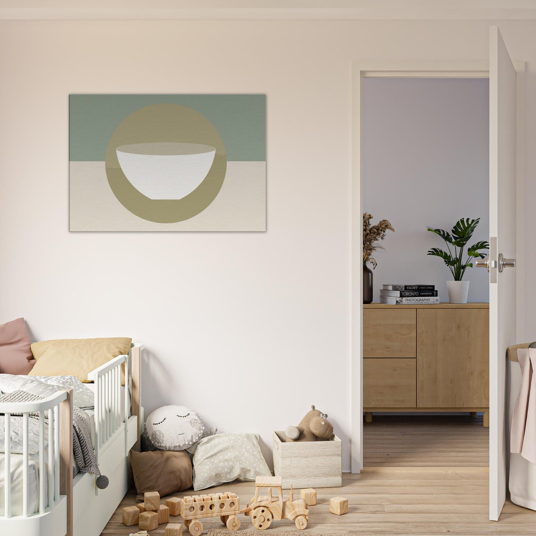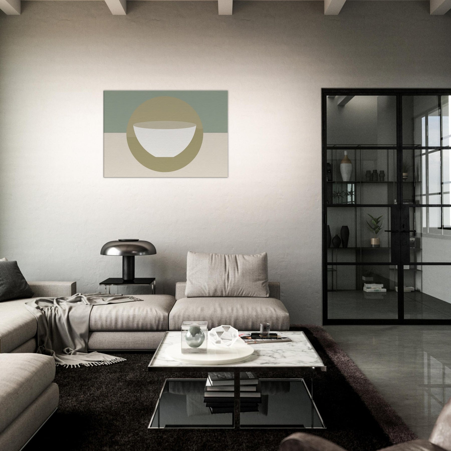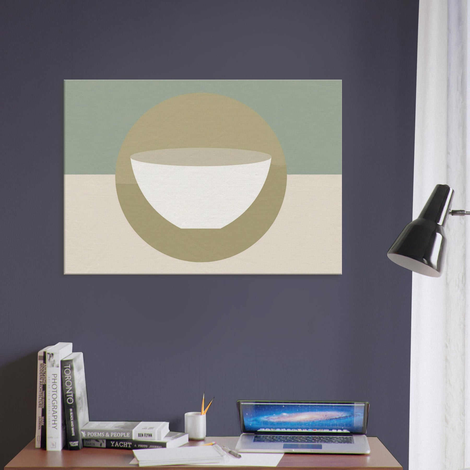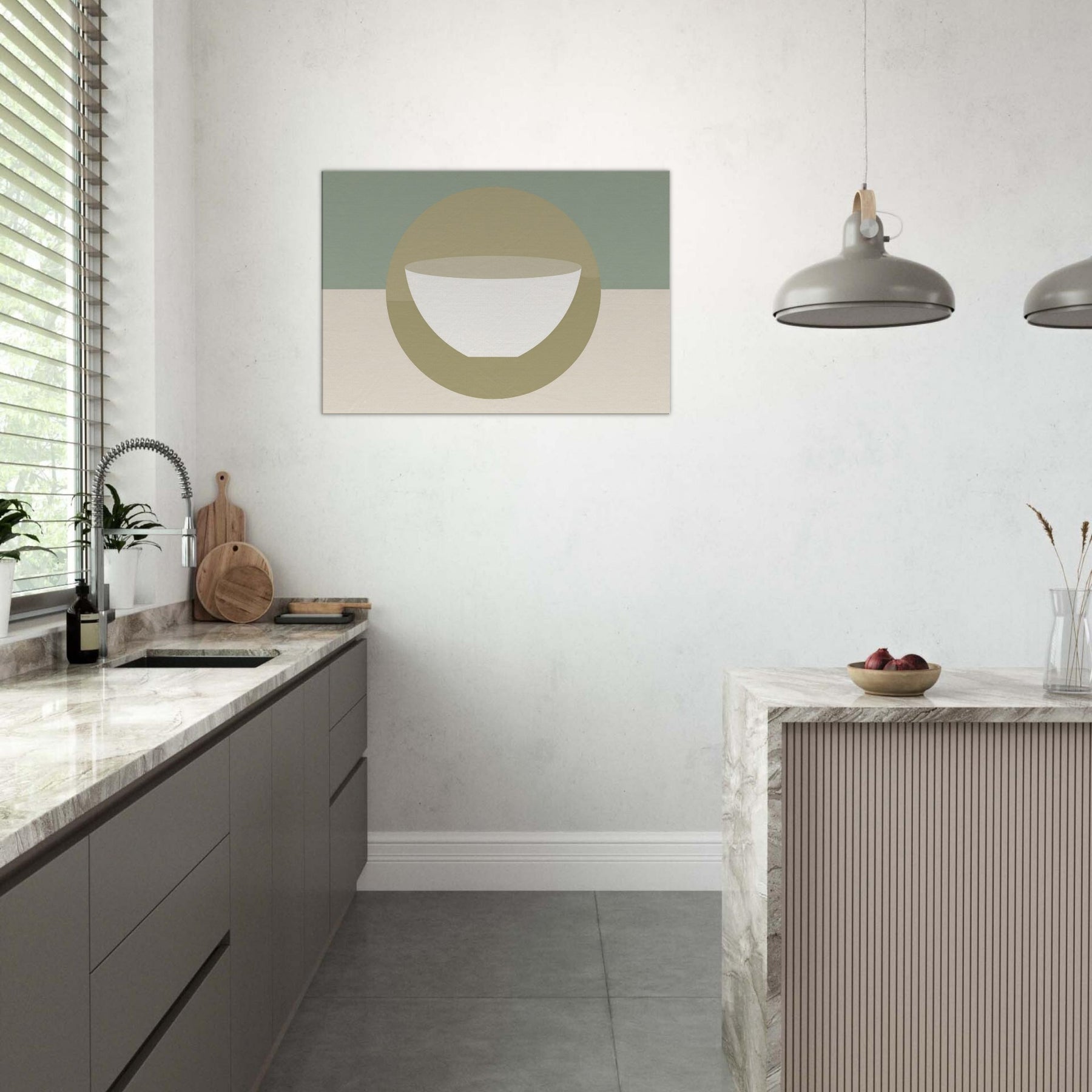 An understated circle frames a pristine bowl, evoking a Singing Bowl in tranquil reverie. The minimalist palette soft sage, warm beige, and ivory bathes the room in breathing light, while the gentle geometry invites momentary stillness. In a living space, it softens chatter, anchors seating areas, and creates a hushed focal point that feels both ancient and modern. This piece carries a mystical aura, turning walls into a quiet sanctuary where soundless resonance flows with every glance, inviting balance, reflection, and a daily pause.