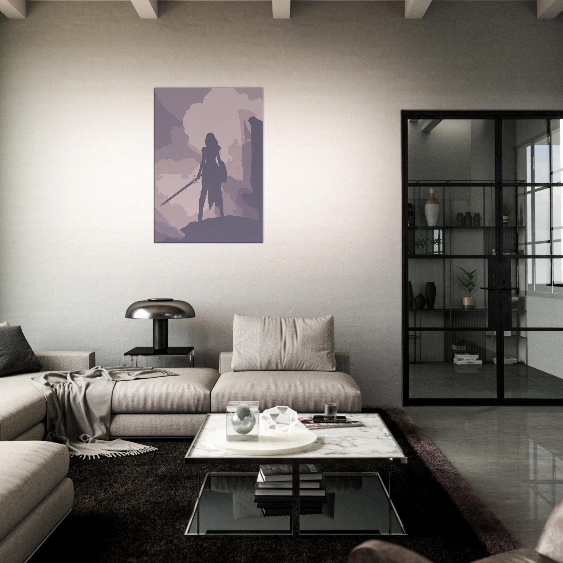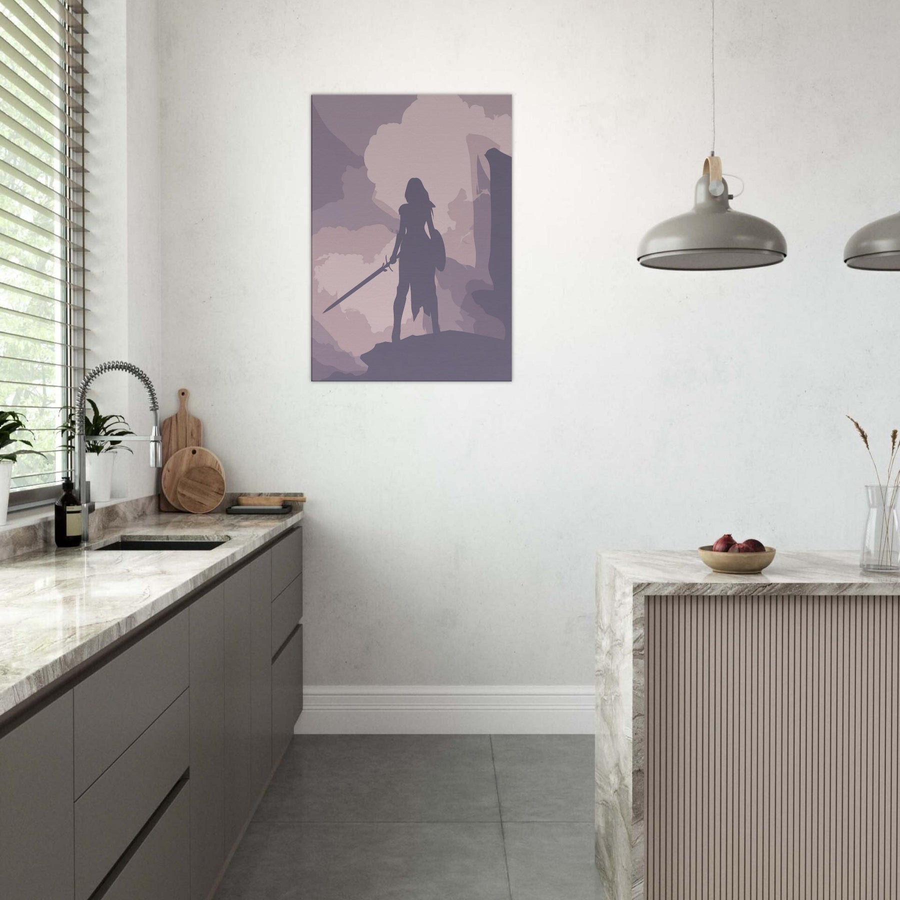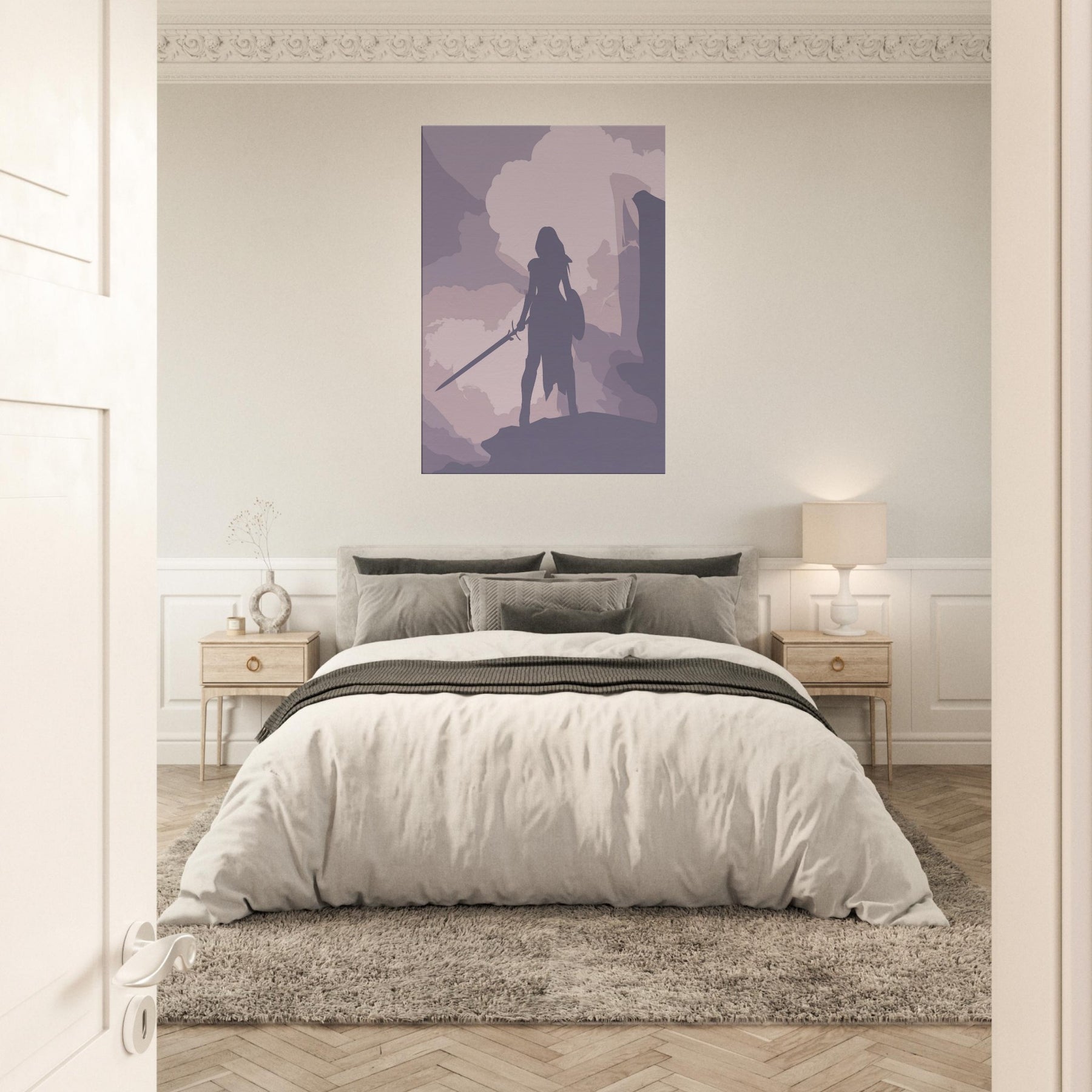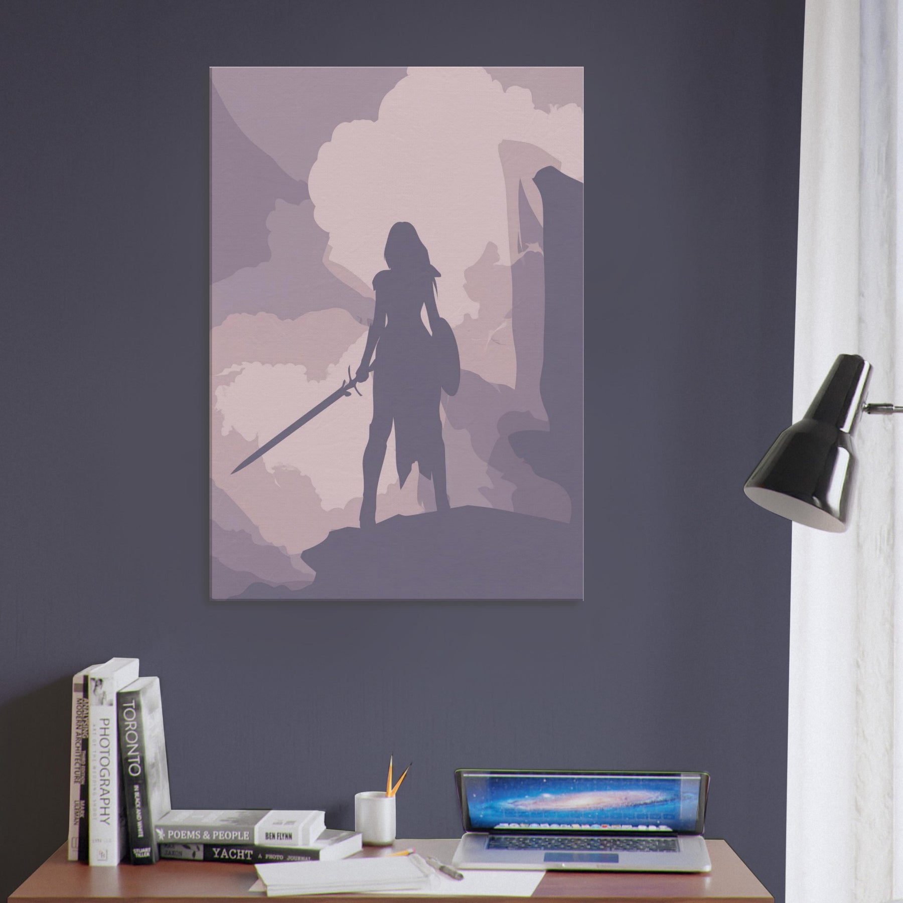Bathed in soft, muted tones, this minimalist yet powerful scene centers the Valkyrie at the threshold between worlds. The silhouette, a quiet force with sword raised and shield resting, evokes courage tempered by grace. The atmosphere whispers of wind swept cliffs and ancient skies, turning any room into a sanctuary of myth and focus. Hang this piece where calm meets ambition above a sofa, in a study, or a hallway to invite clarity, protection, and a touch of legendary wonder.