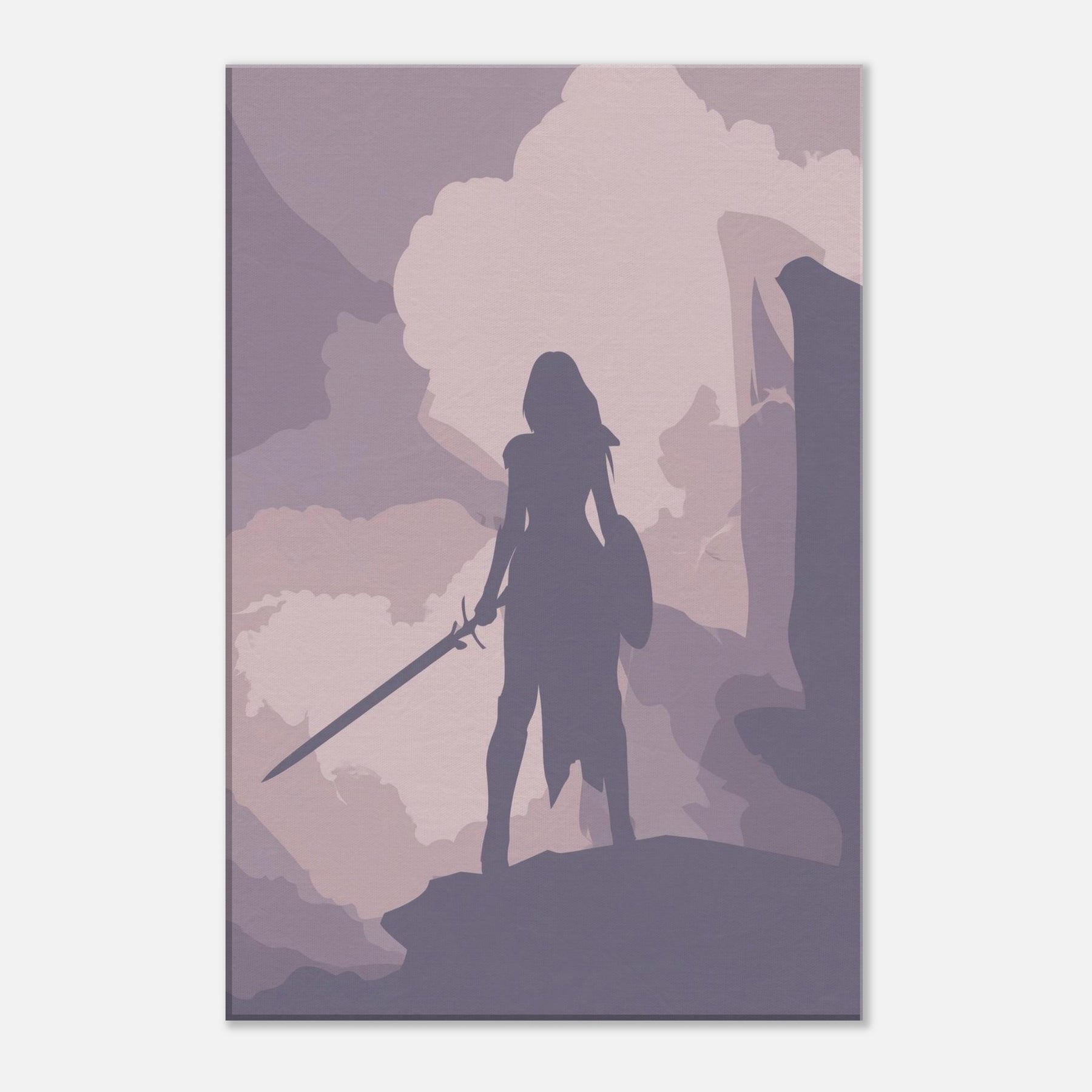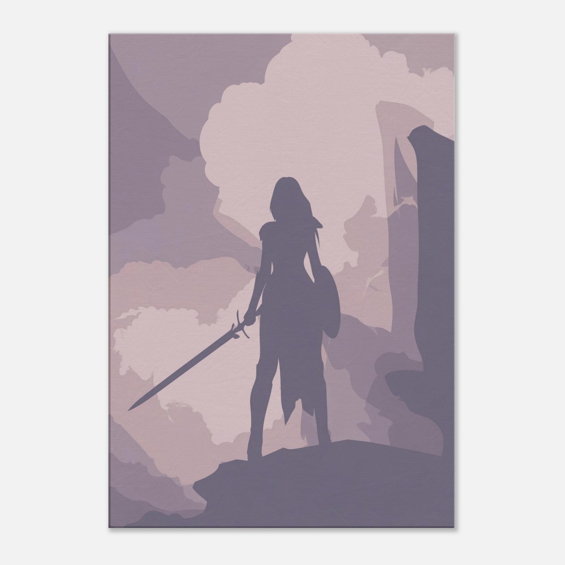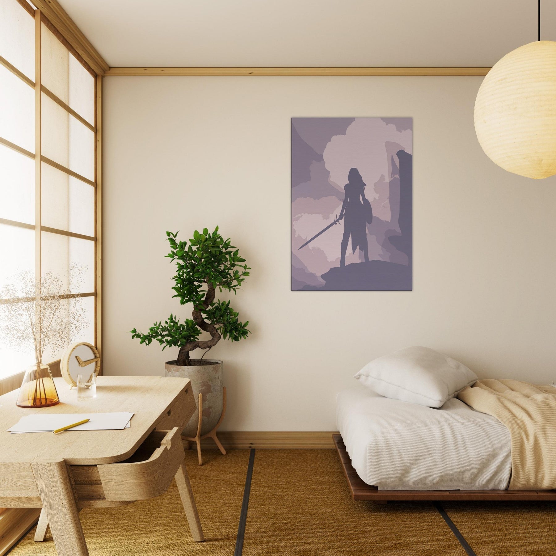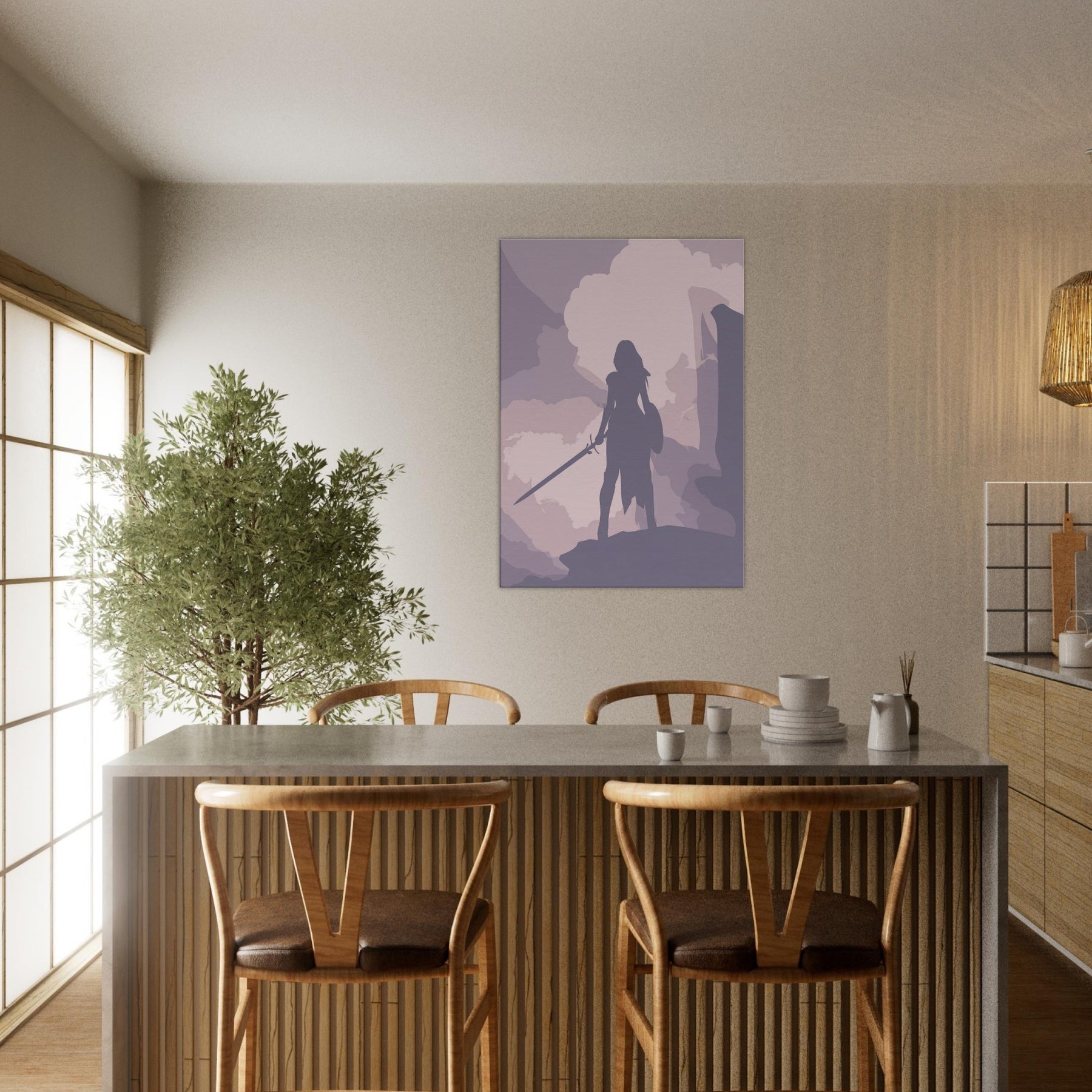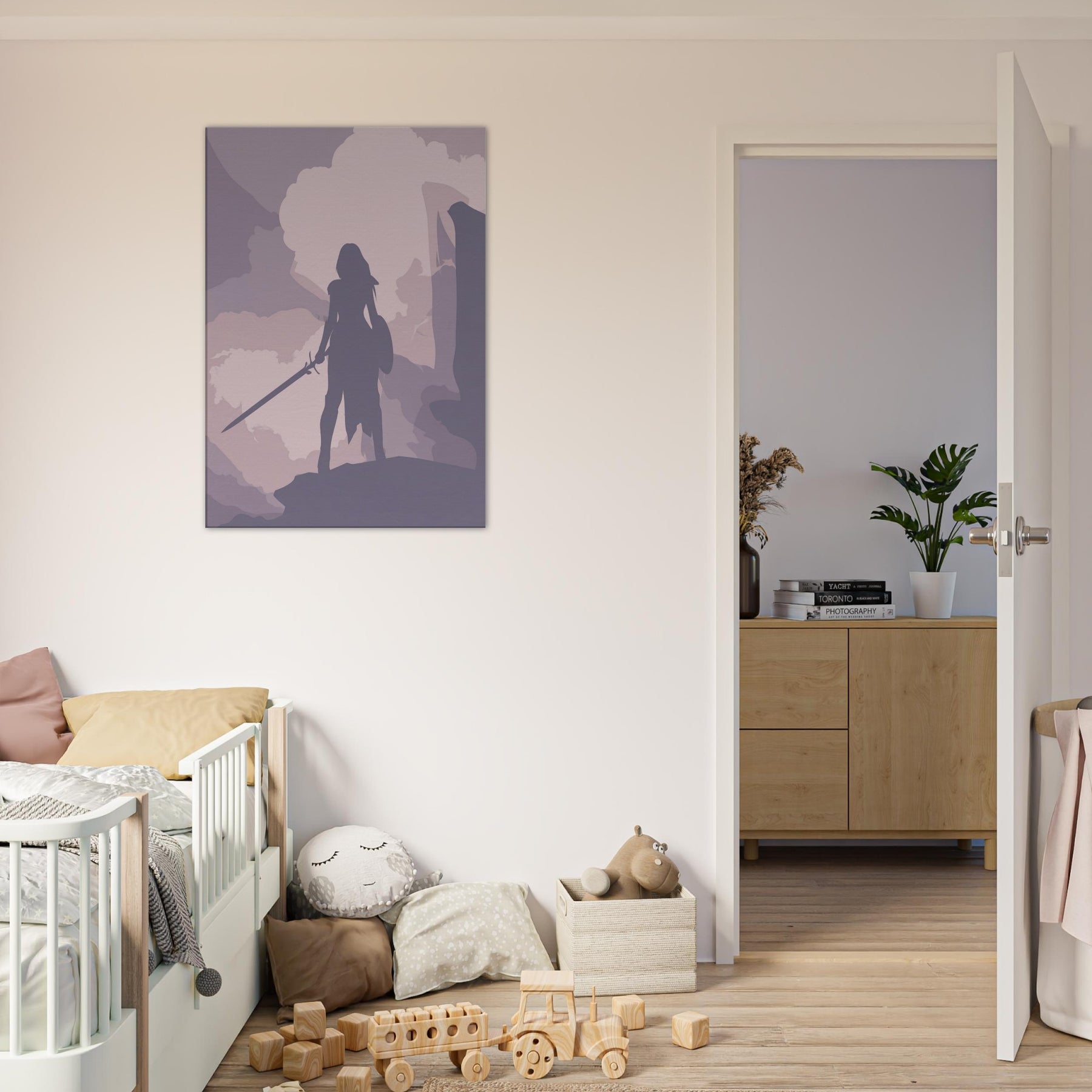 Bathed in soft, muted tones, this minimalist yet powerful scene centers the Valkyrie at the threshold between worlds. The silhouette, a quiet force with sword raised and shield resting, evokes courage tempered by grace. The atmosphere whispers of wind swept cliffs and ancient skies, turning any room into a sanctuary of myth and focus. Hang this piece where calm meets ambition above a sofa, in a study, or a hallway to invite clarity, protection, and a touch of legendary wonder.