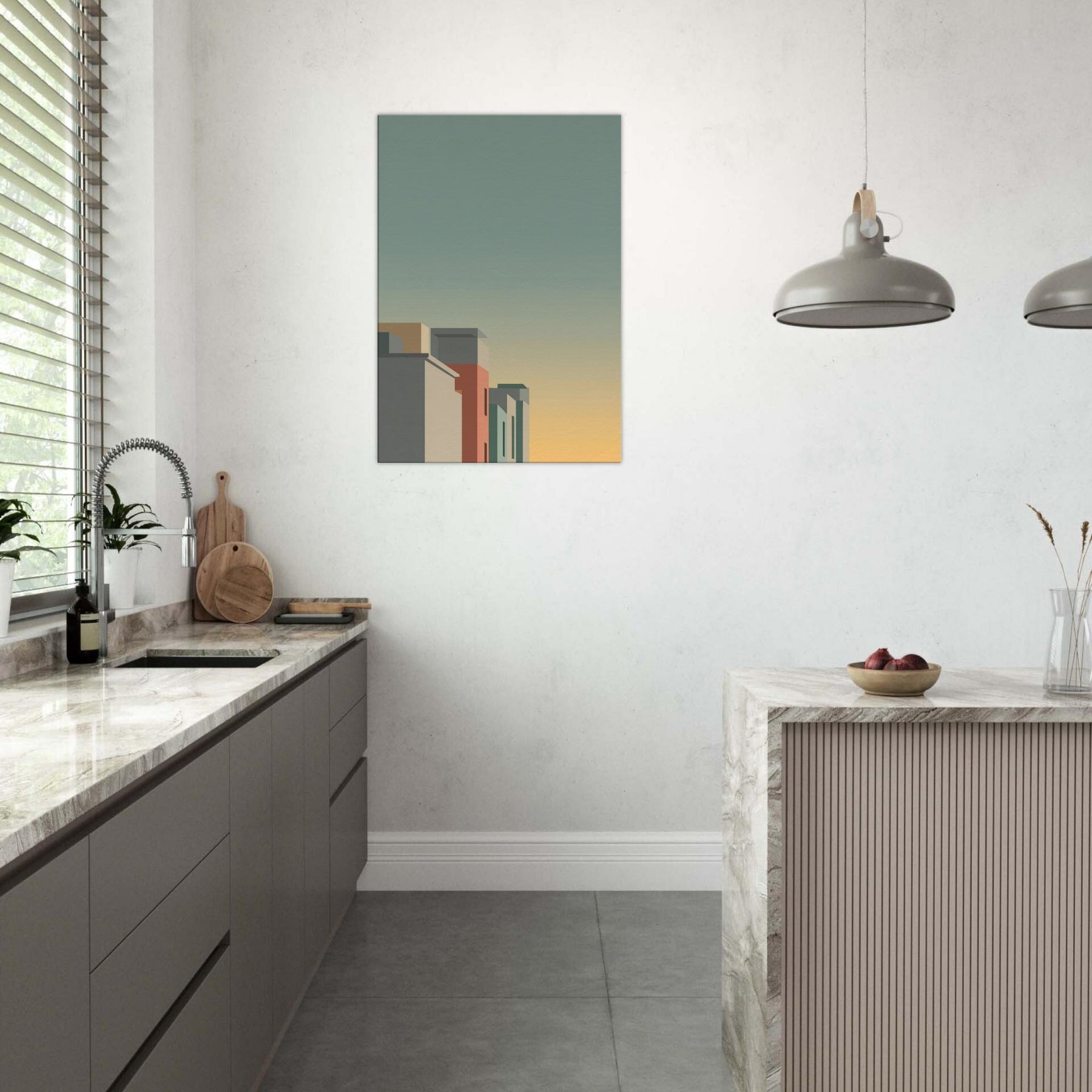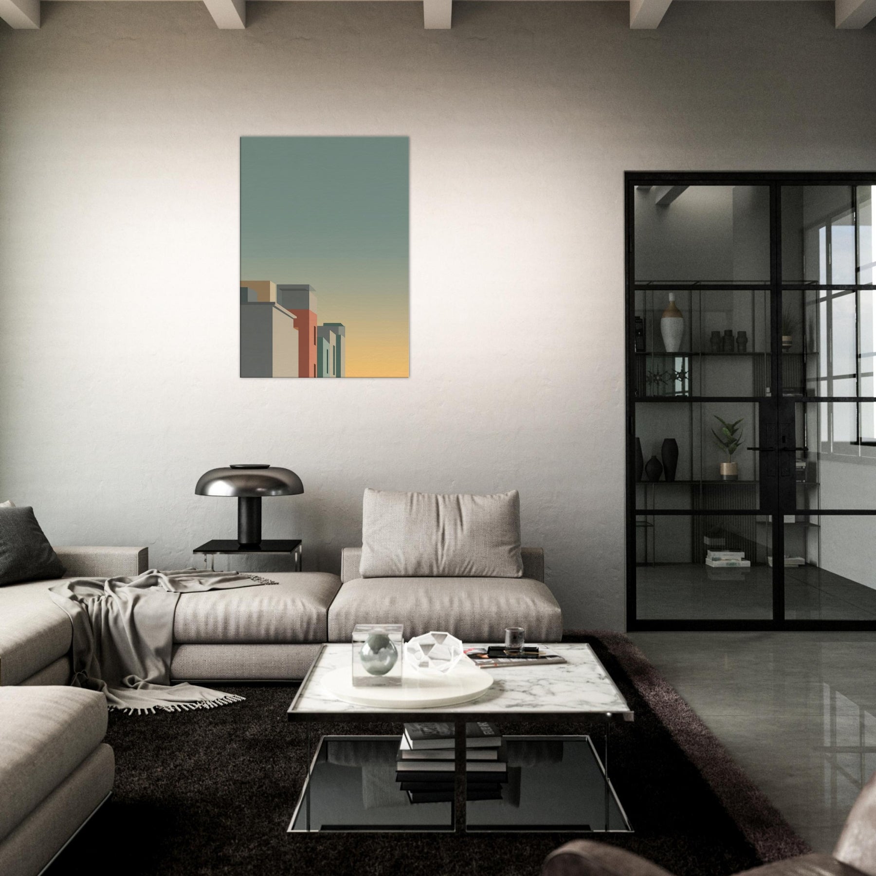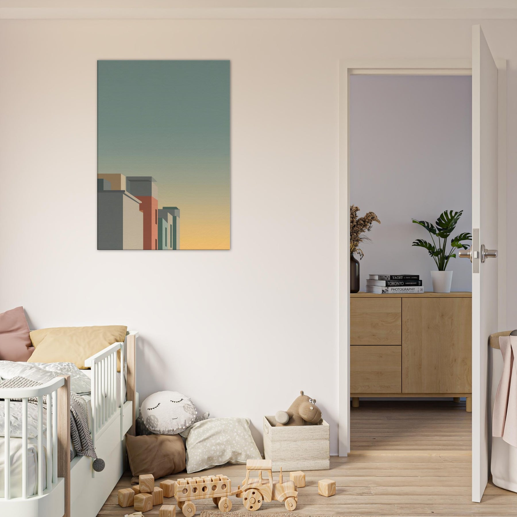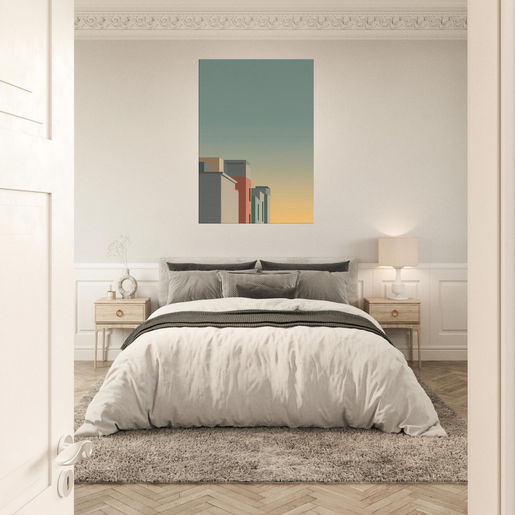A minimalist skyline unfurls in soft blocks and quiet color, inviting the eye to rest on Cairo at daybreak. The gentle gradient from teal to honey invites calm into a living space, where architecture becomes a meditation on light and space. This artwork balances restraint with personality, making walls feel open and present. It pairs beautifully with warm woods or cool neutrals, transforming a room into a serene walk through a city’s quiet hours.