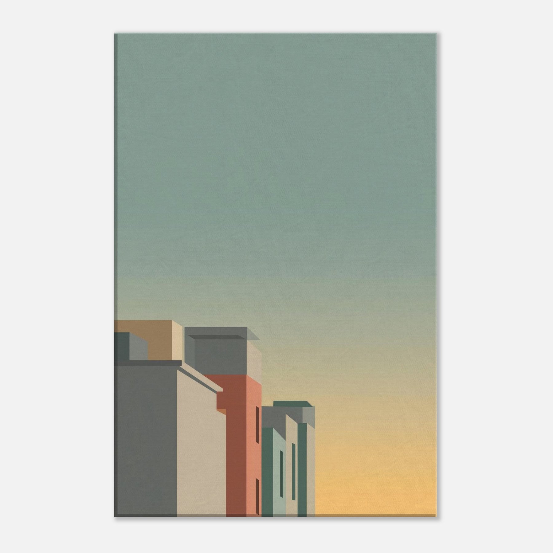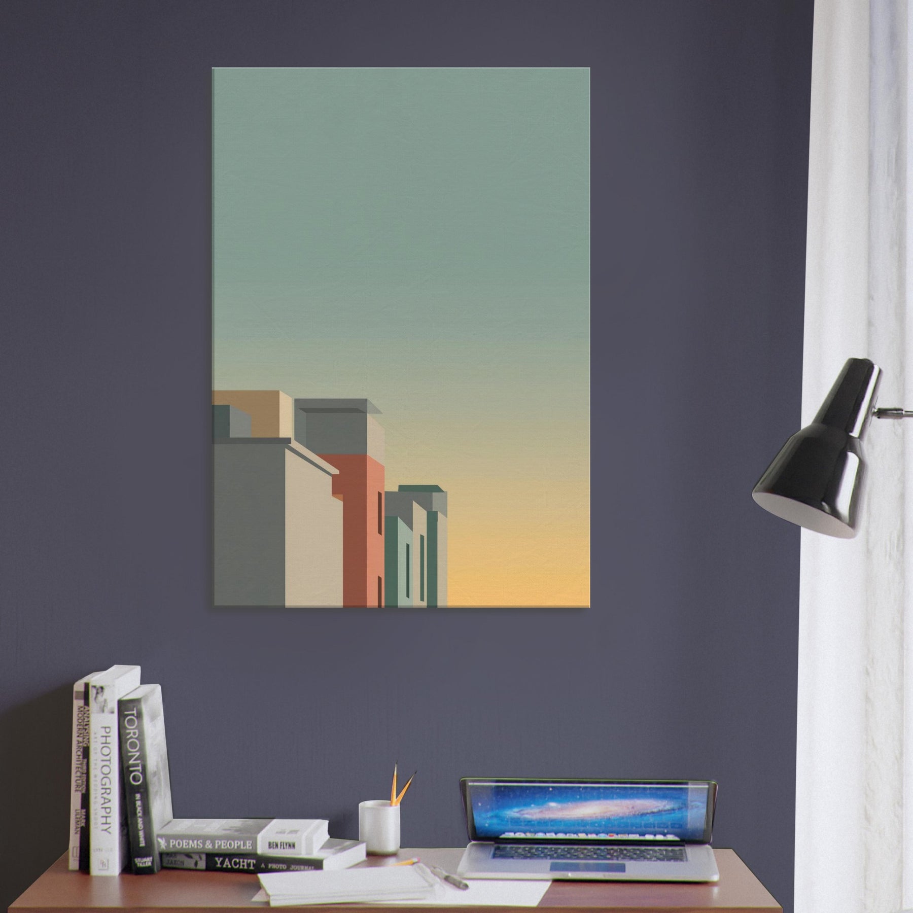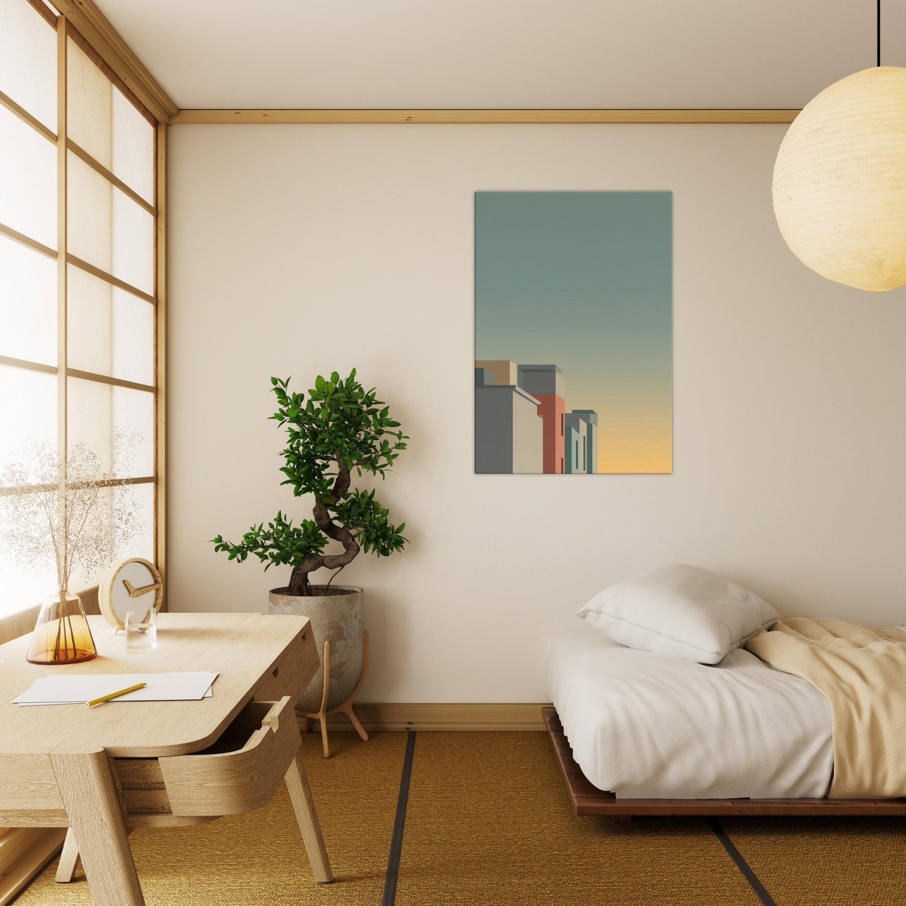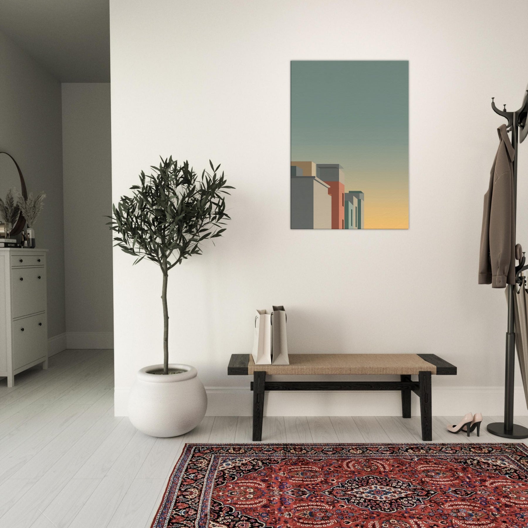 A minimalist skyline unfurls in soft blocks and quiet color, inviting the eye to rest on Cairo at daybreak. The gentle gradient from teal to honey invites calm into a living space, where architecture becomes a meditation on light and space. This artwork balances restraint with personality, making walls feel open and present. It pairs beautifully with warm woods or cool neutrals, transforming a room into a serene walk through a city’s quiet hours.
